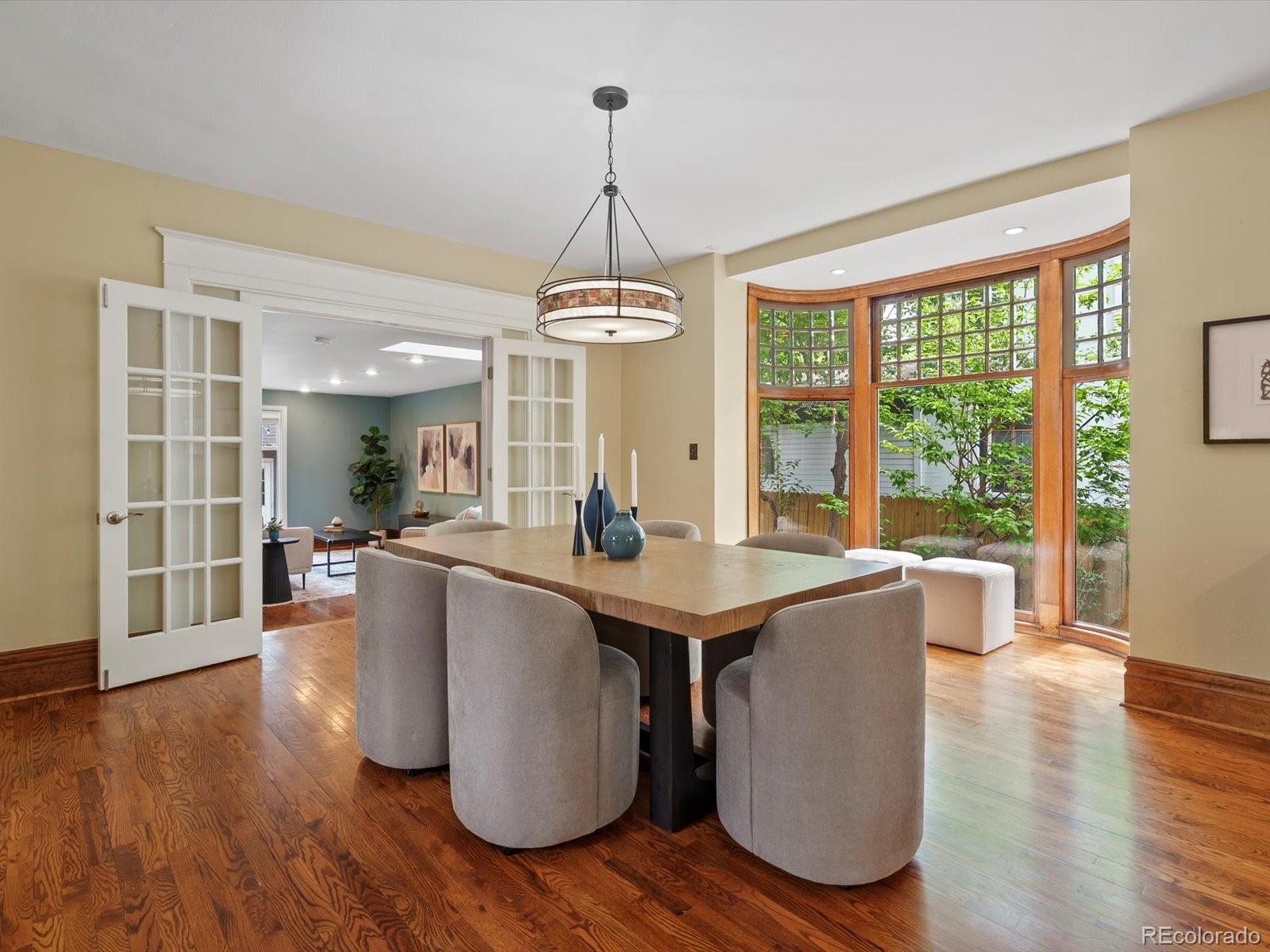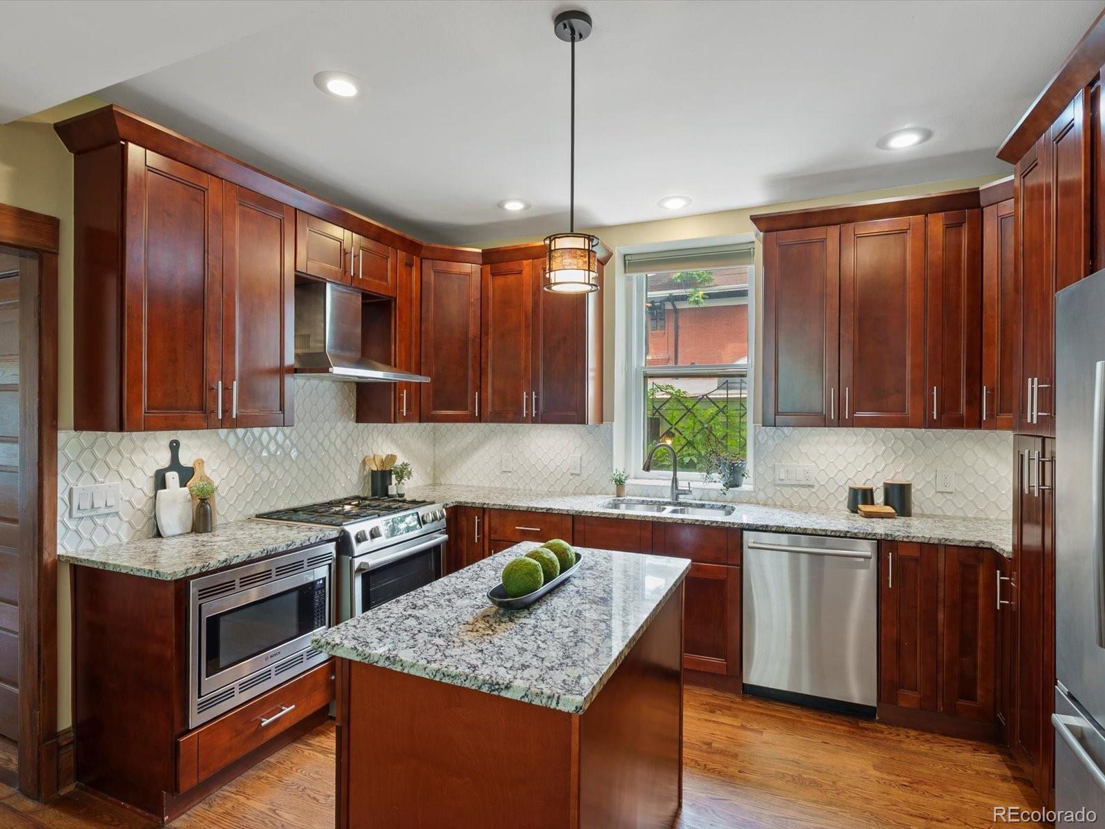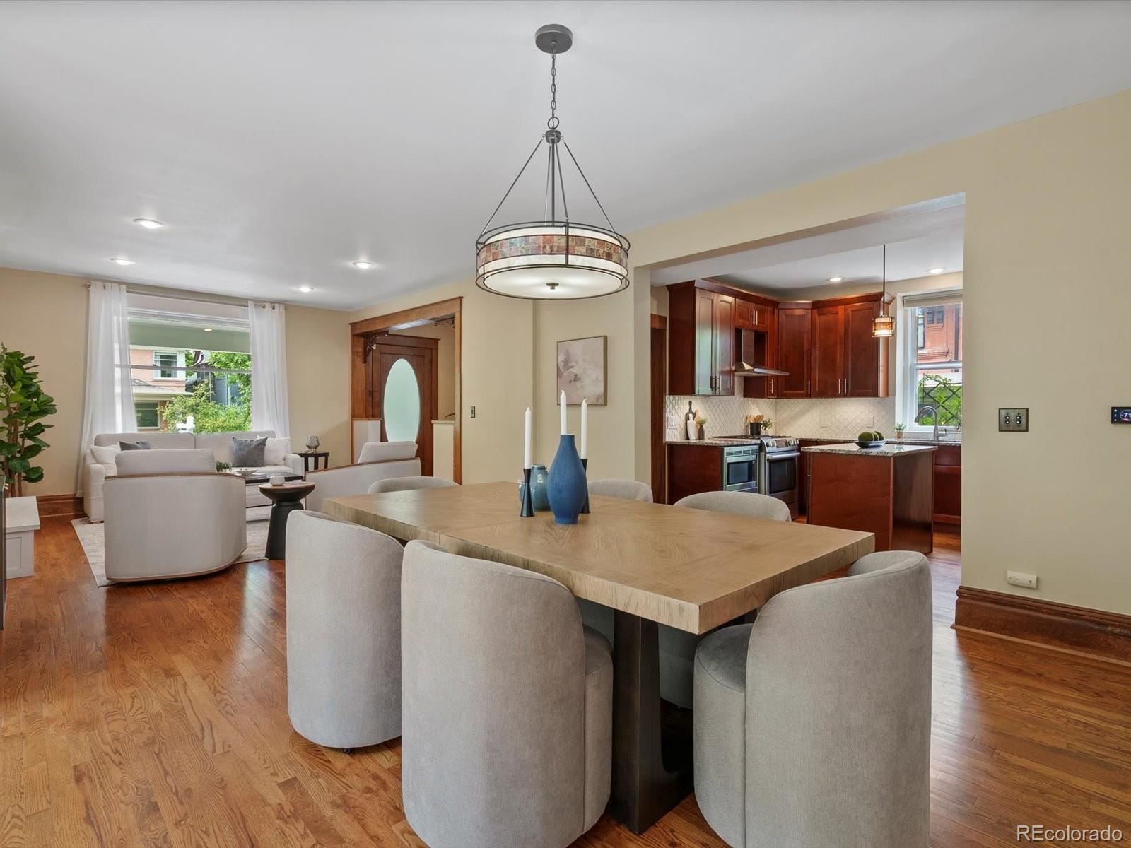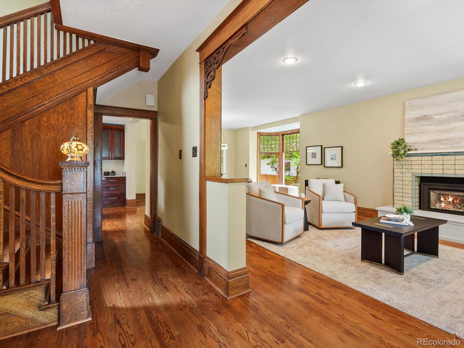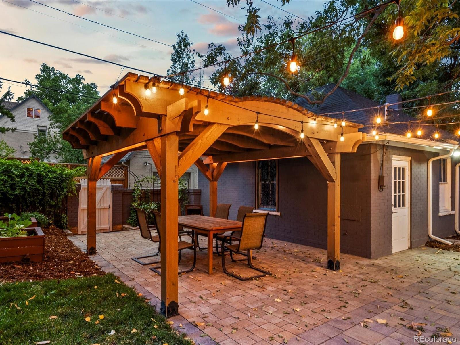 In the coveted 7th Avenue Historic District, where century-old trees line the streets and history lingers in brick and stone, a rare gem awaits. Built in 1907 and restored for modern living, this stunning Denver Square seamlessly blends timeless craftsmanship with refined designer detail. Set along one of Denver’s most iconic streets, the home welcomes you with lush landscaping and a gracious front porch. Inside, a parlor fireplace wrapped in Ann Sacks tile sets a warm, sophisticated tone, while the formal dining room glows alongside an original curved glass bay window. The gourmet kitchen, remodeled with cherry cabinetry and Bosch appliances, flows into a spacious family room that opens through French doors to a remarkable outdoor oasis. Entertain or unwind on the 400 sq. ft. patio beneath a pergola and bistro lighting, surrounded by a Hügelkultur garden, rose beds, and the original carriage house (turned garage) framed by a historic masonry wall. Upstairs, the spa-like primary suite features a luxurious bathroom and an oversized walk-in closet, complemented by a second bedroom and a full bath. The third floor expands the possibilities, offering flexible space for a home office, reading nook, creative studio, or additional guest suite. A rare finished basement adds yet another layer of functionality, featuring a private suite with its own entrance and laundry, making it perfect for multigenerational living, visiting guests, live-in support, or as an income-producing rental. This is more than a beautifully restored historic home: it’s a living piece of Denver history, with updates for peace of mind: new furnace (2025), custom Jellyfish lighting (2023), updated electrical and plumbing (2016), sewer line (2022), A/C (2017), and exquisite woodwork throughout. With a Walk Score of 91 and just blocks to Cheesman Park, Denver Botanic Gardens, Cherry Creek, and local shops, this home is rooted in one of the city’s most walkable, bikeable, and beloved neighborhoods.