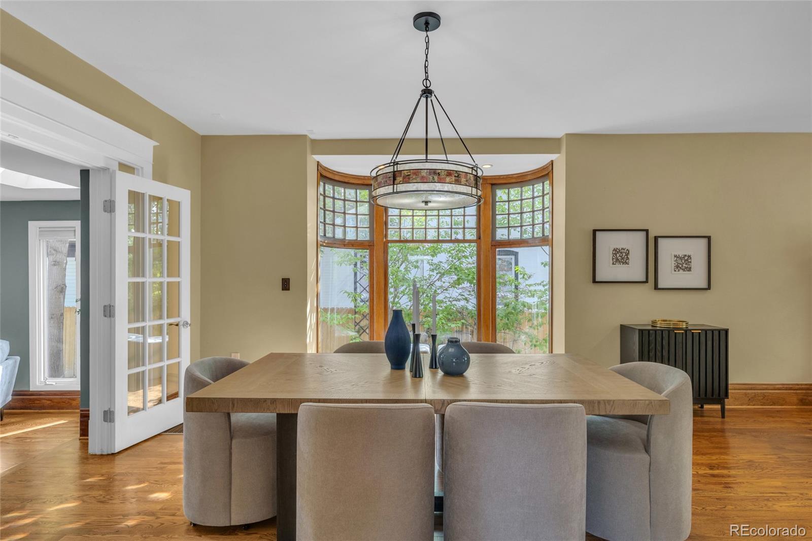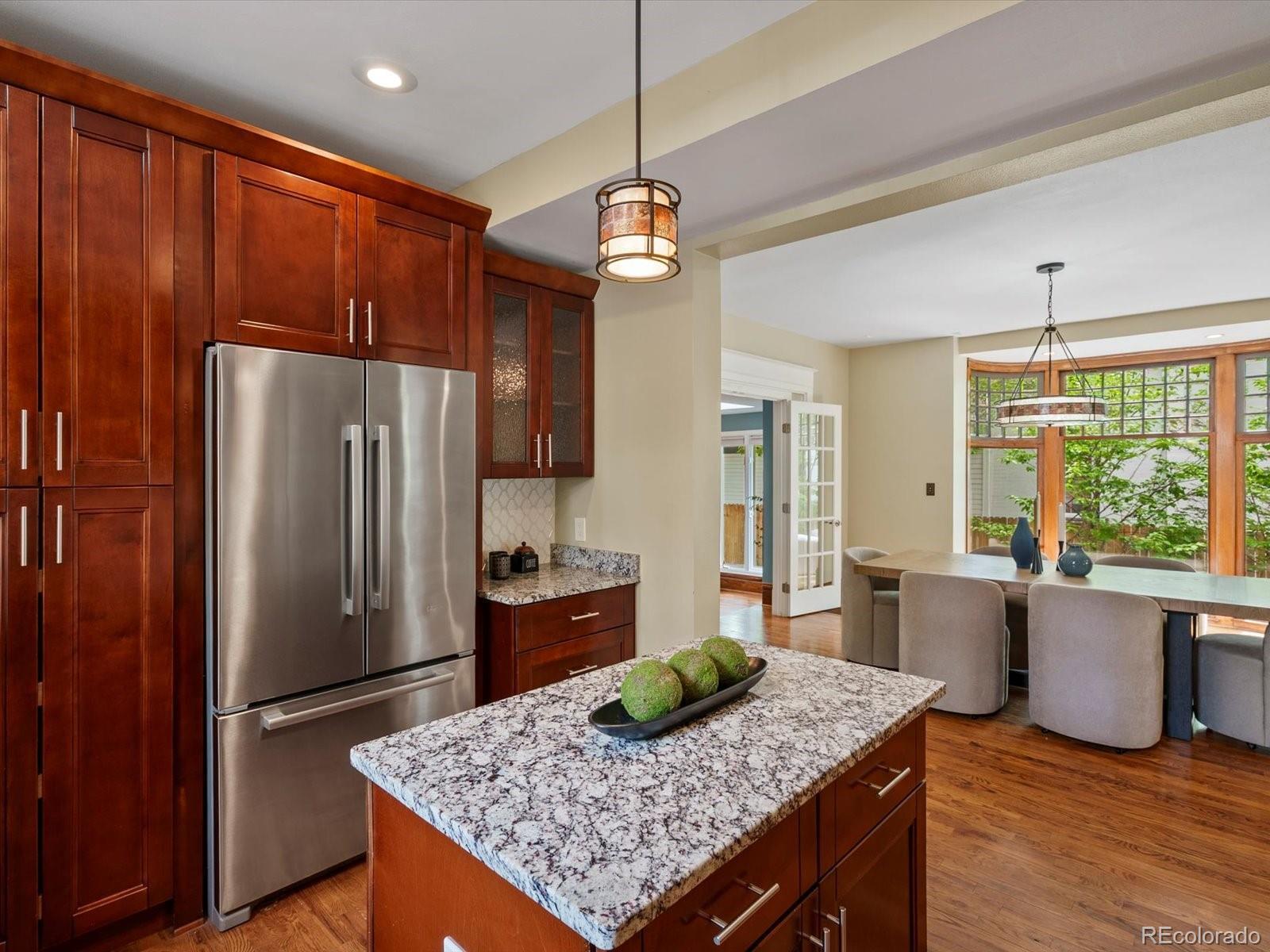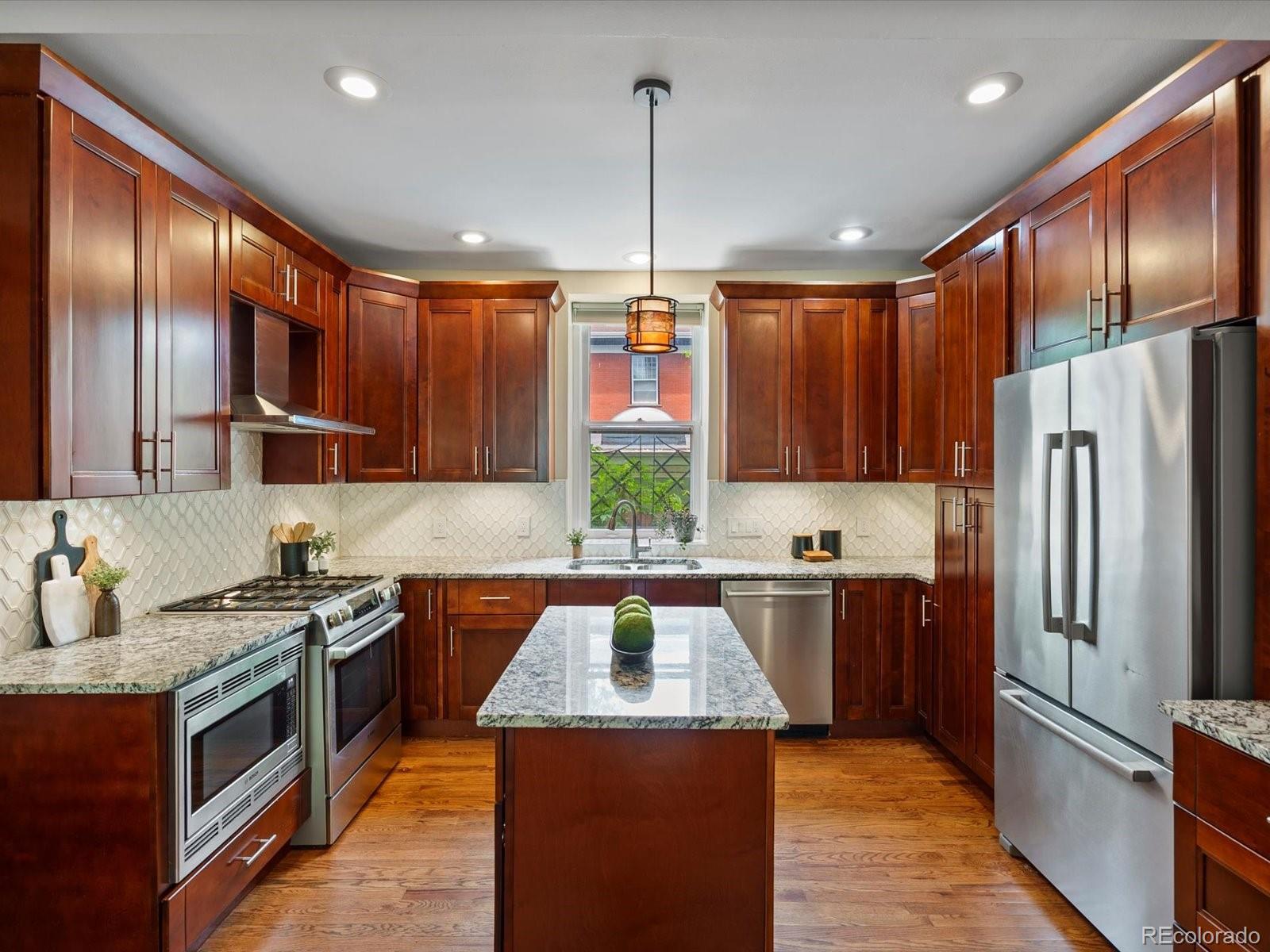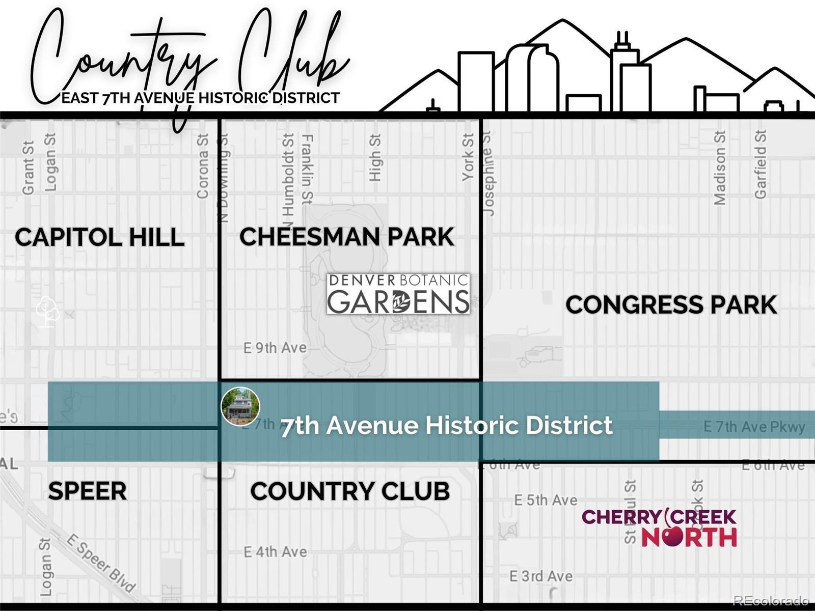 In the coveted 7th Avenue Historic District, where century-old trees line the streets and history lingers in brick and stone, a rare gem awaits. Built in 1907 and restored for modern living, this stunning Denver Square seamlessly blends timeless craftsmanship with refined designer detail. Set along one of Denver’s most iconic streets, the home welcomes you with lush landscaping and a gracious front porch. Inside, a parlor fireplace wrapped in Ann Sacks tile sets a warm, sophisticated tone, while the formal dining room glows alongside an original curved glass bay window. The gourmet kitchen, remodeled with cherry cabinetry and Bosch appliances, flows into a spacious family room that opens through French doors to a remarkable outdoor oasis. Entertain or unwind on the 400 sq. ft. patio beneath a pergola and bistro lighting, surrounded by a Hügelkultur garden, rose beds, and the original carriage house (turned garage) framed by a historic masonry wall. Upstairs, the spa-like primary suite features a luxurious bathroom and an oversized walk-in closet, complemented by a second bedroom and a full bath. The third floor expands the possibilities, offering flexible space for a home office, reading nook, creative studio, or additional guest suite. A rare finished basement adds yet another layer of functionality, featuring a private suite with its own entrance and laundry, making it perfect for multigenerational living, visiting guests, live-in support, or as an income-producing rental. This is more than a beautifully restored historic home: it’s a living piece of Denver history, with updates for peace of mind: new furnace (2025), custom Jellyfish lighting (2023), updated electrical and plumbing (2016), sewer line (2022), A/C (2017), and exquisite woodwork throughout. With a Walk Score of 91 and just blocks to Cheesman Park, Denver Botanic Gardens, Cherry Creek, and local shops, this home is rooted in one of the city’s most walkable, bikeable, and beloved neighborhoods.