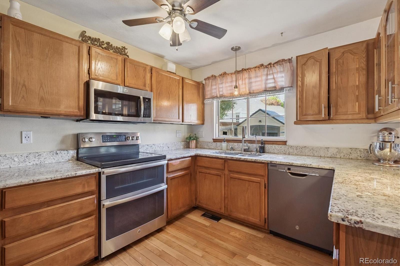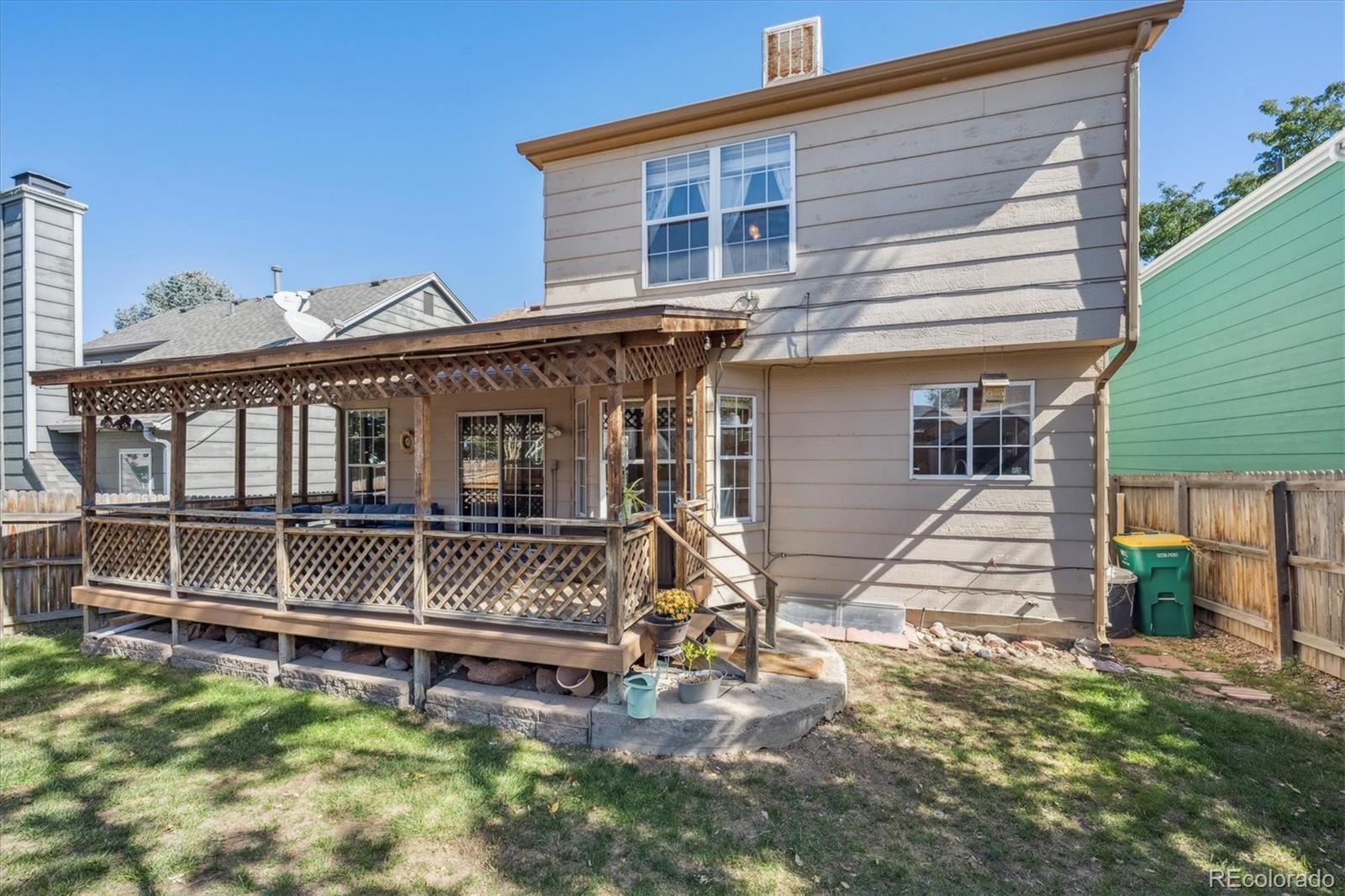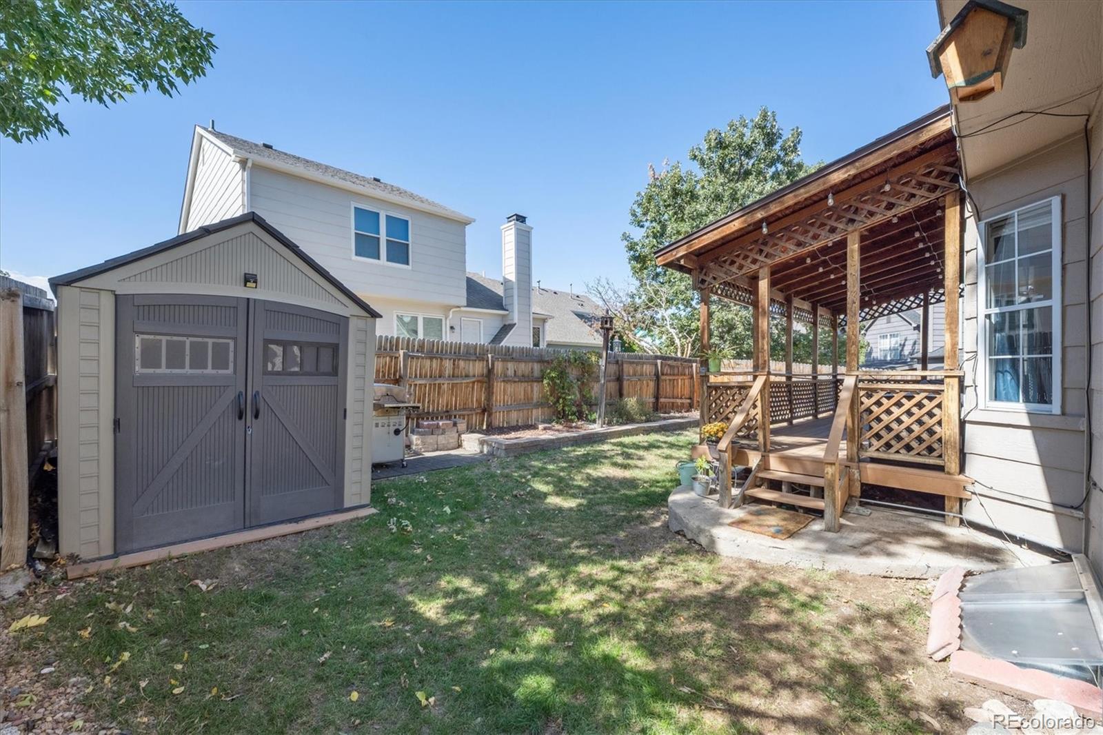 Welcome to your next home in the heart of Wright Farms! This three-bedroom, three-bathroom residence combines charm and function with a layout designed for comfortable living and entertaining. Step inside to find real hardwood floors and a spacious coat closet at the entryway. The main level opens up into a bright, airy living area that flows seamlessly into the kitchen, complete with granite countertops, double ovens, an ample pantry, and plenty of cabinet space. Upstairs, the primary suite offers two closets—a generous walk-in and an additional wall closet—plus a private ensuite bath. Two more bedrooms and a full bathroom complete the upper level. The finished basement extends your living space with a versatile great room, flex space, laundry area, and a convenient three-quarter bath. Two full egress windows brighten the space with natural sunlight. Enjoy Colorado seasons in the backyard retreat, complete with a deck, flower beds, mature landscaping, and a shed. The attached two-car garage features built-in storage, maximizing functionality. Perfectly located, this home is walking distance to Wright Farms Library, the new Billy’s Birch, Starbucks, and Trail Winds Rec Center, with quick access to public transportation. This Property also has an assumable FHA loan locked in at just 4.5%!! Opportunities like this don’t come along often: a single-family home in Wright Farms for under $500,000! Don’t wait—this one won’t last long.