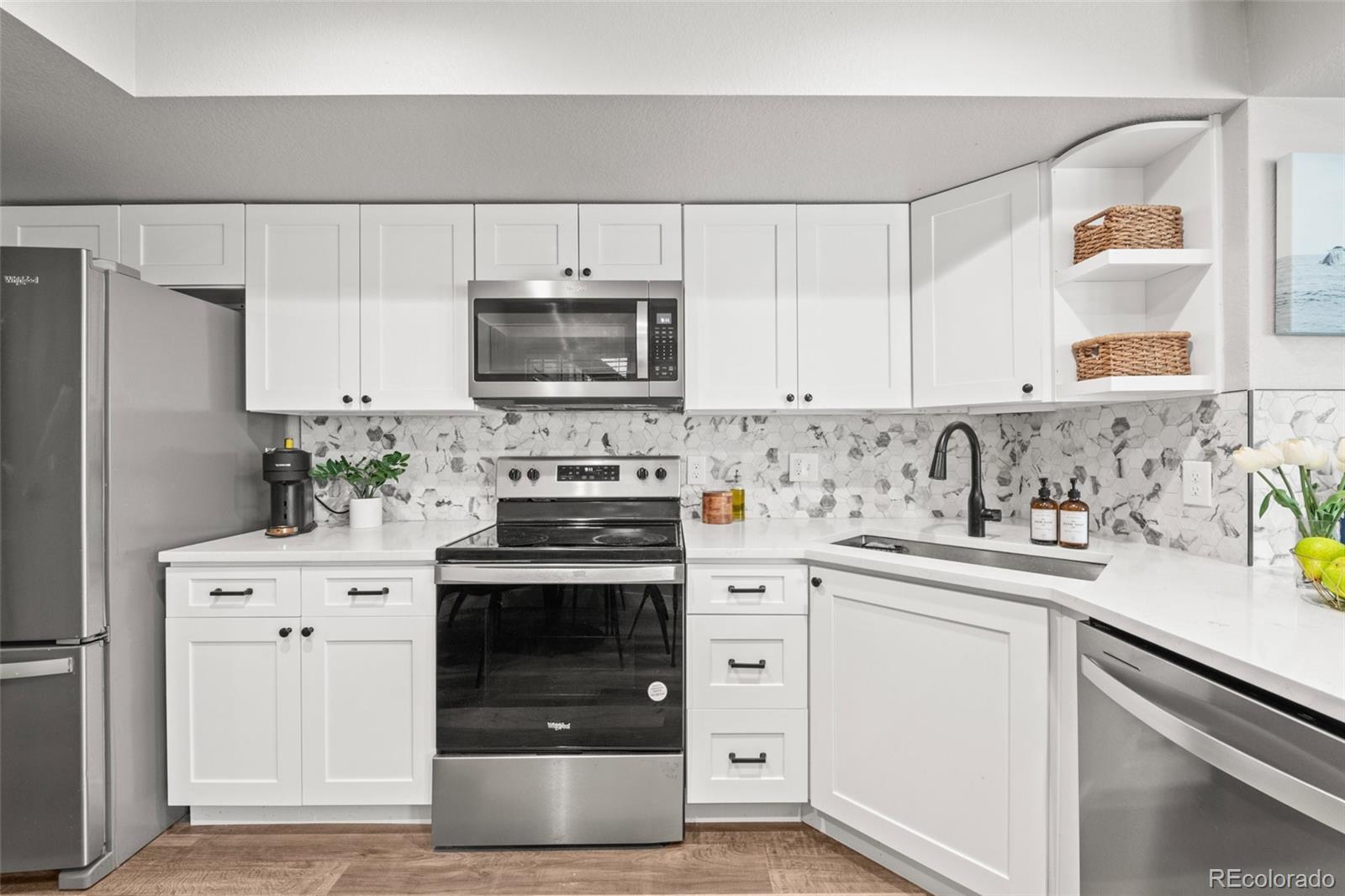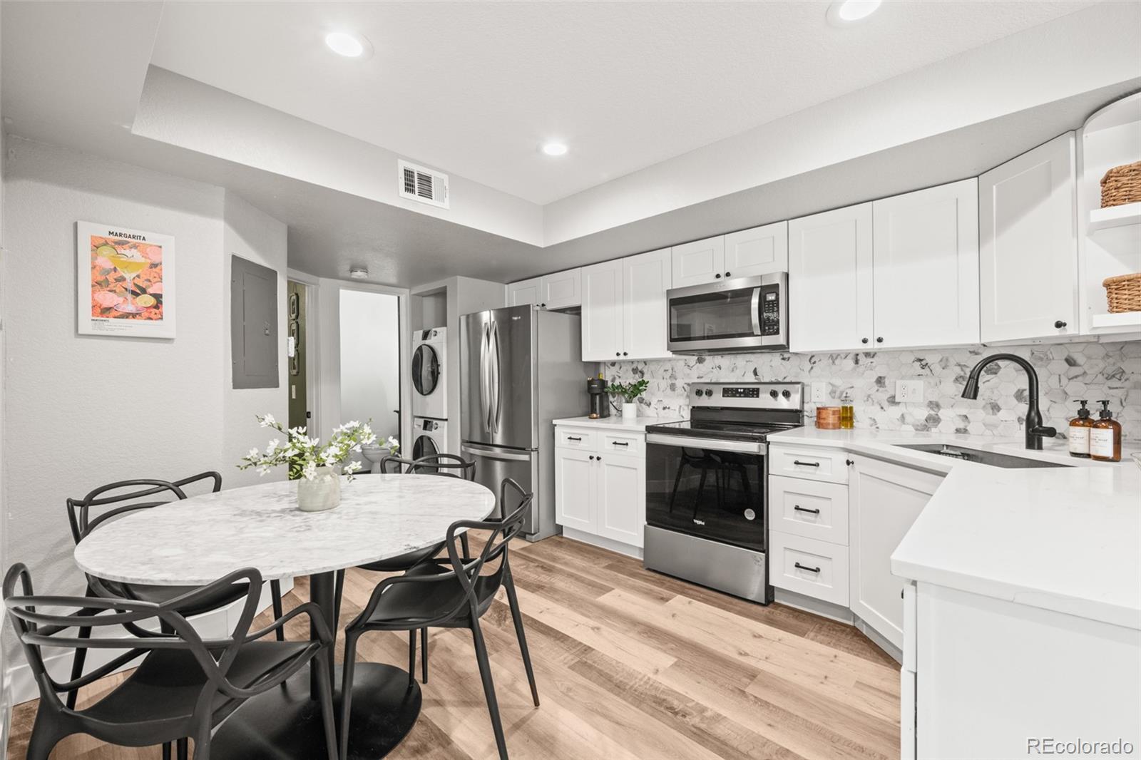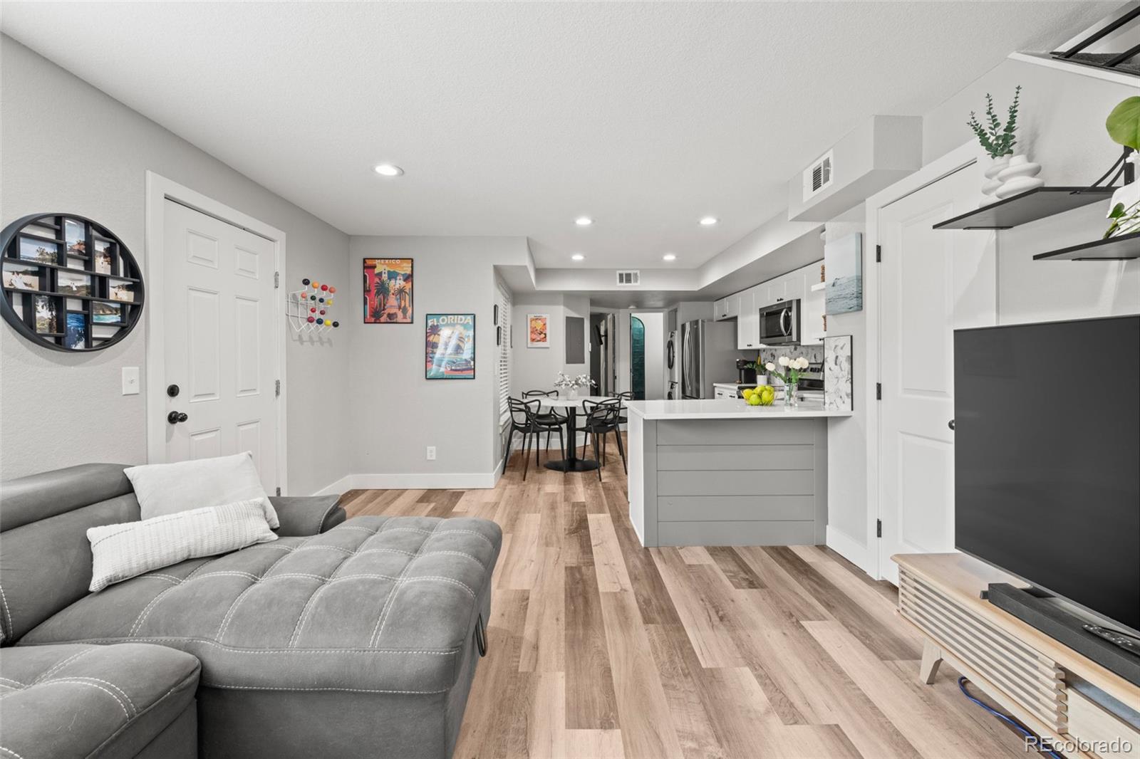 Welcome to a beautifully updated retreat in Aurora—where modern design, comfort, and convenience come together in one inviting package! This thoughtfully renovated 2-bedroom, 1-bathroom condo stands out from the rest with its bright, open layout, soaring vaulted ceilings, and stylish finishes throughout. Step into the light-filled kitchen, where quartz countertops, stainless steel appliances, and sleek cabinetry create the perfect blend of function and style. The open living area is anchored by a cozy fireplace with a striking shiplap accent wall—adding warmth and personality to the space. Upstairs, a versatile lofted second bedroom offers flexibility for a guest room, home office, or creative studio. The custom-designed bathroom is a true showpiece, featuring rich green tile, elegant gold accents, and a modern aesthetic that elevates daily routines. A private deck with extra storage extends your living space outdoors, while in-unit laundry adds everyday convenience. Beyond your front door, you’ll enjoy access to a refreshing community pool, perfect for relaxing on sunny Colorado days. Ideally situated near shopping, dining, parks, and easy commuter routes, this home offers a low-maintenance lifestyle without sacrificing comfort or style. Don’t miss your chance to own one of the most updated condos in the community—schedule your private showing today! ***** UP TO 1% LENDER-PAID CREDIT AVAILABLE WHEN YOU CHOOSE PREFERRED LENDER, LOAN OFFICER WITH OPTION 1 MORTGAGE FOR FINANCING THIS PROPERTY. INCENTIVE AVAILABLE ONLY FOR ELIGIBLE LOAN PROGRAMS. ADDITIONAL BORROWER AND PROPERTY QUALIFICATIONS APPLY. COST AND BENEFIT OF CREDIT DETERMINED AT TIME OF RATE LOCK.*****