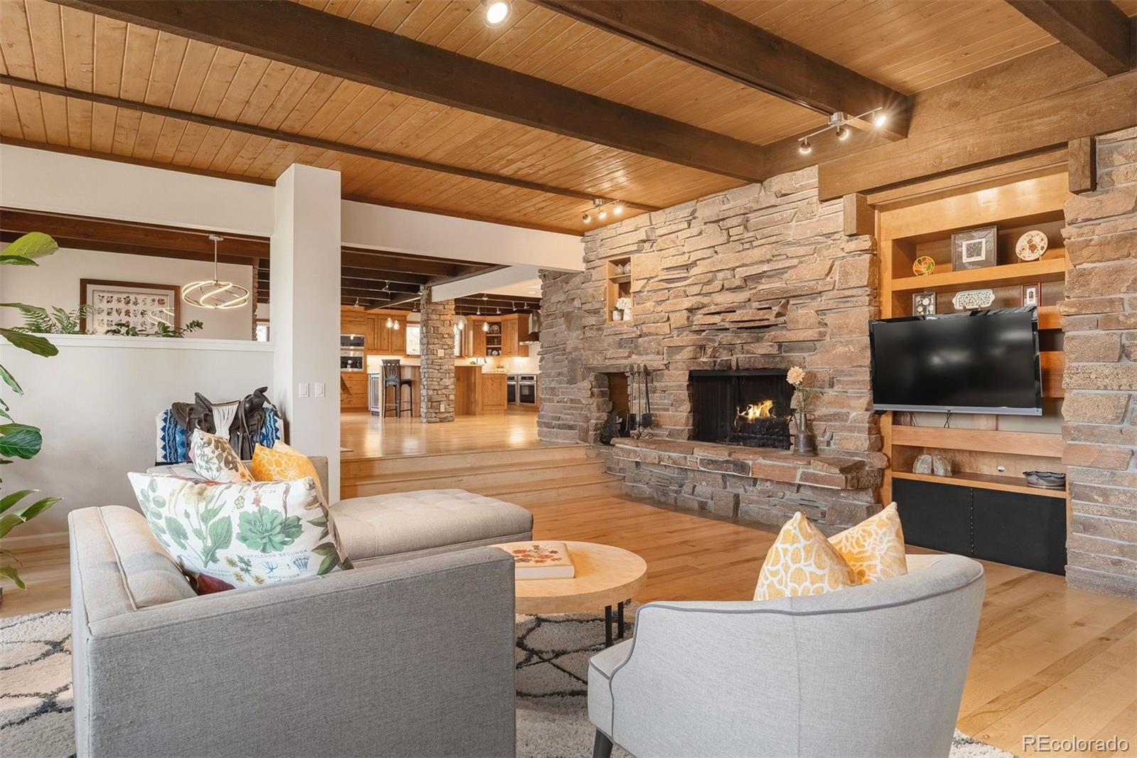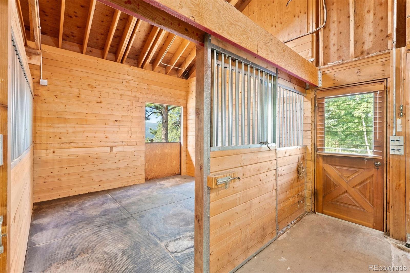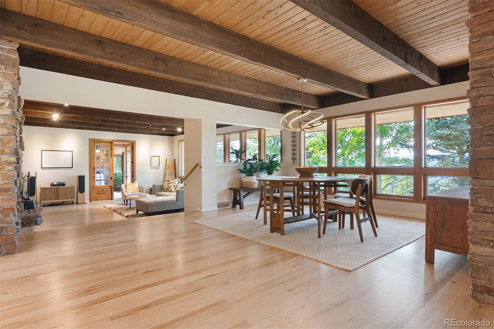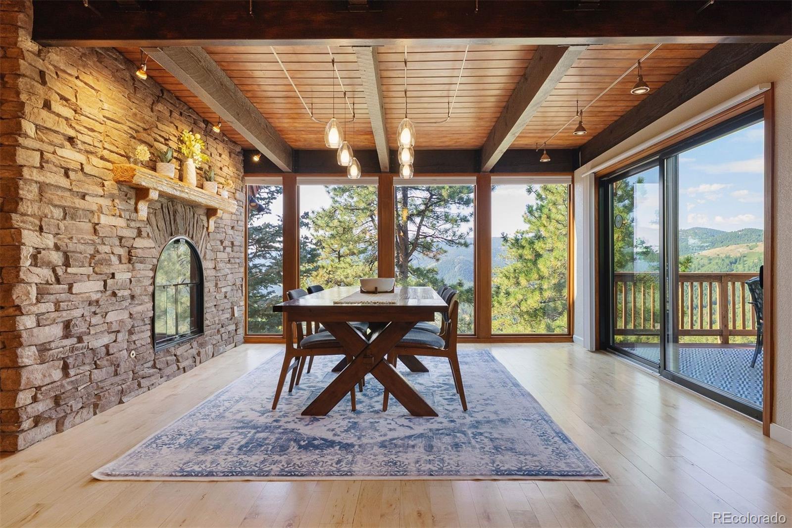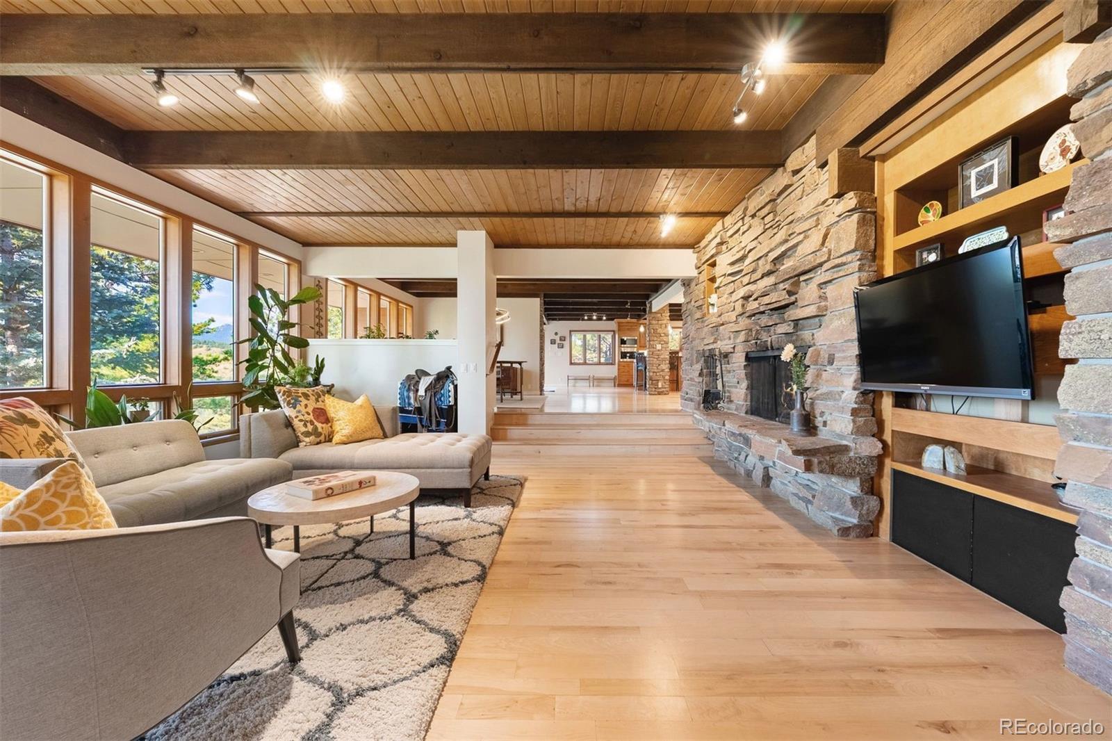 Set upon expansive acreage in a secluded gated mountain sanctuary known as West Ranch, this extraordinary estate captivates with breathtaking Colorado views. Originally constructed in 1977 by a Denver Broncos player, this residence is special in every sense of the word. It has undergone several renovations to maintain its luxurious appeal while preserving its unique character. The 7,285 square feet of impeccably designed living space is enhanced by extensive decks, providing unparalleled mountain viewing and sophisticated entertaining opportunities. The open floor plan floods the home with natural light through expansive windows framing stunning views. The gourmet kitchen boasts alder cabinetry, quartz countertops, a gleaming tile backsplash, premium appliances, and eye-catching light fixtures. Wood flooring flows throughout the main level, encompassing a custom office, television room, hearth room, and dining area. The upper level houses a magnificent primary suite with private deck for capturing panoramic views, plus an additional spacious bedroom with full bathroom. Multiple fireplaces create inviting ambiance throughout the residence, while the finished basement offers a kitchenette, recreation room with fireplace, and remarkable walk-in wine cellar. Outdoor entertainment flourishes on the walkout basement patio featuring grilling areas, water features, and gas fire pit. The impeccably kept grounds feature lush landscaping, a flat backyard lawn, and a central courtyard with vibrant plantings that evoke an enchanting English garden. Equestrians will appreciate the three-stall barn with paddock area, perfectly blended with mountain living. With 1,250 acres and just 52 home-sites, surrounded by 500 acres of preserved open space, this remarkable community prioritizes environmental stewardship, wildlife preservation, and beauty while maintaining exceptional privacy and security. You'll enjoy unparalleled mountain tranquility while finding convenience to amenities.