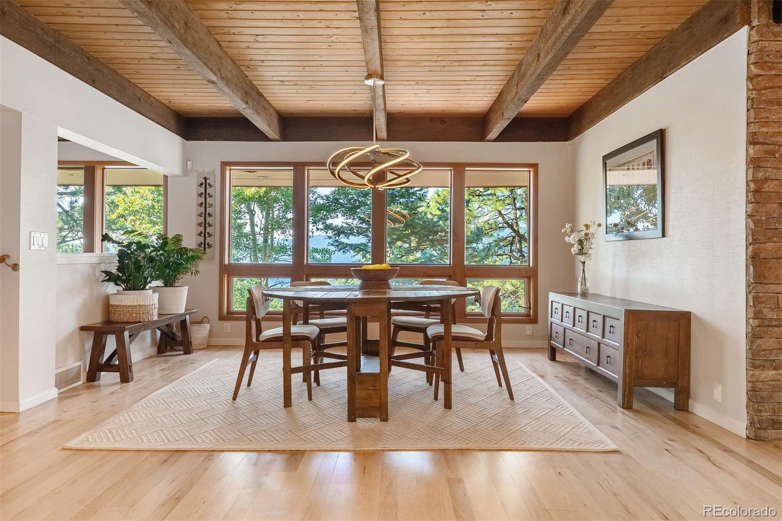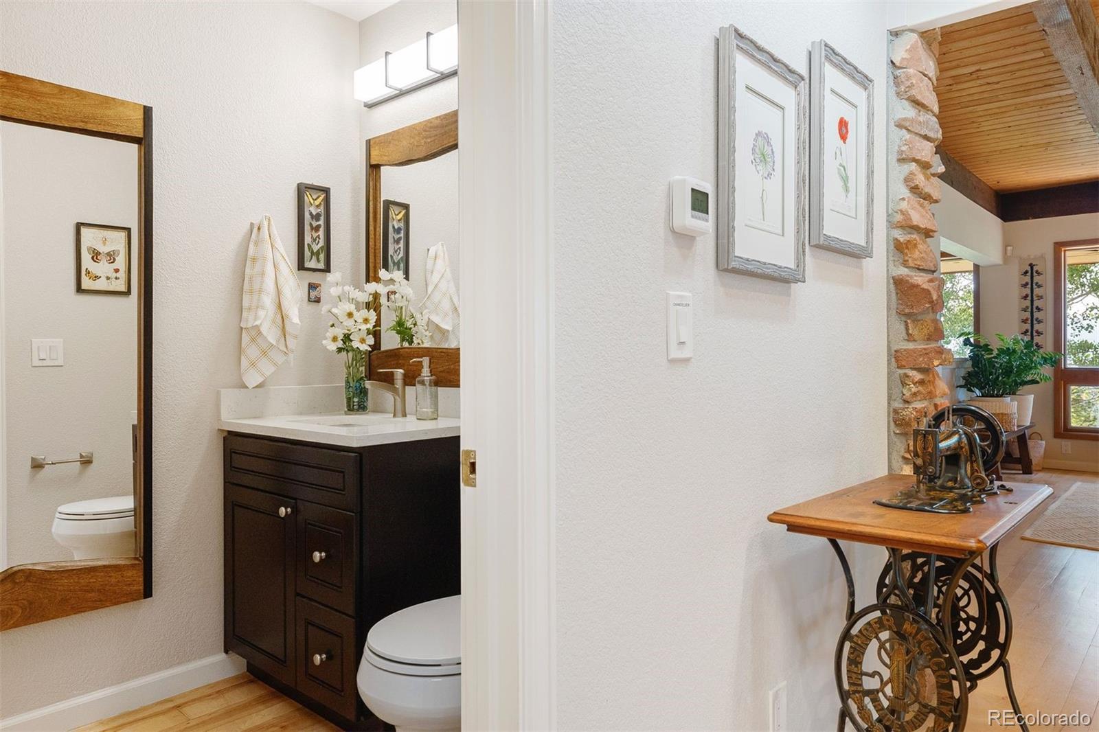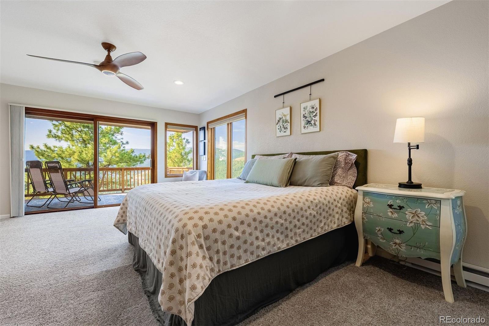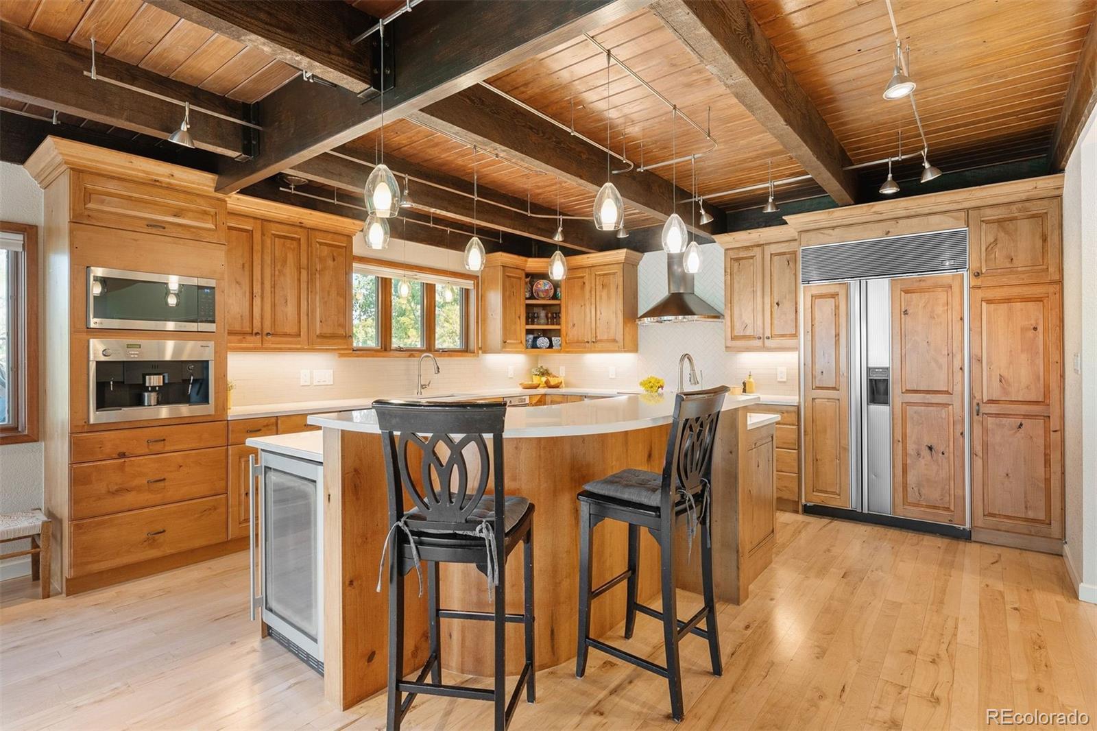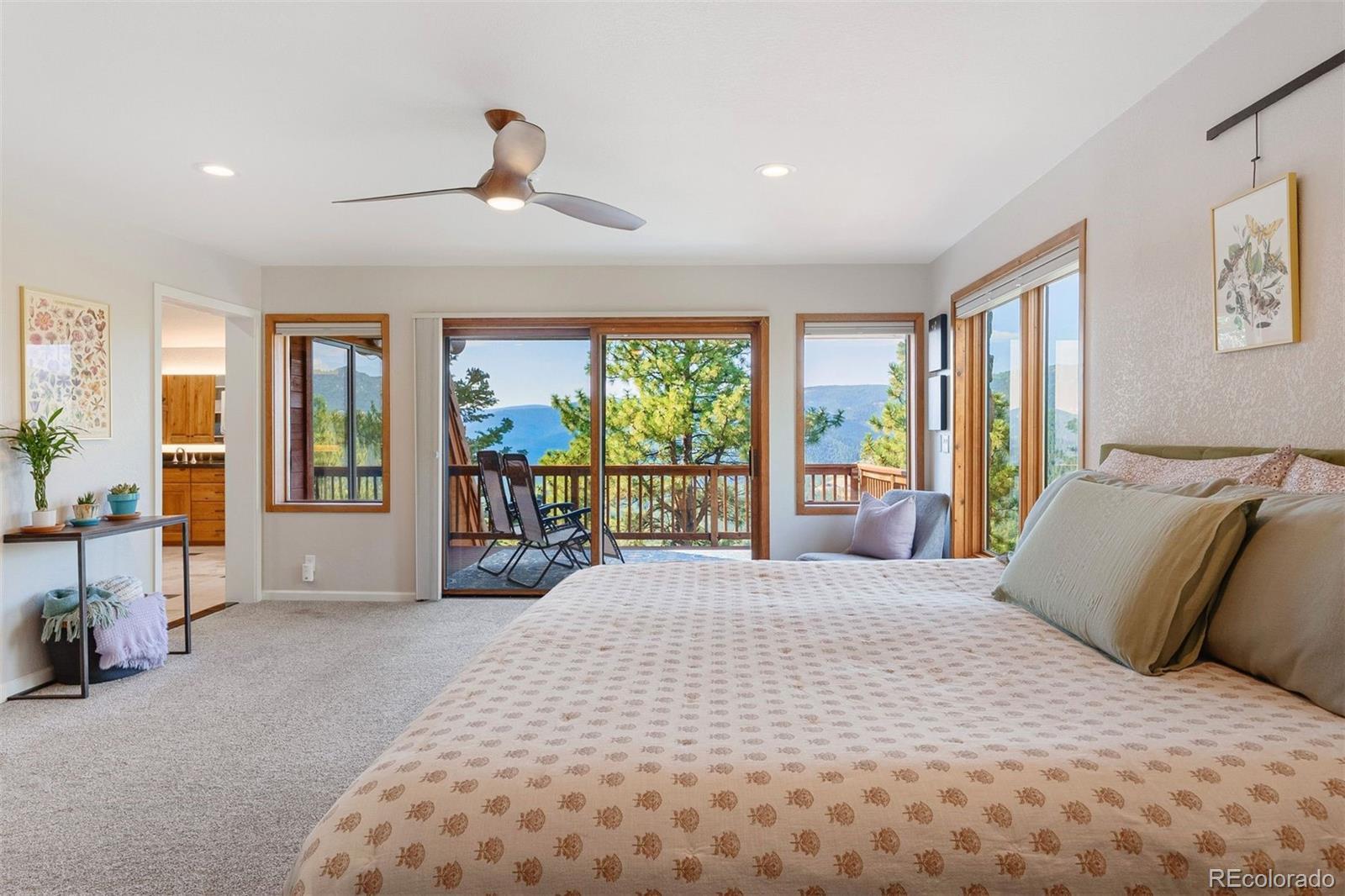 Set upon expansive acreage in a secluded gated mountain sanctuary known as West Ranch, this extraordinary estate captivates with breathtaking Colorado views. Originally constructed in 1977 by a Denver Broncos player, this residence is special in every sense of the word. It has undergone several renovations to maintain its luxurious appeal while preserving its unique character. The 7,285 square feet of impeccably designed living space is enhanced by extensive decks, providing unparalleled mountain viewing and sophisticated entertaining opportunities. The open floor plan floods the home with natural light through expansive windows framing stunning views. The gourmet kitchen boasts alder cabinetry, quartz countertops, a gleaming tile backsplash, premium appliances, and eye-catching light fixtures. Wood flooring flows throughout the main level, encompassing a custom office, television room, hearth room, and dining area. The upper level houses a magnificent primary suite with private deck for capturing panoramic views, plus an additional spacious bedroom with full bathroom. Multiple fireplaces create inviting ambiance throughout the residence, while the finished basement offers a kitchenette, recreation room with fireplace, and remarkable walk-in wine cellar. Outdoor entertainment flourishes on the walkout basement patio featuring grilling areas, water features, and gas fire pit. The impeccably kept grounds feature lush landscaping, a flat backyard lawn, and a central courtyard with vibrant plantings that evoke an enchanting English garden. Equestrians will appreciate the three-stall barn with paddock area, perfectly blended with mountain living. With 1,250 acres and just 52 home-sites, surrounded by 500 acres of preserved open space, this remarkable community prioritizes environmental stewardship, wildlife preservation, and beauty while maintaining exceptional privacy and security. You'll enjoy unparalleled mountain tranquility while finding convenience to amenities.