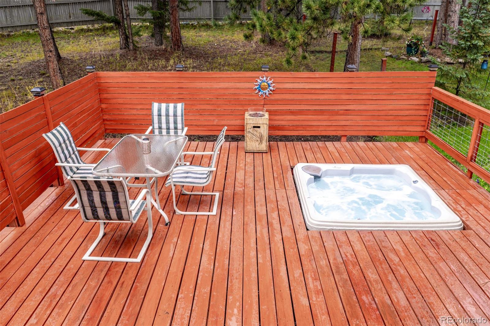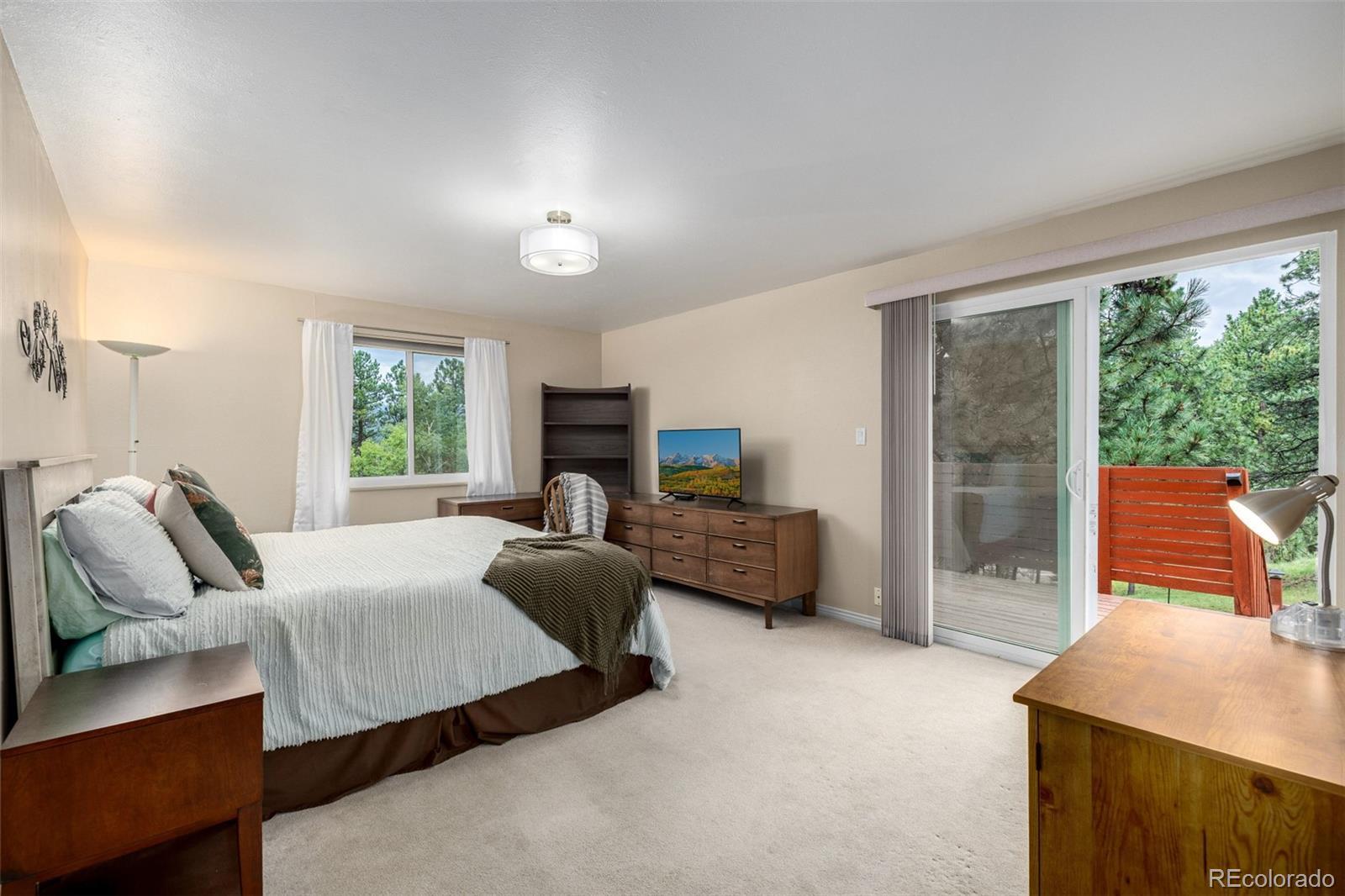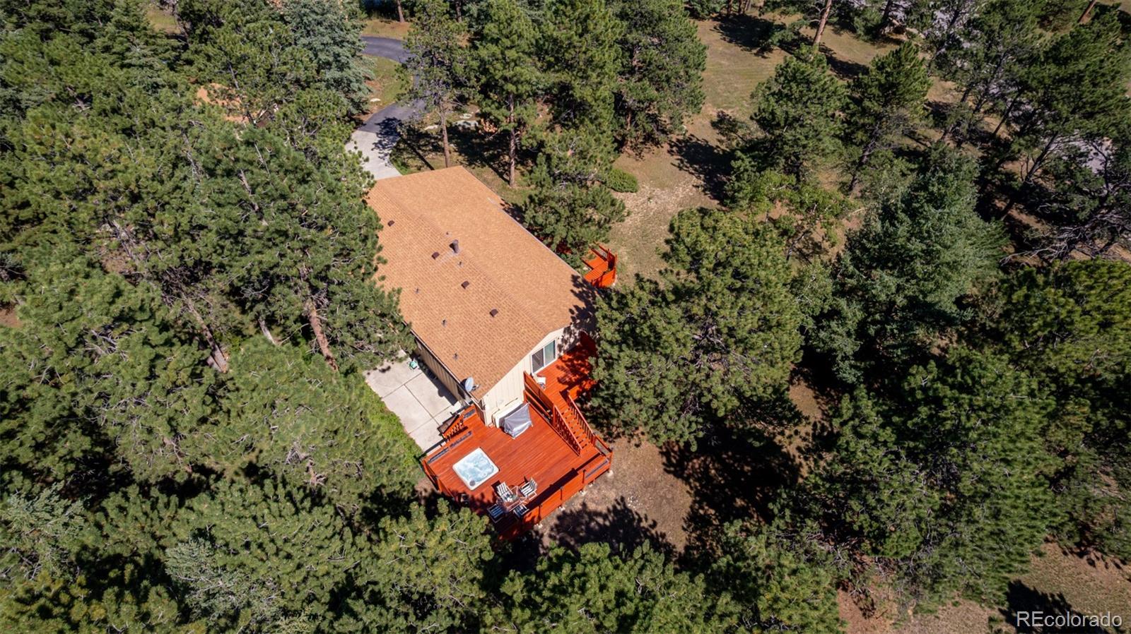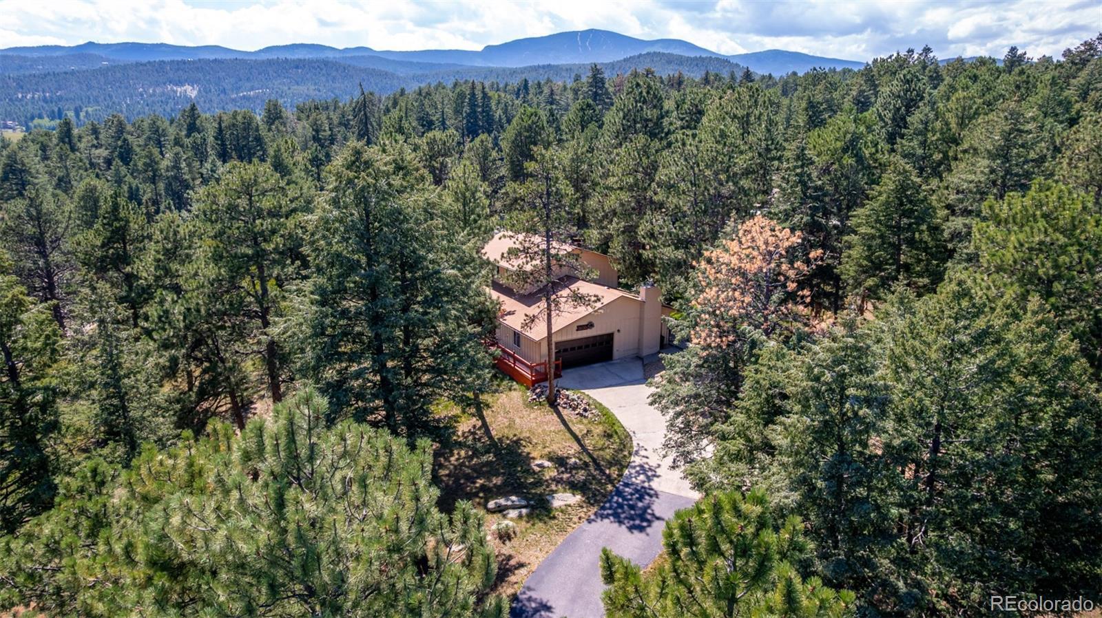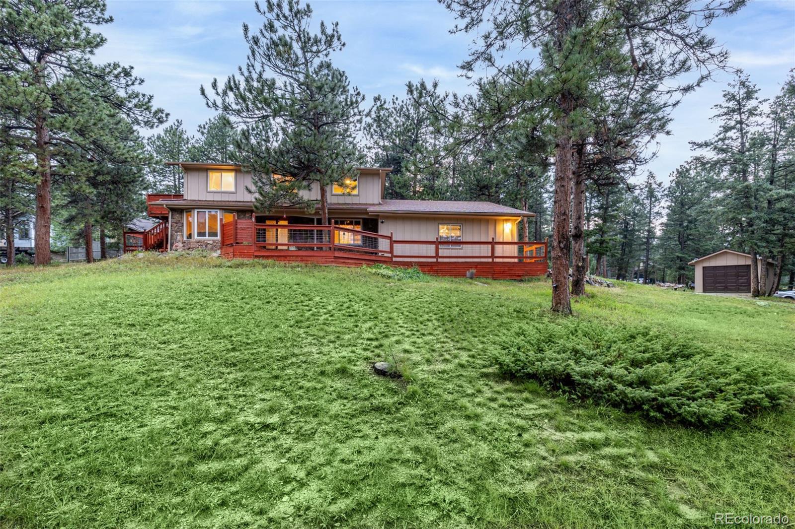 Seller just added a $5500 cedar fence in the back for enhanced seclusion and property meets Jefferson County requirements for short-term rental permitting! Our preferred lender is offering 1/2 point buy-down for 12 months AND $2500 towards closing! A rare blend of space and mountain charm, this Evergreen retreat delivers approximately 3,017 sqft across three well-planned levels on a treed lot. The main floor opens with a tiled foyer leading to an airy living room with a broad bay window, a defined dining area, and a bright kitchen with an adjoining breakfast nook. A flex room offers another gathering zone, while a1/2 bath and main-level laundry keep daily rhythms simple. Upstairs, 4 bedrooms are grouped together for comfort and convenience, including a generous primary suite; a separate hall bathroom serves the additional 3 bedrooms—just the right layout for guests or quiet creative space. The lower level adds a large rec. room for games or workouts, a mirrored closet, an extra room fora nonconforming bedroom, and a utility area which is plumbed and an additional bathroom could be added. Outdoor living shines: a wide deck wrapped by privacy screening features an inset hot tub for year-round soaking, and the primary suite opens to a private balcony to take in the fresh air. An attached 2 car garage plus a detached 1 car garage are included. Thoughtful touches appear throughout: many windows framing treed views, a window seat at the bay, and paths linking the house and decks. Set within the Evergreen community, enjoy mountain-town energy with everyday amenities close at hand. Explore local trails at Flying J Ranch Park, sip at The Well at Bradford Junction, and discover year-round events and festivals. From tranquil mornings on the deck to star-filled evenings in the hot tub, this is a welcoming home base for the Colorado lifestyle. Live in a vibrant mountain community, where nature, convenience, and small-town charm unite to create a perfect lifestyle.