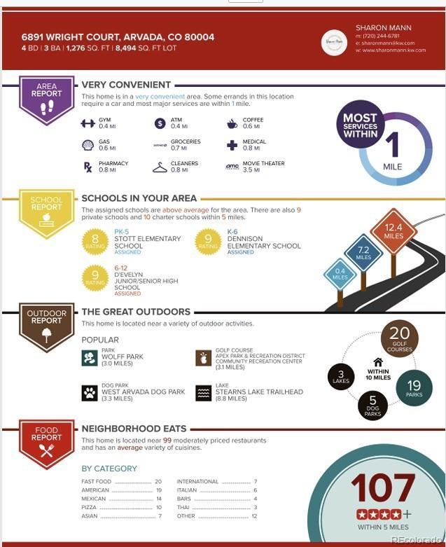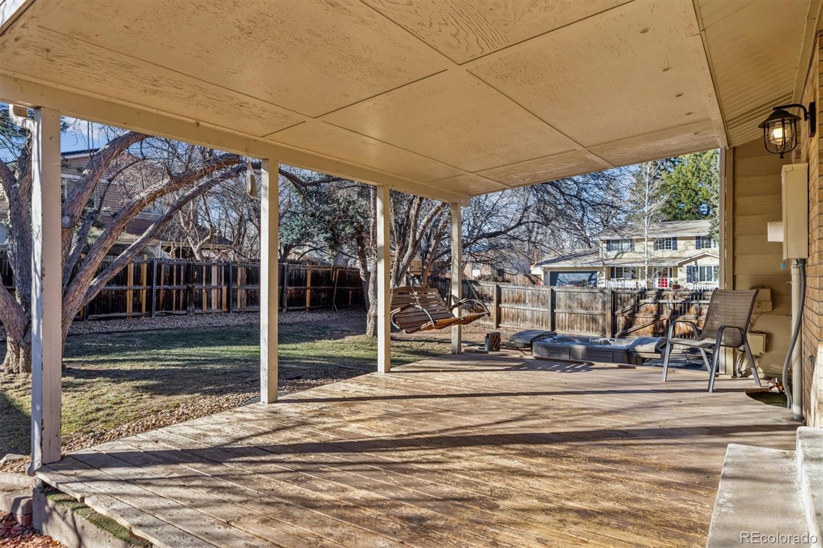 Extraordinary value in a highly sought-after neighborhood with easy access to the mountains, nearby hiking trails, Olde Town Arvada, and the city of Denver. This home offers a highly functional kitchen layout, ample bedroom space, a family room with a wood-burning fireplace, a HUGE private backyard complete with a working hot tub, an uncovered patio with a fire pit, a covered patio, raised garden beds, and mature landscaping. The deep attached two-car garage is a hobbyist's dream, with a workbench and ample storage nook on the side. Sensible pricing makes this property appealing to a wide range of buyers. Inclusions: In addition to the appliances listed: hot tub, free-standing basketball hoop, fire pit, two TV mounts, TV on the downstairs mount, porch swing, outdoor chairs, porch swing, outdoor chairs, and window coverings. Exclusion: the TV behind the door in the furnace room, but negotiable. Sprinkler system works and the box is in the downstairs bedroom.