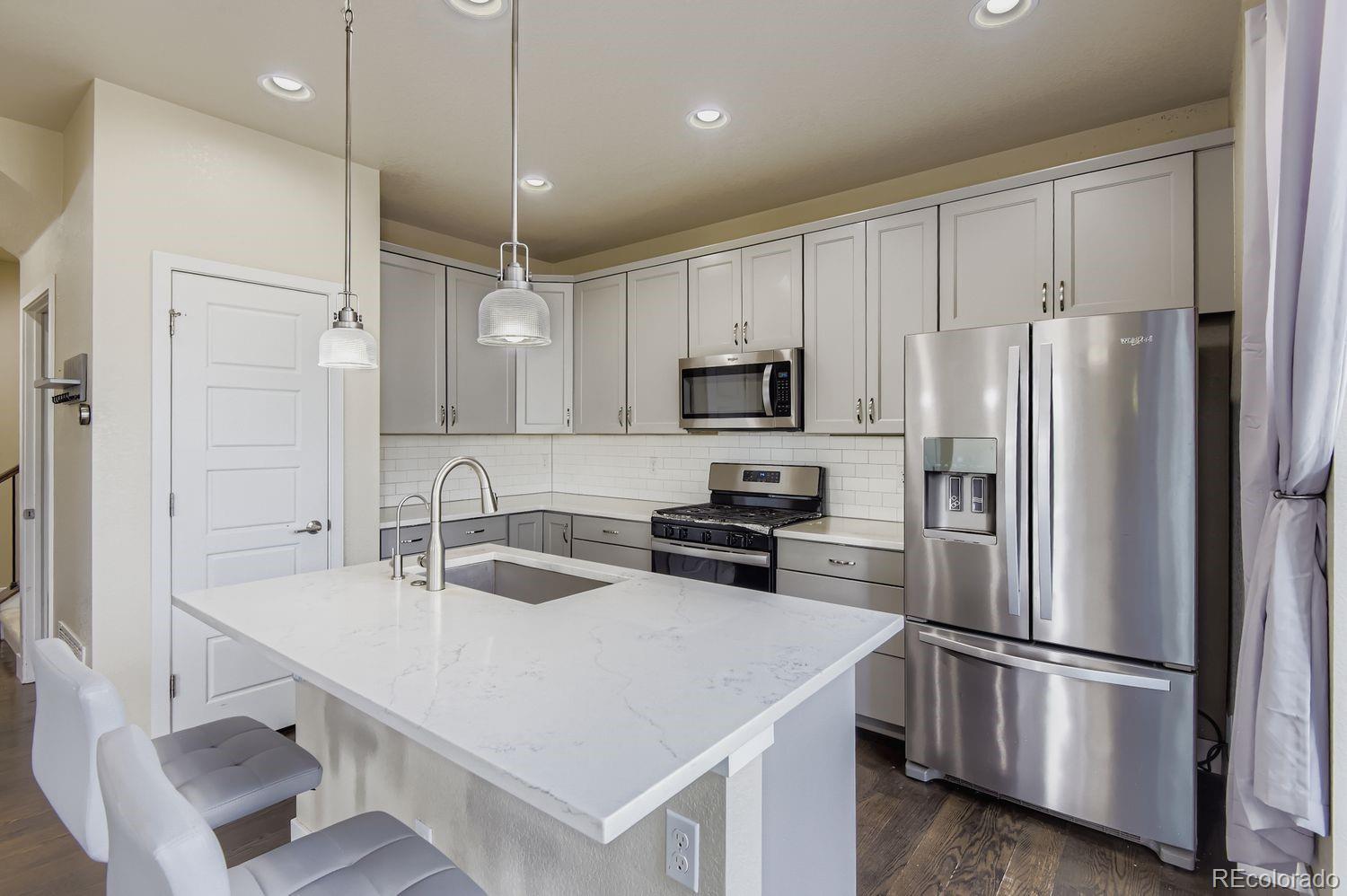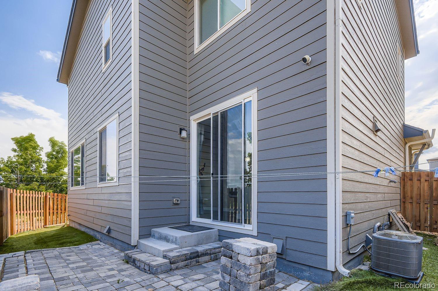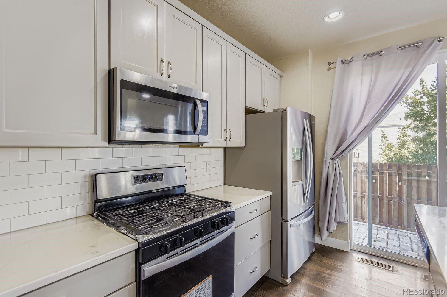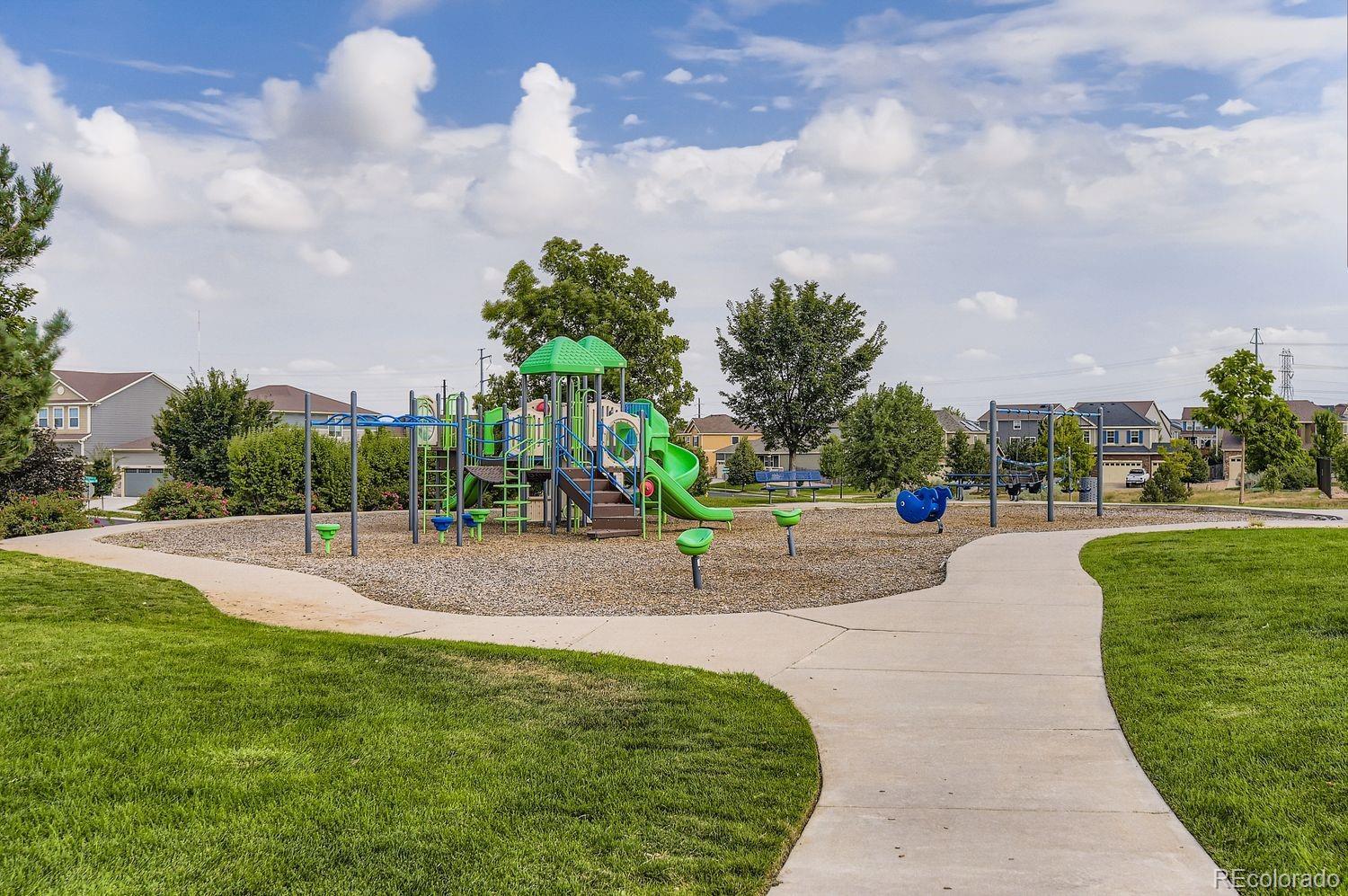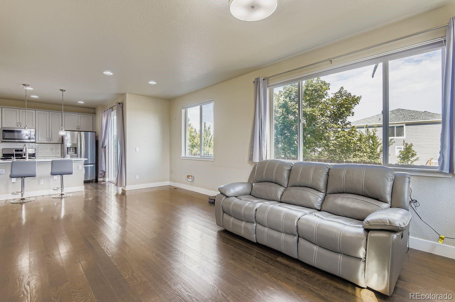 Welcome to this stunning corner-lot home that truly has it all! Step inside to discover a bright, open layout with warm tones and well-maintained hardwood floors throughout the main level. The first floor features a spacious family room, stylish half bath, and a beautifully designed eat-in kitchen showcasing chic gray cabinetry, stainless steel appliances, and white quartz countertops. A sliding door leads to the private backyard patio with artificial turf perfect for entertaining, grilling, or relaxing outdoors with minimal upkeep. Upstairs, you’ll find a generous primary suite with a walk-in closet, two additional bedrooms, and a full bath. The finished basement adds incredible flexibility with a fourth bedroom, full bathroom, and two large storage rooms. This home sits directly across from the community pool, clubhouse, and park, offering unbeatable convenience. Located in a vibrant, family-friendly neighborhood just minutes from downtown Parker, shopping, dining, and endless trails, this property truly combines style, comfort, and location. Don’t miss the opportunity to make this your dream home—schedule your showing today!