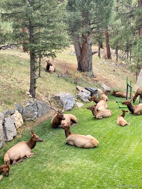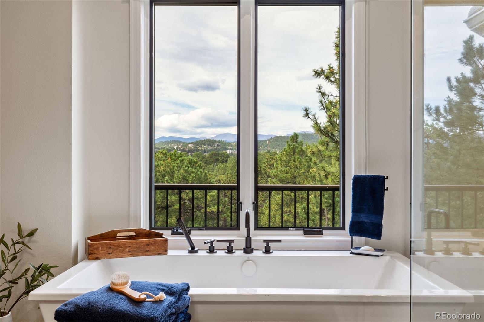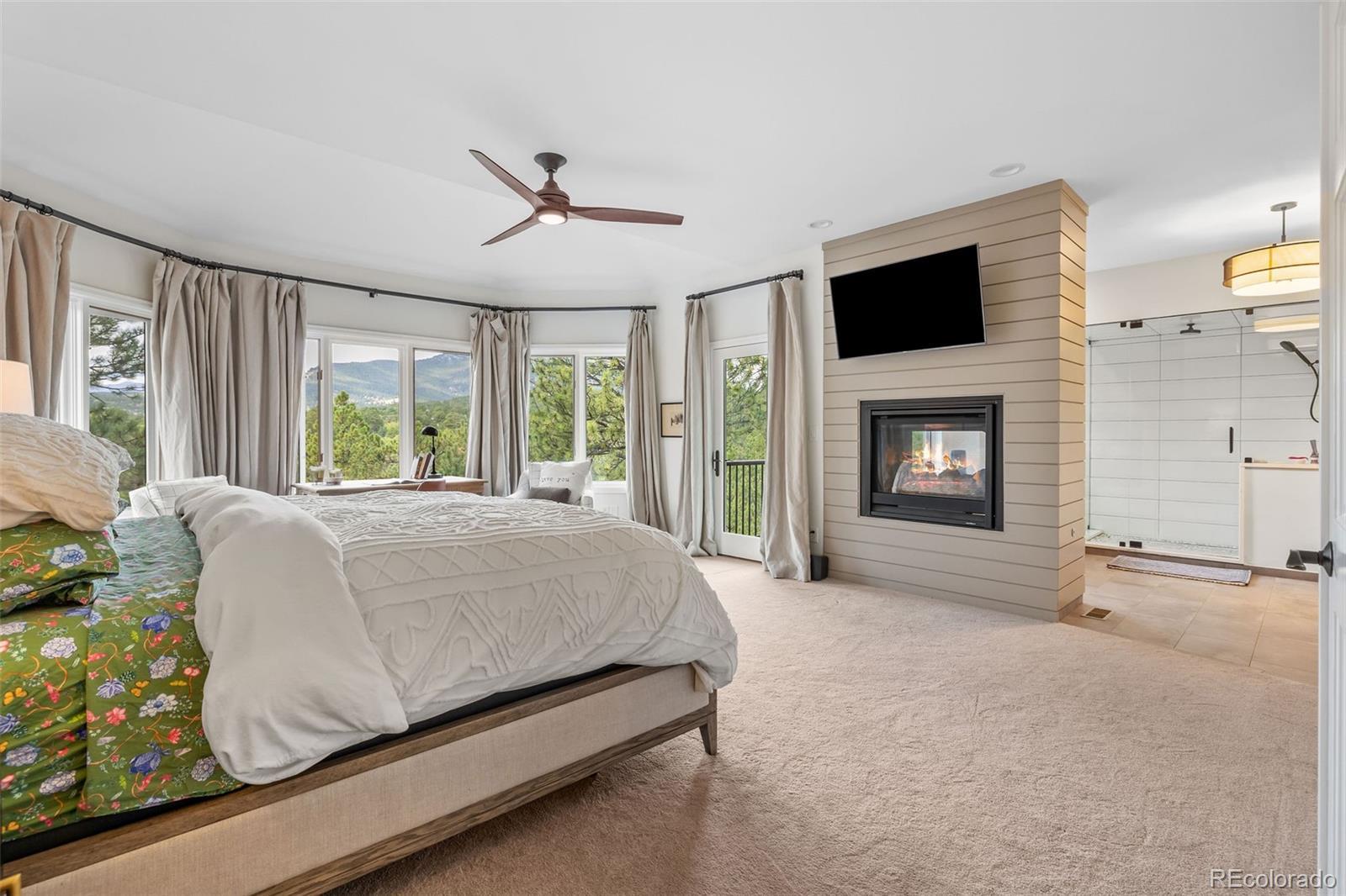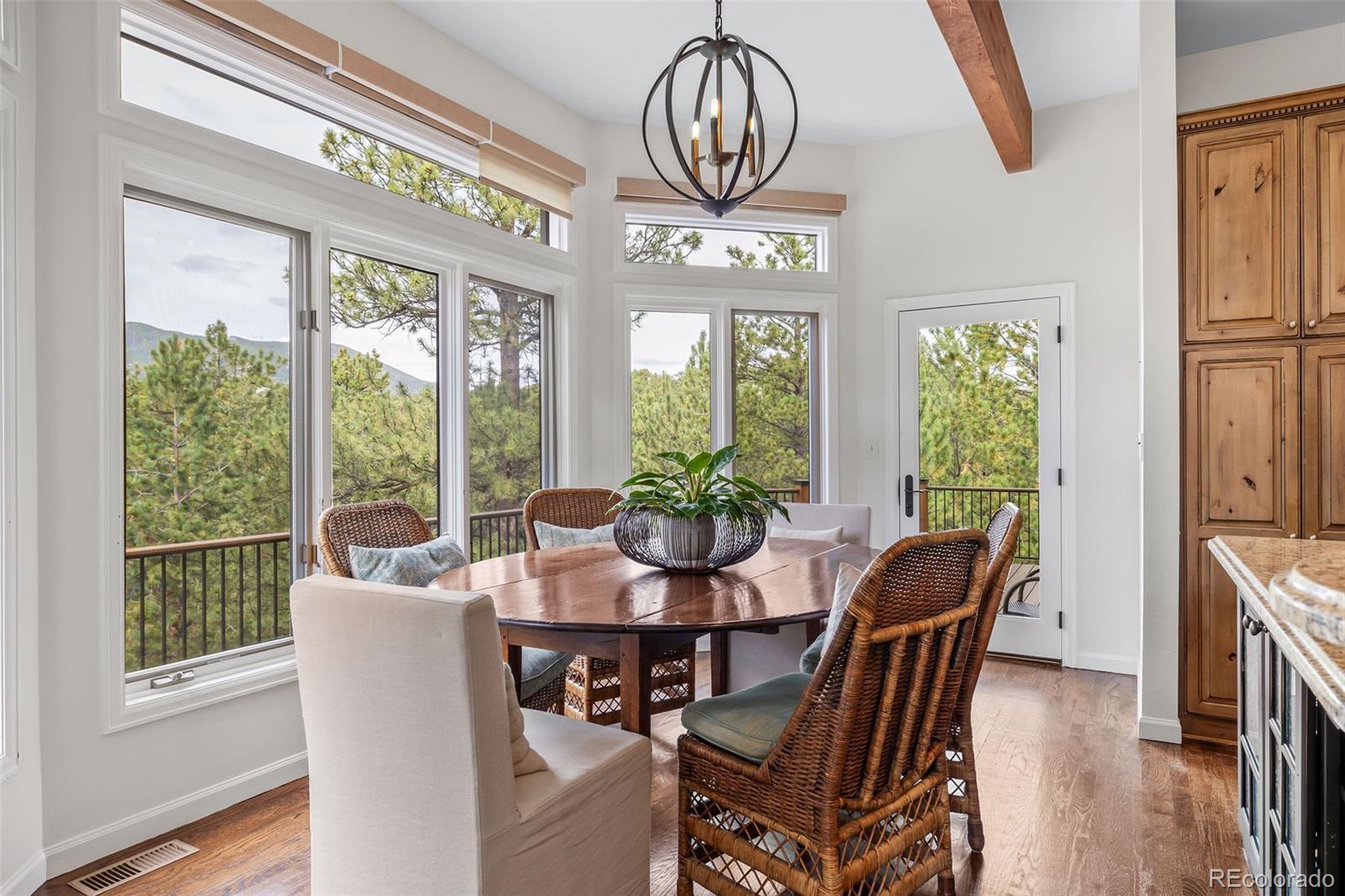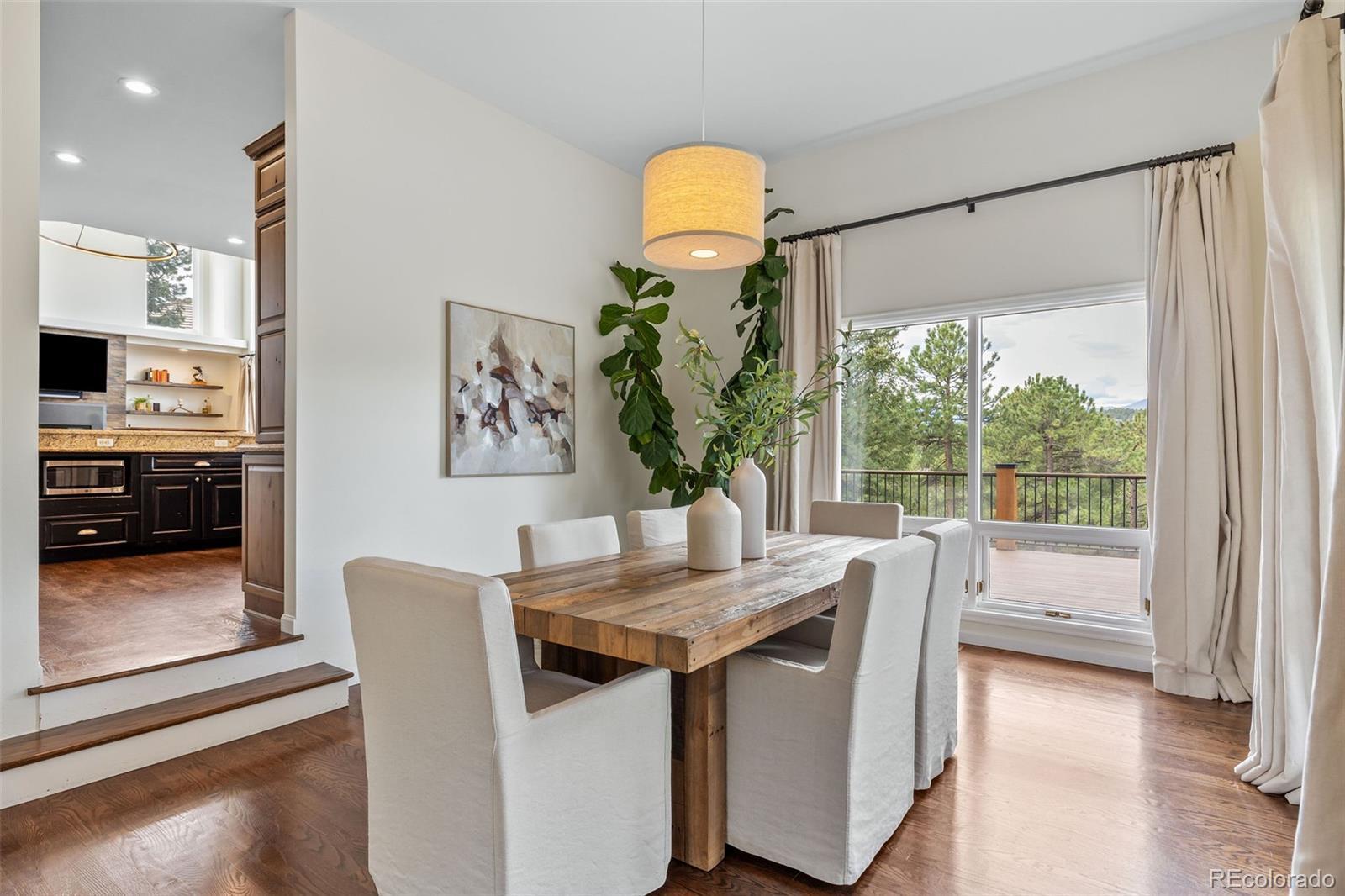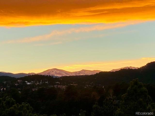 Experience awe-inspiring views from nearly every room of this striking mountain residence at the back of The Ridge at Hiwan. Positioned on a private 1-acre lot amongst towering pine trees, the home is surrounded by a new, expansive, wrap-around composite deck and flagstone patio, offering a truly elevated lifestyle. High ceilings and 2-story floor-to-ceiling windows and doors adorn bright and airy spaces throughout, anchored by exquisite wood floors and rich, wood accents. Generous living areas include a welcoming living room off the foyer, featuring a handsome fireplace, walls of windows, and access to the deck, plus an adjacent formal dining room showcasing spectacular views. A private office is found on the opposite side of the foyer, with French doors and beautiful views. The heart of the home is the great room, including a dramatic family room boasting an impressive fireplace, custom built-ins, plus 2-story ceiling and magnificent views of Bergen Peak and Mount Evans from double-height windows. The family room is open to a fantastic chef’s kitchen with corner island, stainless steel appliances, and custom cabinetry, along with a sunny breakfast room surrounded by windows looking out to tree tops and overlooking the large, private and level/flat yard. Accommodations consist of 6 bedrooms, including a luxurious primary suite with sitting area and balcony enjoying incredible mountain views, plus a see-through fireplace to the spa-like 5-piece bath. Spacious upper loft plus 3 additional bedrooms and new 4-piece three-quarter bath are found upstairs. The walk-out level is an entertainer’s delight, comprised of a huge rec room looking out to the patio and back yard, 2 bedrooms, exercise room, new three-quarter bath, reading nook and ample storage. Exceptional location, with easy access to the Evergreen Wah Run open space and trail, along with stunning views and meticulous design, perfectly combine to create this custom Colorado retreat.