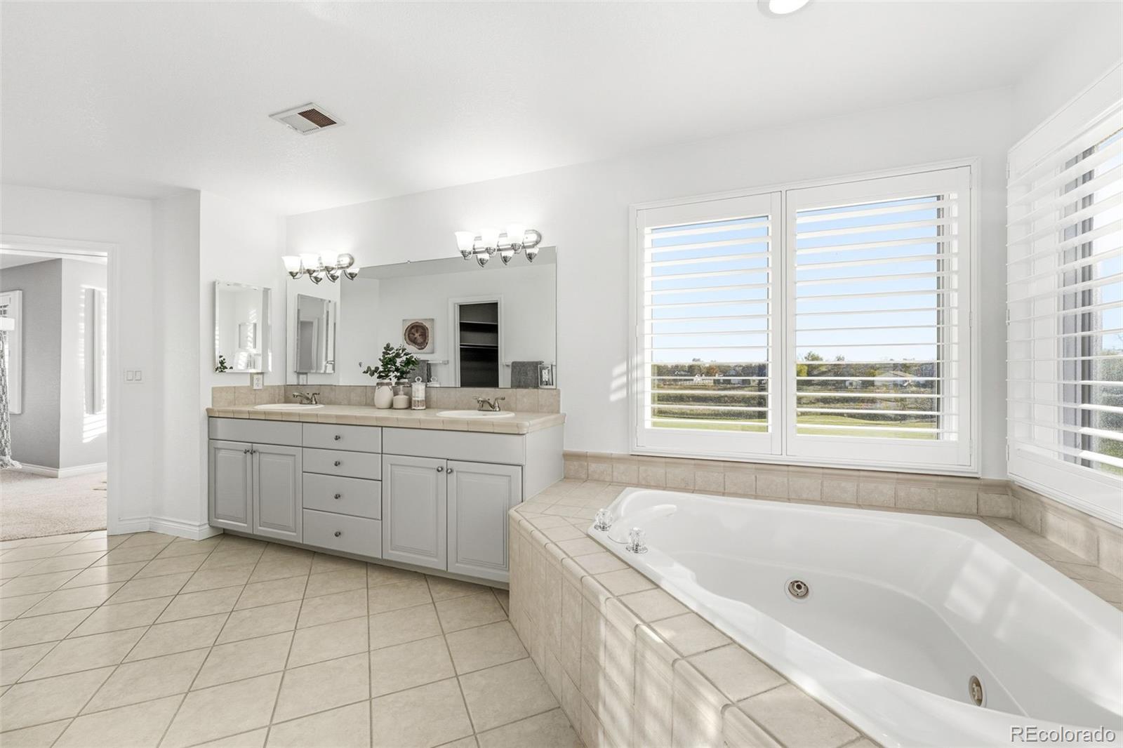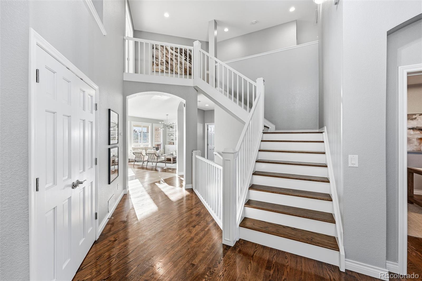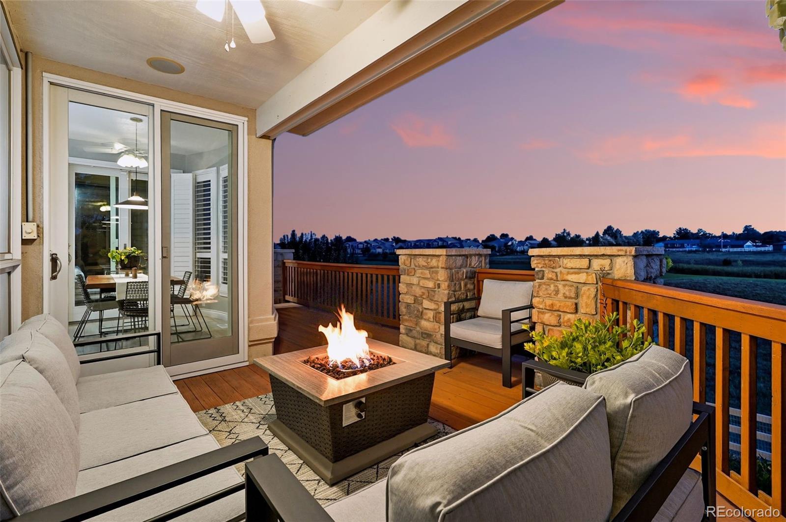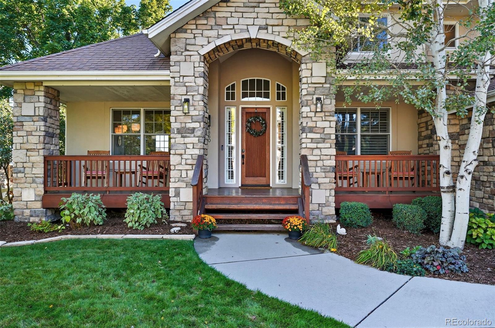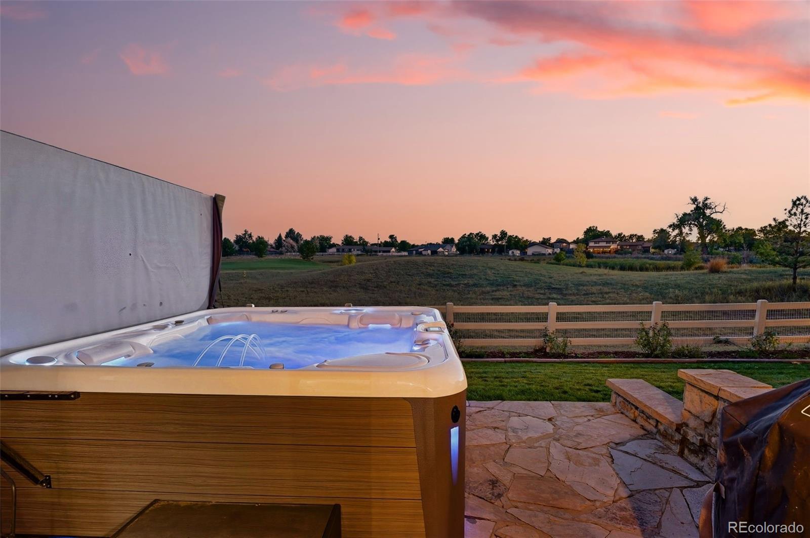 This exceptional residence in the prestigious Broadlands neighborhood blends timeless elegance with modern sophistication. Nestled on a private oversized lot overlooking the golf course, the home features an open floor plan filled with soaring ceilings, abundant natural light, and refined finishes throughout. The upper level offers a coveted layout with four of the home's five spacious bedrooms, including a Jr. en-suite, two bedrooms with a shared bath, and a lavish primary retreat with a cozy sitting area, dual walk-in closets, and a five-piece bath designed for indulgence and comfort. On the main floor, thoughtful updates elevate every space. Rich hardwood floors flow seamlessly into a private office and a beautifully refreshed kitchen with crisp white cabinetry, striking quartz countertops, and an expansive high-end appliance suite—perfect for everyday living or grand entertaining. The walk-out basement is designed for relaxation, featuring a guest suite with a walk-in steam shower, flex space, a stylish full bar, and a generous recreation room, creating an ideal space for gatherings. Outdoor living is equally impressive, with multiple spaces crafted for both relaxation and entertaining. On the upper-level wraparound deck, enjoy expansive dining and lounge areas, or unwind on the lower patio in the private hot tub—all framed by sweeping golf course vistas and breathtaking mountain views. A welcoming front porch completes the charm, offering an ideal blend of luxury and lifestyle. Broadlands residents enjoy exceptional amenities, including a pool, playground, basketball court, and expansive trails, plus access to the community center with an indoor pool and waterpark, outdoor pool, and a variety of activities—all paired with unmatched convenience to shops, dining, major highways, DIA, Boulder, and the mountains. The community is also served by the award-winning Adams 12 school district, making this home an outstanding choice for both lifestyle and location.