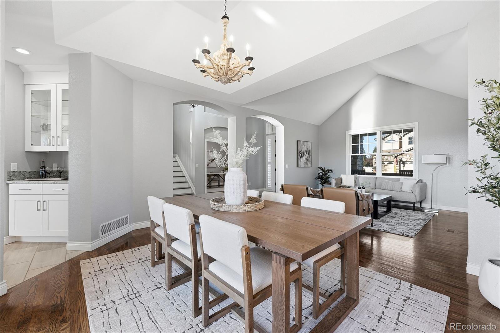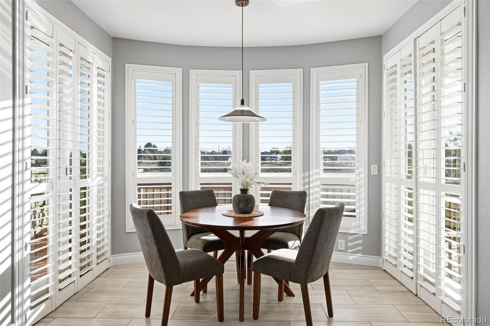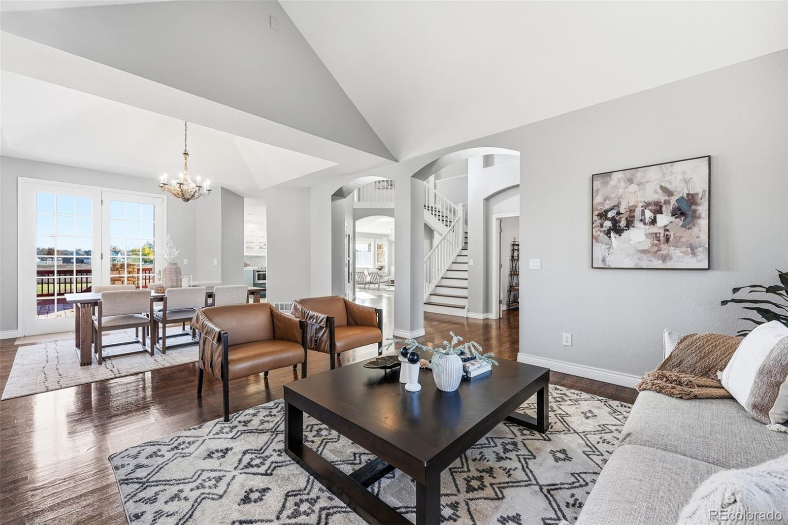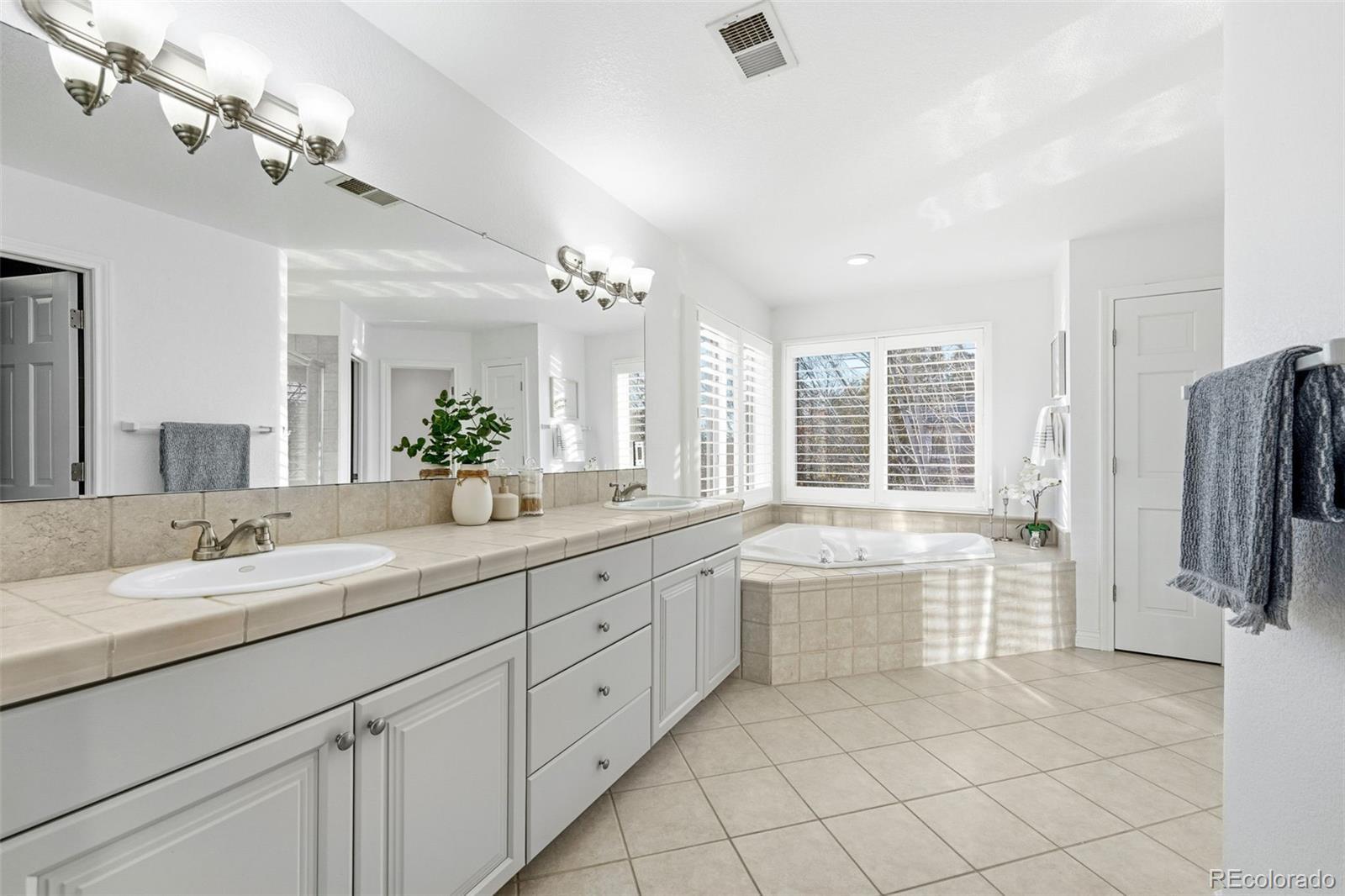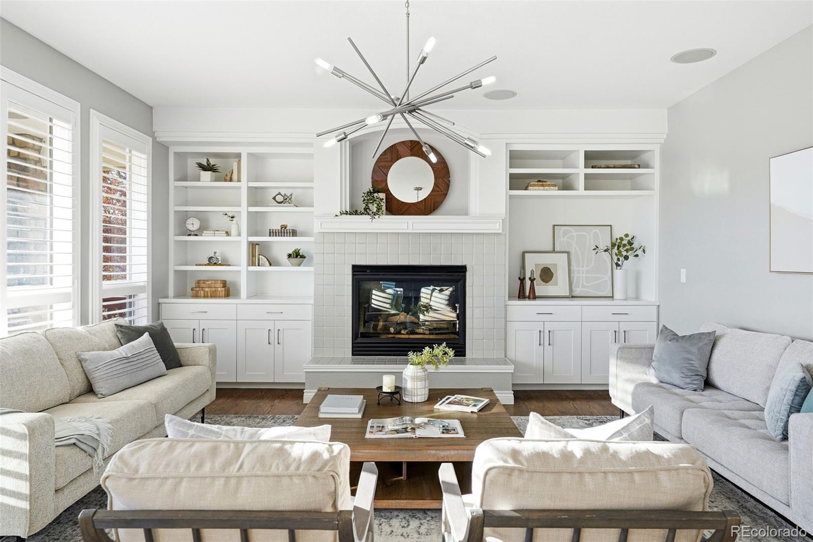This exceptional residence in the prestigious Broadlands neighborhood blends timeless elegance with modern sophistication. Nestled on a private oversized lot overlooking the golf course, the home features an open floor plan filled with soaring ceilings, abundant natural light, and refined finishes throughout. The upper level offers a coveted layout with four of the home's five spacious bedrooms, including a Jr. en-suite, two bedrooms with a shared bath, and a lavish primary retreat with a cozy sitting area, dual walk-in closets, and a five-piece bath designed for indulgence and comfort. On the main floor, thoughtful updates elevate every space. Rich hardwood floors flow seamlessly into a private office and a beautifully refreshed kitchen with crisp white cabinetry, striking quartz countertops, and an expansive high-end appliance suite—perfect for everyday living or grand entertaining. The walk-out basement is designed for relaxation, featuring a guest suite with a walk-in steam shower, flex space, a stylish full bar, and a generous recreation room, creating an ideal space for gatherings. Outdoor living is equally impressive, with multiple spaces crafted for both relaxation and entertaining. On the upper-level wraparound deck, enjoy expansive dining and lounge areas, or unwind on the lower patio in the private hot tub—all framed by sweeping golf course vistas and breathtaking mountain views. A welcoming front porch completes the charm, offering an ideal blend of luxury and lifestyle. Broadlands residents enjoy exceptional amenities, including a pool, playground, basketball court, and expansive trails, plus access to the community center with an indoor pool and waterpark, outdoor pool, and a variety of activities—all paired with unmatched convenience to shops, dining, major highways, DIA, Boulder, and the mountains. The community is also served by the award-winning Adams 12 school district, making this home an outstanding choice for both lifestyle and location.