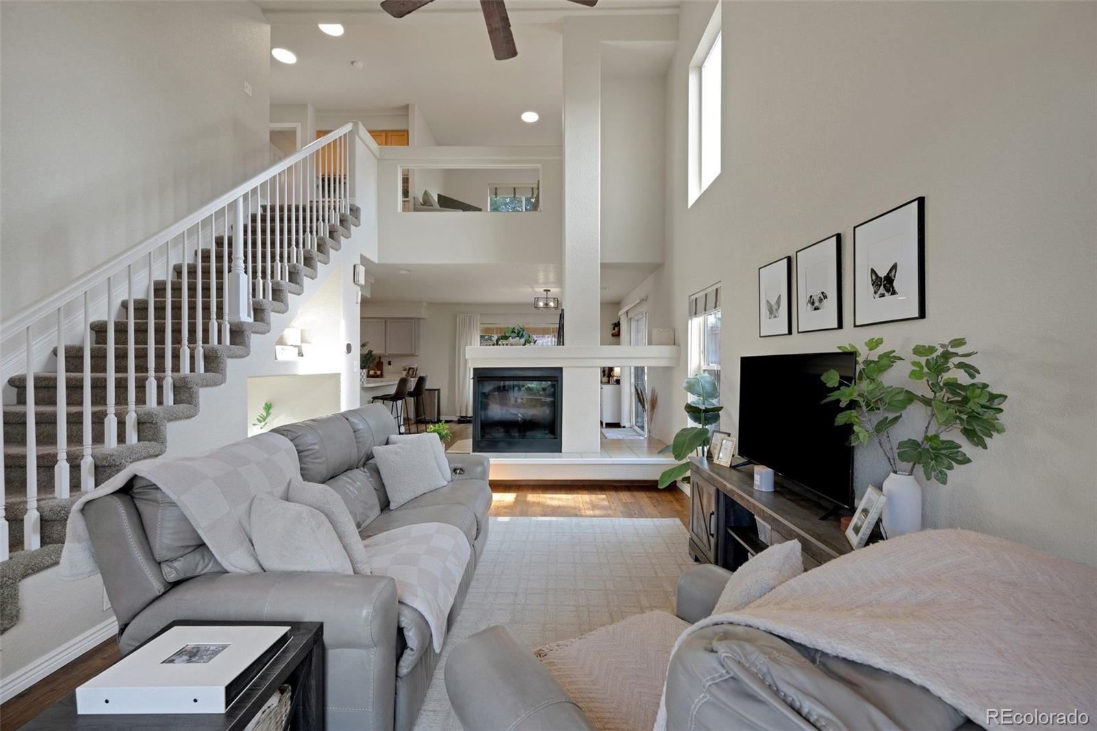 Welcome to this beautiful home in the Green Valley Ranch Community featuring 2 bedrooms, 3 bathrooms, and a versatile loft—perfect for a home office or additional living space. Enjoy the convenience of an attached 2-car garage with a freshly painted garage door. Step inside to be greeted by vaulted ceilings and abundant natural light that make the space feel open and inviting. The interior boasts luxury vinyl plank flooring throughout, complemented by newer light fixtures for a modern touch. A 2-way fireplace accents all spaces on the main level, creating a cozy ambiance. The kitchen has been tastefully updated with refinished cabinets, creating a fresh and stylish look. Stainless steel appliances and ample cabinet space enhances your dining experience. A newer furnace and air conditioning unit ensure year-round comfort, while enjoying the ease of the SMART Ecobee thermostat. Step through double doors into the expansive primary bedroom, featuring a walk-in closet and an ensuite full bathroom. A second bathroom serves the second bedroom, enhancing convenience and functionality. Experience effortless living with a private yard featuring low-maintenance turf, while the HOA takes care of all front yard landscaping, sidewalk, and driveway snow removal, allowing you to spend less time on upkeep and more time making the most of your home. Owned solar panels ensure year-round energy savings, giving you long-term cost efficiency and sustainability. Located in a thriving area, you’ll be just minutes from great restaurants, a lively beer garden, and the Green Valley Ranch Golf Course. Plus, with quick access to the airport—only 8 minutes away—this home is as convenient as it is charming. Don’t miss out on this fantastic opportunity—schedule your showing today!