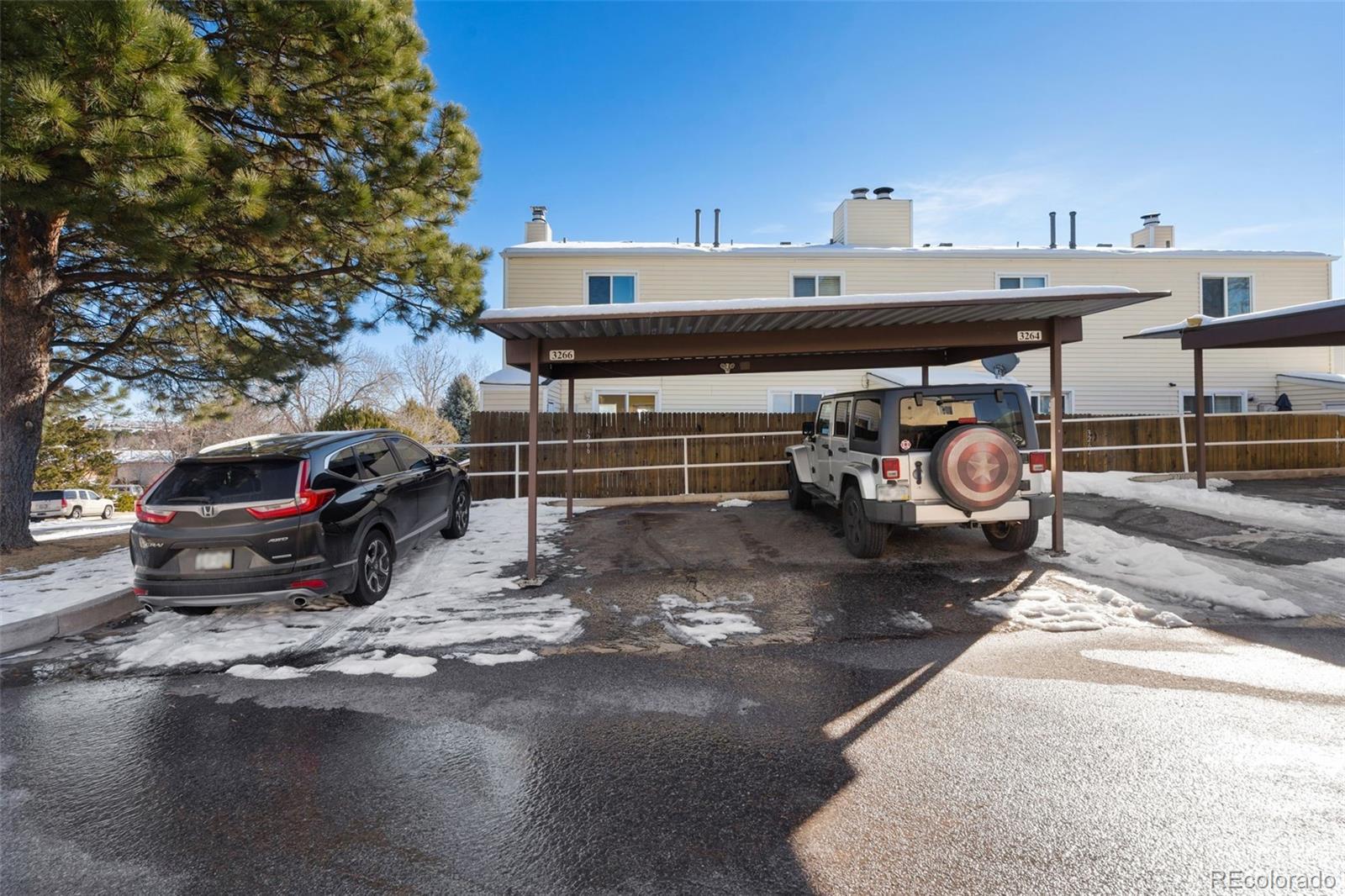 This well-kept end-unit townhome in the Parkhaven community offers a comfortable, functional floor plan paired with an open, peaceful setting. Positioned along the edge of the property, the unit enjoys a wide-open feel with green space out front and convenient access to the Homestead Trail just steps away, an ideal spot for walking, running, or simply enjoying the outdoors. The main level welcomes you with new vinyl flooring throughout and a bright living room filled with natural light from multiple windows. A conveniently located half bath serves the main floor, and the living space flows easily into the kitchen, making the layout practical for everyday living. The kitchen has been updated with newer laminate countertops, a tile backsplash, stainless steel appliances, pantry storage, and an eat-in dining area. A sliding door leads to the private, gated, enclosed patio, perfect for outdoor seating, pets, or gardening. The patio includes a storage closet and offers direct, gated access to the covered, assigned carport space just beyond. Laundry is thoughtfully located in a closet off the kitchen, keeping it easily accessible yet out of sight. Upstairs, you’ll find two carpeted bedrooms, including a generously sized primary bedroom featuring an accent ceiling beam that adds character. A full hallway bathroom with newer vinyl flooring and a tub/shower combination completes the upper level. The unit is super clean and clearly well cared for, and the Parkhaven community is known for its well-maintained grounds and convenient location. Situated in District 11 and close to neighborhood schools, parks, dining, shopping, and commuting options along Powers, this townhome offers low-maintenance living with great access to outdoor amenities and everyday conveniences.