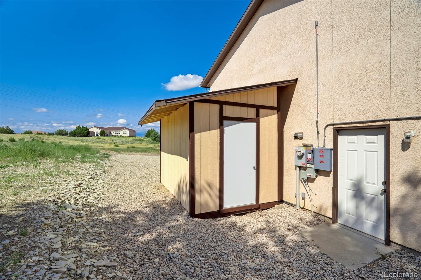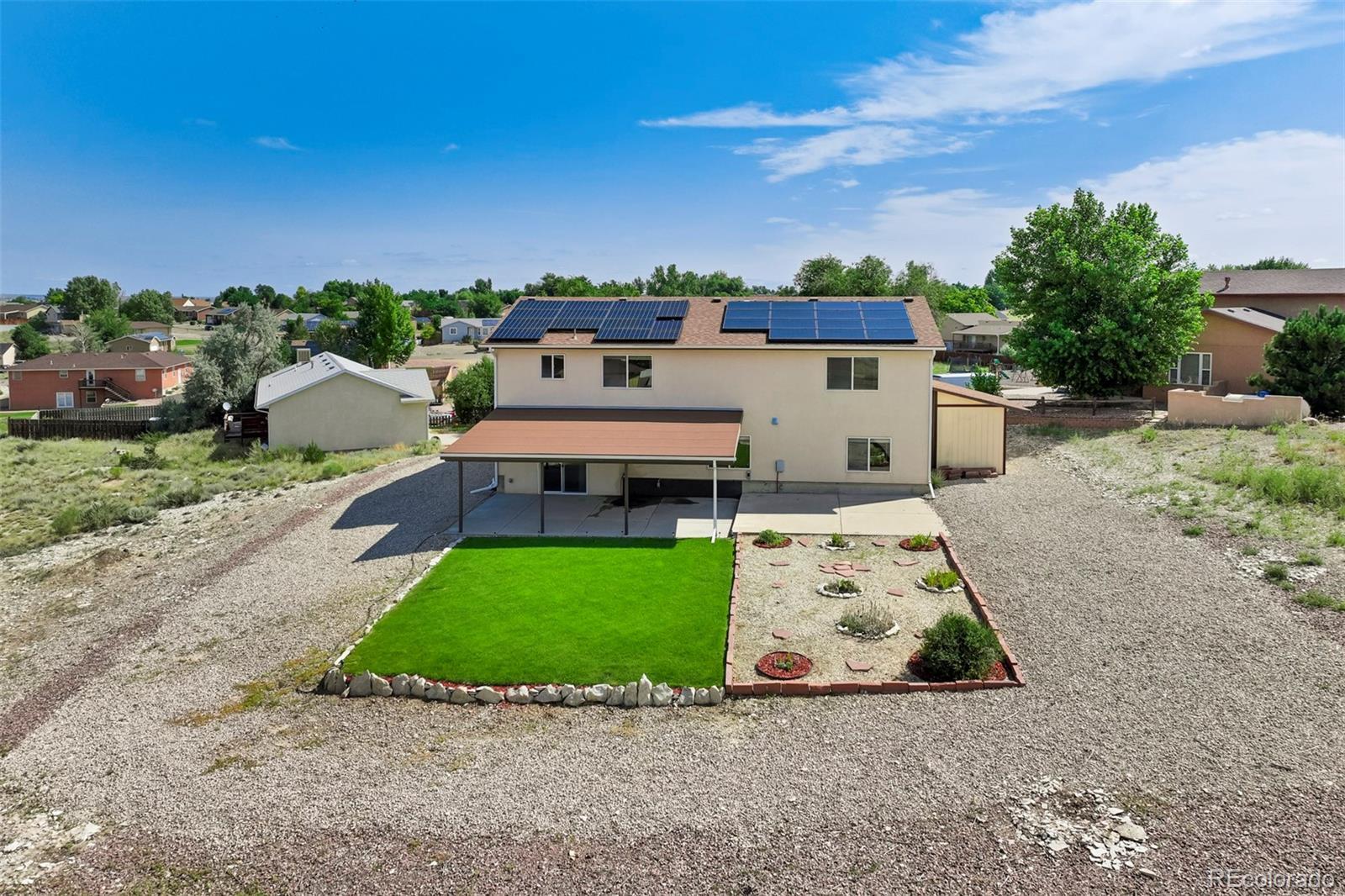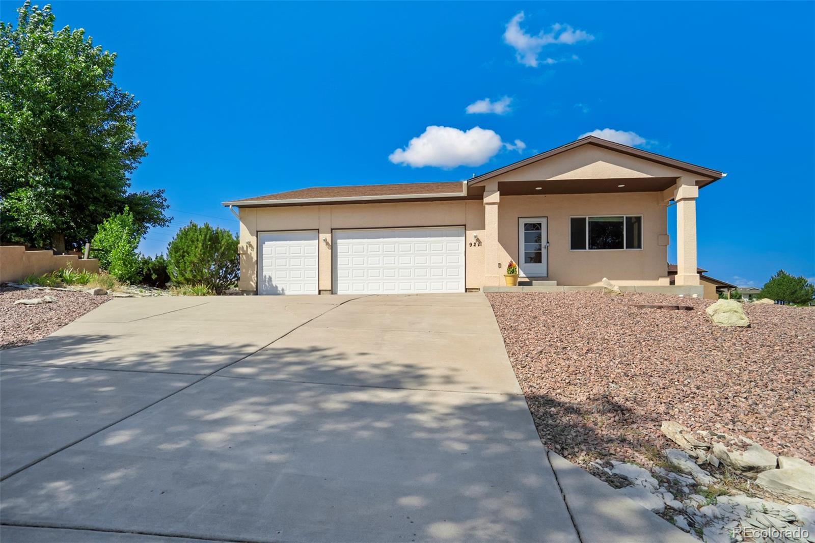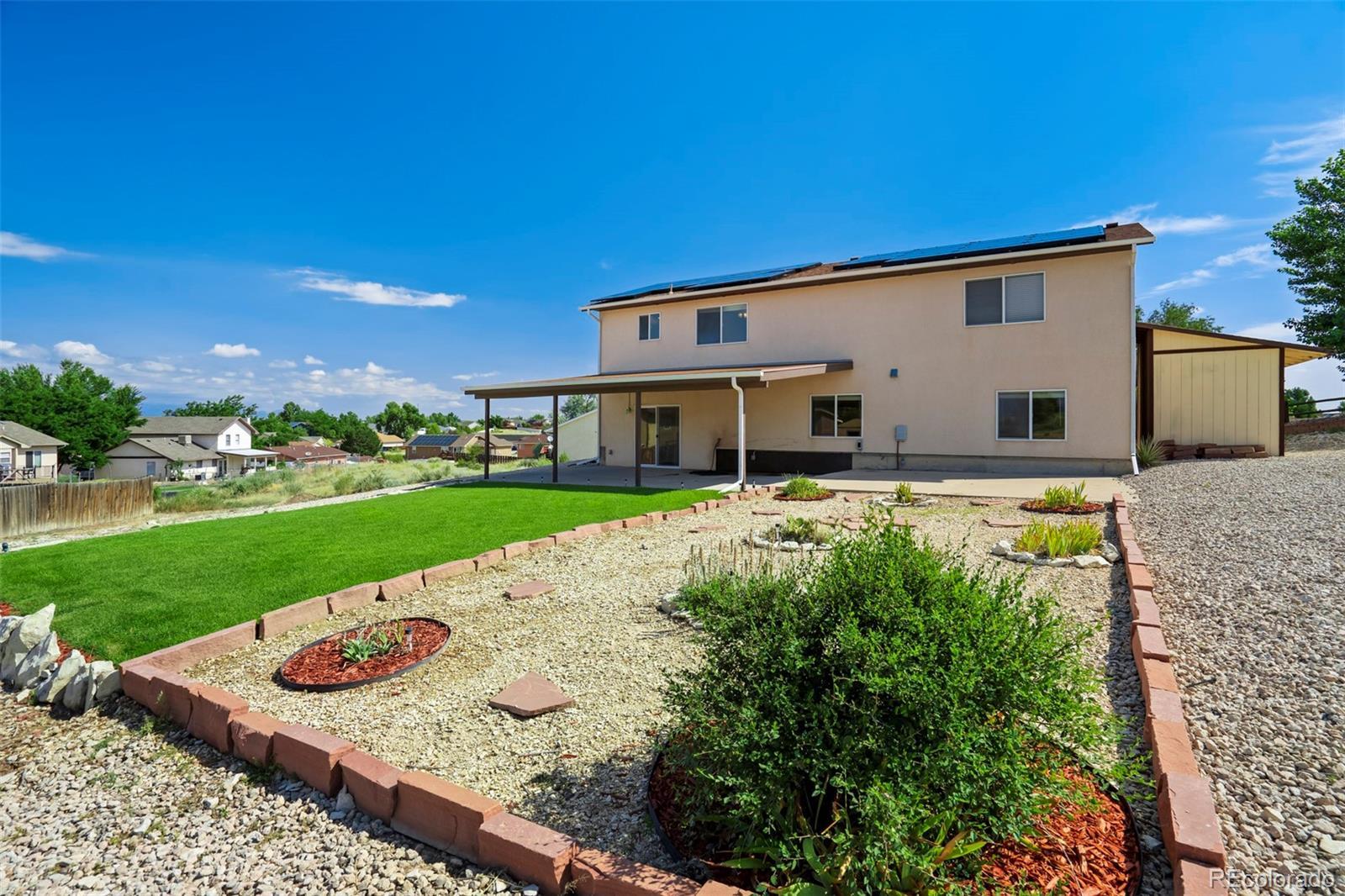 Well-appointed on a serene cul-de-sac in the desirable Acorn & Harmony neighborhood of Pueblo West, this incredible split-level home offers one of the most spacious & open designs you'll find! Vaulted ceilings & dramatic double arches framing the upper-level dining room, make a bold statement while creating a warm, welcoming atmosphere. An impressively scaled living room with soaring ceilings sets the tone, while the open layout flows seamlessly to the kitchen & dining areas above. The kitchen features beautiful bamboo flooring, a breakfast nook with mountain views, a double pantry, abundant cabinet & counter space, & a window above the kitchen sink perfectly positioned to take in the scenic backdrop. The expansive primary suite features a 5-piece bath & large walk-in closet & is tucked away for a private retreat! A half-bath adds guest convenience to this level. The lower-level family/rec room walks out to a covered patio, perfect for entertaining & is adjacent to a hot tub pad ready for relaxation under the stars! Two generously sized bedrooms, a full bathroom, & a dedicated laundry area (washer & dryer included!) complete the home. Situated on a 0.50-acre lot, this home also features a 3-car garage with a service door to the side yard, a storage shed, & an owned solar panel array for added efficiency. All major mechanical systems, including air conditioning, have been updated within the past five years. All this home needs is a new owner...and that should be YOU!