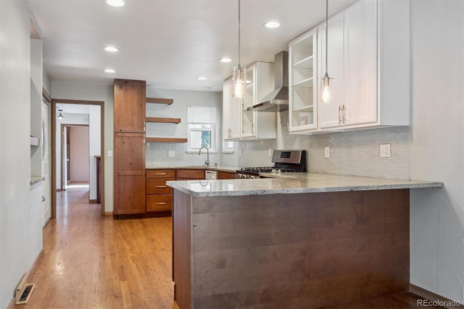 Stunning brick ranch-style home boasting timeless curb appeal and thoughtfully updated interiors. The chef’s kitchen is a true highlight, featuring granite countertops, new cabinetry, a fresh tile backsplash, and a bright eat-in area perfect for casual dining. Hardwood floors flow throughout the home, enhancing its warm and inviting atmosphere. The spacious living room features a wood-burning fireplace and an accent wall, while the dining room offers direct access to the backyard—ideal for entertaining. The primary suite impresses with generous space and stylish wood beam accents, complemented by a master bath with a sleek, modern shower. Secondary bedrooms feature hardwood floors, accent walls, and ceiling fans, with additional conforming bedrooms in the basement providing flexibility for guests or family. The finished basement includes a cozy living area with a wood-burning fireplace, a convenient bath, and a bonus room with versatile space and storage. A designated laundry room adds convenience, completing this well-appointed home. Located near public transportation and overlooking Cook Park and the Recreation Center, this home is just steps from the Cherry Creek Trail and minutes from Denver’s premier dining, shopping, and entertainment. A perfect blend of style, comfort, and location! Don't miss this opportunity!