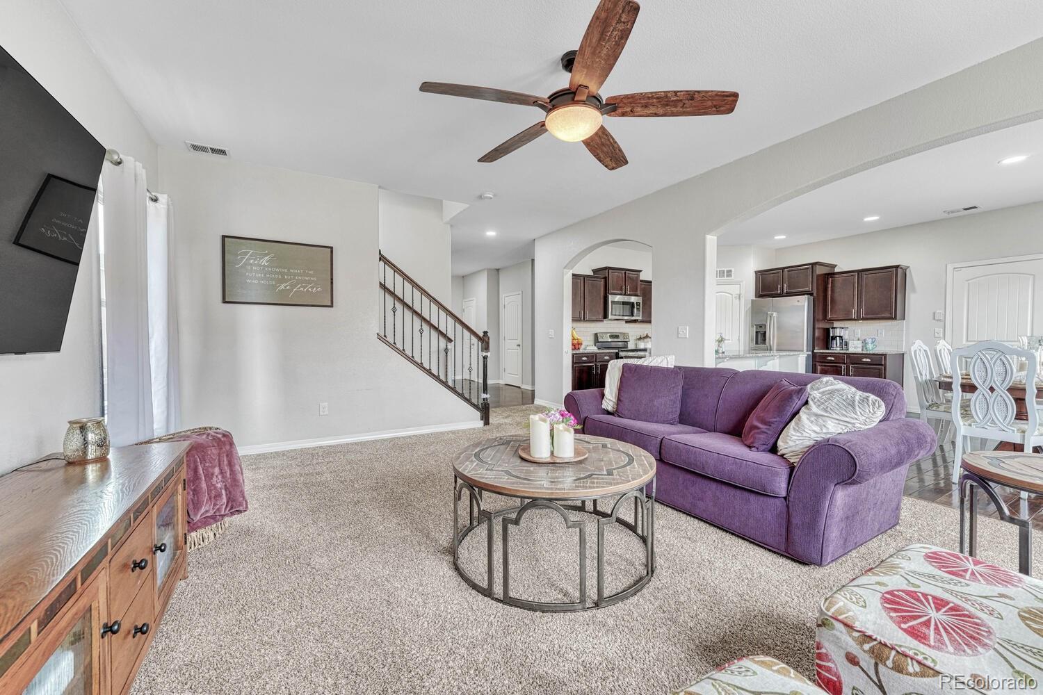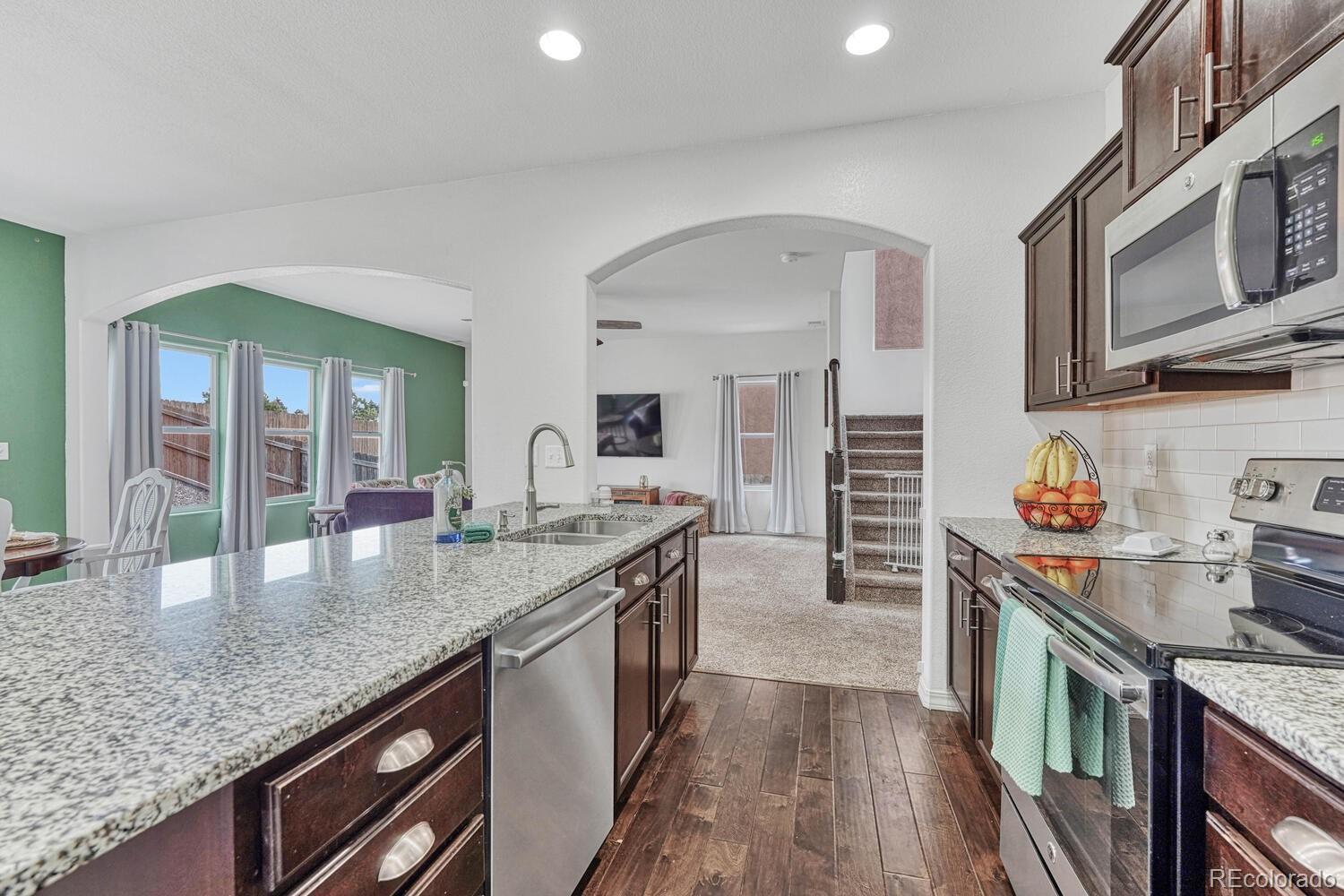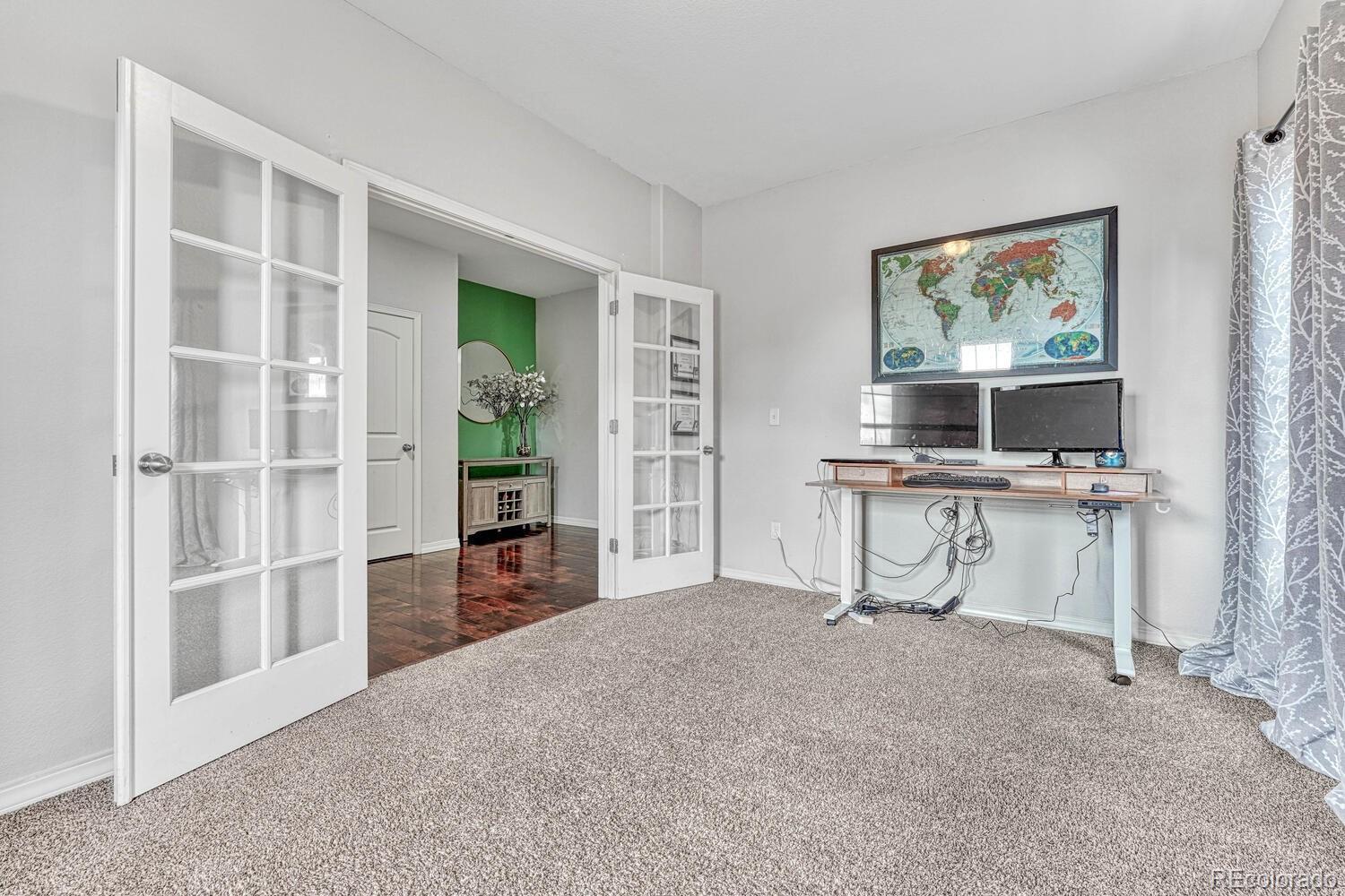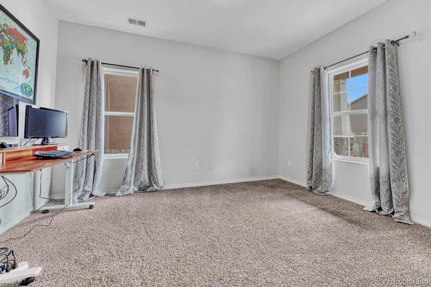 Welcome to your dream home in the heart of Colorado Springs! Nestled within one of the city's most sought-after east-side neighborhoods, this stunning 4-bedroom, 3-bathroom home offers the perfect blend of comfort, style, and functionality. Relax on the covered front porch as you sip your morning coffee, basking in the warmth of the south-facing driveway, ensuring ample sunlight throughout the day and adding warmth and vitality to the exterior of the home. Step inside, and you're immediately greeted by elegance and versatility. French doors lead you into a spacious room, perfect for crafting, working from home, or simply indulging in your favorite hobbies. You'll also find a powder room and not one but TWO closets catering to all of your main-level storage needs. The dynamic living room offers endless possibilities for furniture arrangement, making it a breeze to create your ideal space. Flow seamlessly into the kitchen boasting granite countertops, stainless steel appliances, and a walk-in pantry. Enjoy meals in the sunlit dining area bathed in natural light, and easily access your MASSIVE tandem garage or step out onto the covered patio, ideal for year-round barbecues and outdoor entertaining. Venture upstairs, where an expansive loft beckons, offering countless opportunities for relaxation or recreation. The spacious primary bedroom is a sanctuary of natural light, featuring three large windows, and then indulge in the ensuite 5-piece primary bathroom, boasting a dual vanity, soaking tub, standing shower, and generous walk-in closet for all your wardrobe essentials. Convenience abounds with an upstairs laundry room, complete with extra space for hanging clothes or storage. While upstairs, be sure to take a peek at the 3 additional spacious bedrooms, 2 with walk-in closets. Conveniently located with easy access to Marksheffel and Powers Blvd, Peterson AFB, parks, shopping, and more, this home offers the quintessential Colorado lifestyle you've been searching for!