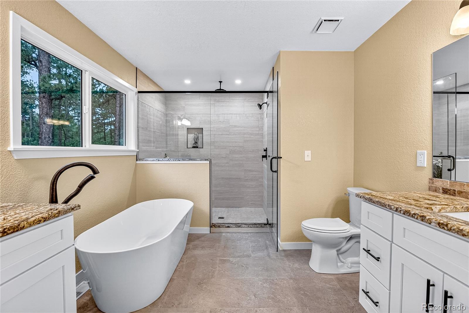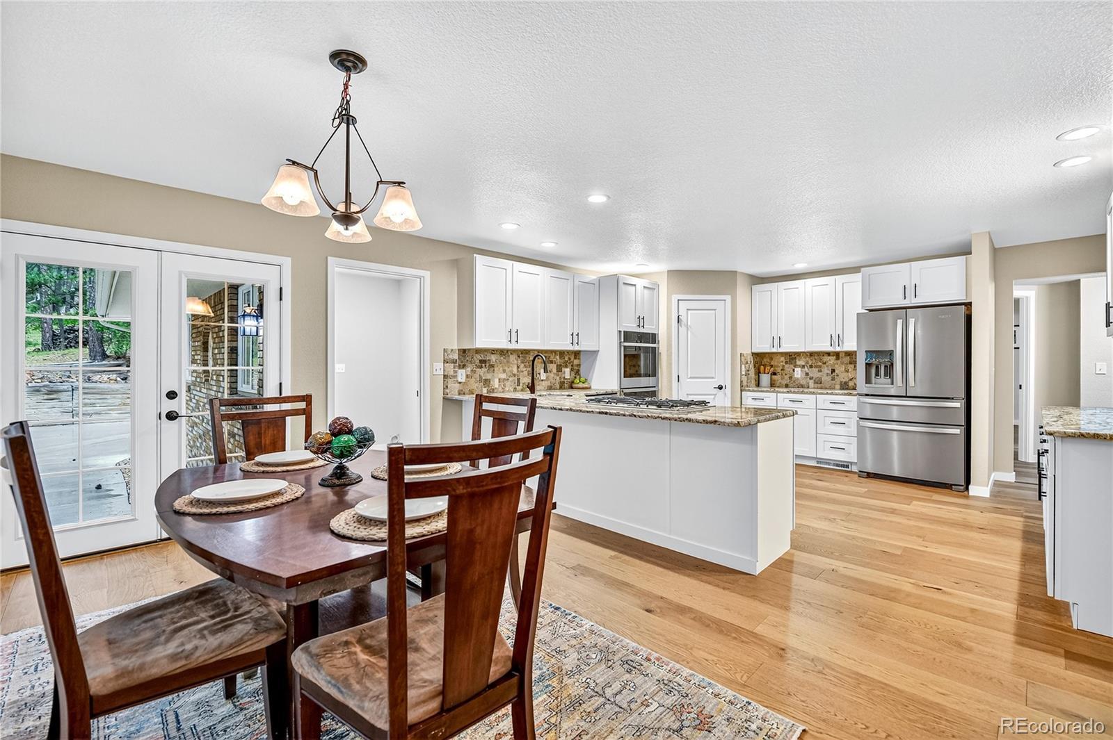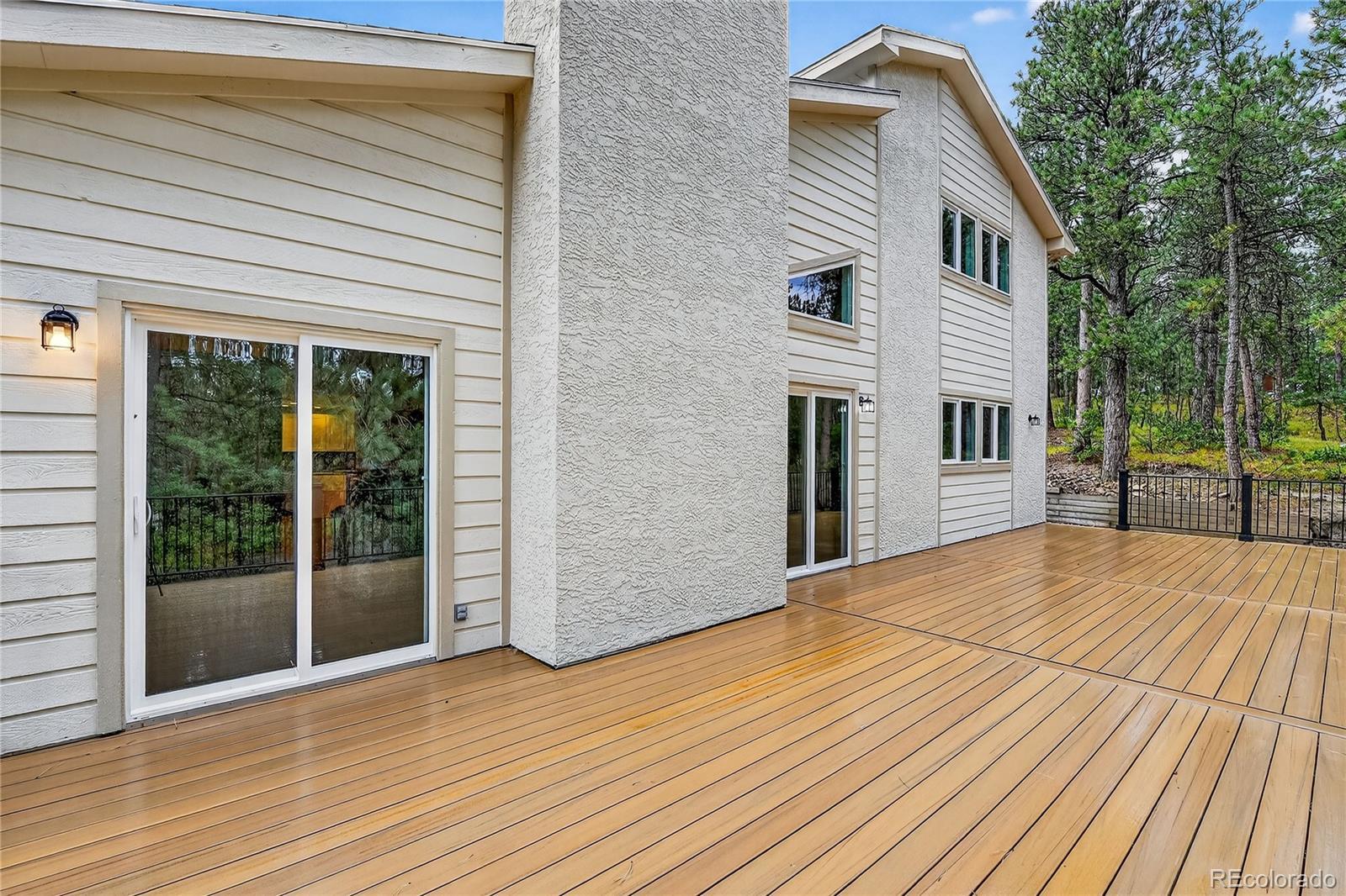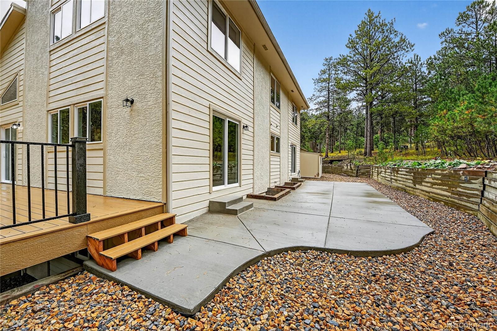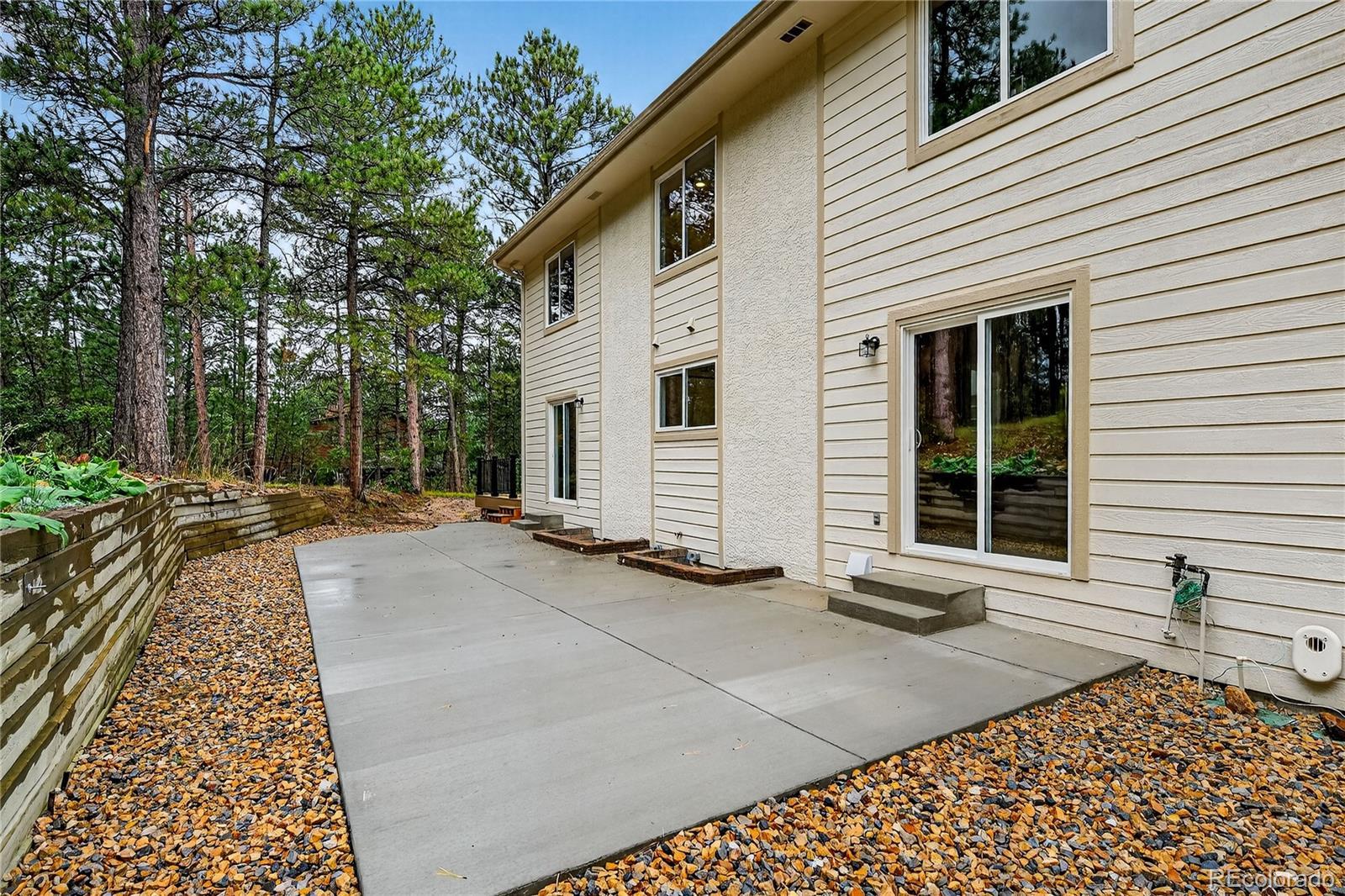 Nestled among mature pines on a generous lot, this stunning Woodmoor residence offers a peaceful setting with quick access to I-25—just minutes to both Colorado Springs and Denver—and is located in highly sought-after District 38 schools. Step inside to an inviting, completely reimagined open floor plan with wide-plank engineered hardwood floors throughout the main level. The expansive great room boasts vaulted ceilings, a cozy wood-burning fireplace, and dual walkouts to a composite deck—perfect for entertaining or relaxing. A spacious formal dining room adds versatility and can easily serve as a home office, playroom, or den. The fully remodeled kitchen features granite countertops, soft-close cabinetry, stainless steel appliances including a double oven, a pantry, and a breakfast bar. Retreat to the spacious primary suite complete with a spa-inspired bath featuring custom tile, dual vanities, a freestanding soaking tub, and two walk-in closets with built-in shelving. A private entrance to the expanded concrete patio enhances the retreat feel. With laundry off the garage, this home offers all main level living, if desired! Upstairs features two oversized secondary bedrooms with walk-in closets share a beautifully updated Jack-and-Jill bathroom. The walkout basement offers abundant space for a game room or home gym. A private fourth bedroom with its own en-suite bath and walk-in closet is ideal for guests, teens, or a quiet home office. A large unfinished storage area leaves plenty of room to grow or add a kitchenette for multi-generational living. Enjoy the tranquil privacy on this 0.85 acre lot with extensive outdoor living spaces. Additional highlights include a new roof and gutters, new windows, new AC installed, oversized three-car garage, concrete driveway and rear storage shed. Close to parks, hiking trails, schools, and shopping—this Woodmoor home offers the perfect blend of privacy, comfort, and convenience.