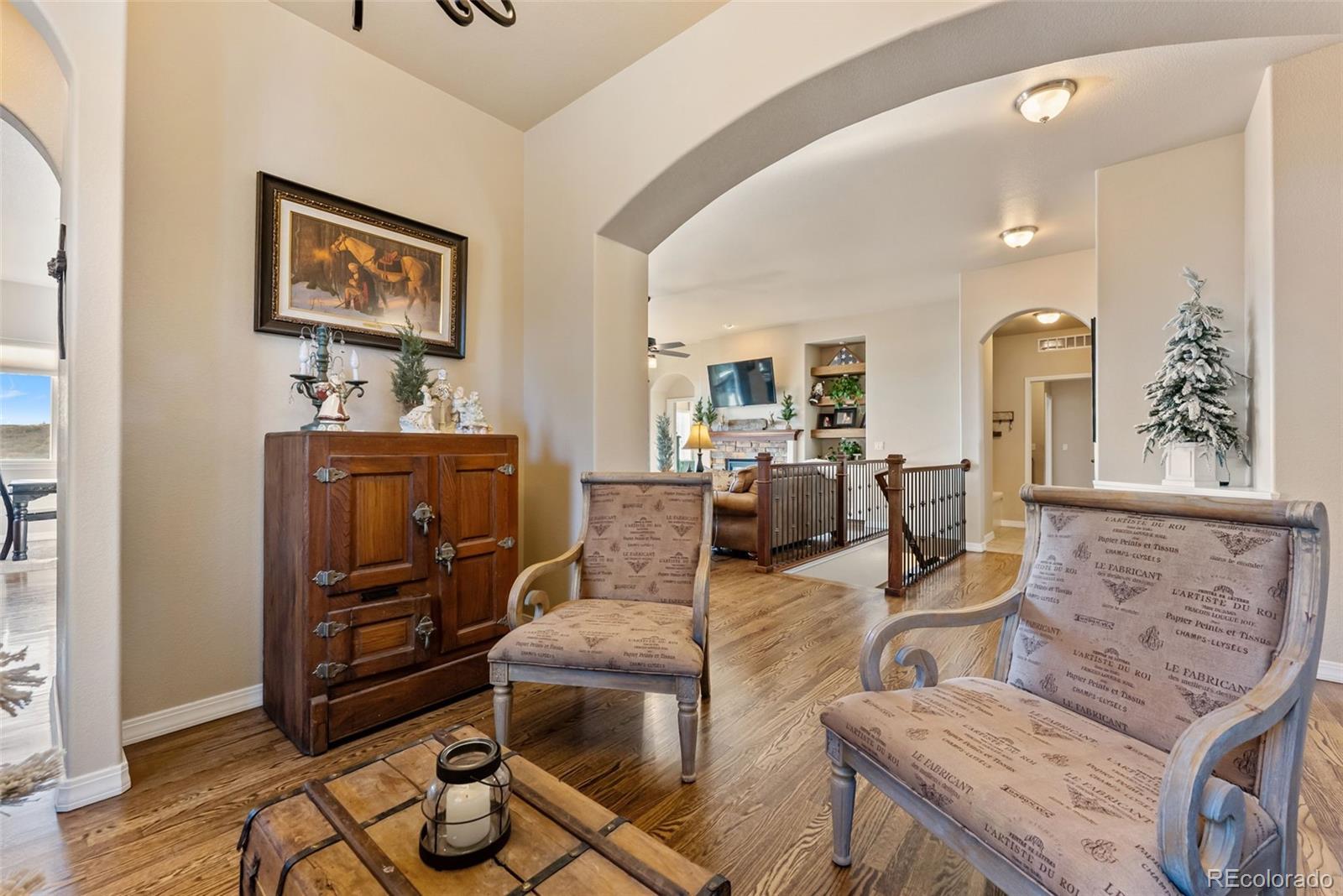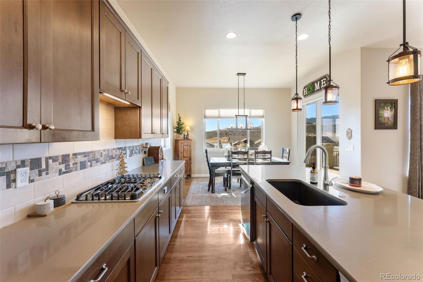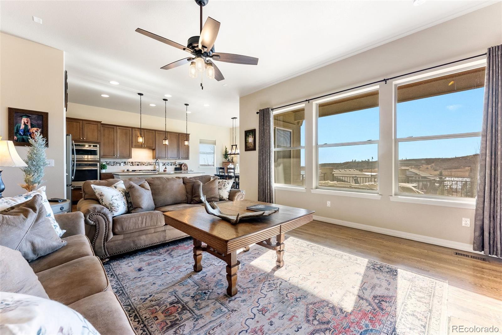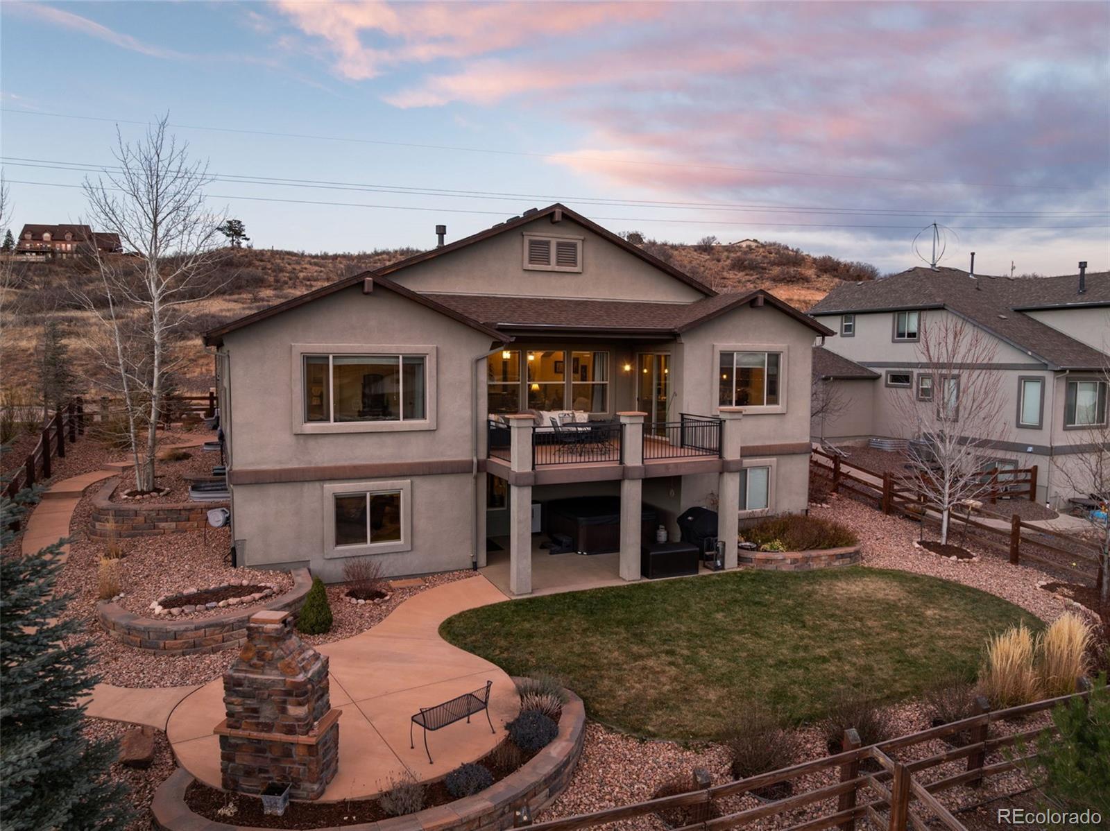 Experience Colorado living in this exceptional ranch-style residence, perfectly positioned in the prestigious Forest Lakes community of Monument. Here, panoramic views of the lake, mountains, and city lights create a breathtaking backdrop for everyday life. Inside, rich hardwood floors flow through the main level, creating warmth and effortless continuity. The kitchen was designed for both everyday living and entertaining, featuring stainless steel appliances, double ovens, a gas cooktop, soft-close cabinetry, and an oversized island that invites gathering. A pantry provides ample storage, and a butler’s pantry—currently enjoyed as a coffee bar—adds function and charm. The great room is inviting and elegant, centered around a cozy gas fireplace with custom built-ins, while the dining area opens to a covered composite deck with picturesque views. The main-level primary suite is a peaceful retreat filled with natural light. The ensuite bath features dual vanities, a large walk-in shower, private water closet, and a generous walk-in closet with custom cedar shelving and direct access to the beautifully finished laundry room. A secondary bedroom and full bath on the main level offer flexibility for a guest suite or home office, while the formal dining room—currently enjoyed as a sitting area—adds an extra layer of versatility. Downstairs, expand your living space with a large family room, 2 additional bedrooms, full bath, and tons of storage. Step outside and indulge in the art of outdoor living. The walk-out basement opens to a serene, covered patio with hot tub surrounded by lush, custom landscaping — complete with a dedicated herb garden and a handcrafted wood-burning fireplace for evenings by the fire under Colorado’s star-filled sky. The thoughtfully finished and insulated garage and a lower-level rough-in for an in-law suite or guest quarters provide versatility and future opportunity, making this home as functional as it is beautiful. VA Assumable at 2.75%
