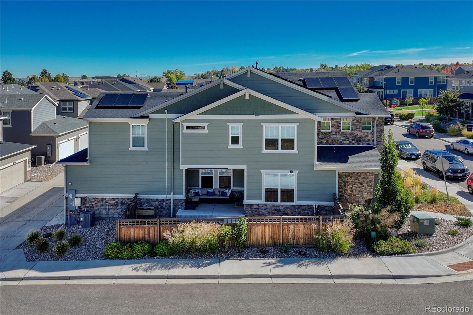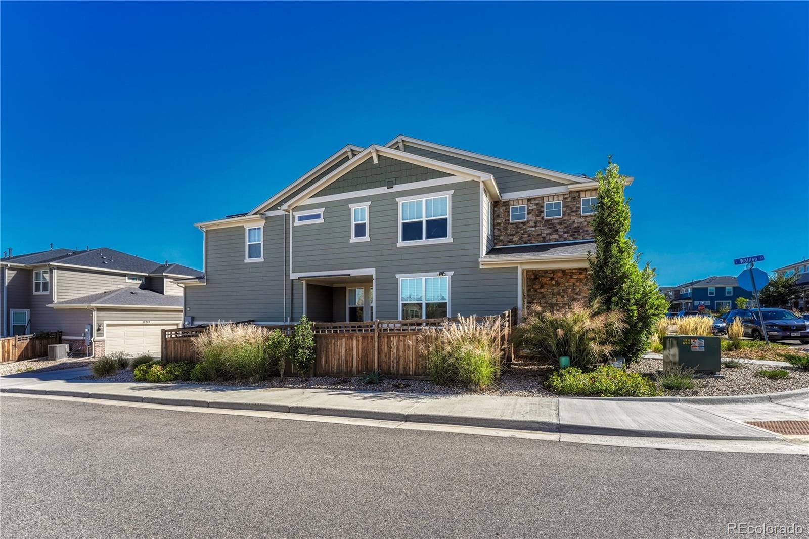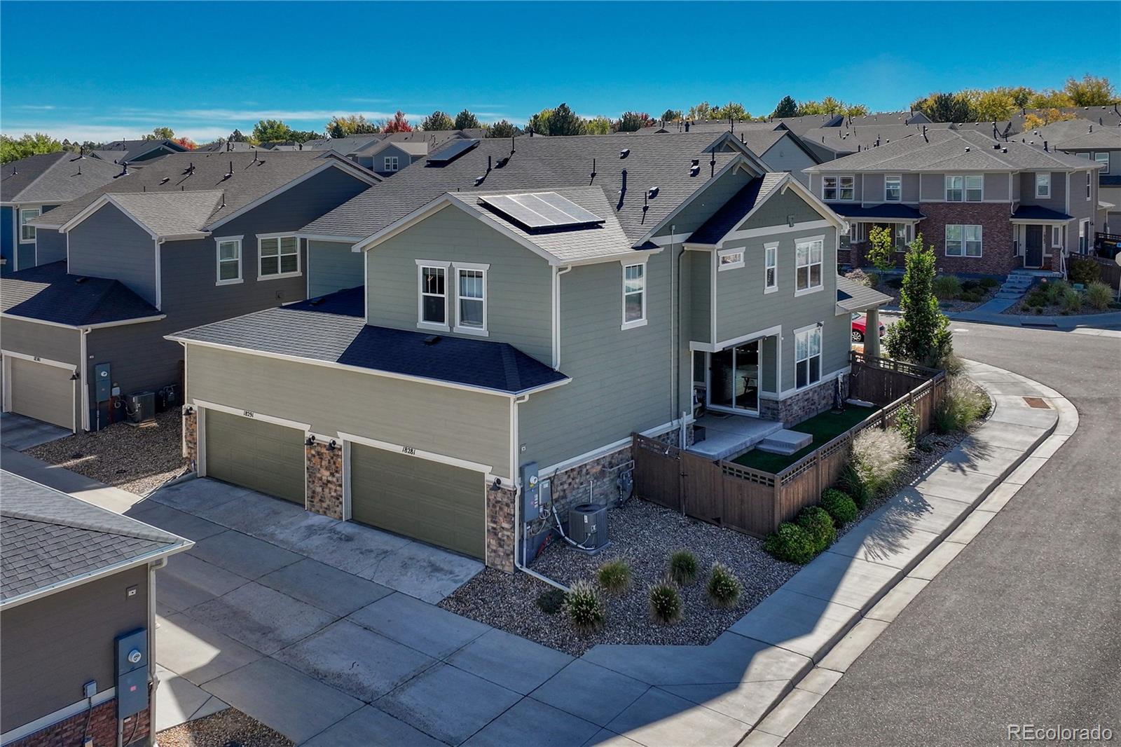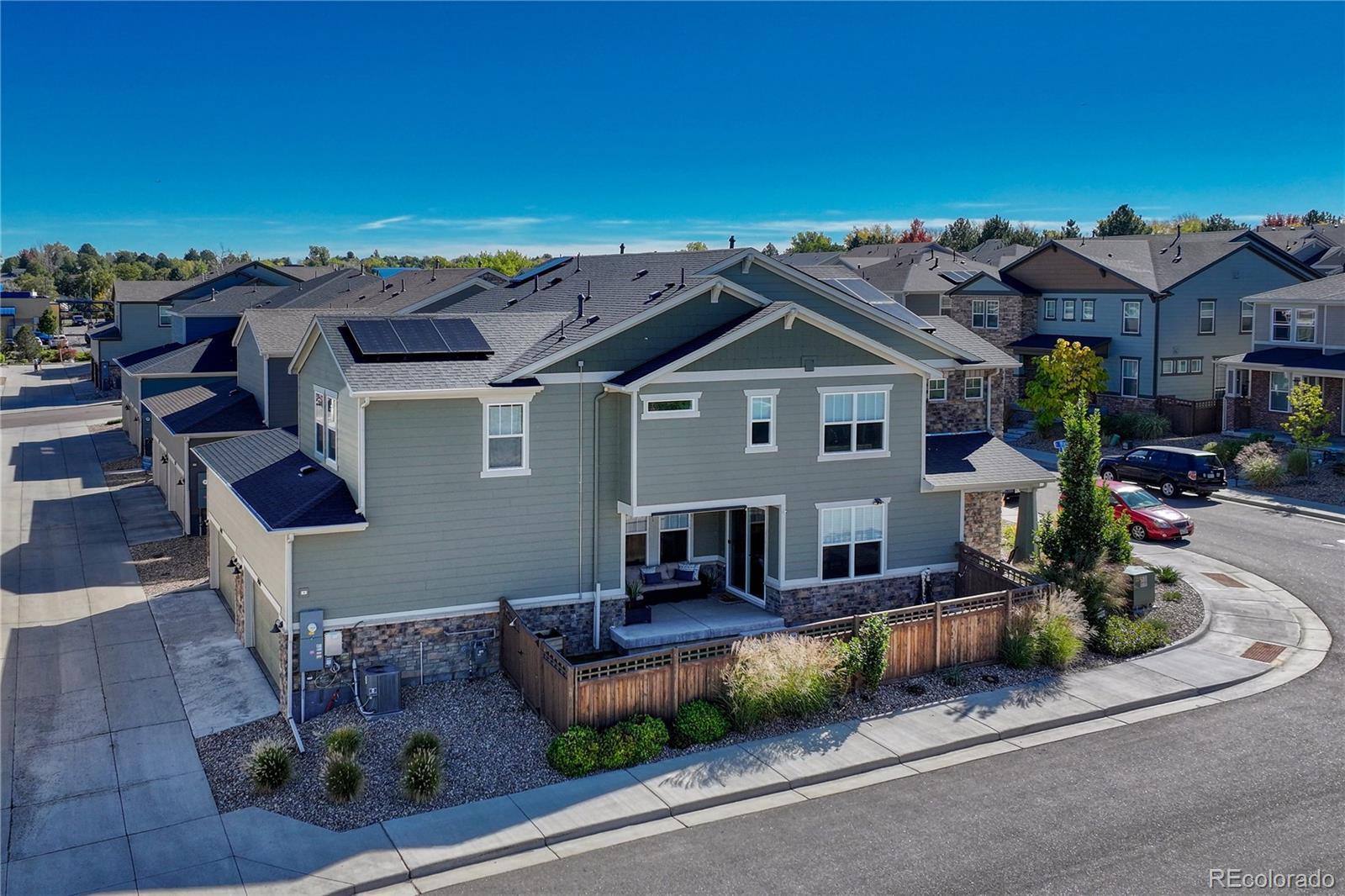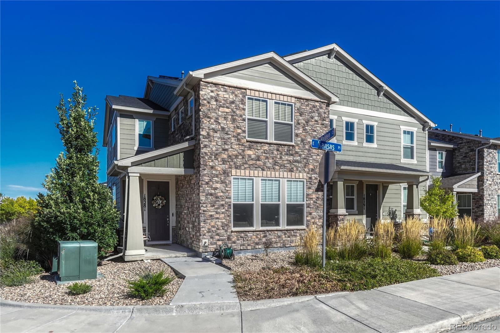 Nestled on a premium end-unit corner lot, this nearly new 2021 energy efficient paired home offers an ideal location, abundant natural light, and low-maintenance living. Tall ceilings, big windows, and an open-concept main level create a bright and welcoming atmosphere from the moment you step inside. Enjoy the benefits of the energy efficient building components and the cost saving feature of seller owned solar panels. WOW! A huge saving going forward! The spacious living room flows to a dedicated dining area and a beautifully upgraded kitchen featuring stainless steel appliances including a gas range, plus a large center island with bar seating for casual meals and gathering. Luxury vinyl plank flooring runs throughout the main level for a modern, cohesive look. Step outside from the dining room to enjoy a covered side patio and an easy-care turf yard, providing the perfect spot to relax or entertain without the upkeep. A convenient half bath, mud room off the garage, and an attached oversized garage add everyday functionality. Upstairs you’ll find a generous primary suite with a large walk-in closet and an adjoining bath offering plenty of space to get ready in comfort. A versatile loft provides room for an office, play area, or home fitness. Two additional bedrooms, full bathroom plus the upstairs laundry complete the upper level. With its corner placement for privacy, abundant sunlight, thoughtful layout, energy efficiency and move-in-ready finishes, this home delivers the perfect blend of style, convenience, and location. Right next to Buckley Space Force Base. Steps away from dining. Easy and convenient access to DIA. Explore more through the virtual tour: https://18281ekansasplace.com/.