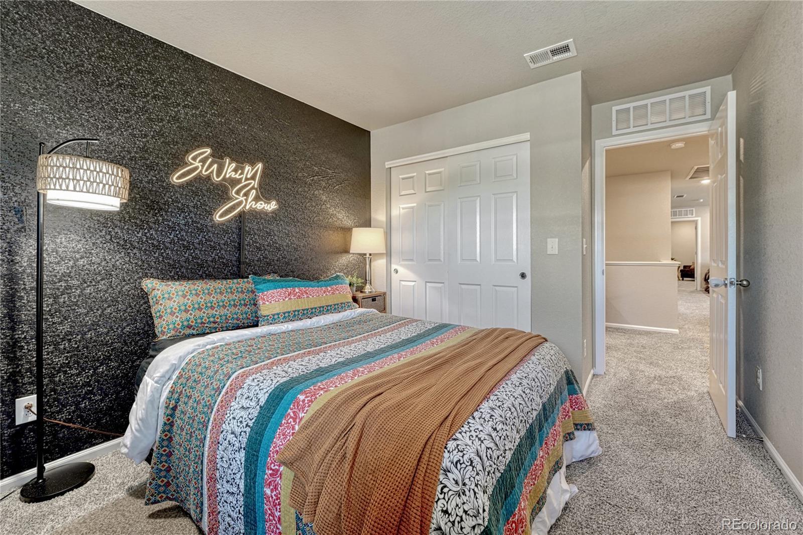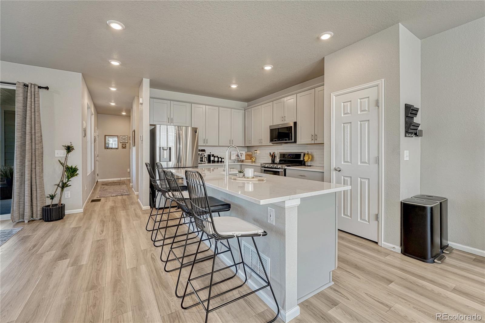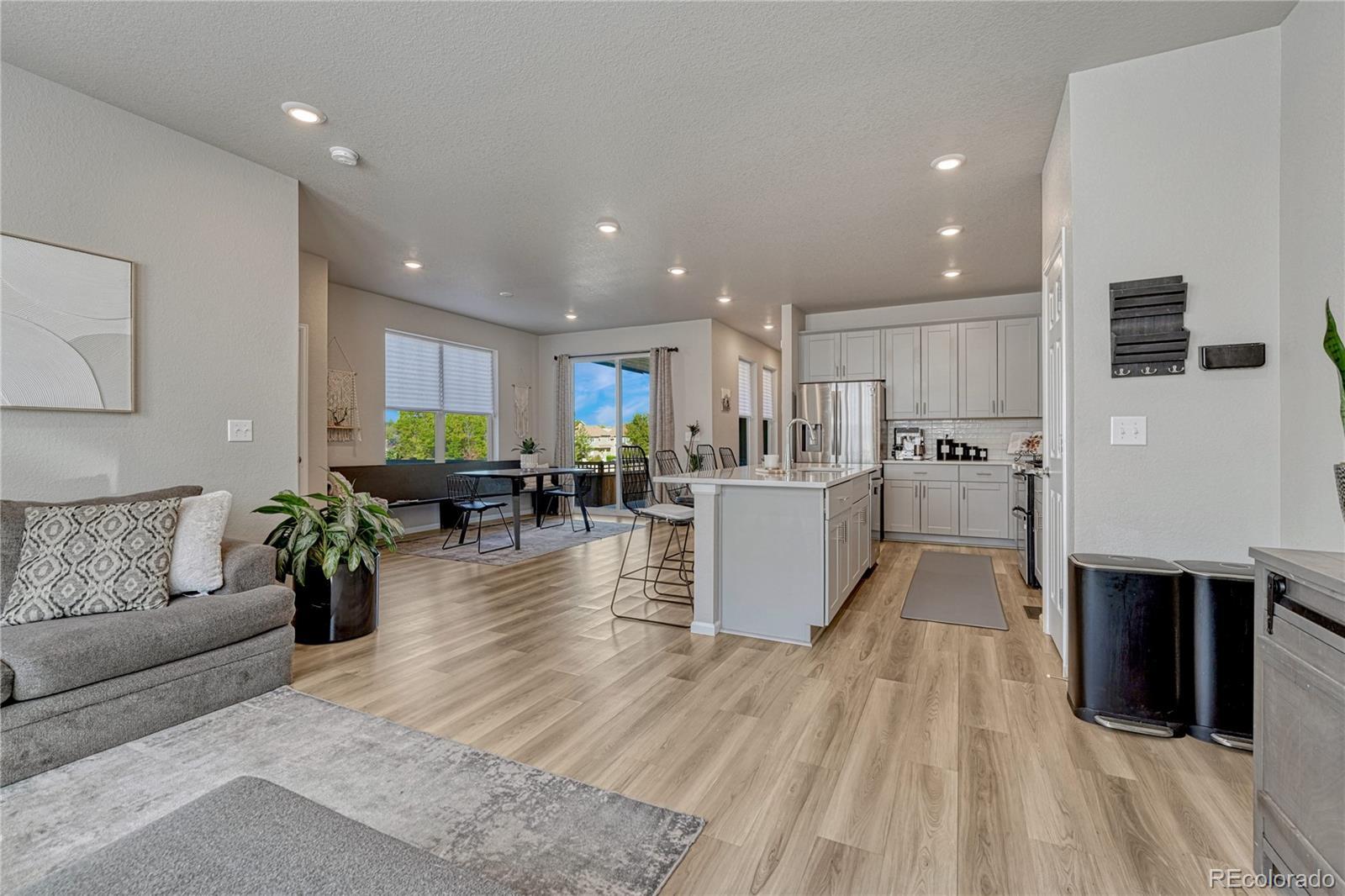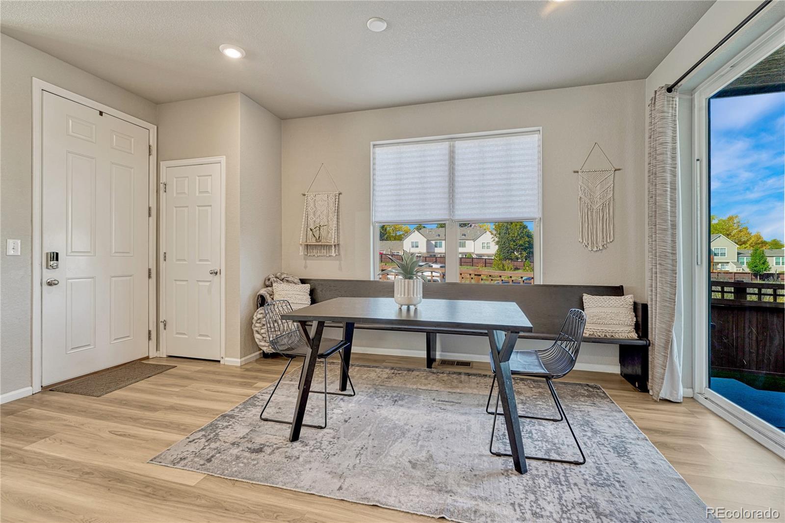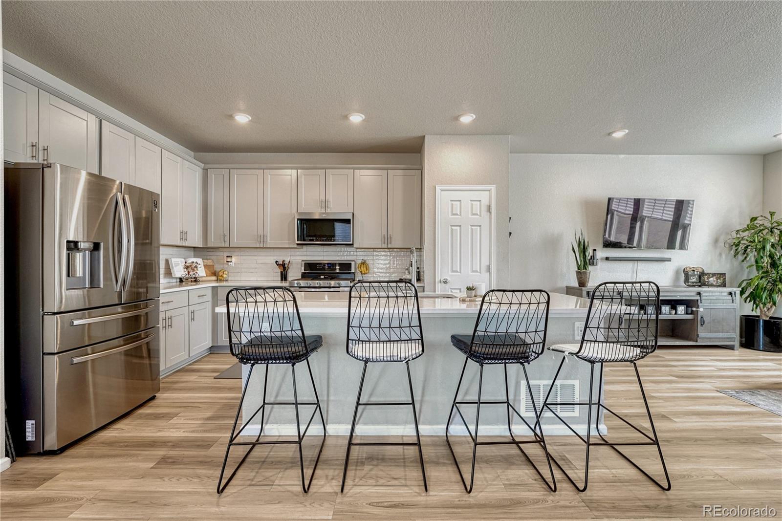 Nestled on a premium end-unit corner lot, this nearly new 2021 energy efficient paired home offers an ideal location, abundant natural light, and low-maintenance living. Tall ceilings, big windows, and an open-concept main level create a bright and welcoming atmosphere from the moment you step inside. Enjoy the benefits of the energy efficient building components and the cost saving feature of seller owned solar panels. WOW! A huge saving going forward! The spacious living room flows to a dedicated dining area and a beautifully upgraded kitchen featuring stainless steel appliances including a gas range, plus a large center island with bar seating for casual meals and gathering. Luxury vinyl plank flooring runs throughout the main level for a modern, cohesive look. Step outside from the dining room to enjoy a covered side patio and an easy-care turf yard, providing the perfect spot to relax or entertain without the upkeep. A convenient half bath, mud room off the garage, and an attached oversized garage add everyday functionality. Upstairs you’ll find a generous primary suite with a large walk-in closet and an adjoining bath offering plenty of space to get ready in comfort. A versatile loft provides room for an office, play area, or home fitness. Two additional bedrooms, full bathroom plus the upstairs laundry complete the upper level. With its corner placement for privacy, abundant sunlight, thoughtful layout, energy efficiency and move-in-ready finishes, this home delivers the perfect blend of style, convenience, and location. Right next to Buckley Space Force Base. Steps away from dining. Easy and convenient access to DIA. Explore more through the virtual tour: https://18281ekansasplace.com/.