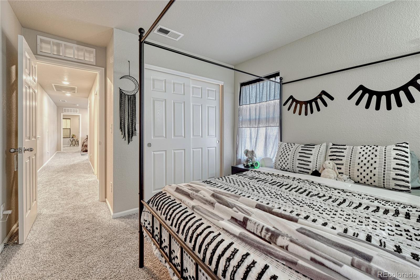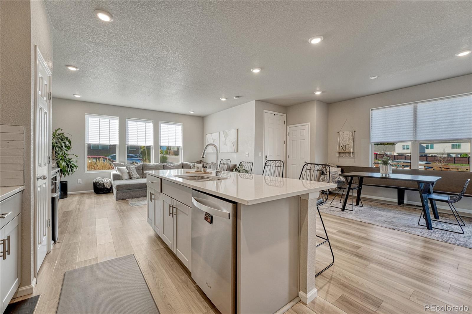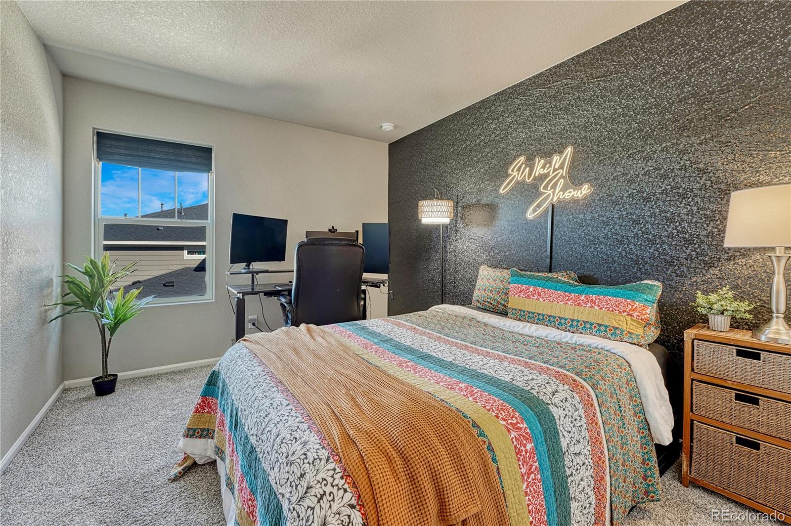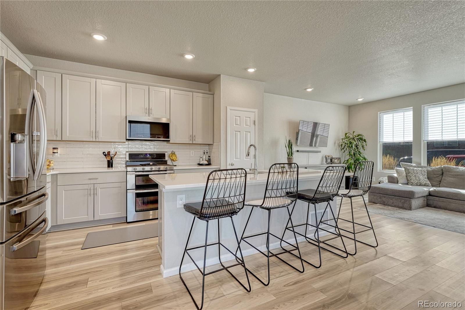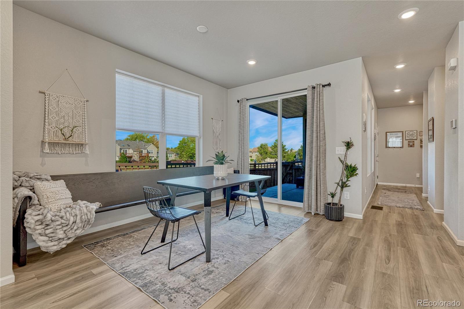 Nestled on a premium end-unit corner lot, this nearly new 2021 energy efficient paired home offers an ideal location, abundant natural light, and low-maintenance living. Tall ceilings, big windows, and an open-concept main level create a bright and welcoming atmosphere from the moment you step inside. Enjoy the benefits of the energy efficient building components and the cost saving feature of seller owned solar panels. WOW! A huge saving going forward! The spacious living room flows to a dedicated dining area and a beautifully upgraded kitchen featuring stainless steel appliances including a gas range, plus a large center island with bar seating for casual meals and gathering. Luxury vinyl plank flooring runs throughout the main level for a modern, cohesive look. Step outside from the dining room to enjoy a covered side patio and an easy-care turf yard, providing the perfect spot to relax or entertain without the upkeep. A convenient half bath, mud room off the garage, and an attached oversized garage add everyday functionality. Upstairs you’ll find a generous primary suite with a large walk-in closet and an adjoining bath offering plenty of space to get ready in comfort. A versatile loft provides room for an office, play area, or home fitness. Two additional bedrooms, full bathroom plus the upstairs laundry complete the upper level. With its corner placement for privacy, abundant sunlight, thoughtful layout, energy efficiency and move-in-ready finishes, this home delivers the perfect blend of style, convenience, and location. Right next to Buckley Space Force Base. Steps away from dining. Easy and convenient access to DIA. Explore more through the virtual tour: https://18281ekansasplace.com/.