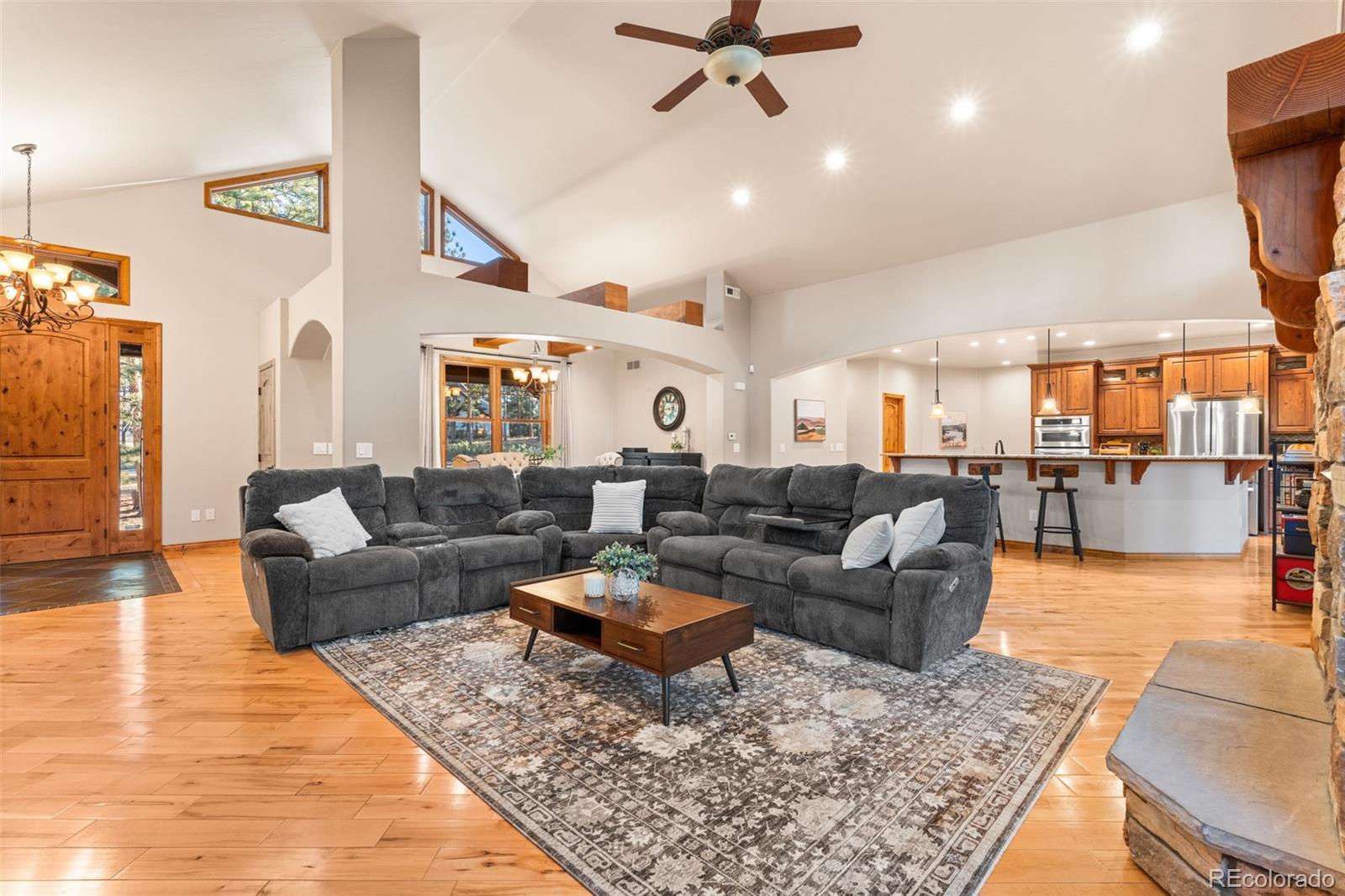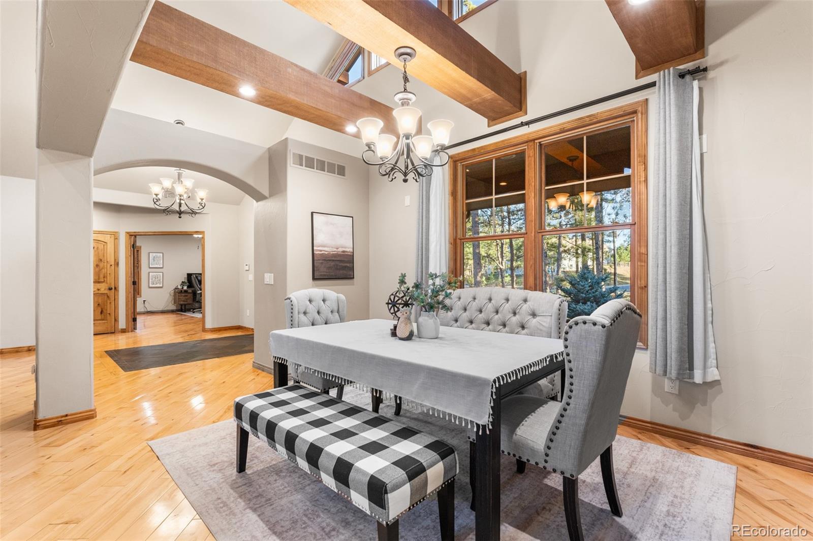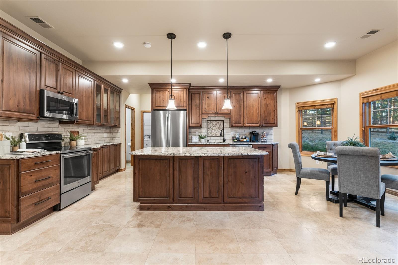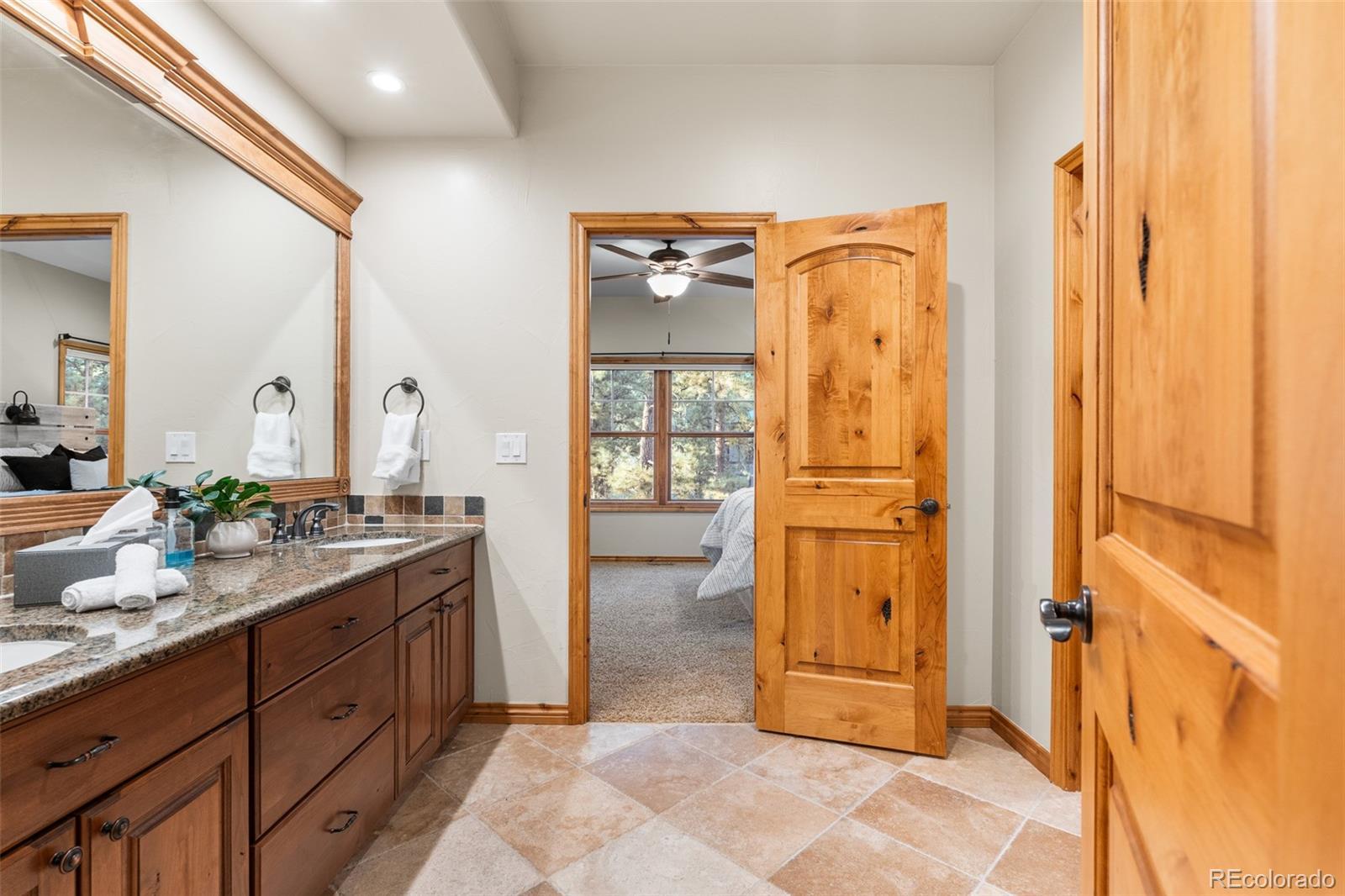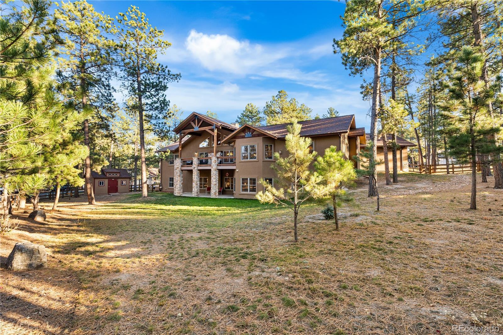 Welcome to a one-of-a-kind custom home in the highly sought-after Sage Port community near Bear Dance Golf Course. Set on a full acre with mature trees, wildlife, and wide Colorado skies, this property blends privacy, versatility, and luxury living. Inside, the layout is ideal for multigenerational living, hosting guests, or creating a private income-producing suite. The main level features soaring ceilings, floor-to-ceiling windows, wood beams, and abundant natural light. A dual-sided stone fireplace anchors the great room and connects to a covered patio for morning coffee or stargazing! The chef’s kitchen offers: • dual granite islands & premium stainless appliances • 5-burner gas cooktop • walk-in pantry • sunlit breakfast nook • formal dining room with wood-beam accents The main-level primary suite includes a private fireplace, spa-inspired five-piece bath, and oversized walk-in closet. Two additional bedrooms, a Jack-and-Jill bath, guest half-bath, and a well-designed mud/laundry room complete this level. The oversized, finished three-car garage provides ample storage and connects to the mud room with a utility sink. The full walk-out lower level is a complete second living space with its own kitchen, granite counters, quality cabinetry, separate entrance, a second primary suite with private bath, two more bedrooms with Jack-and-Jill bath, laundry room, and media room wired for immersive sound. A large bonus room can serve as a craft room, gym, playroom, or bedroom. Outdoor living shines with three covered patios, a gas line for grilling, a storage shed, and a commercial-grade sauna. The treed acre offers seclusion with an easy commute to both Denver and Colorado Springs. Sage Port offers: • nearby open space (Dawson Butte, Sandstone Ranch) • Bear Dance Golf Course • local wildlife including turkeys & deer • Larkspur Elementary’s outdoor education program Explore the full photo gallery, 3D walkthrough, and floor plan. Furnace and roof certified!