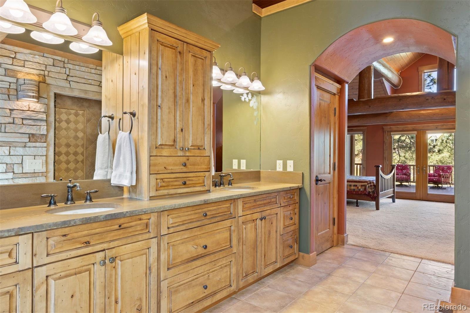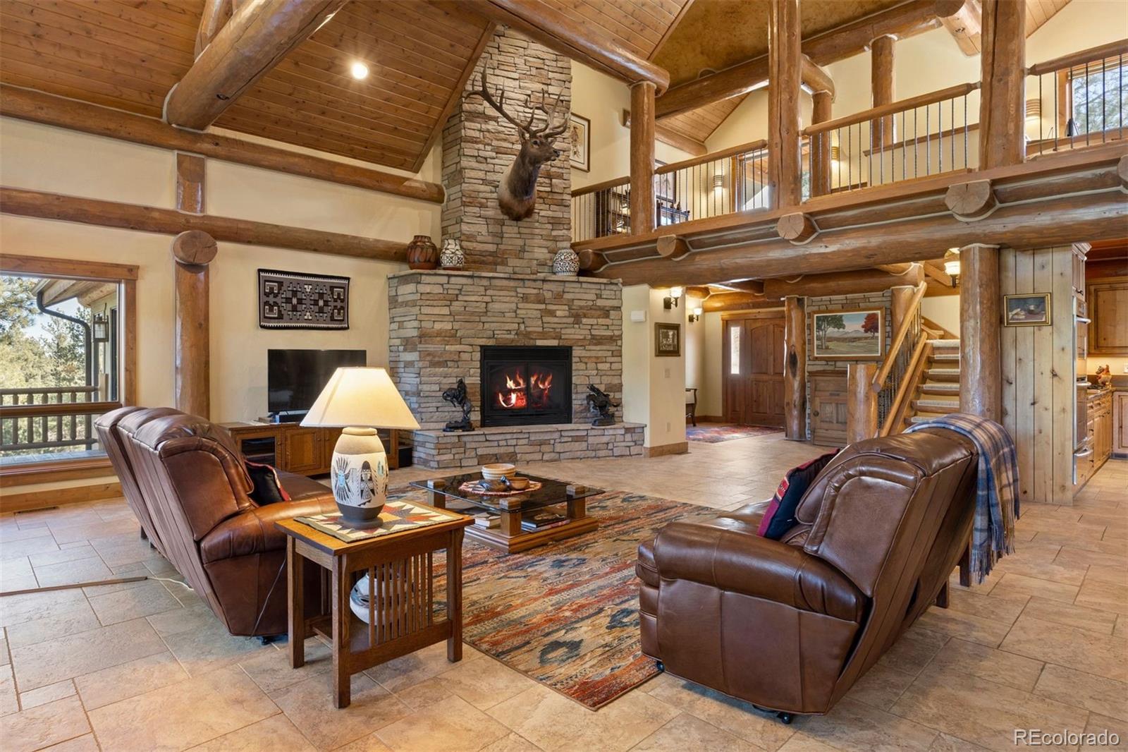 Luxury lodge design, forested privacy, and views of Bear Dance’s 8th green come together effortlessly in this home with main-floor living. Set in a gated golf community in Larkspur, the 2.5-acre property offers a beautiful sanctuary, with shifting light in the trees and wildlife passing through as part of the view. Inside, the home opens in a sweep of magnificent, handcrafted Canadian logs that feel carved from the land itself. Tongue-and-groove ceilings, wood and stone textures, and an emphasis on natural materials bring mountain character and refined comfort into perfect balance. The great room rises with 20' ceilings, exposed beams, and a floor-to-ceiling stone fireplace, while sculptural log supports, crafted like natural tree trunks, hug the intimate seating areas. The room opens to the covered deck, extending the living space into the forest. The gourmet kitchen is appointed with quartzite countertops, knotty alder cabinetry with pull-out storage, and expansive work surfaces. The main-floor primary suite is a retreat, where a fireplace adds warmth, doors open to the deck, and a steam shower and jetted tub elevate the ensuite into a spa-like escape. There is also a guest room on this level. A versatile upper loft, complete with its own fireplace, is ideal for an office or library. The walkout lower level features a generous recreation room, wet bar, craft room, and additional bedrooms. Outside the home presents the look of an iconic lodge, with outdoor living spaces designed for year-round use. The covered timber deck features copper-accented details, and the lower covered patio offers a hot tub. A flagstone walkway leads to an additional flagstone patio with a sculptural water feature. Located within the upscale, gated Bear Dance community, known for its top-ranked championship golf course, this property offers privacy, craftsmanship, and the lifestyle that makes Larkspur one of the most sought-after settings.