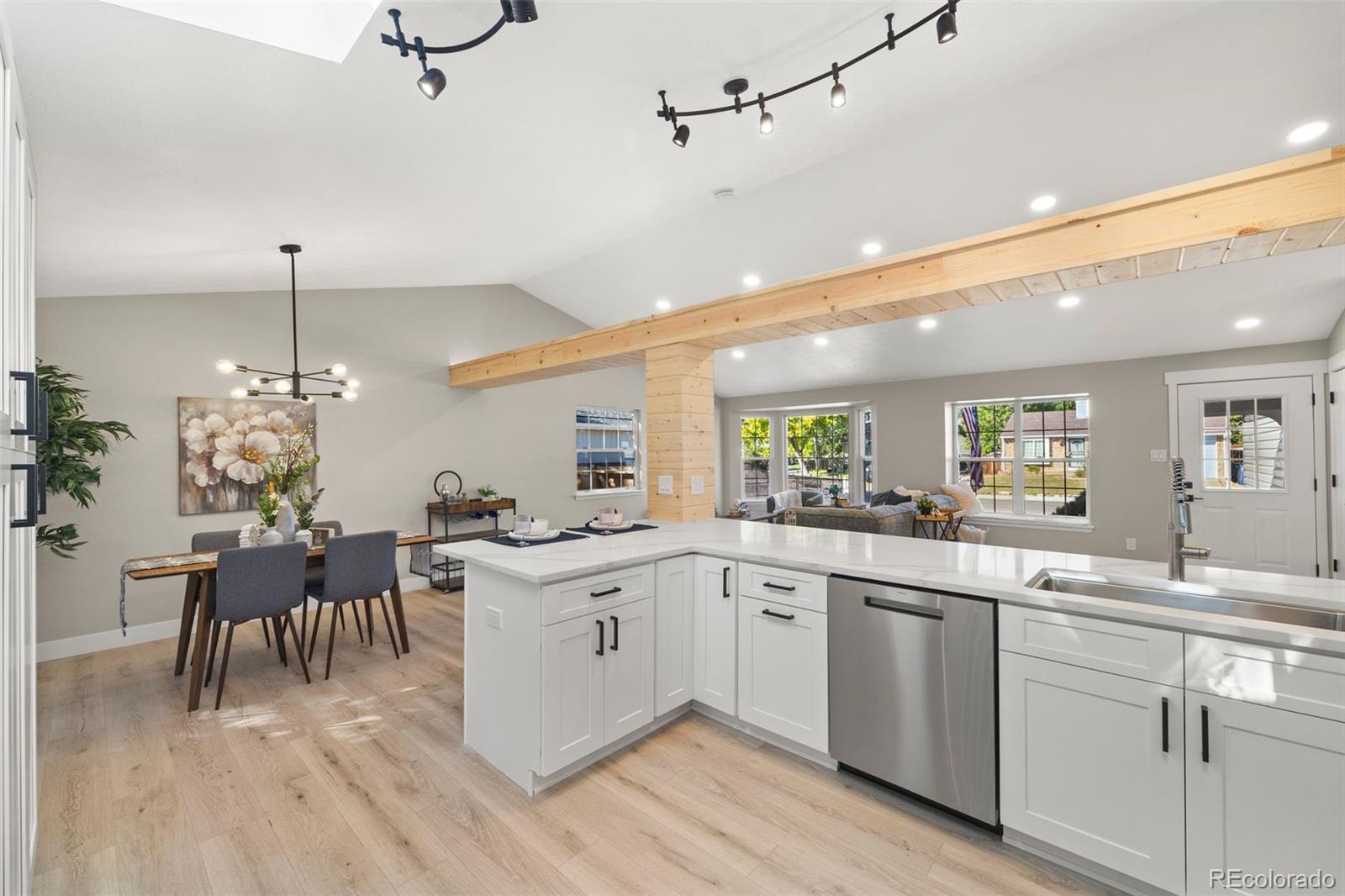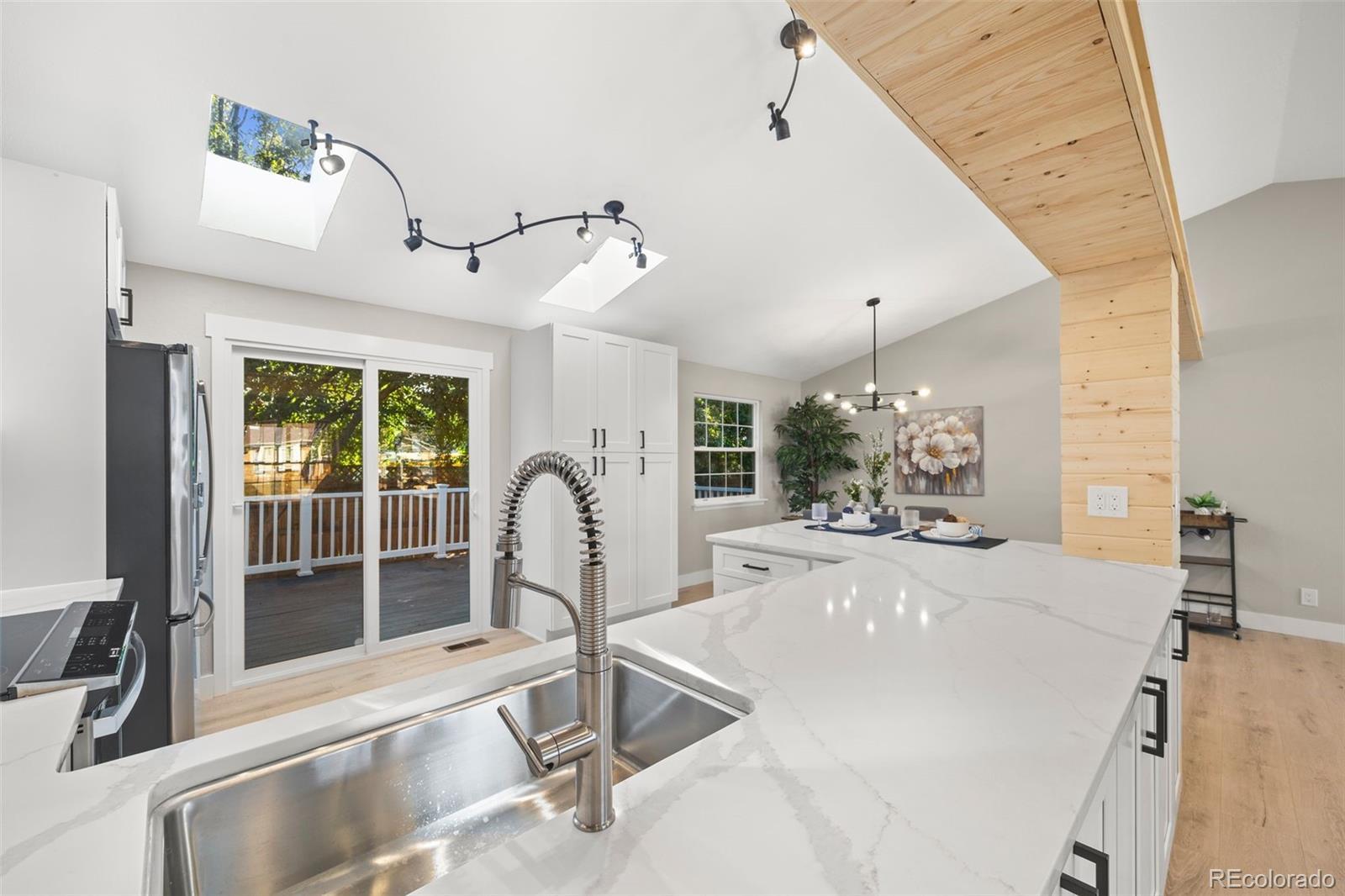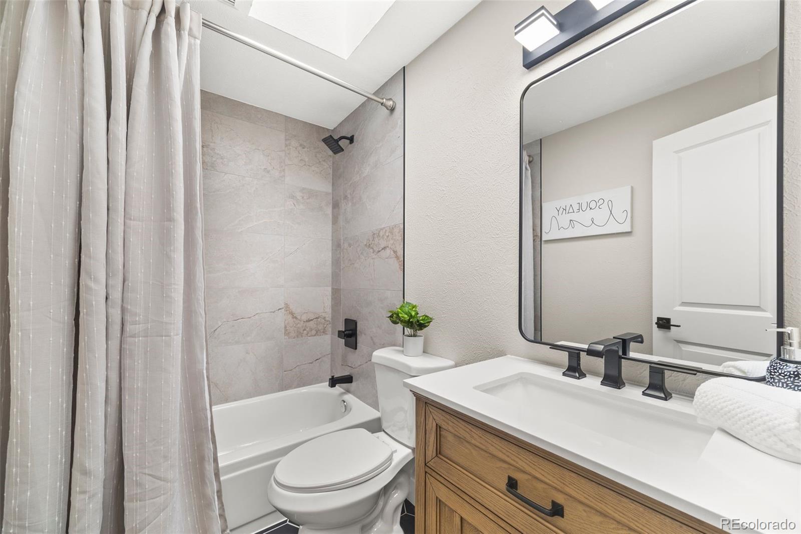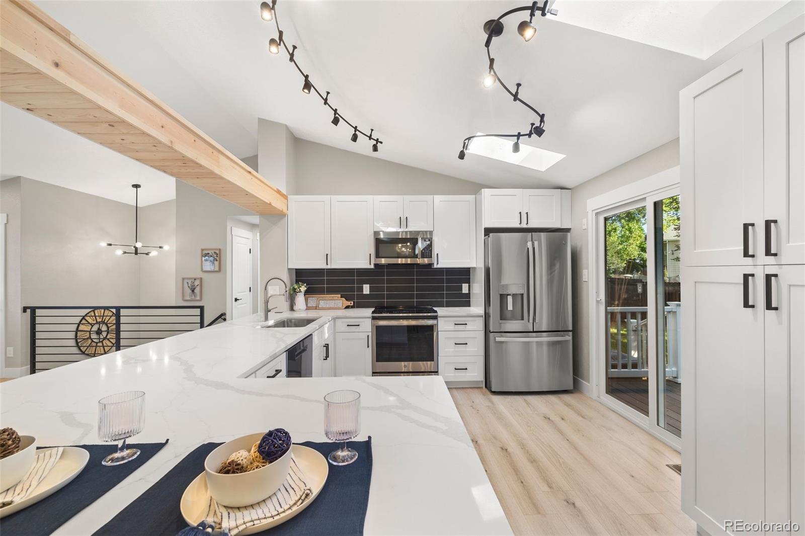 Welcome home to this beautifully updated 3-bedroom, 2-bath gem in Westminster’s desirable Sheridan Green neighborhood! Step inside to find fresh laminate flooring, new lighting, and a striking wood-wrapped post and beam that adds warmth and style. The bright, open kitchen features quartz counters, white shaker cabinets, new stainless steel appliances, and a spacious pantry — perfect for cooking and entertaining. The bathrooms shine with new tile, vanities, and lighting, while vaulted ceilings and skylights fill the main level with natural light. The primary bedroom includes a walk-in closet for added convenience. Downstairs offers flexible living options with a large family room, home office area, or gym space, plus an updated ¾ bath, a bedroom with an egress window, and plenty of storage. Major systems are new, including the roof, furnace, A/C, and water heater, for true move-in peace of mind. Outside, enjoy a low-maintenance xeriscaped front yard and a spacious backyard deck with durable composite decking — ideal for summer BBQs or relaxing evenings. Siding has also been addressed. The attached 2-car garage includes shelving for extra storage. Conveniently located near Ryan Elementary, Sherwood Park, and minutes from the Promenade at 104th and Westminster Blvd and shopping options at 120th & Sheridan, you’ll love the easy access to Denver, Boulder, and Standley Lake trails. This move-in ready home offers modern updates, flexible space, and a prime Westminster location — come see it today!
