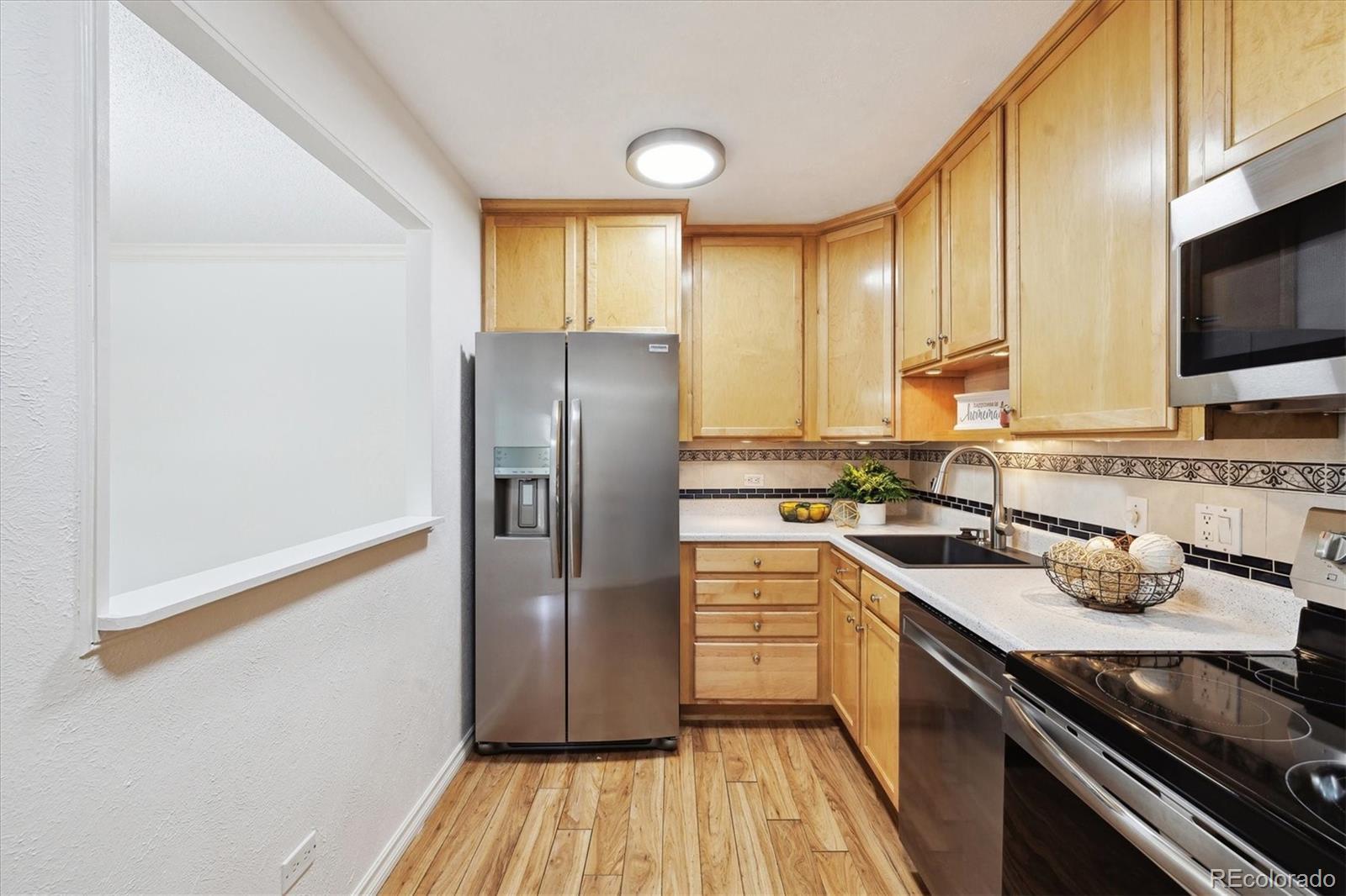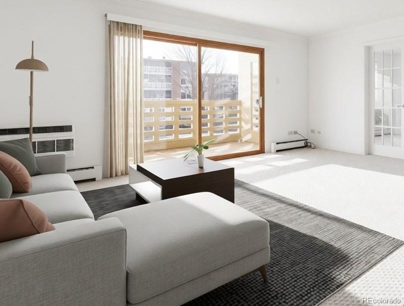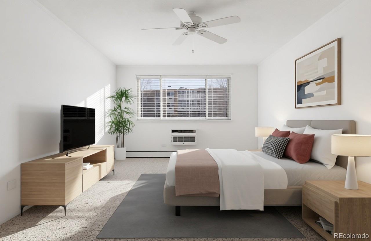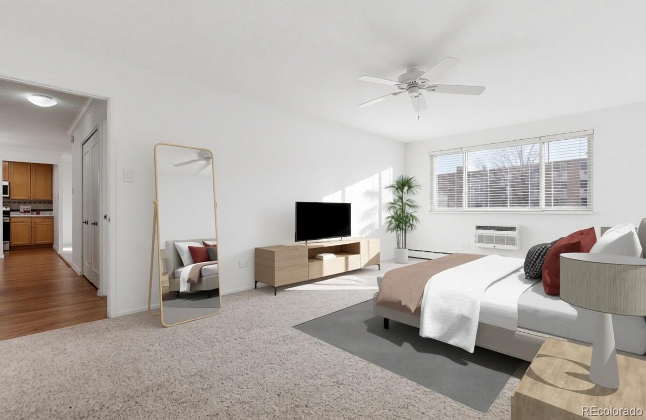 Updated and move right in to this rare 1200 sf unit condo with the Dining Room floorplan, remodeled and ready to move right in! New Interior Paint! This home has 2 bedrooms, 2 bathrooms, and 1 detached parking garage. Open floorplan and spacious. Kitchen features updated laminate floors, cabinets/countertops, and tile backsplash. Stainless appliance package included. Primary bedroom oversized w/walk-in closet and en-suite remodeled 3/4 bathroom featuring tall wood stained vanity, quartz countertop, and tiled shower surround. 2nd Room can be bedroom, office, or flex space for your desired use, and opens to Living Room w/glass french doors for flexible use options. Guest bath w/updated vanity, Corian countertop, & spacious shower w/glass doors. Open Lanai w/updated double pane slider door. 2 brand new wall ac units included! This condo is located on the same floor as the laundry room and bonus storage room! **Windsor Gardens is Colorado's Largest Age 55+ Active Adult Living Condo Community. Did you know? Monthly HOA Dues include annual property taxes! And heat, water, sewer, trash, round-the-clock patrolling community responders, full time onsite association management, grounds/building maintenance, and activities department. Enjoy clubhouse amenities such as fitness center, indoor/outdoor pools, hot tub, sauna, billiards, library, craft rooms for ceramics, sewing, woodworking, and 9 hole par 3 golf course and onsite restaurant both open to the public. Stay engaged with a wide array of activities, clubs, and events scheduled every month. Additional features include garden plot program, private walking trail and nature preserve, and RV/Boat storage. The Highline Canal runs full length along south side of the complex. RTD Bus Stops located thru-out the community. FHA/VA approved. Close to restaurants, stores, shopping…Minutes to Lowry, Hwy 225, Cherry Creek…Easy access to DIA and downtown. Come see for yourself what Windsor Gardens has to offer. ©2021**
