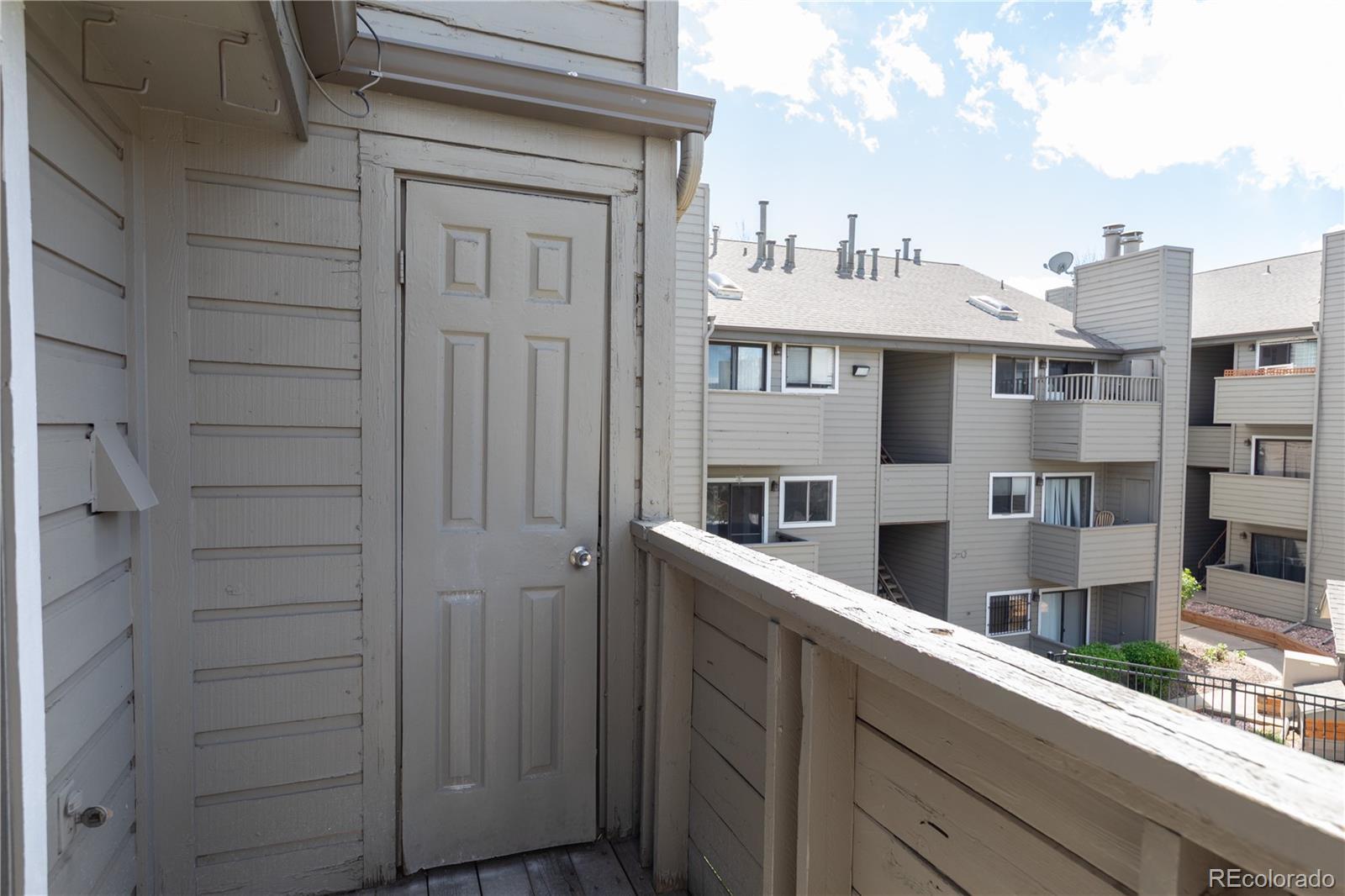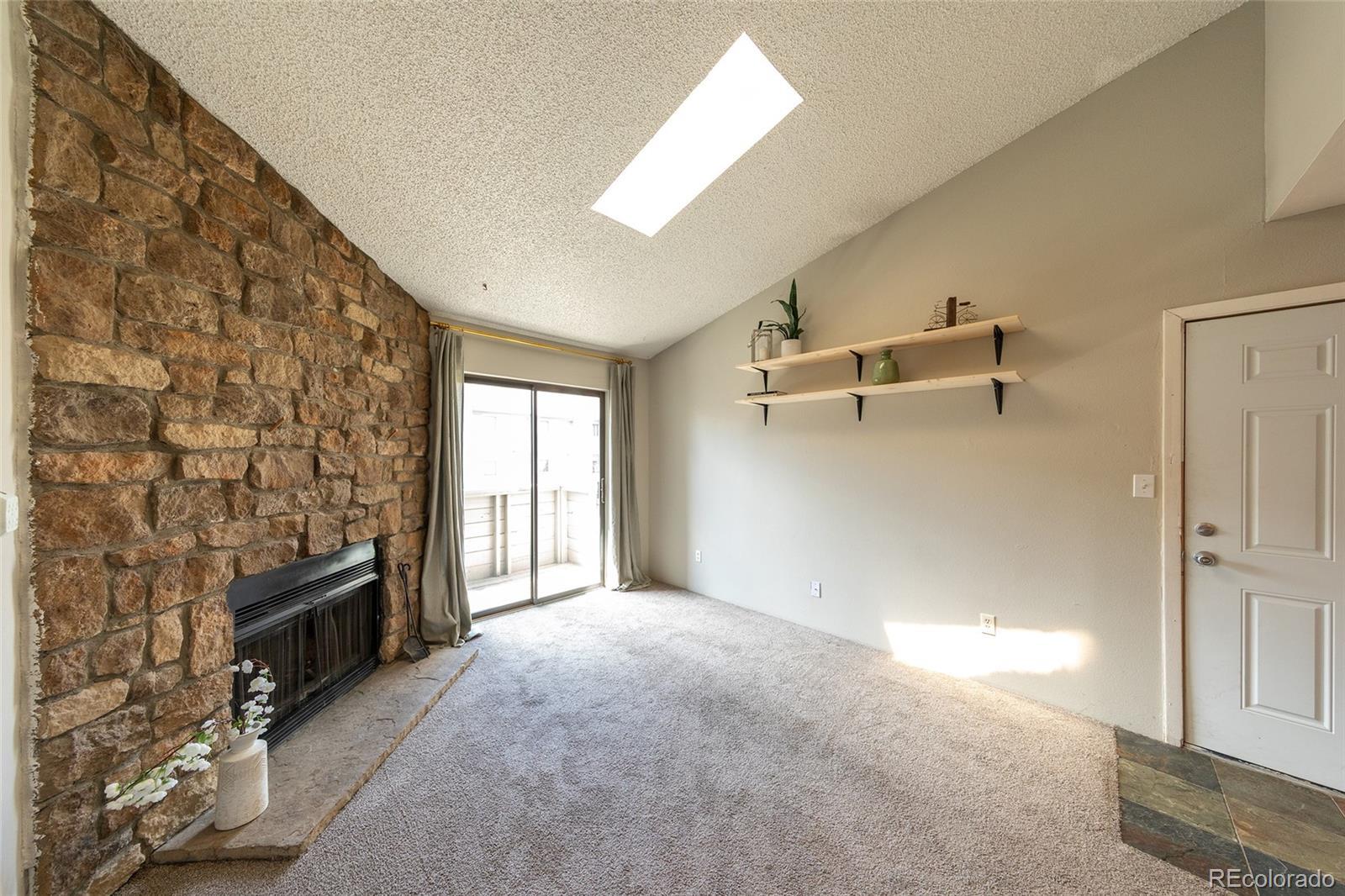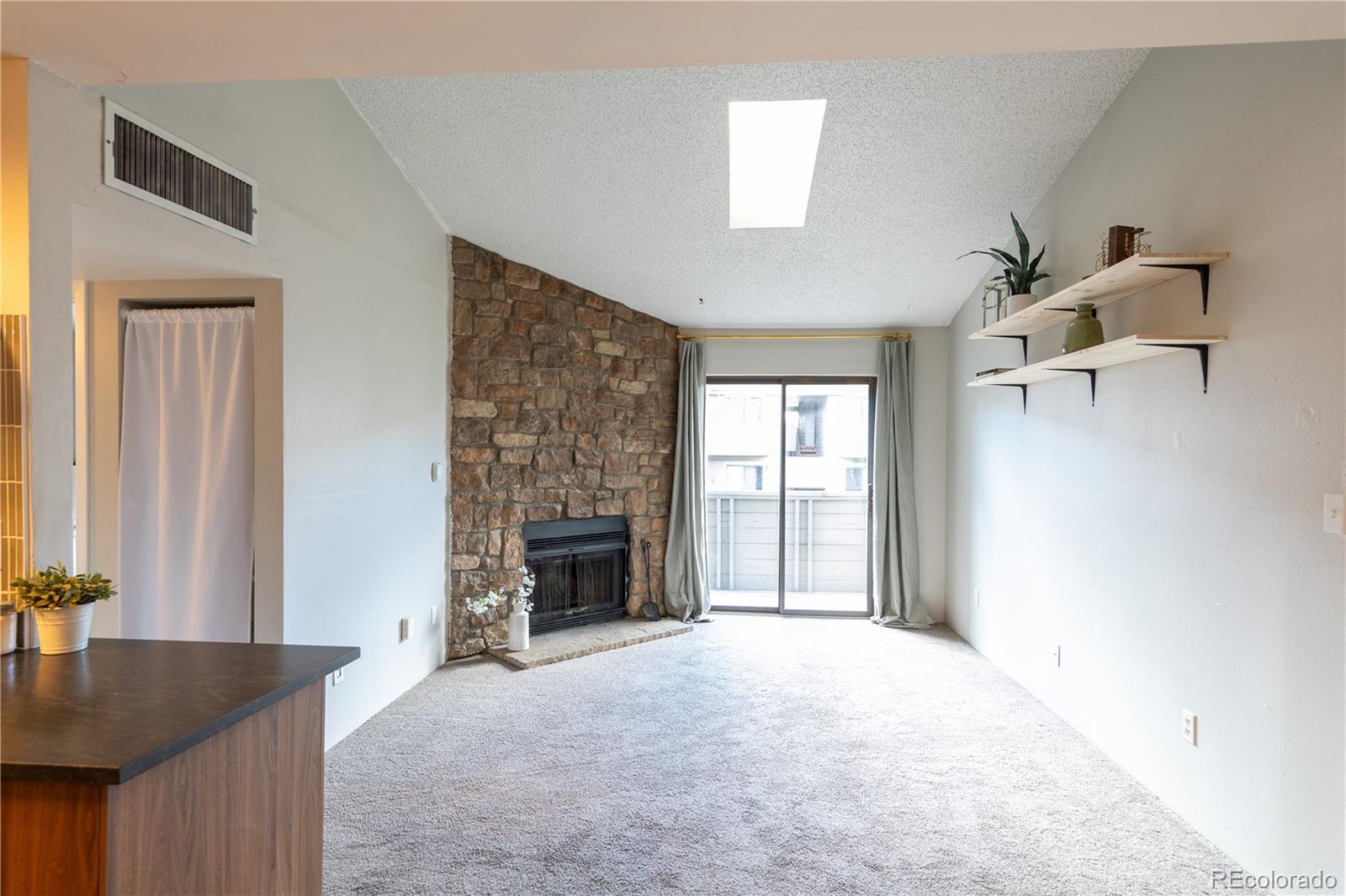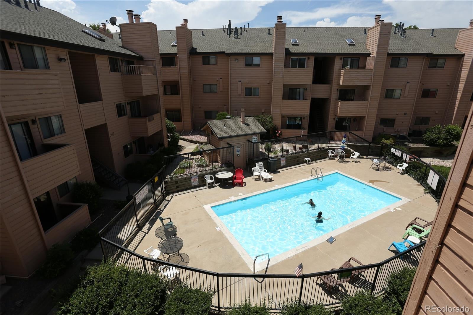 MOTIVATED SELLER! Preferred lender offering buy down concession. Great opportunity to own a well-kept 1-bdrm, 1-bath top floor condo with beautiful, newly remodeled kitchen wtih granite countertops! Vaulted living room ceiling with wood-burning fireplace. New water heater 2024, new furnace & AC 2022. In-unit washer & dryer. West facing balcony overlooks beautiful pool area. Storage close off balcony. Steps from RTD bus stop. Nearby shopping including River Pointe Center. Easy access to Hwy 285.