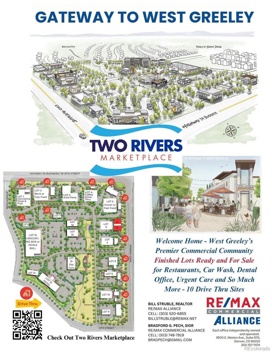 PERFECT FOR DENTAL, URGENT CARE/MEDICAL BUILDING, TIRE STORE, SO MUCH MORE. TRACT B - 1 with 20,600 sq. ft. or .47 acres. City to approve split into two lots with reciprocal agreement for shared parking lot. Easy access off of Hwy 34 Business and 83rd Ave. with 25,000+ cars per day. 8,000 - 9,000 cars on 83rd. The site is surrounded by existing single family and multifamily developments, and many new large scale residential developments under way - approx. 15,000 new homes built or on their way. The property totals 29 acres and is zoned C-H, Commercial High. TWO RIVERS MARKETPLACE - THE GATEWAY TO WEST GREELEY - FINISHED PAD SITES READY, TRACT 2 LOT 1 AND LOT 2 NEED CITY SUBDIVISION. Two Lots Under Contract - Four Lots Available For Sale. 11 Total Lots on Highway 34 Business and 83rd Ave. with emphasis of QUICK AND EASY access with many convenient access points, including an upcoming roundabout at 83rd and 12th. The City of Greeley is development friendly and encourages end user submittals early on for quicker development turnarounds. Two Rivers Marketplace features 10 DRIVE THRU LOTS OUT OF 19 SITES. The Core Center includes finished lots envisioned for grocer, brew pubs, leisurely restaurants backing to east facing open space - possible hotel, office/medical and additional DRIVE THRU spaces. The entire loop road and 11th Ave. is completed allowing end user construction Summer 2025. Please contact listing agents for more details. Co-Listed with Brad Pech, RE/MAX Commercial, 303-504-3444. The developer has an entire development team which can assist with any and all development needs onsite. The developer can provide turnkey services if needed and desired. SEE FEATURE ARTICLE: "GROWING GREELEY" in NOCO Style Magazine, February 2025 attached.BizWest: https://bizwest.com/2025/01/08/vacant-fields-no-more-west-greeley-projects-are-developing/. Drone Video: https://youtube.com/watch?v=hzd7c9czq1s&si=ZqHWyx24kaMlyAyS.