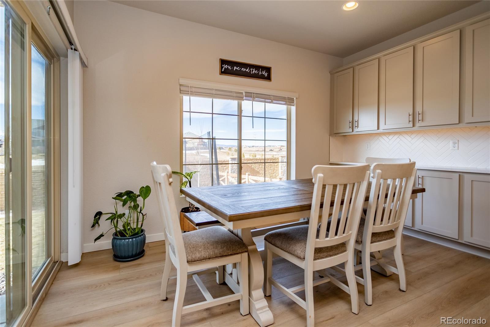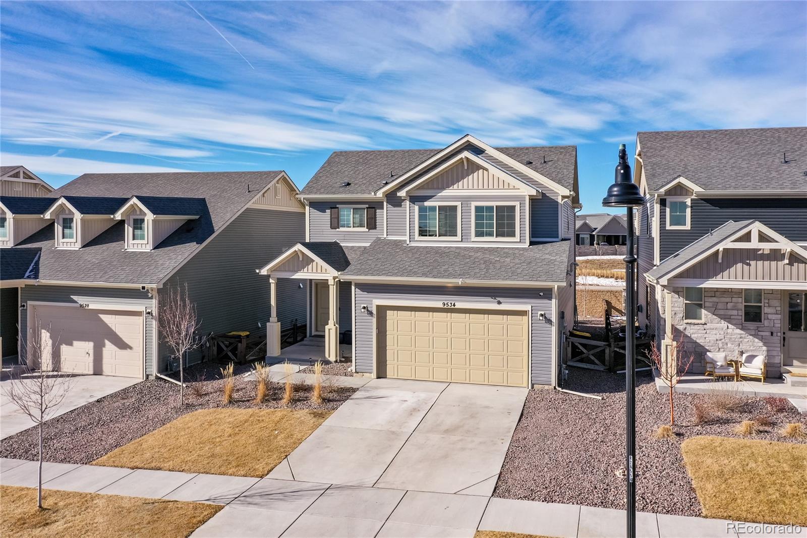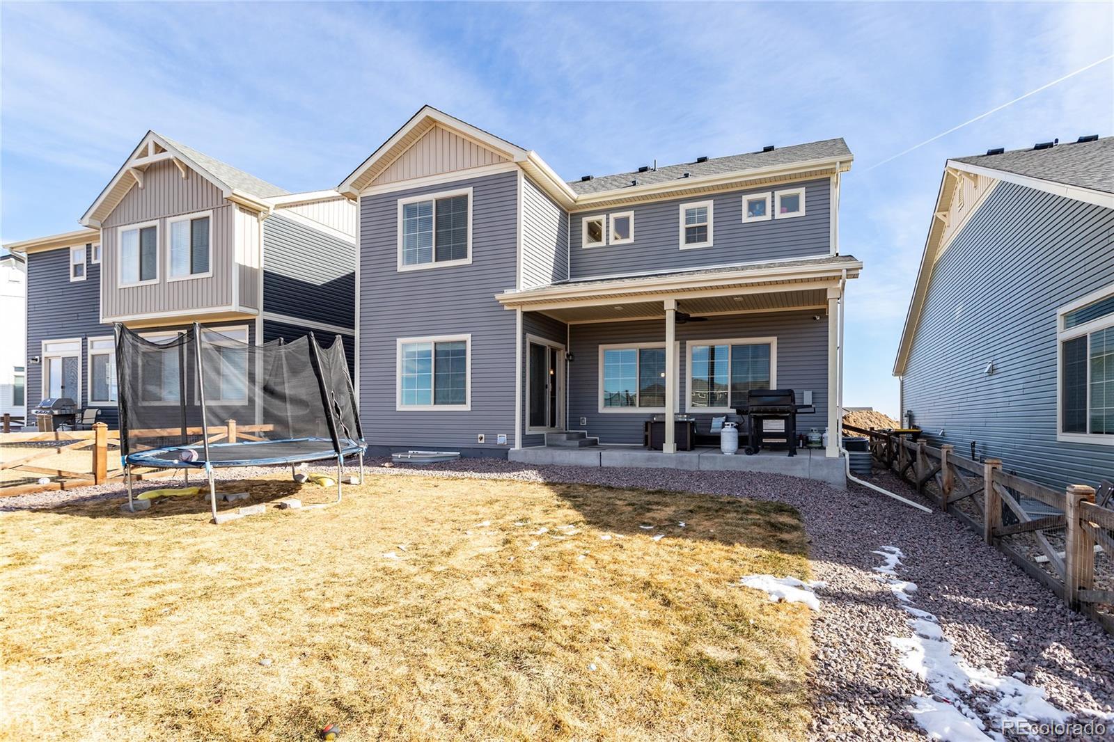 Welcome to this beautifully designed Zenith plan built in 2023 by Oakwood Homes located in the highly desirable Banning Lewis Ranch community. With over 2700 total square feet, 4 bedrooms and 4 bathrooms, this thoughtfully designed home blends modern style in an open concept floor plan while offering everyday functionality. The large covered front porch creates an inviting first impression and the low maintenance exterior and fully landscaped and fenced yard makes this home better and more affordable than waiting for a new build. Inside, the spacious main level is filled with natural light and features a welcoming living area ideal for both everyday living and entertaining, flowing seamlessly into a stylish, well-appointed kitchen with large island, Whirlpool stainless steel appliances, a gas range, quartz countertops, abundant cabinetry, and a generous dining area with exceptional storage and workspace. Luxury vinyl plank flooring runs through the main living spaces, providing both beauty and durability. Upstairs features a large primary bedroom with ensuite and walk in closet along with two additional bedrooms, full hall bath and large laundry room. The fully finished basement adds a second living area, dedicated office area, bedroom and bathroom. Additional highlights include a security system, upgraded carpet pad, bathroom tile surrounds and quartz countertops, sprinkler system, 220V outlet on the spacious back porch for a hot tub, all contributing to the home’s comfort and efficiency. With its smart layout, quality finishes, generous living spaces, and true move-in ready condition, this home delivers the perfect blend of style, functionality, and modern living. Residents enjoy resort-style recreation center with fitness center, dog park, playground and pool. This is your opportunity to own a nearly new home in a vibrant, amenity-rich community offering a beautiful blend of comfort, style and lifestyle. Come see it today!