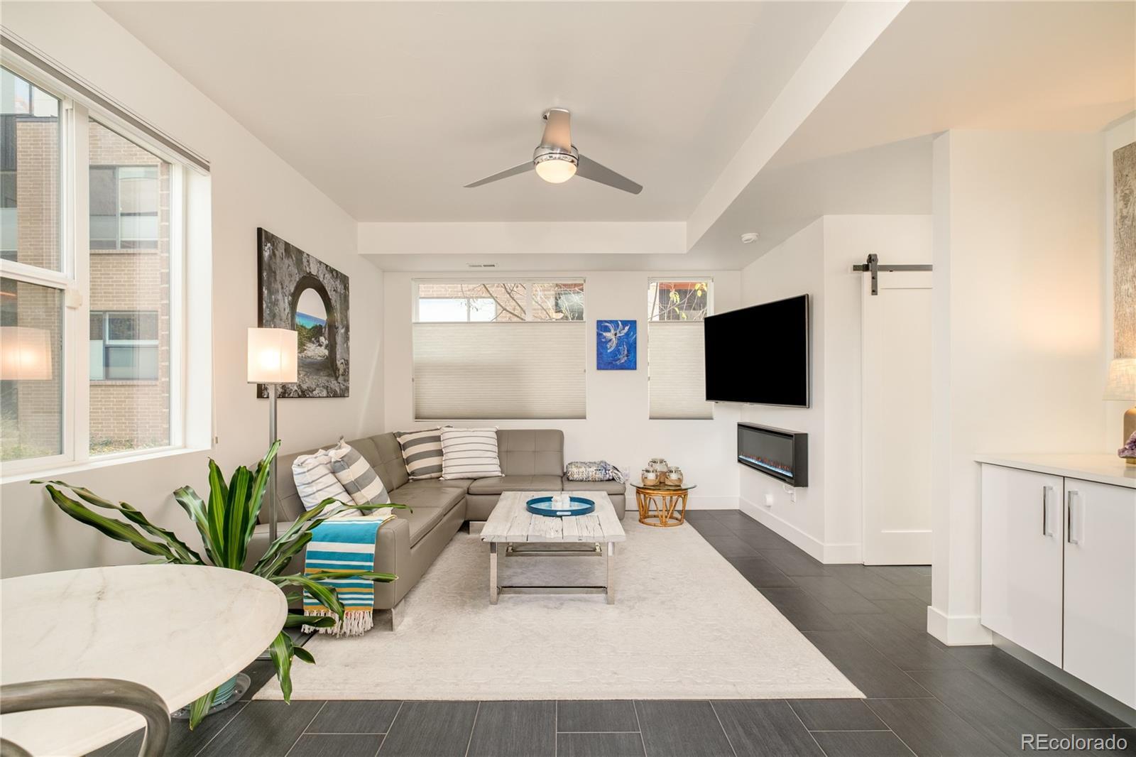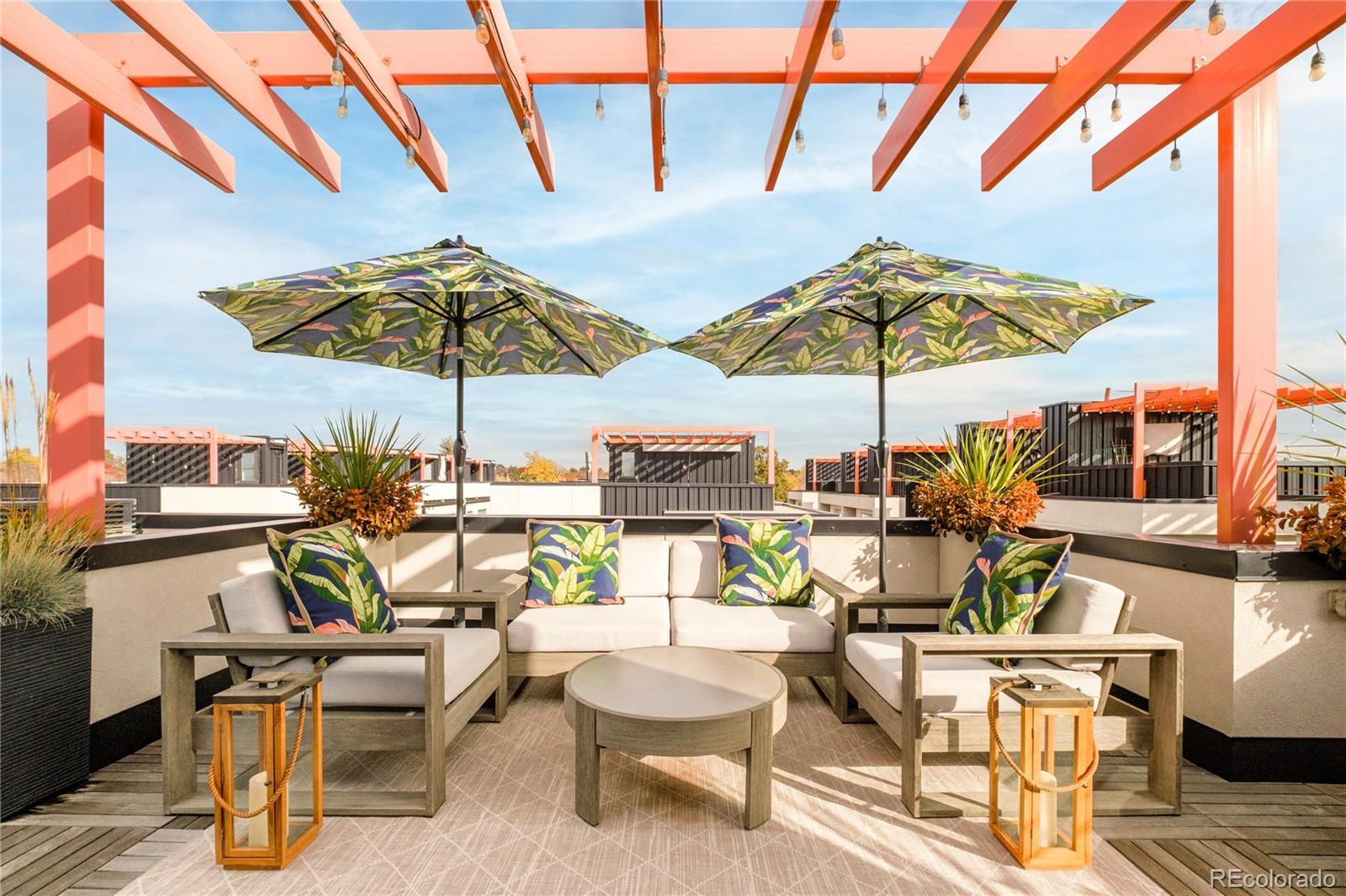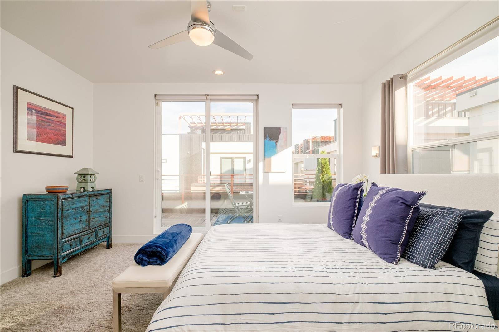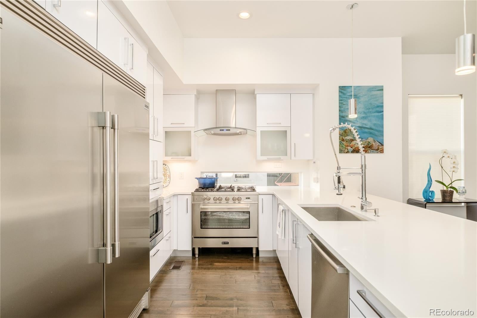 This immaculate end unit tells a story of light, space, and sweeping mountain views. Four en-suite bedrooms, five baths, and a floor plan wider than most—designed for the way you actually live. The entry level welcomes you with a versatile bedroom or den featuring an electric fireplace, wet bar, walk-in closet, and direct access to a generous 10x15 patio. Upstairs, the main level unfolds into an open great room where the kitchen takes center stage: a 64" double-wide refrigerator, high-gloss cabinetry, quartz countertops, and a 36" Italian range that commands attention. Dining and living spaces flow effortlessly, accented by designer lighting and a statement fireplace. A sun-drenched ensuite bedroom—ideal as a home office—completes this level. The top residential floor is home to the primary suite, a private sanctuary with balcony, walk-in closet with custom built-ins, and a spa-inspired bath finished in marble tile. A guest suite and laundry round out the level. Throughout, you'll find hardwood floors and Level 4 hand-trowel wall finishes—details that elevate the everyday. Crowning it all, a rooftop deck offers sweeping mountain views and space to entertain or simply breathe, prepped for a hot tub and built for Colorado living. An attached two-car garage with epoxy flooring and storage cabinets completes the home. In close proximity to City Park, City Park Golf Course, Denver Zoo and RINO with fabulous local amenities, this is modern Denver at its finest. The home is awesome as a primary residence and is an easy lock-and-leave option for those who travel on a regular basis. Buyer to verify square footage and schools. Furniture is negotiable.