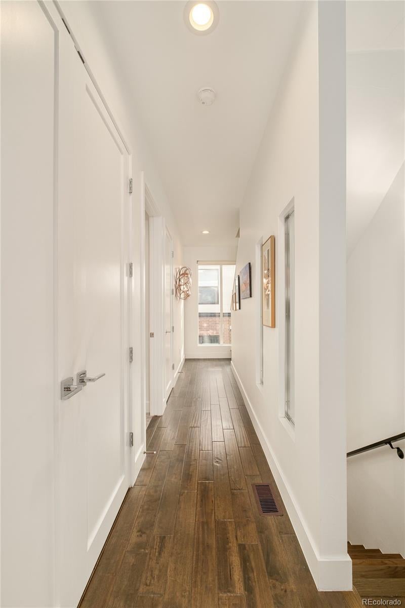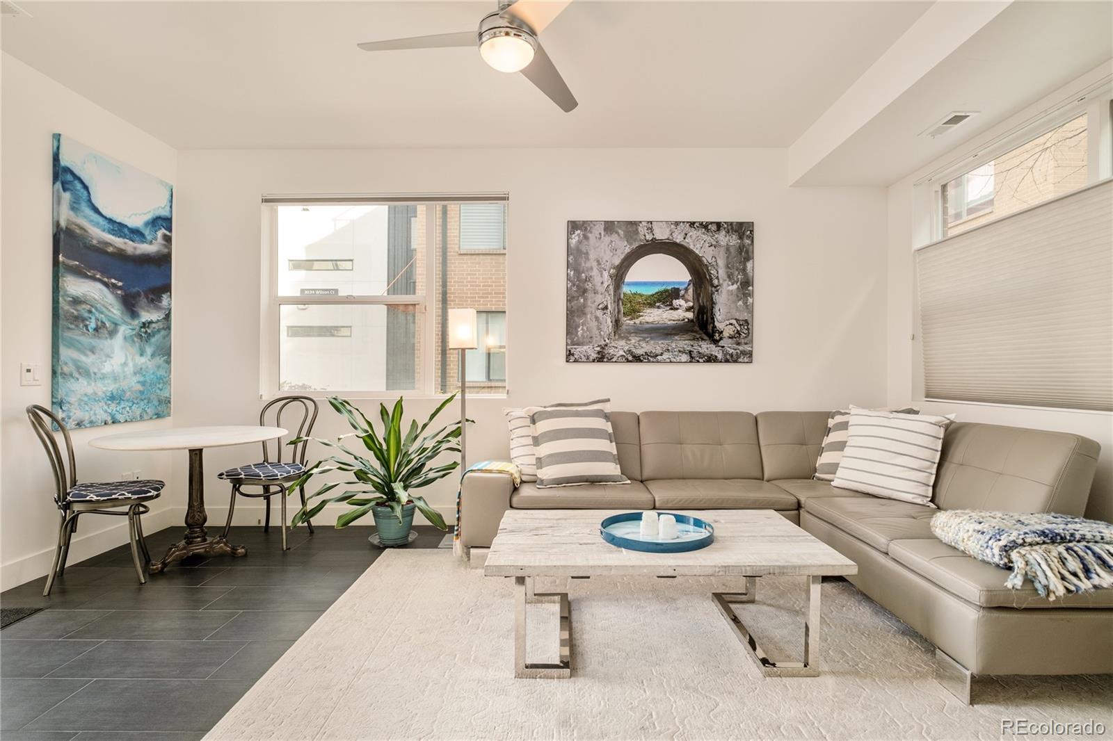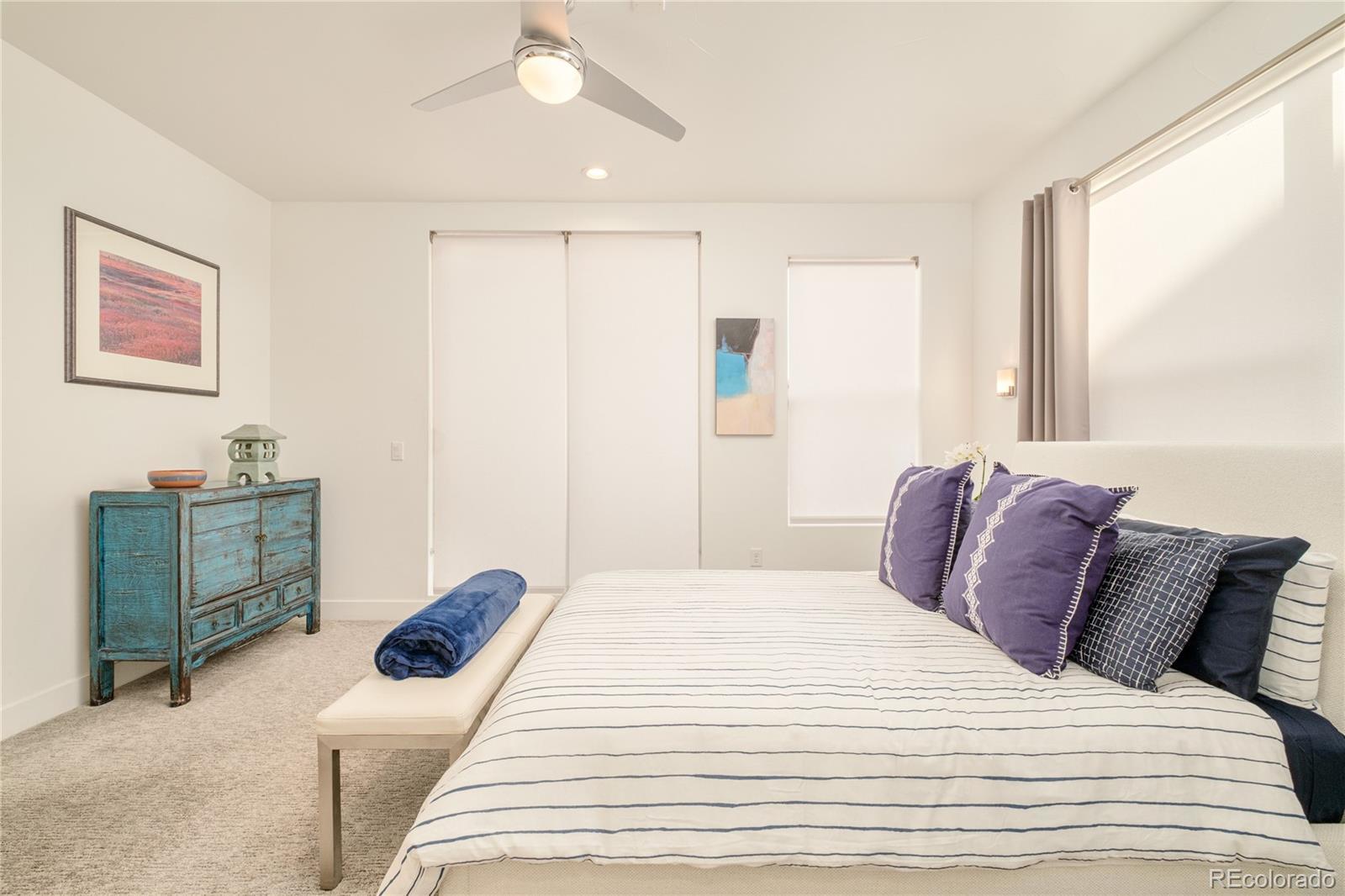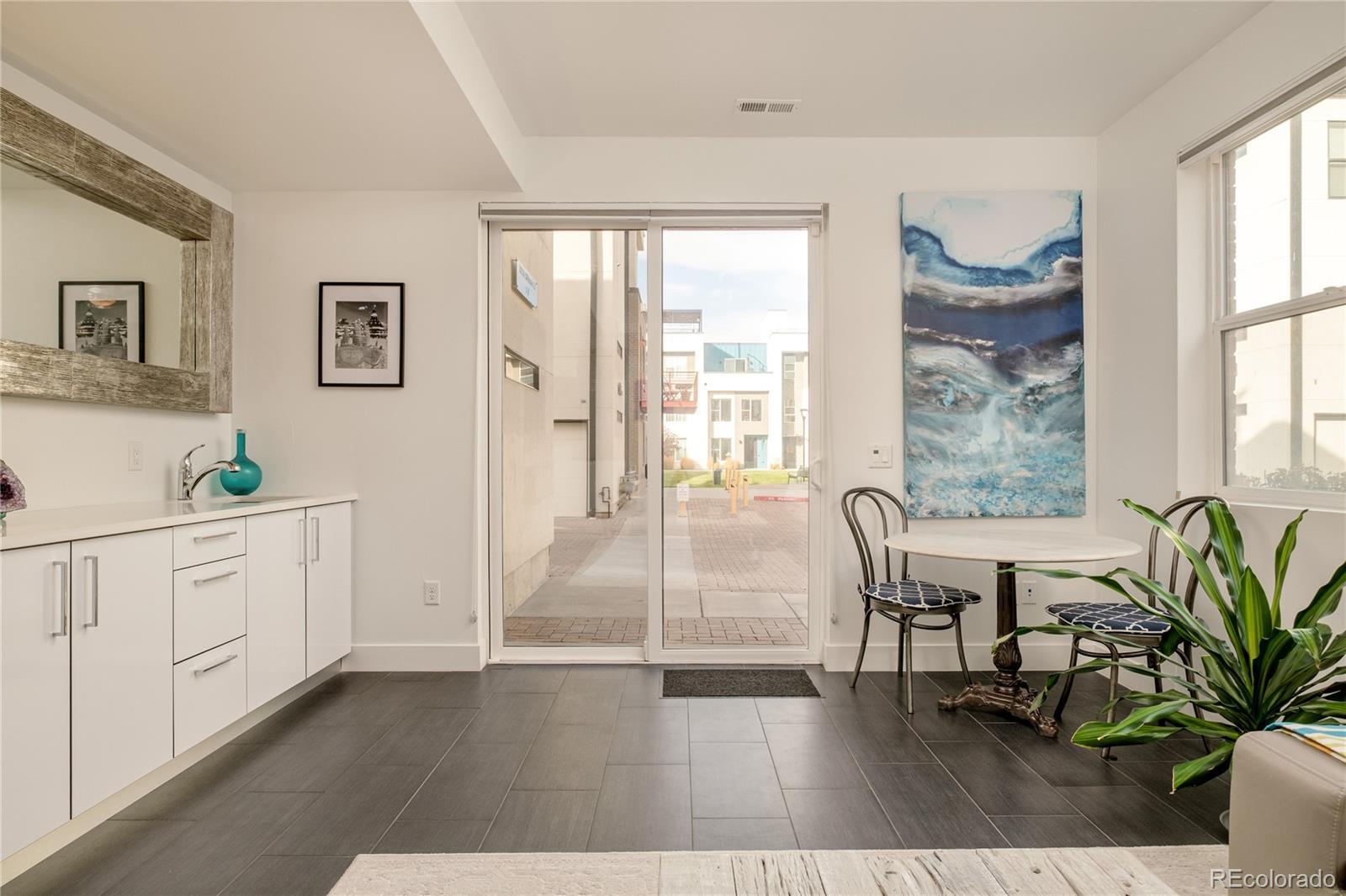 This immaculate end unit tells a story of light, space, and sweeping mountain views. Four en-suite bedrooms, five baths, and a floor plan wider than most—designed for the way you actually live. The entry level welcomes you with a versatile bedroom or den featuring an electric fireplace, wet bar, walk-in closet, and direct access to a generous 10x15 patio. Upstairs, the main level unfolds into an open great room where the kitchen takes center stage: a 64" double-wide refrigerator, high-gloss cabinetry, quartz countertops, and a 36" Italian range that commands attention. Dining and living spaces flow effortlessly, accented by designer lighting and a statement fireplace. A sun-drenched ensuite bedroom—ideal as a home office—completes this level. The top residential floor is home to the primary suite, a private sanctuary with balcony, walk-in closet with custom built-ins, and a spa-inspired bath finished in marble tile. A guest suite and laundry round out the level. Throughout, you'll find hardwood floors and Level 4 hand-trowel wall finishes—details that elevate the everyday. Crowning it all, a rooftop deck offers sweeping mountain views and space to entertain or simply breathe, prepped for a hot tub and built for Colorado living. An attached two-car garage with epoxy flooring and storage cabinets completes the home. In close proximity to City Park, City Park Golf Course, Denver Zoo and RINO with fabulous local amenities, this is modern Denver at its finest. The home is awesome as a primary residence and is an easy lock-and-leave option for those who travel on a regular basis. Buyer to verify square footage and schools. Furniture is negotiable.