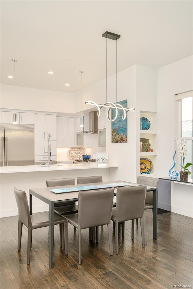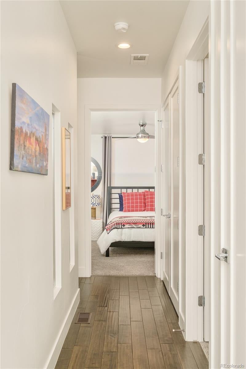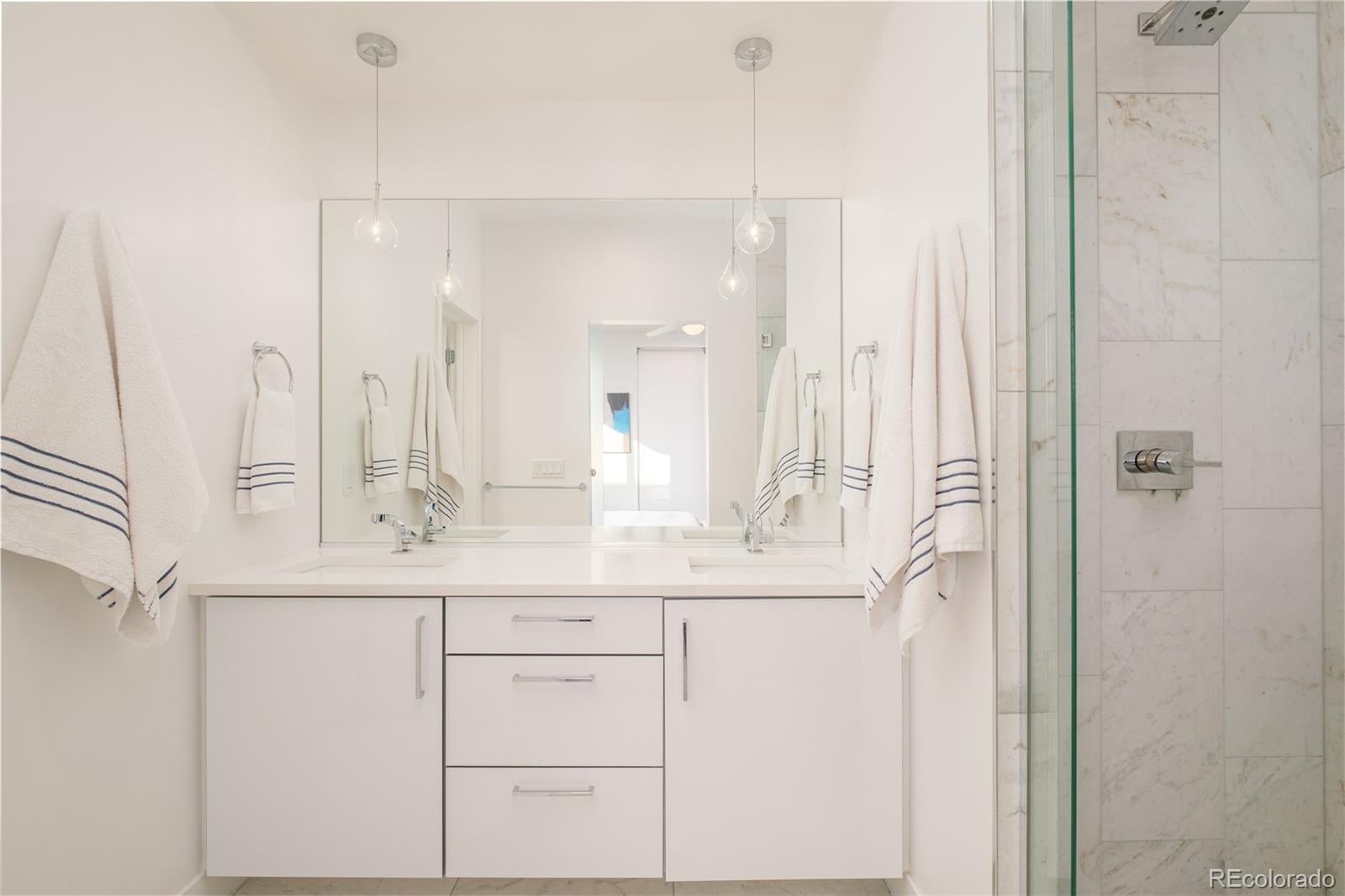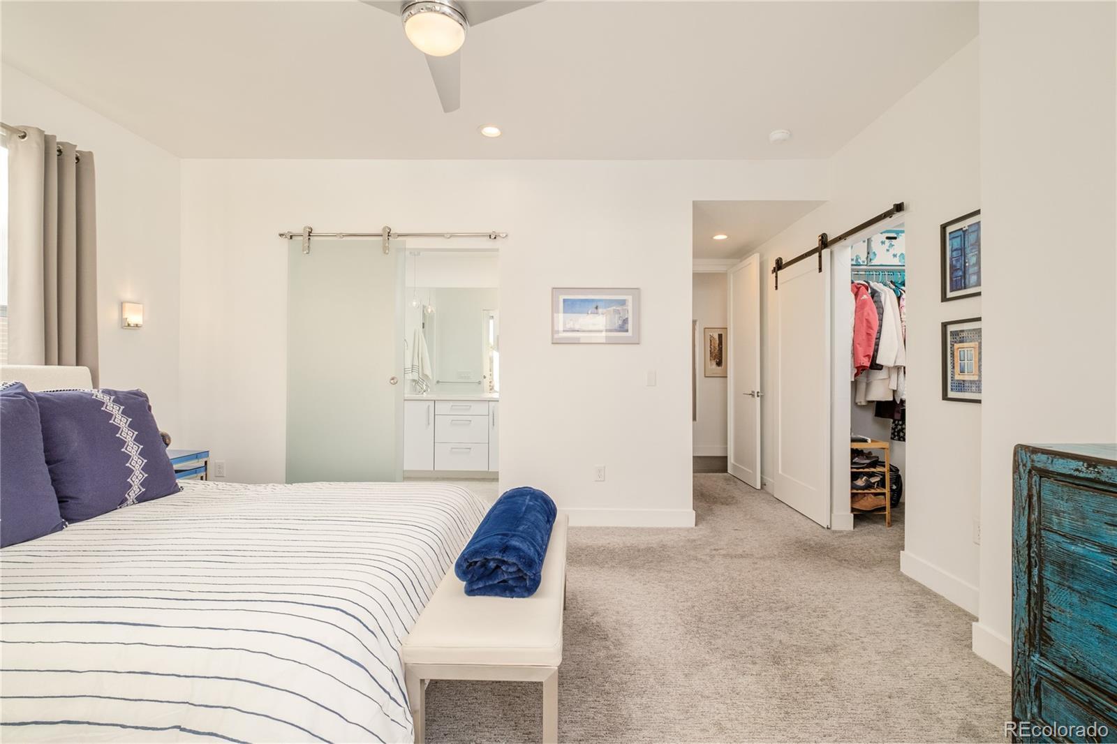 This immaculate end unit tells a story of light, space, and sweeping mountain views. Four en-suite bedrooms, five baths, and a floor plan wider than most—designed for the way you actually live. The entry level welcomes you with a versatile bedroom or den featuring an electric fireplace, wet bar, walk-in closet, and direct access to a generous 10x15 patio. Upstairs, the main level unfolds into an open great room where the kitchen takes center stage: a 64" double-wide refrigerator, high-gloss cabinetry, quartz countertops, and a 36" Italian range that commands attention. Dining and living spaces flow effortlessly, accented by designer lighting and a statement fireplace. A sun-drenched ensuite bedroom—ideal as a home office—completes this level. The top residential floor is home to the primary suite, a private sanctuary with balcony, walk-in closet with custom built-ins, and a spa-inspired bath finished in marble tile. A guest suite and laundry round out the level. Throughout, you'll find hardwood floors and Level 4 hand-trowel wall finishes—details that elevate the everyday. Crowning it all, a rooftop deck offers sweeping mountain views and space to entertain or simply breathe, prepped for a hot tub and built for Colorado living. An attached two-car garage with epoxy flooring and storage cabinets completes the home. In close proximity to City Park, City Park Golf Course, Denver Zoo and RINO with fabulous local amenities, this is modern Denver at its finest. The home is awesome as a primary residence and is an easy lock-and-leave option for those who travel on a regular basis. Buyer to verify square footage and schools. Furniture is negotiable.