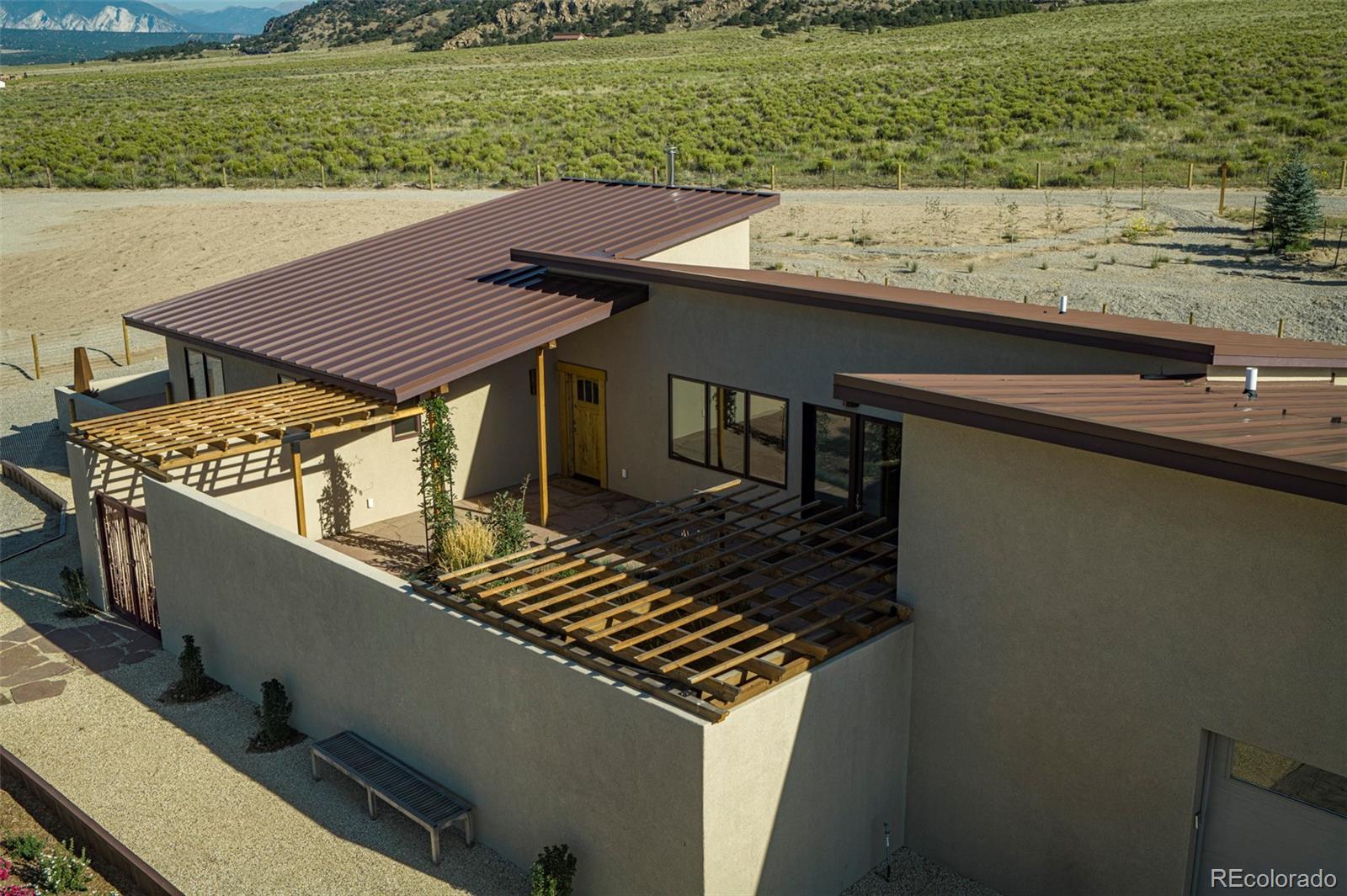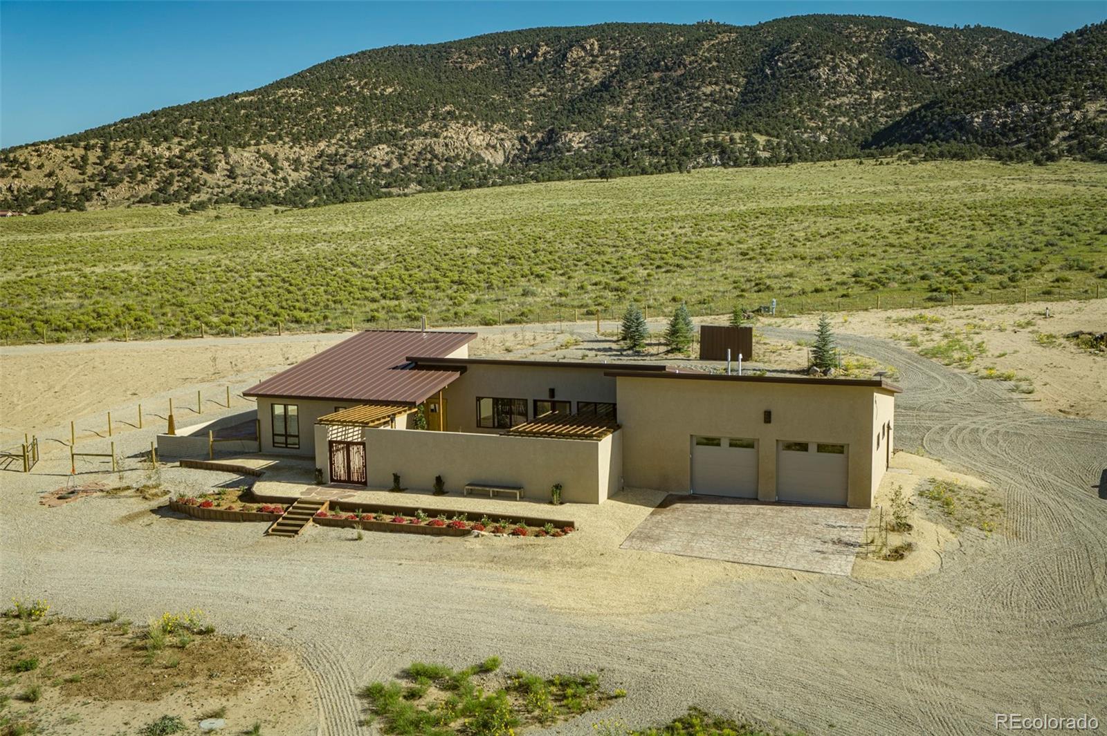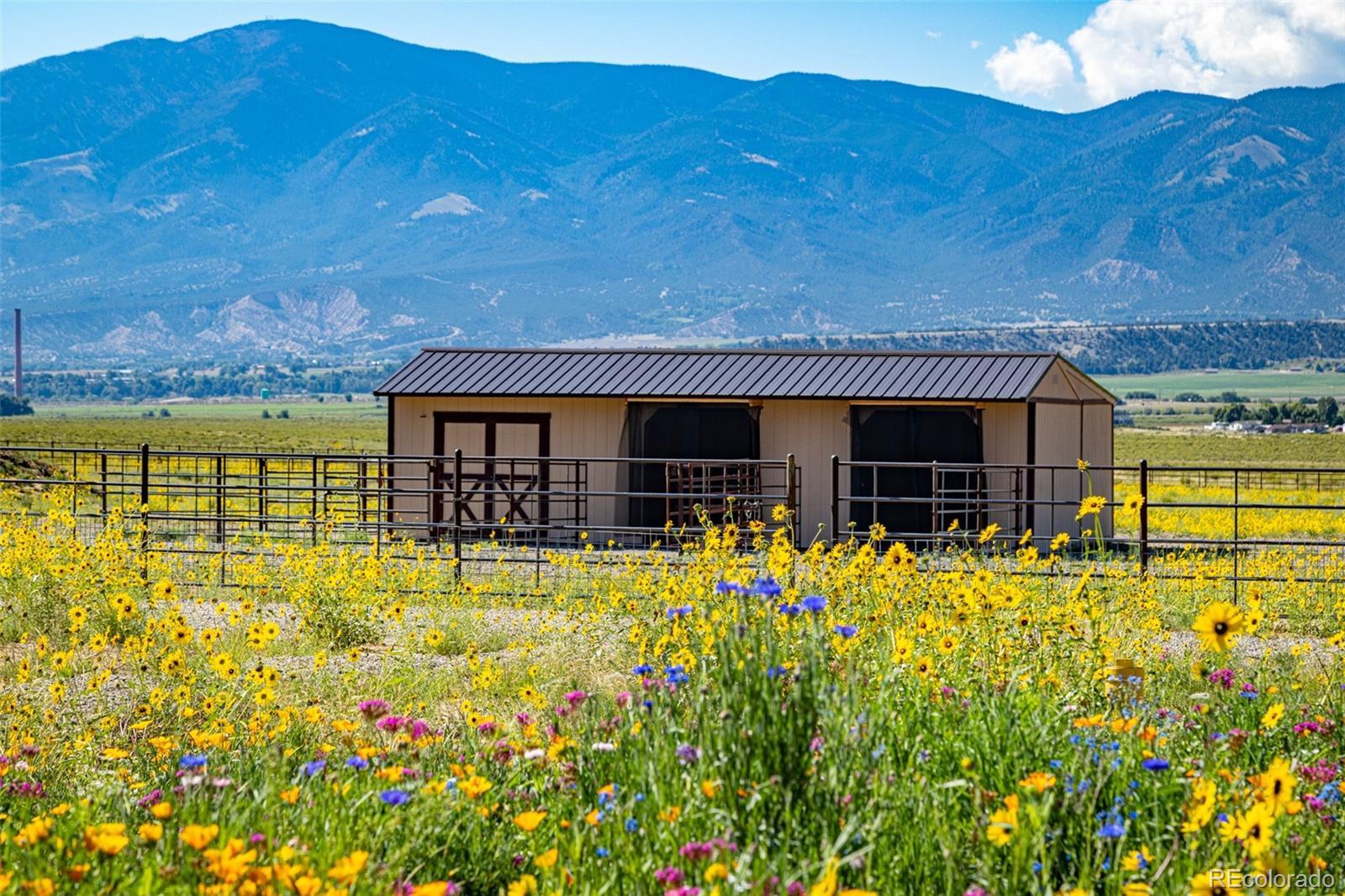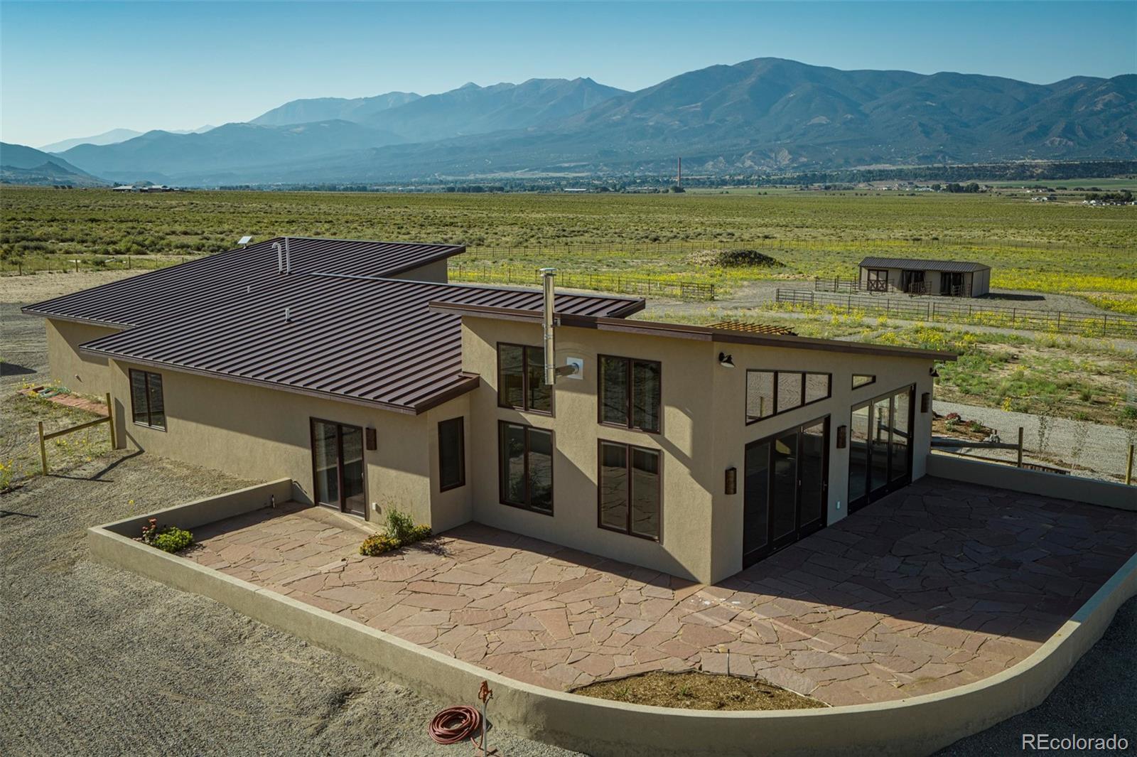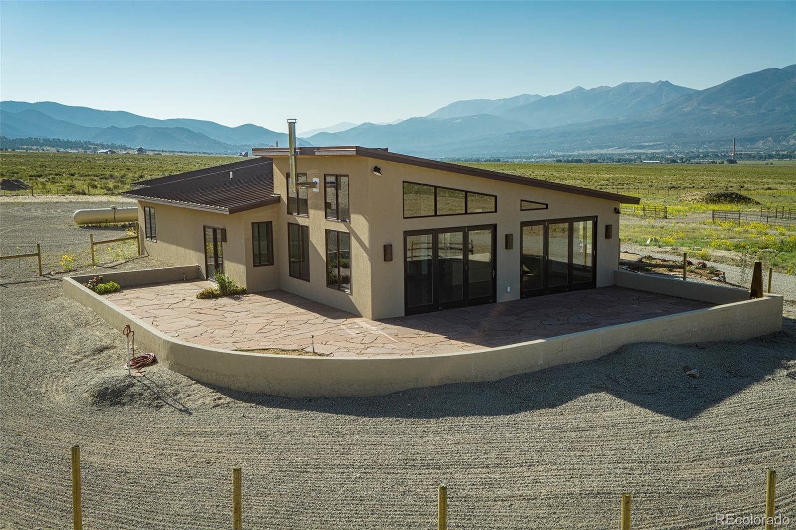 This modern, open-concept home, built in 2019, spans 1,748sf, featuring 2 bedrooms, 2 bathrooms, a modern kitchen with a clean and functional design and a large island, an oversized 2 car garage, a laundry room with a utility sink, and amazing outdoor spaces. Large windows and tri-fold glass patio doors open to panoramic views of the surrounding mountains and create an amazing indoor/outdoor experience when opened, effectively bringing the outdoors in. Polished concrete floors provide a clean, modern touch. A freestanding pellet stove adds to the comfortable feel of the home and supplements the in-floor radiant heat. Outside living space includes a large wraparound patio to enjoy the open space and mountain views and an enclosed south-side patio with pergolas providing shade and privacy. The 40 acre property is livestock ready with a two stall loafing shed with large tack room and hay storage, hydrant and automatic waterer, turnout stalls, a large 300ft x 500ft paddock, and an out-door arena (approximately 100ft x 263 ft), all constructed of steel posts and piping. A domestic well allows for watering livestock and up to an acre of lawn and garden. Bordered on two sides by BLM land the location offers plenty of open space, quiet, star-filled night skies, and direct access to public land for endless hiking, biking, or horseback riding. Downtown Salida, Colorado's largest National Historic District, is less than 6 miles away for shopping, dining, medical services, and other amenities. Arkansas River access is five miles from the property and Monarch Mountain Ski Area is only 26 miles away. There are minor covenants/deed restrictions but there is no home owner's association of dues associated with the property.