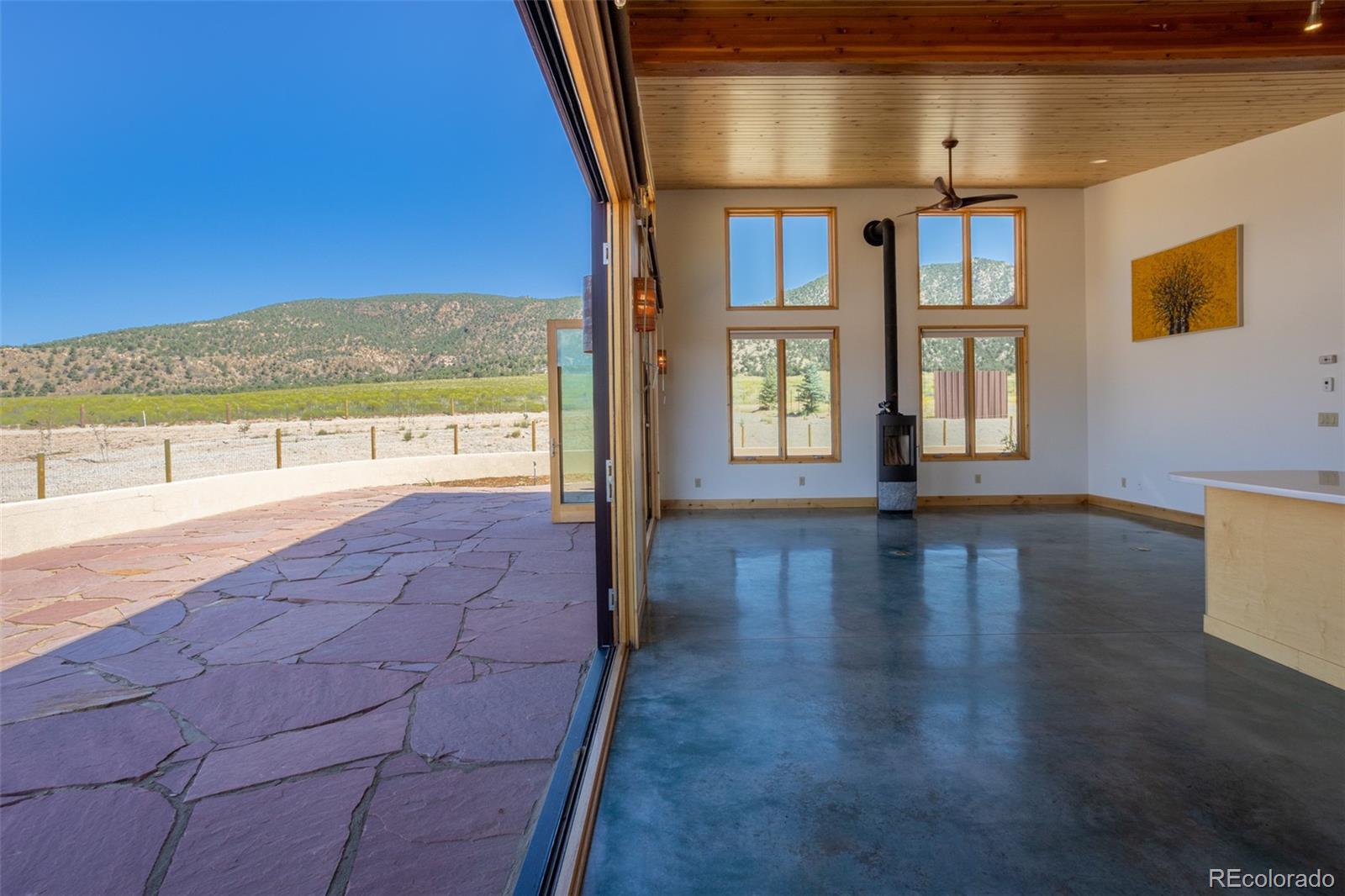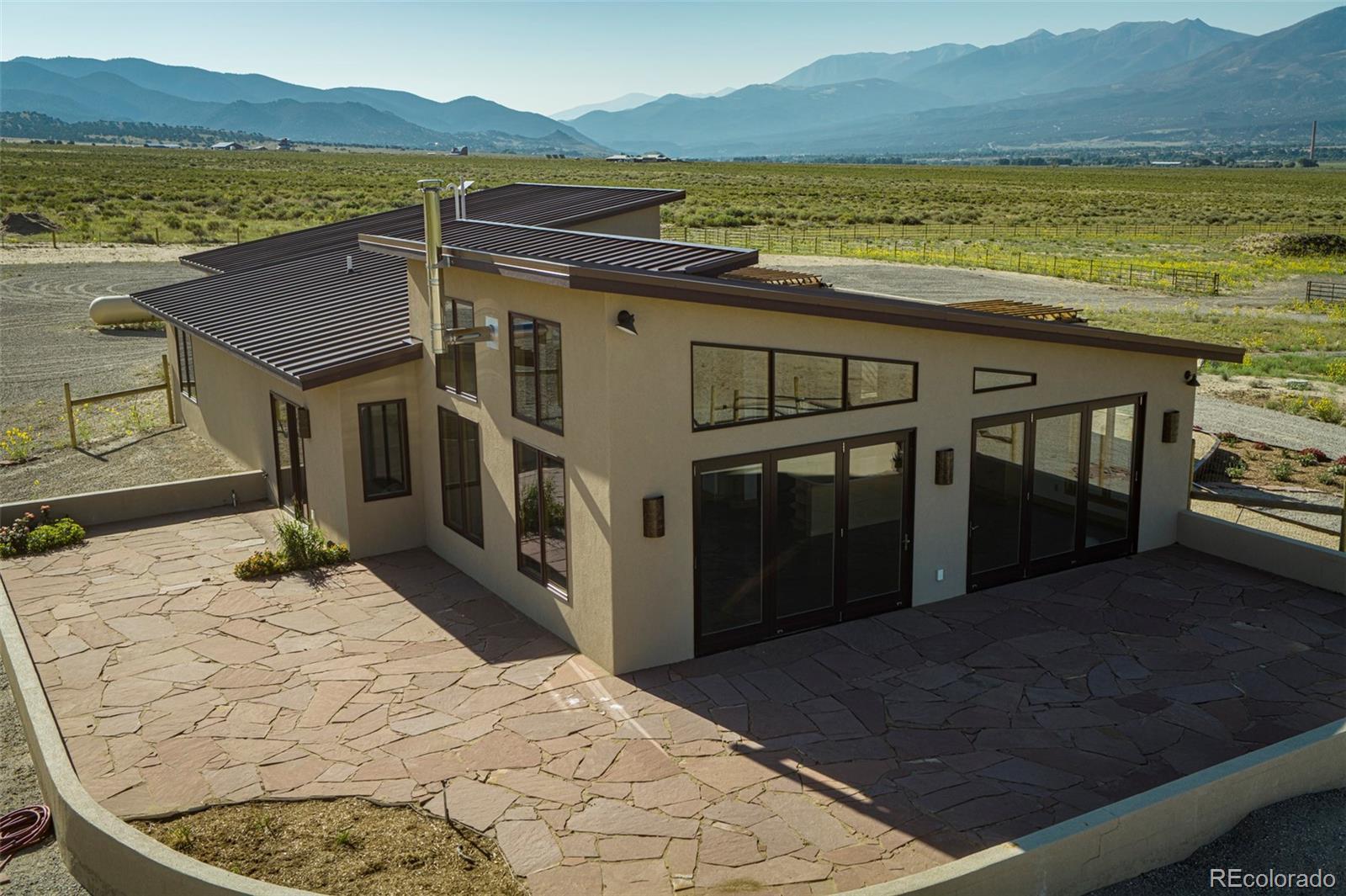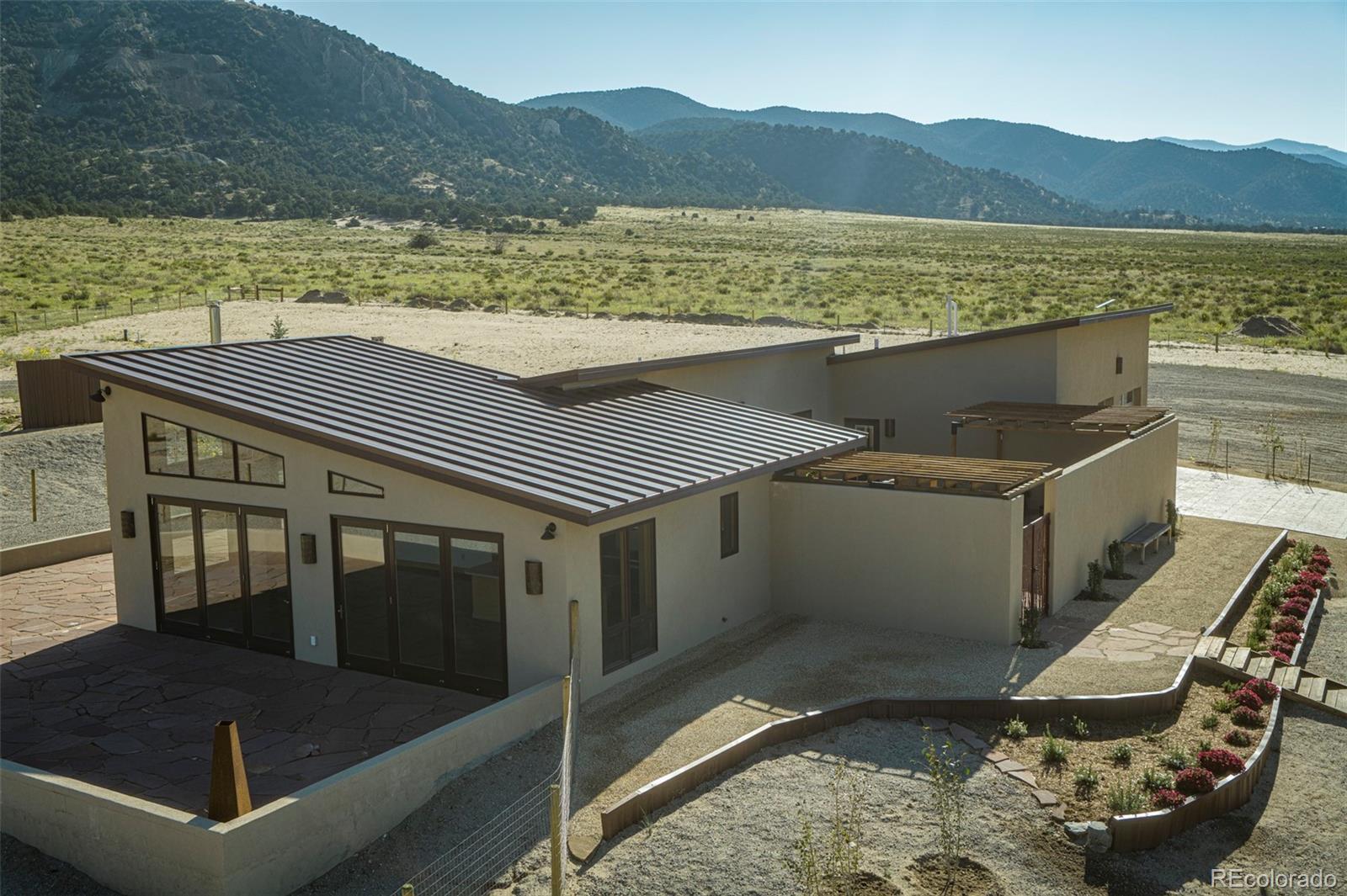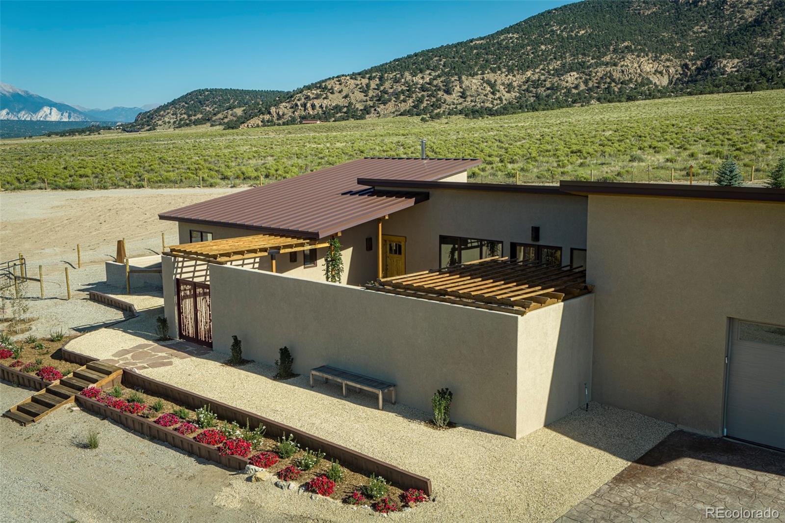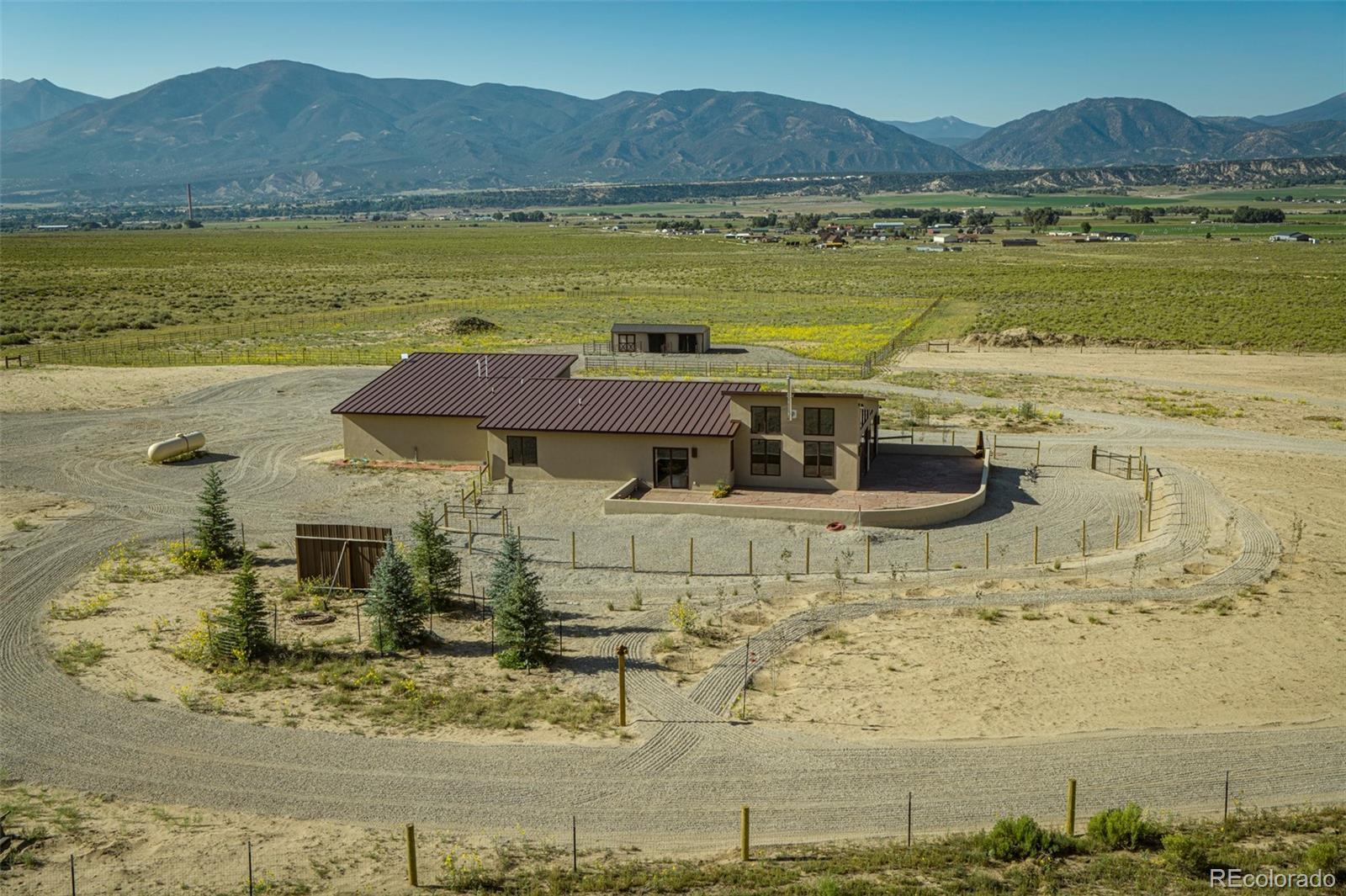 This modern, open-concept home, built in 2019, spans 1,748sf, featuring 2 bedrooms, 2 bathrooms, a modern kitchen with a clean and functional design and a large island, an oversized 2 car garage, a laundry room with a utility sink, and amazing outdoor spaces. Large windows and tri-fold glass patio doors open to panoramic views of the surrounding mountains and create an amazing indoor/outdoor experience when opened, effectively bringing the outdoors in. Polished concrete floors provide a clean, modern touch. A freestanding pellet stove adds to the comfortable feel of the home and supplements the in-floor radiant heat. Outside living space includes a large wraparound patio to enjoy the open space and mountain views and an enclosed south-side patio with pergolas providing shade and privacy. The 40 acre property is livestock ready with a two stall loafing shed with large tack room and hay storage, hydrant and automatic waterer, turnout stalls, a large 300ft x 500ft paddock, and an out-door arena (approximately 100ft x 263 ft), all constructed of steel posts and piping. A domestic well allows for watering livestock and up to an acre of lawn and garden. Bordered on two sides by BLM land the location offers plenty of open space, quiet, star-filled night skies, and direct access to public land for endless hiking, biking, or horseback riding. Downtown Salida, Colorado's largest National Historic District, is less than 6 miles away for shopping, dining, medical services, and other amenities. Arkansas River access is five miles from the property and Monarch Mountain Ski Area is only 26 miles away. There are minor covenants/deed restrictions but there is no home owner's association of dues associated with the property.