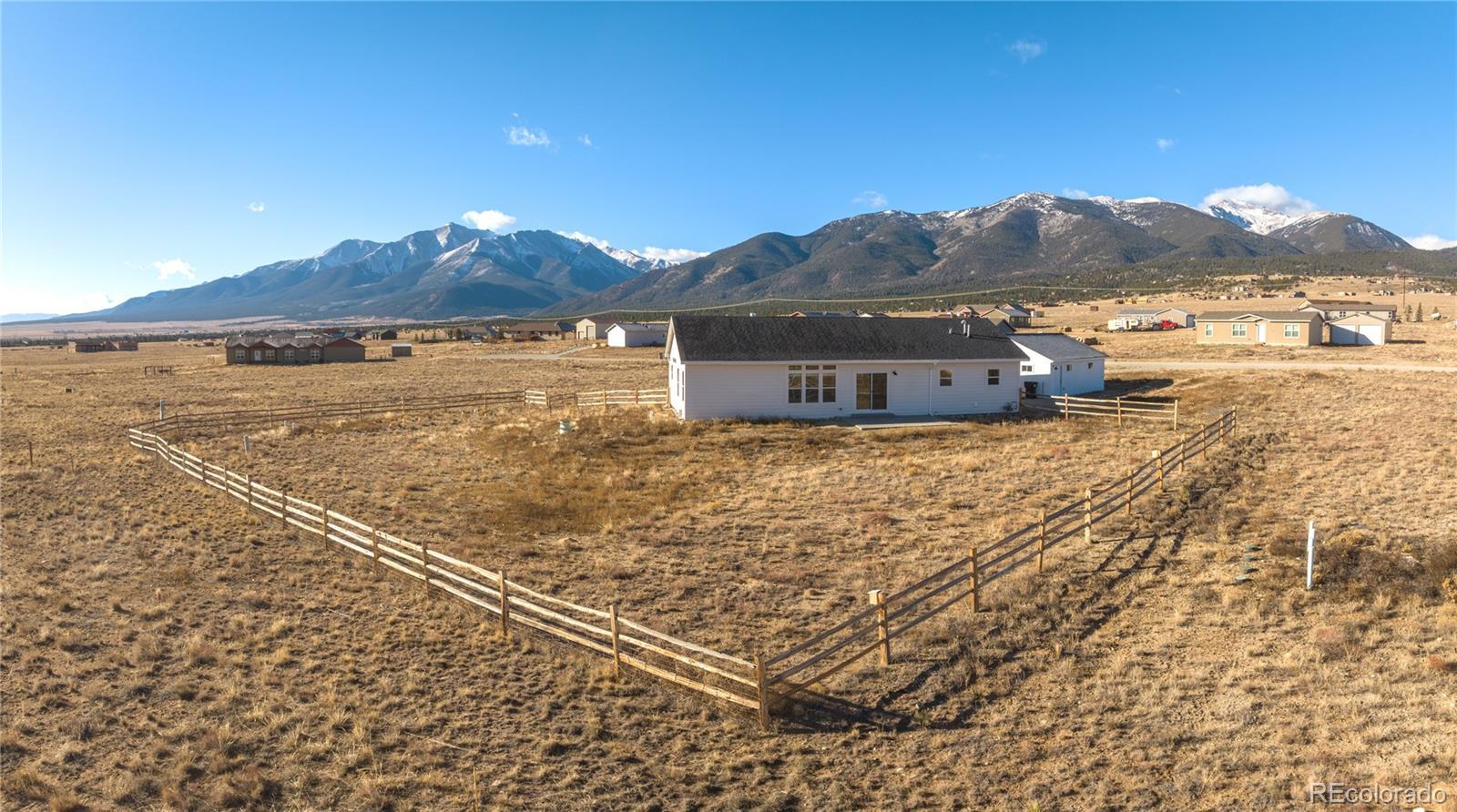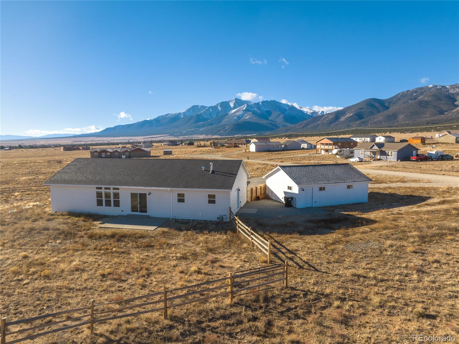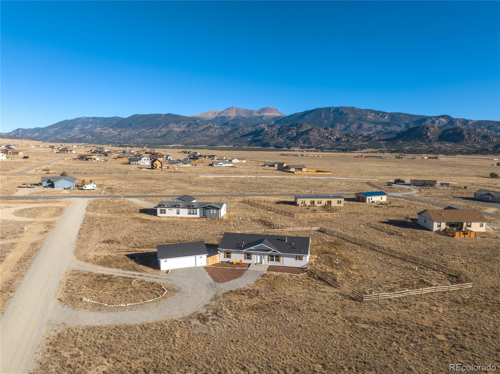 Experience bright, low-maintenance mountain living in this 2021-built, move-in-ready home—a standout value for newer construction in Buena Vista. Offering 3 bedrooms, 2 full baths, and 1,830 square feet, this thoughtfully designed home captures sweeping 360° mountain views with a sun-filled, south-facing orientation that brings in natural light all day long. The living room is a welcoming focal point with tall ceilings, a gas log fireplace framed by built-in shelving, and unobstructed Mount Princeton views. A desirable split-bedroom floor plan provides privacy, with the primary suite set apart from the guest bedrooms. The spacious primary retreat features a walk-in closet and a 5-piece bath with double sinks, soaking tub, and separate shower. Designed for both everyday living and entertaining, the kitchen offers a large granite island with bar seating, ample cabinetry, stainless shelving, and a natural gas range with hood vent. An adjacent flex space easily functions as a dining area or home office. Durable LVP flooring flows through the main living areas, while generously sized bedrooms provide comfortable, carpeted spaces with ceiling fans. A sliding door opens to the back patio for easy indoor-outdoor living, and the oversized mudroom adds exceptional functionality with laundry, storage, and space to transition after outdoor adventures. Outside, enjoy low-maintenance zeroscaping, a gravel driveway, and a fully fenced backyard ideal for pets or play. A true bonus for mountain living, the oversized detached two-car garage includes electricity and newly installed windows—perfect for vehicles, gear storage, or workshop space. Located less than five miles from downtown Buena Vista and just minutes from trails, hot springs, and the Arkansas River, this turn-key, newer-build home offers modern systems, energy efficiency, and peace of mind—paired with exceptional views and lifestyle access at a compelling value.
