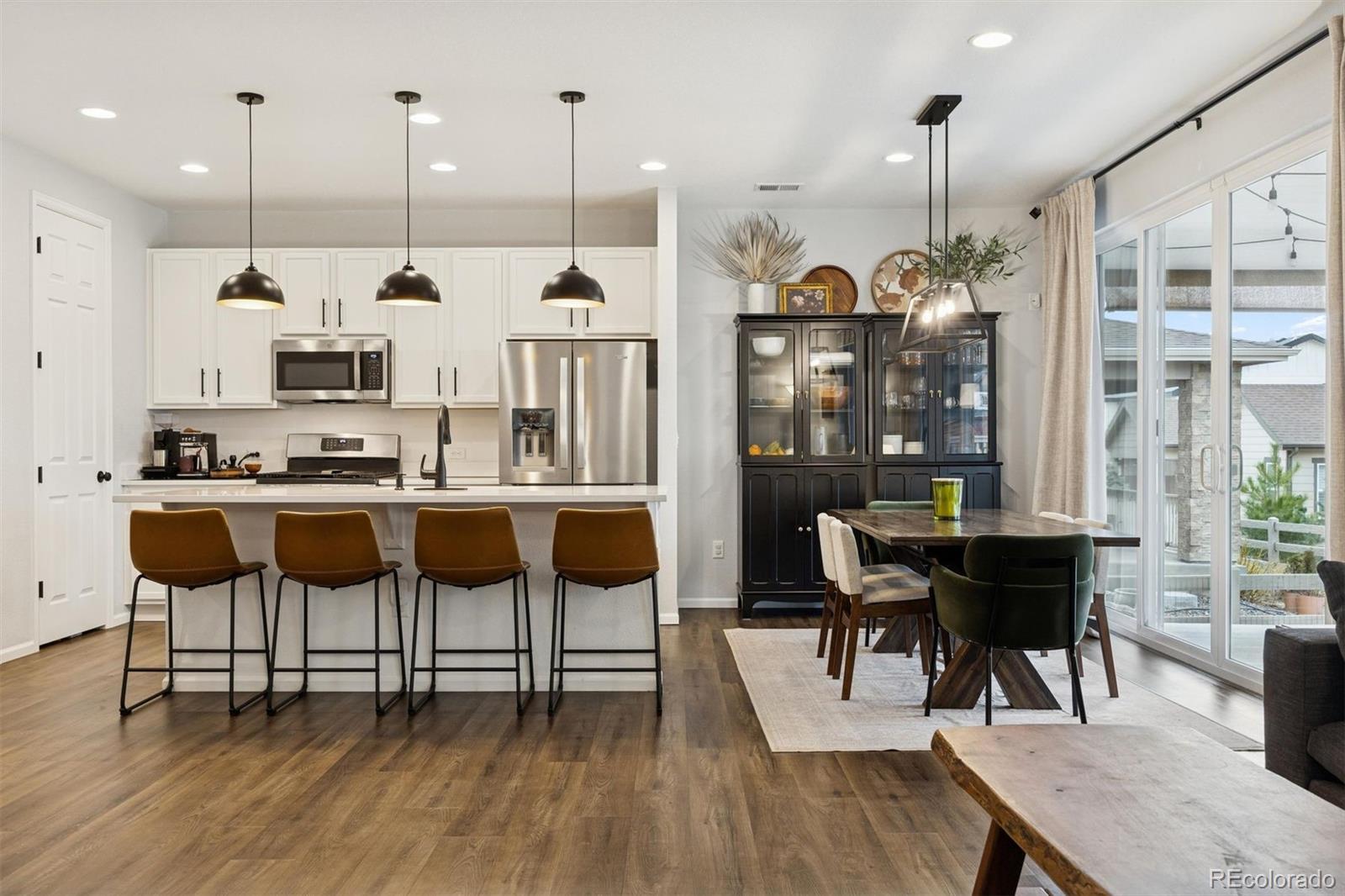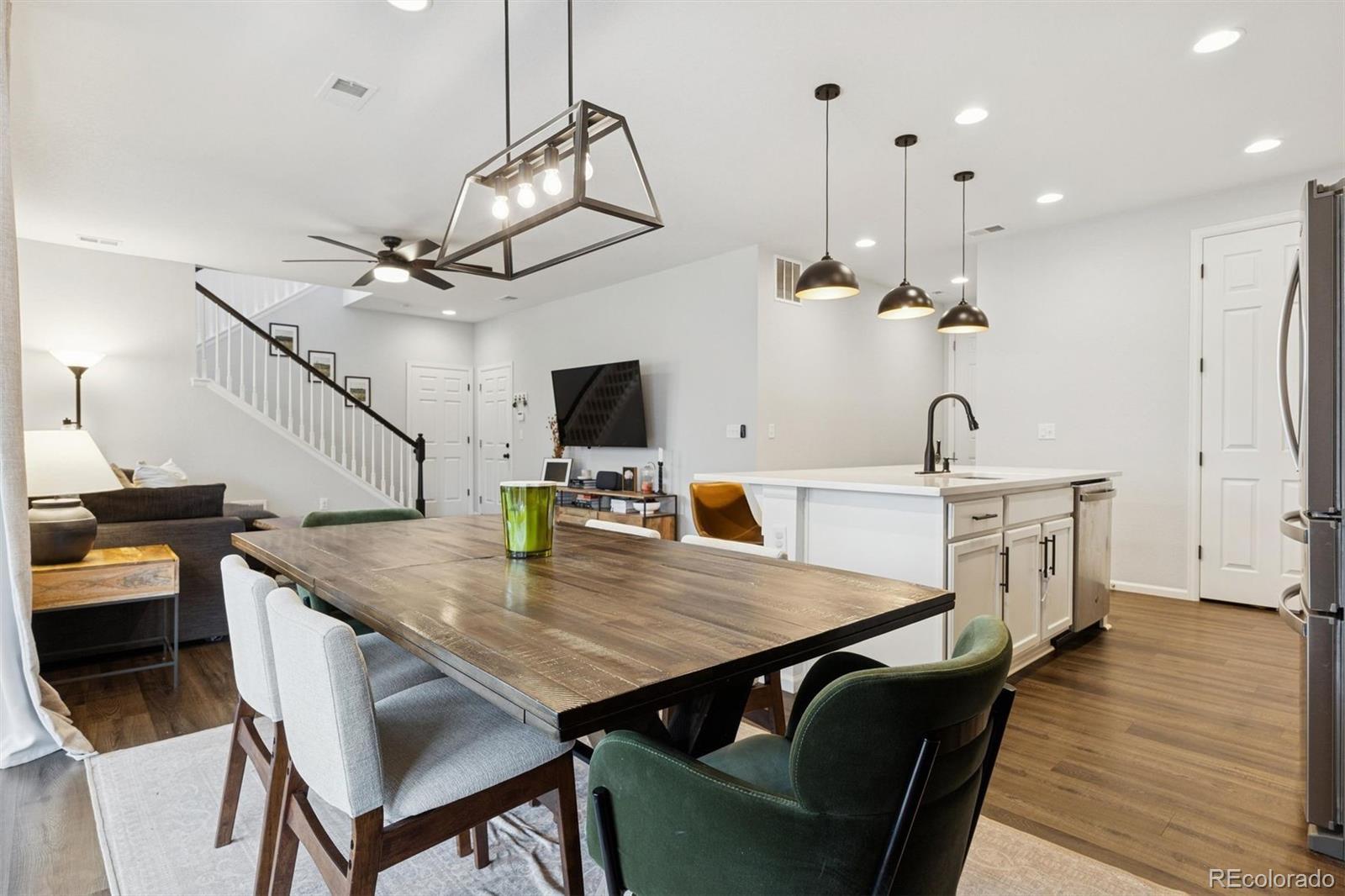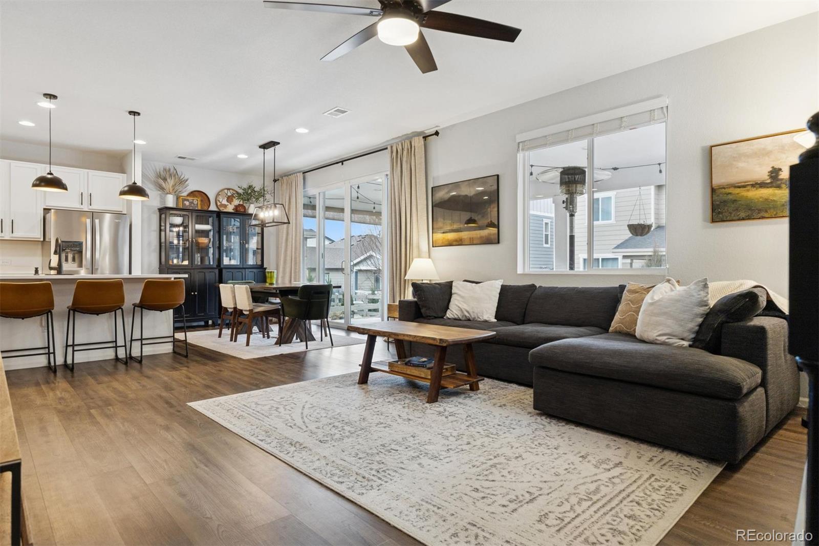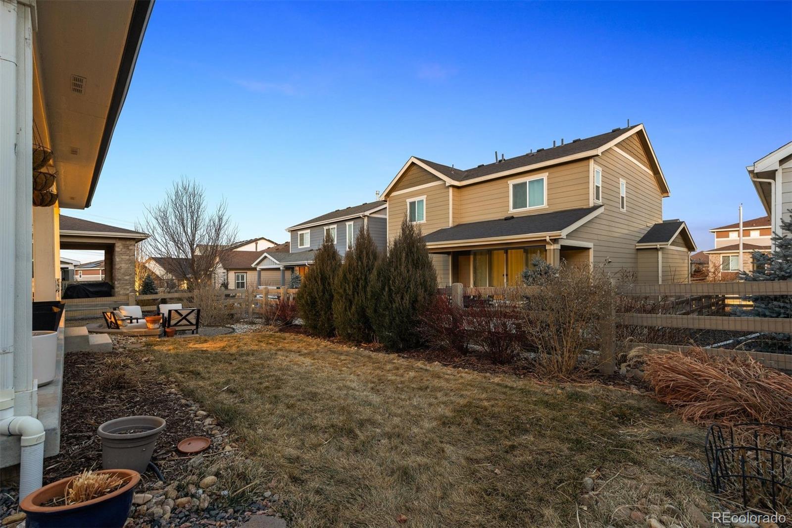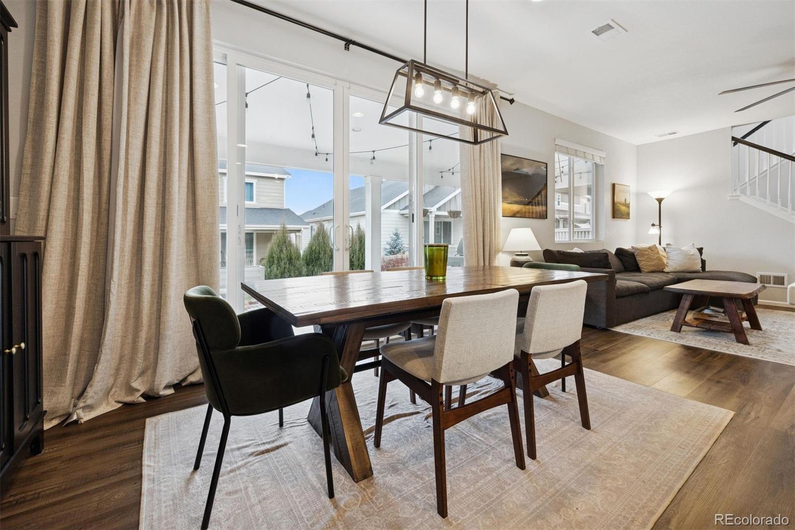 A Better-Than-New Residence in Sterling Ranch Welcome to this impeccably maintained two-story home, ideally positioned in the heart of Sterling Ranch—one of Littleton’s most coveted master-planned communities. Thoughtfully designed and beautifully executed, this residence offers 1,910 square feet of refined living space, featuring three bedrooms and three baths, where modern sophistication meets everyday ease. Striking curb appeal is complemented by manicured landscaping, front and rear sprinkler systems, and a fully fenced backyard—an inviting outdoor setting designed for both entertaining and quiet enjoyment. The covered back porch provides the perfect backdrop for Colorado evenings, enhanced by privacy shades that create a tranquil retreat. Inside, the open-concept main level is defined by durable laminate vinyl flooring, plush carpeting, updated lighting and ceiling fans, and custom window coverings throughout. A stylish powder room with a thoughtfully curated accent wall adds a subtle yet distinctive design statement. The gourmet kitchen serves as the centerpiece of the home, showcasing quartz countertops, stainless steel appliances, a generous center island, pantry, and a sun-filled breakfast nook accented by an elegant chandelier—ideal for both casual mornings and elevated gatherings. The upper level offers a versatile loft space, a well-appointed laundry room complete with washer and dryer, and a serene primary suite featuring a walk-in closet with custom shelving and a beautifully finished three-quarter bath with dual vanities. Two additional bedrooms and a full bath complete the upper level with comfort and flexibility. A two-car garage and an exceptional location near miles of trails, neighborhood parks, community amenities, and highly regarded schools complete this offering. Modern. Refined. Exceptionally maintained. This is Sterling Ranch living—elevated.