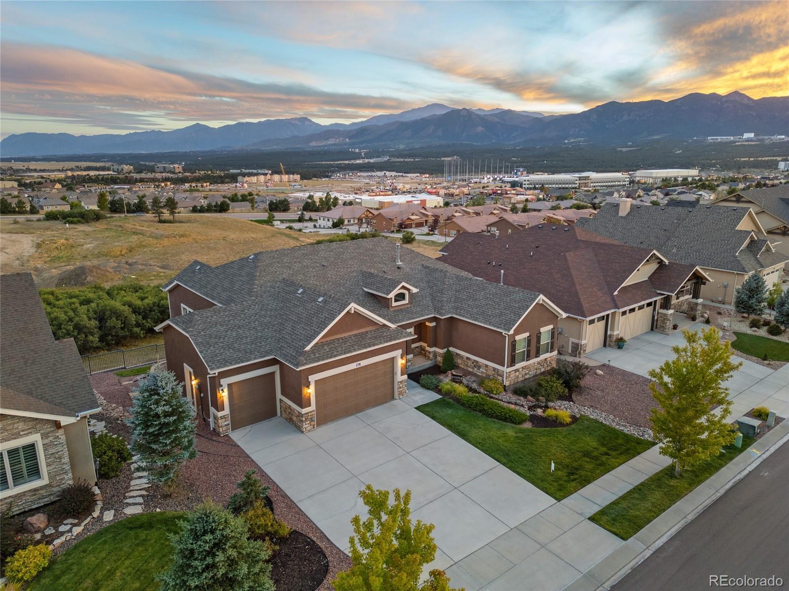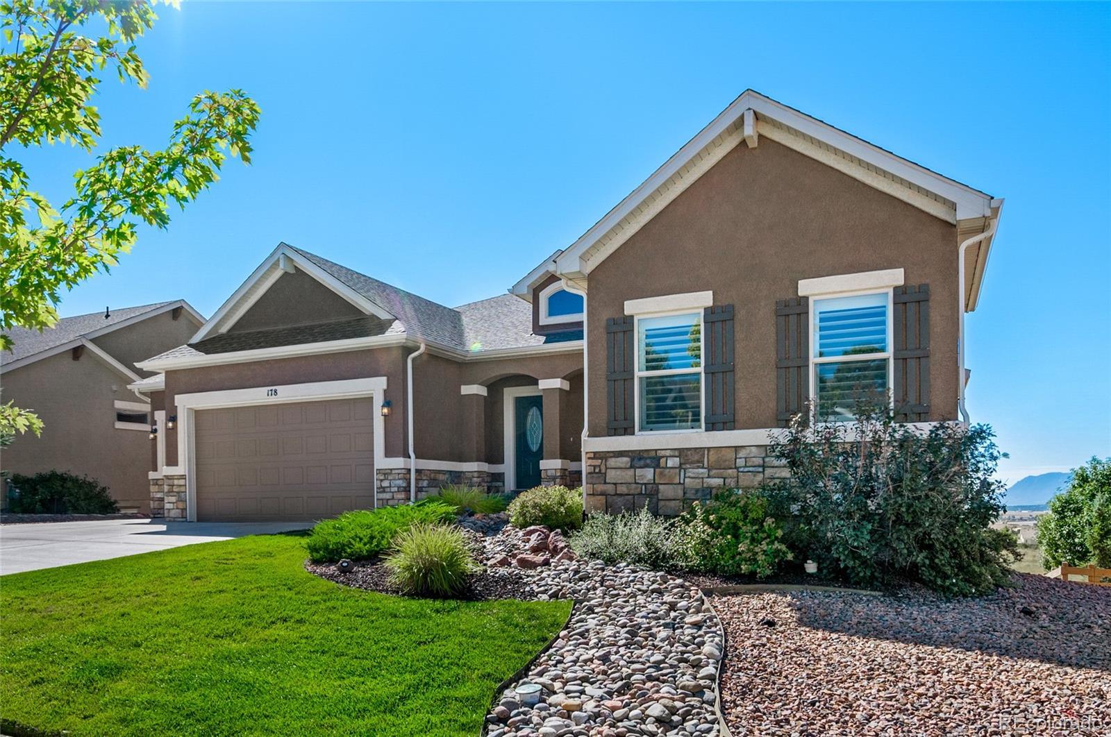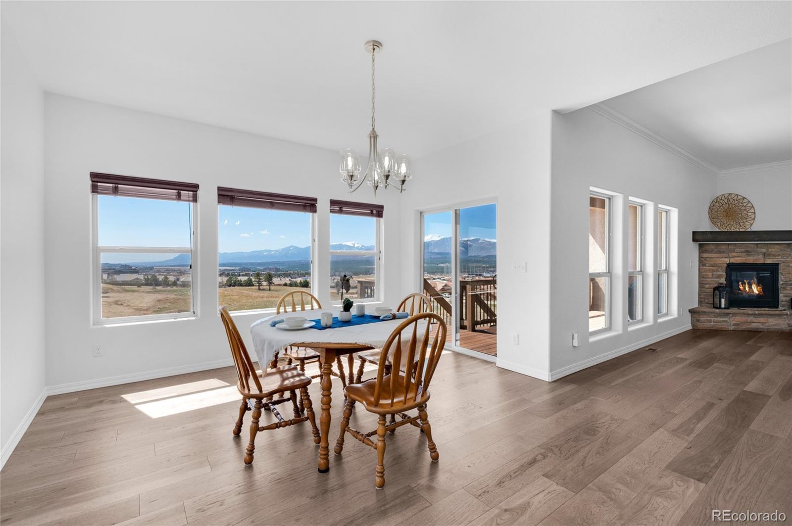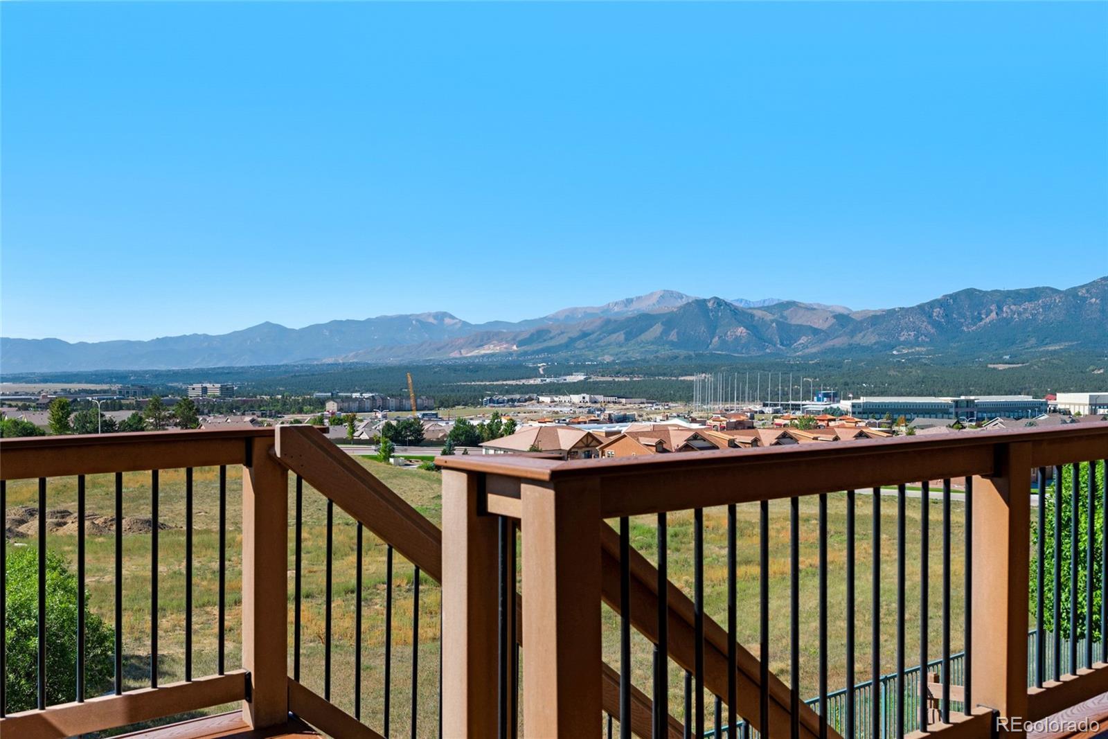 AMAZING VIEWS and PRICE! *Brand new flooring throughout most of main level- more than doubled hardwood square footage!* This striking stucco ranch in the desirable Northgate Estates community offers breathtaking, unobstructed views of Pikes Peak, the Air Force Academy, and the entire Front Range; from Cheyenne Mtn to Northgate. This prime location, near I-25, provides easy access to shopping, trendy new restaurants and go-to entertainment like Top Golf and Overdrive Raceway, and the new Polaris hotel. A soothing water feature in the front yard cordially invites you to the freshly painted entry door. Inside, beautiful new natural Pecan hardwood floors span most of the main level, which features high ceilings, a stone-accented gas fireplace, and desirable open floor plan. The gourmet kitchen boasts granite slab countertops, a spacious dining area, new gas 5 burner cooktop, double oven, large island with seating space, spacious pantry, built-in desk, and plenty of cabinetry. The luxurious master suite includes new hardwood floors, a five-piece bath, spacious walk-in closet with fresh new carpet, and more stunning views to enjoy! Two additional bedrooms and a full bath on the main level opposite the primary room for optimal privacy. The walkout basement, with 9ft ceilings, offers ample storage, a large rec room, two additional bedrooms with a Jack & Jill full bath, wet bar, powder room, and a pre-wired for media bonus flex room, ideal for any crafts/hobbies or use as a non-conforming 6th bedroom (plenty of space to add that closet!) The covered outdoor space includes a composite deck with metal railings, perfect for relaxing and enjoying the spectacular views. Additional features: plantation shutters, central A/C, a humidifier, an oversized three-car garage, and custom blinds. Other recent updates in summer 2024 include new paint throughout interior, including trim & doors, exterior front door, upgraded light fixtures & bath accessories. New water heater Sept 2025.