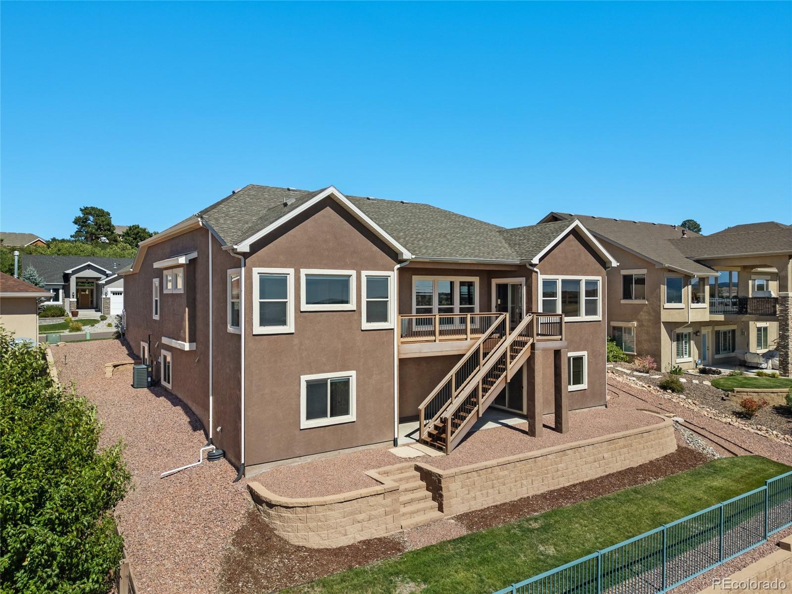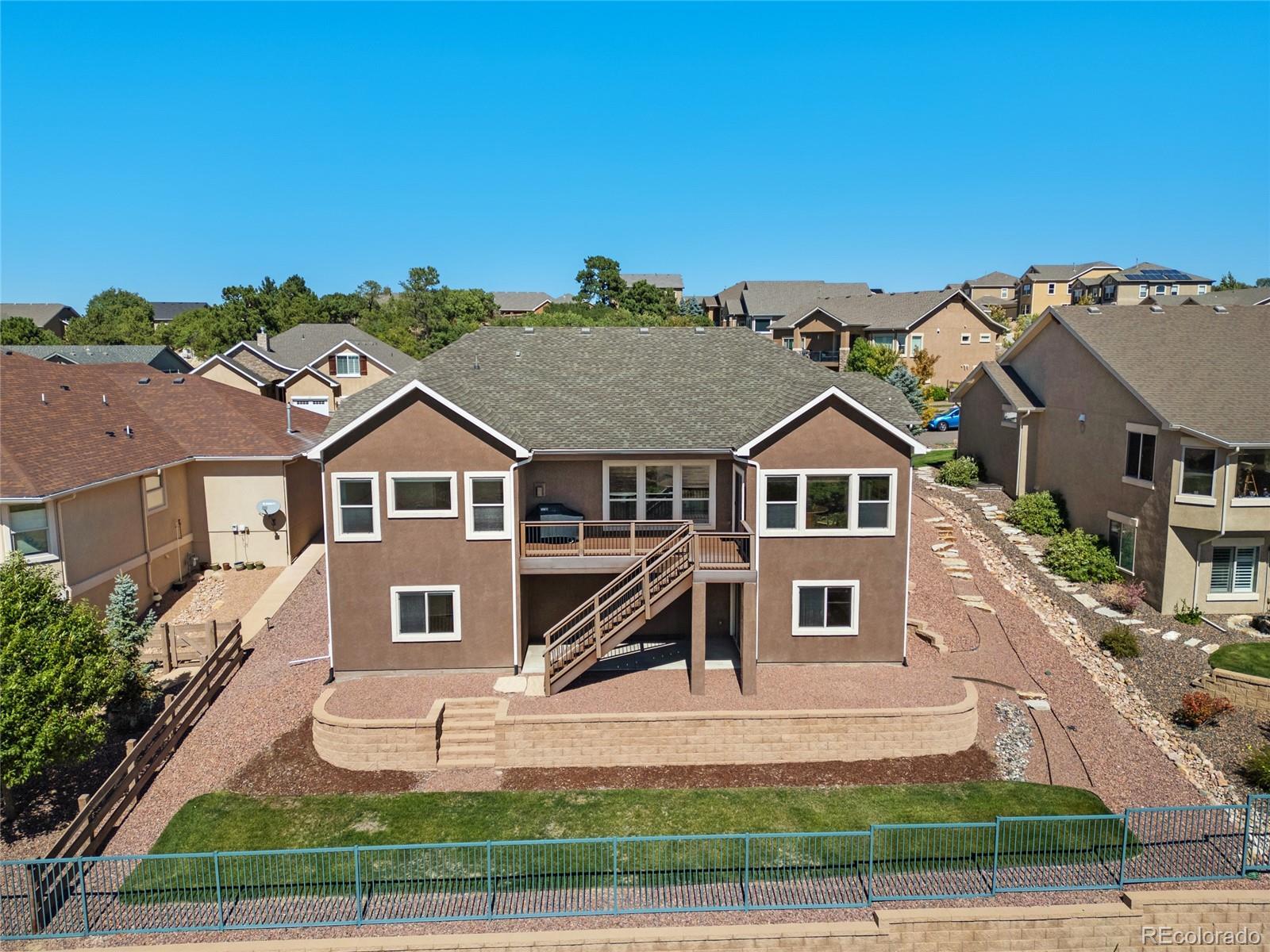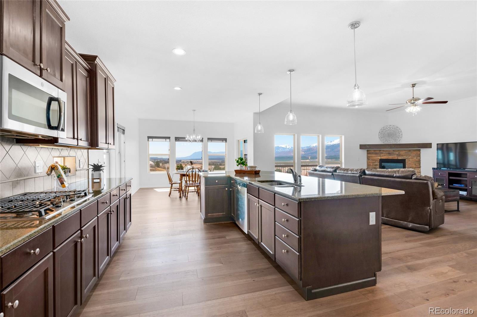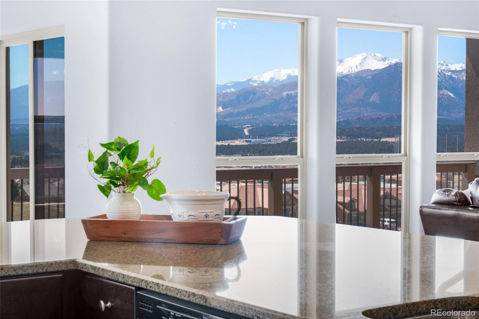 AMAZING VIEWS and PRICE! *Brand new flooring throughout most of main level- more than doubled hardwood square footage!* This striking stucco ranch in the desirable Northgate Estates community offers breathtaking, unobstructed views of Pikes Peak, the Air Force Academy, and the entire Front Range; from Cheyenne Mtn to Northgate. This prime location, near I-25, provides easy access to shopping, trendy new restaurants and go-to entertainment like Top Golf and Overdrive Raceway, and the new Polaris hotel. A soothing water feature in the front yard cordially invites you to the freshly painted entry door. Inside, beautiful new natural Pecan hardwood floors span most of the main level, which features high ceilings, a stone-accented gas fireplace, and desirable open floor plan. The gourmet kitchen boasts granite slab countertops, a spacious dining area, new gas 5 burner cooktop, double oven, large island with seating space, spacious pantry, built-in desk, and plenty of cabinetry. The luxurious master suite includes new hardwood floors, a five-piece bath, spacious walk-in closet with fresh new carpet, and more stunning views to enjoy! Two additional bedrooms and a full bath on the main level opposite the primary room for optimal privacy. The walkout basement, with 9ft ceilings, offers ample storage, a large rec room, two additional bedrooms with a Jack & Jill full bath, wet bar, powder room, and a pre-wired for media bonus flex room, ideal for any crafts/hobbies or use as a non-conforming 6th bedroom (plenty of space to add that closet!) The covered outdoor space includes a composite deck with metal railings, perfect for relaxing and enjoying the spectacular views. Additional features: plantation shutters, central A/C, a humidifier, an oversized three-car garage, and custom blinds. Other recent updates in summer 2024 include new paint throughout interior, including trim & doors, exterior front door, upgraded light fixtures & bath accessories. New water heater Sept 2025.
