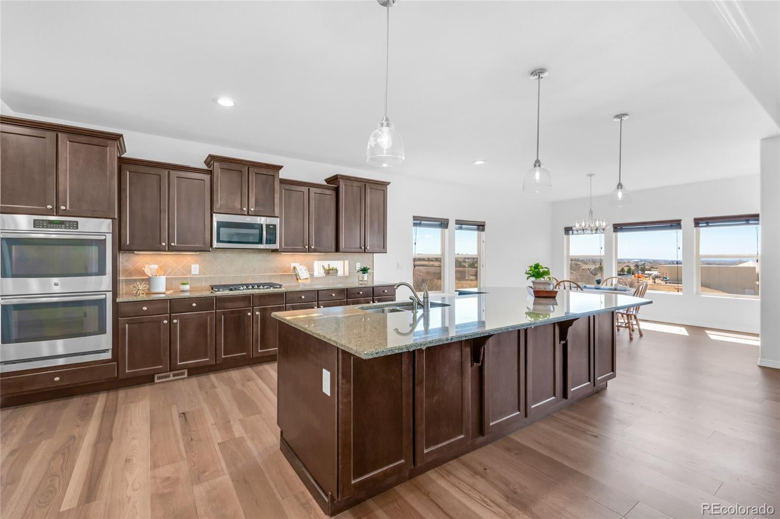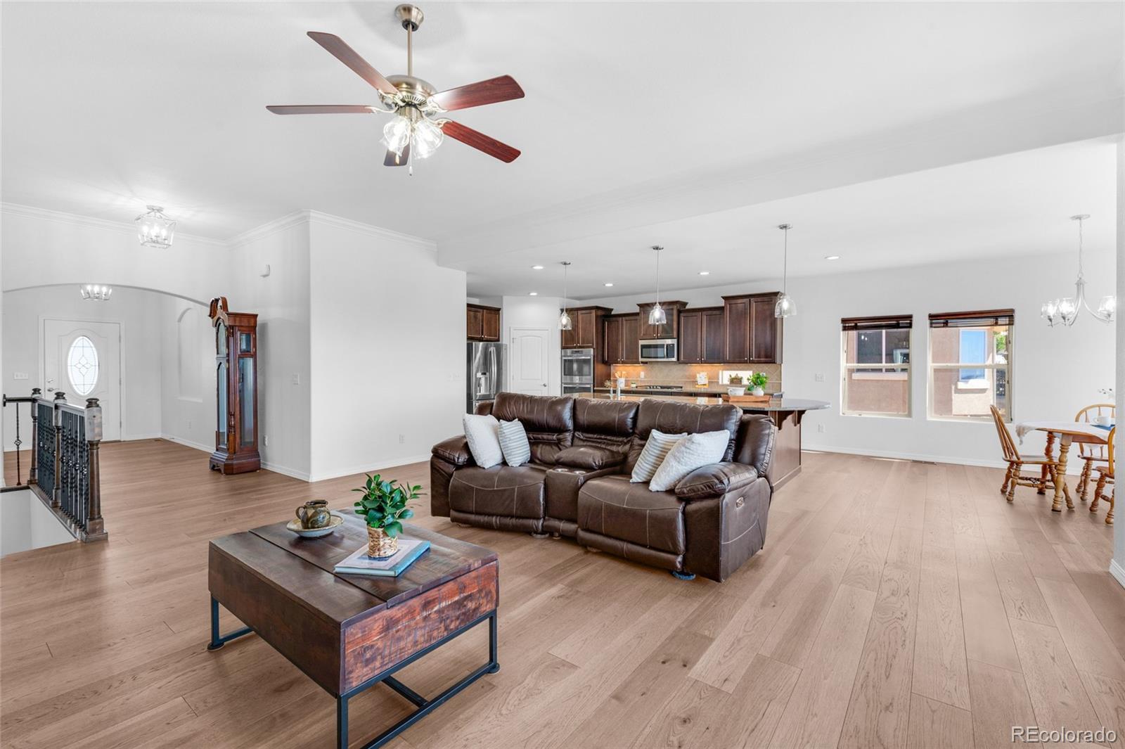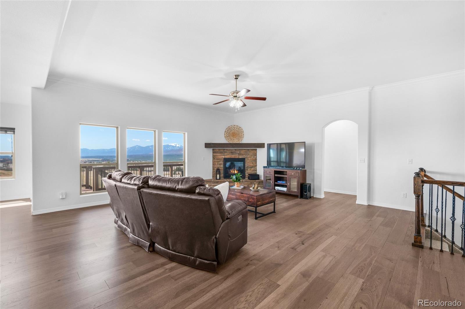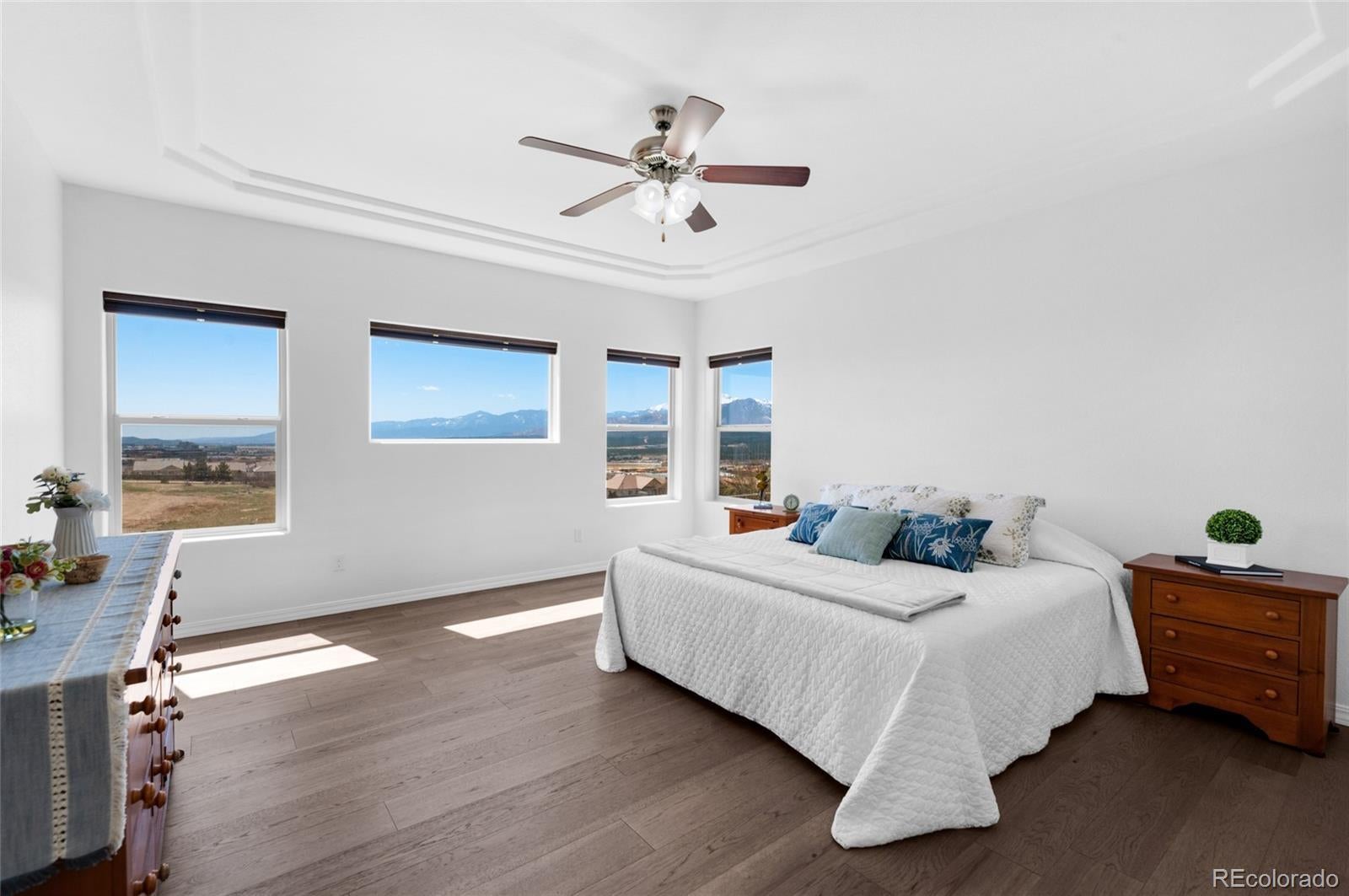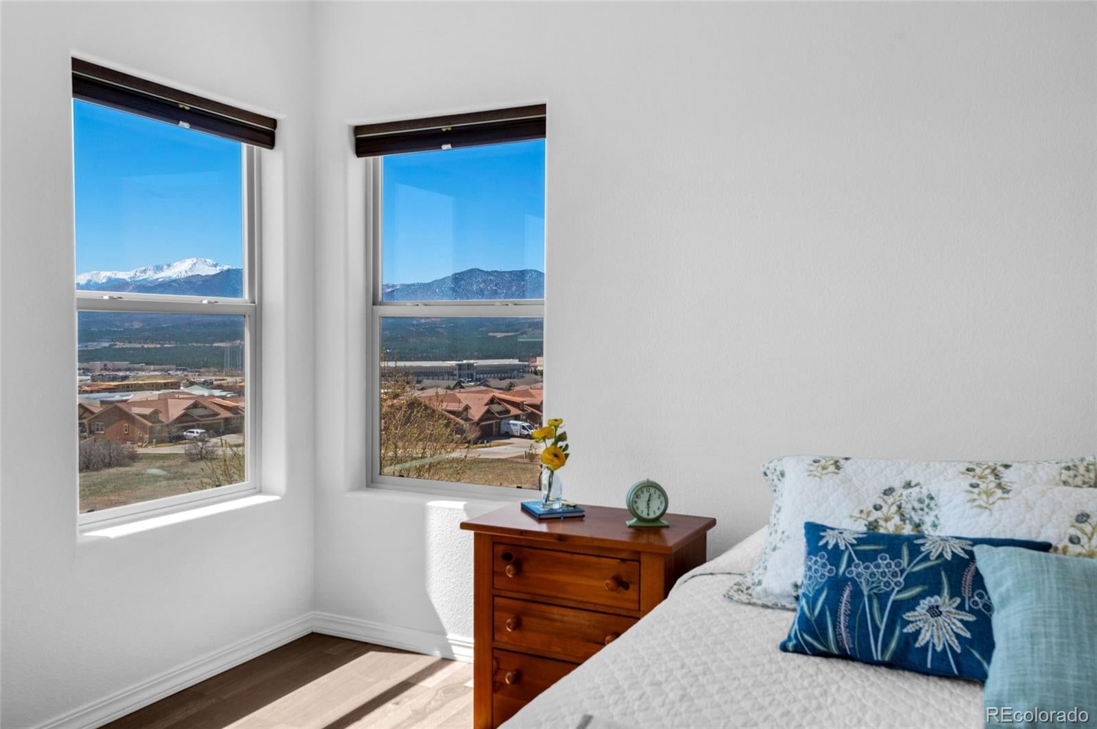 AMAZING VIEWS and PRICE! *Brand new flooring throughout most of main level- more than doubled hardwood square footage!* This striking stucco ranch in the desirable Northgate Estates community offers breathtaking, unobstructed views of Pikes Peak, the Air Force Academy, and the entire Front Range; from Cheyenne Mtn to Northgate. This prime location, near I-25, provides easy access to shopping, trendy new restaurants and go-to entertainment like Top Golf and Overdrive Raceway, and the new Polaris hotel. A soothing water feature in the front yard cordially invites you to the freshly painted entry door. Inside, beautiful new natural Pecan hardwood floors span most of the main level, which features high ceilings, a stone-accented gas fireplace, and desirable open floor plan. The gourmet kitchen boasts granite slab countertops, a spacious dining area, new gas 5 burner cooktop, double oven, large island with seating space, spacious pantry, built-in desk, and plenty of cabinetry. The luxurious master suite includes new hardwood floors, a five-piece bath, spacious walk-in closet with fresh new carpet, and more stunning views to enjoy! Two additional bedrooms and a full bath on the main level opposite the primary room for optimal privacy. The walkout basement, with 9ft ceilings, offers ample storage, a large rec room, two additional bedrooms with a Jack & Jill full bath, wet bar, powder room, and a pre-wired for media bonus flex room, ideal for any crafts/hobbies or use as a non-conforming 6th bedroom (plenty of space to add that closet!) The covered outdoor space includes a composite deck with metal railings, perfect for relaxing and enjoying the spectacular views. Additional features: plantation shutters, central A/C, a humidifier, an oversized three-car garage, and custom blinds. Other recent updates in summer 2024 include new paint throughout interior, including trim & doors, exterior front door, upgraded light fixtures & bath accessories. New water heater Sept 2025.
