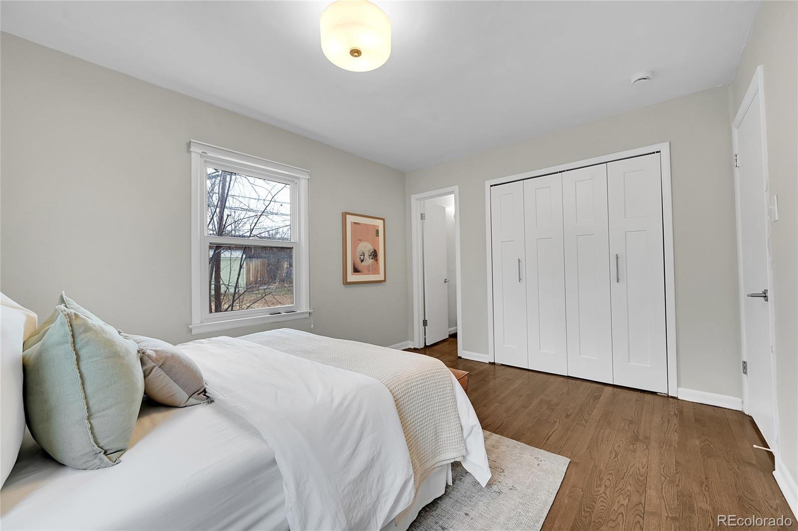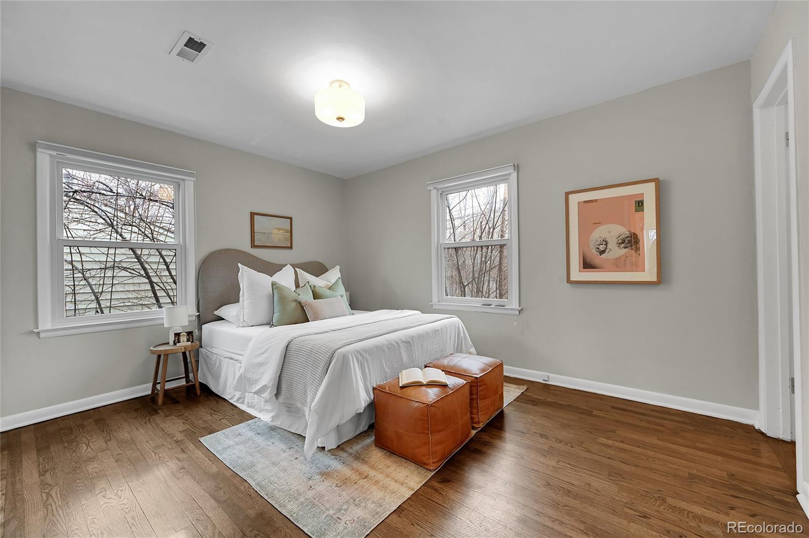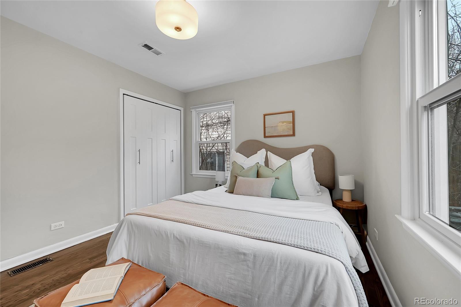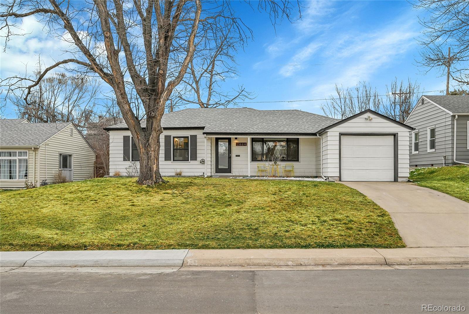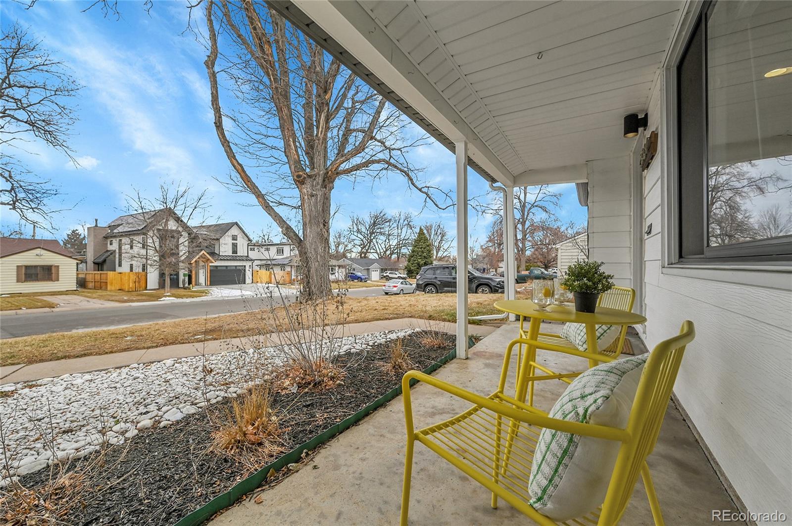 Welcome to this beautifully updated 2-bedroom, 2-bath home nestled in one of Denver’s most desirable neighborhoods. This west-facing property offers wonderful natural light and inviting curb appeal, highlighted by a covered front porch - perfect for enjoying Colorado sunsets. Step inside to a spacious, open living and kitchen area, enhanced by hardwood floors and a layout designed for both everyday living and entertaining. The updated kitchen is a standout, with a striking focal-point range hood, clean white appliances, and a thoughtfully arranged layout that’s as functional as it is stylish. The primary bedroom is a true retreat, featuring two closets with built-ins and a private ensuite bathroom complete with a large walk-in shower and double vanity. The second bedroom is highly versatile and can easily serve as a bedroom, office, workout room, or a combination of all three, making it ideal for modern living. Major updates include a newer roof (2021), central A/C with a new unit installed in 2021, and Andersen windows throughout. Additional highlights include a 1-car attached garage, a separate laundry room, and a large backyard ideal for entertaining, relaxing, or enjoying the outdoors. Surrounded by well-maintained homes in a highly sought-after location, this property offers the perfect blend of comfort, style, and Denver character.