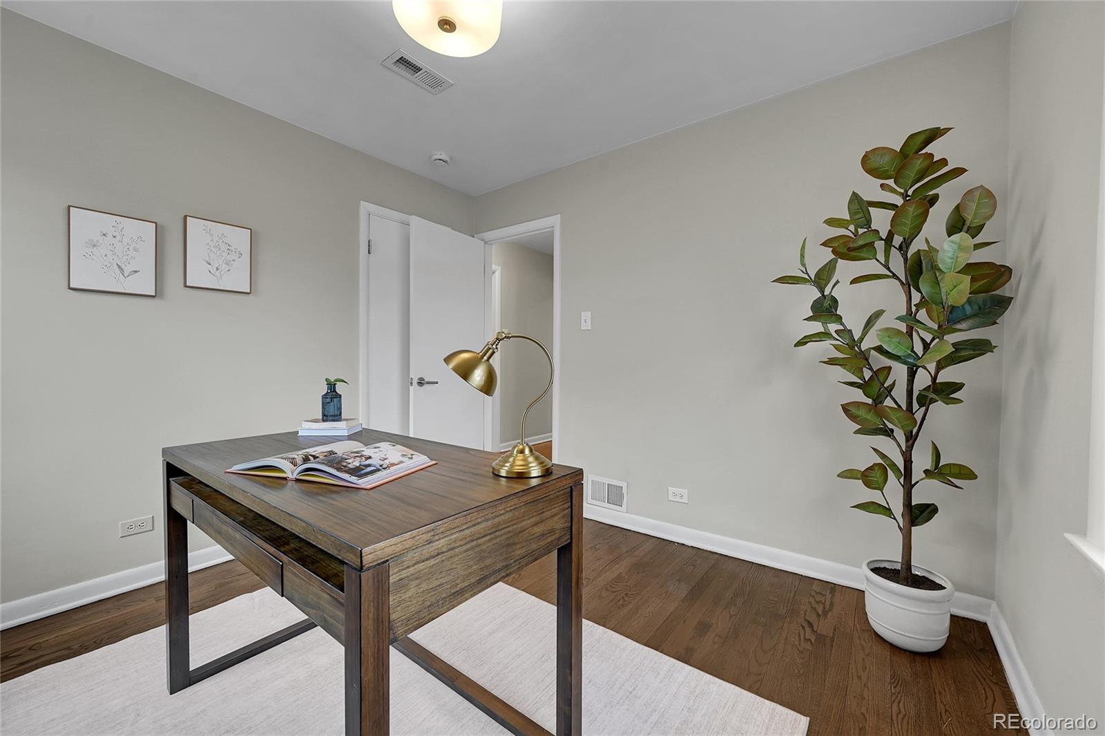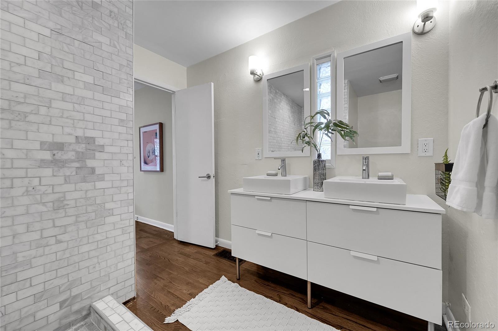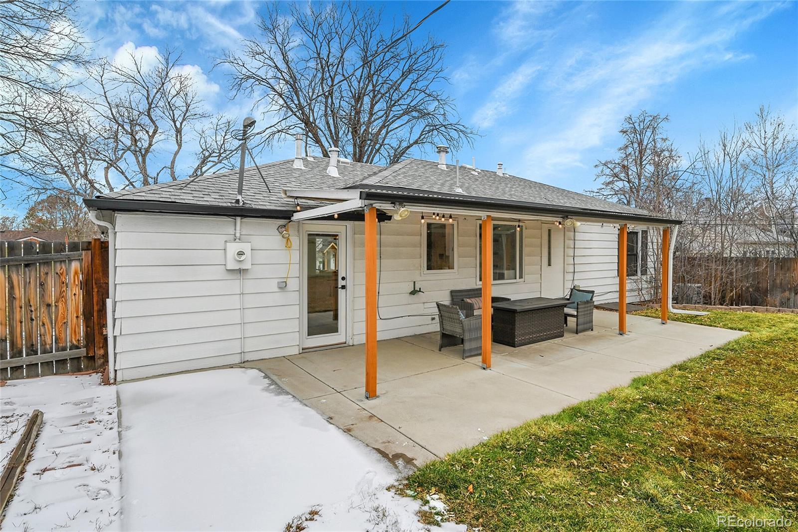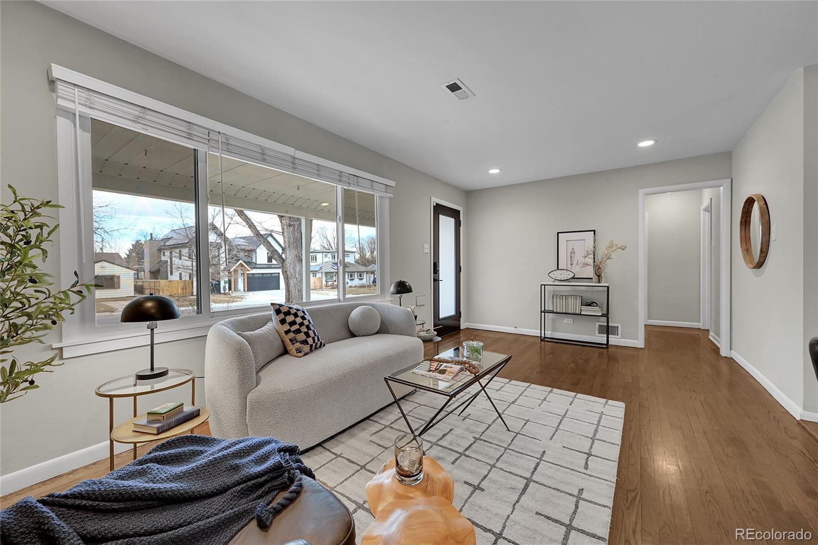 Welcome to this beautifully updated 2-bedroom, 2-bath home nestled in one of Denver’s most desirable neighborhoods. This west-facing property offers wonderful natural light and inviting curb appeal, highlighted by a covered front porch - perfect for enjoying Colorado sunsets. Step inside to a spacious, open living and kitchen area, enhanced by hardwood floors and a layout designed for both everyday living and entertaining. The updated kitchen is a standout, with a striking focal-point range hood, clean white appliances, and a thoughtfully arranged layout that’s as functional as it is stylish. The primary bedroom is a true retreat, featuring two closets with built-ins and a private ensuite bathroom complete with a large walk-in shower and double vanity. The second bedroom is highly versatile and can easily serve as a bedroom, office, workout room, or a combination of all three, making it ideal for modern living. Major updates include a newer roof (2021), central A/C with a new unit installed in 2021, and Andersen windows throughout. Additional highlights include a 1-car attached garage, a separate laundry room, and a large backyard ideal for entertaining, relaxing, or enjoying the outdoors. Surrounded by well-maintained homes in a highly sought-after location, this property offers the perfect blend of comfort, style, and Denver character.