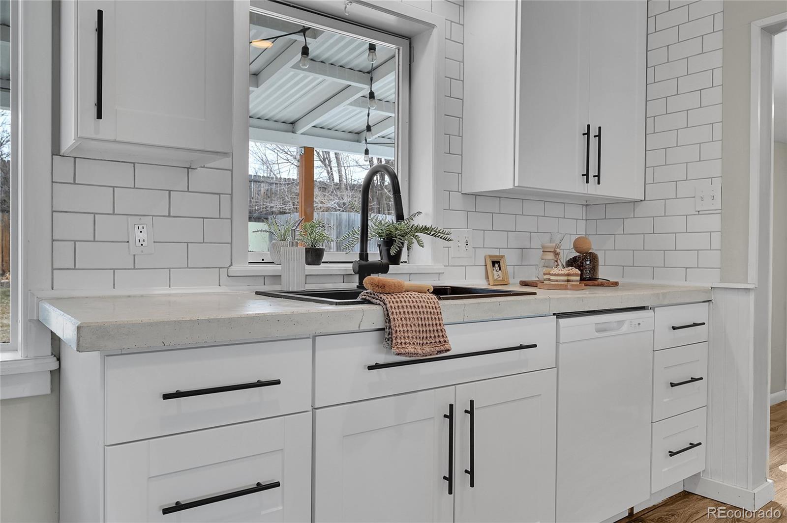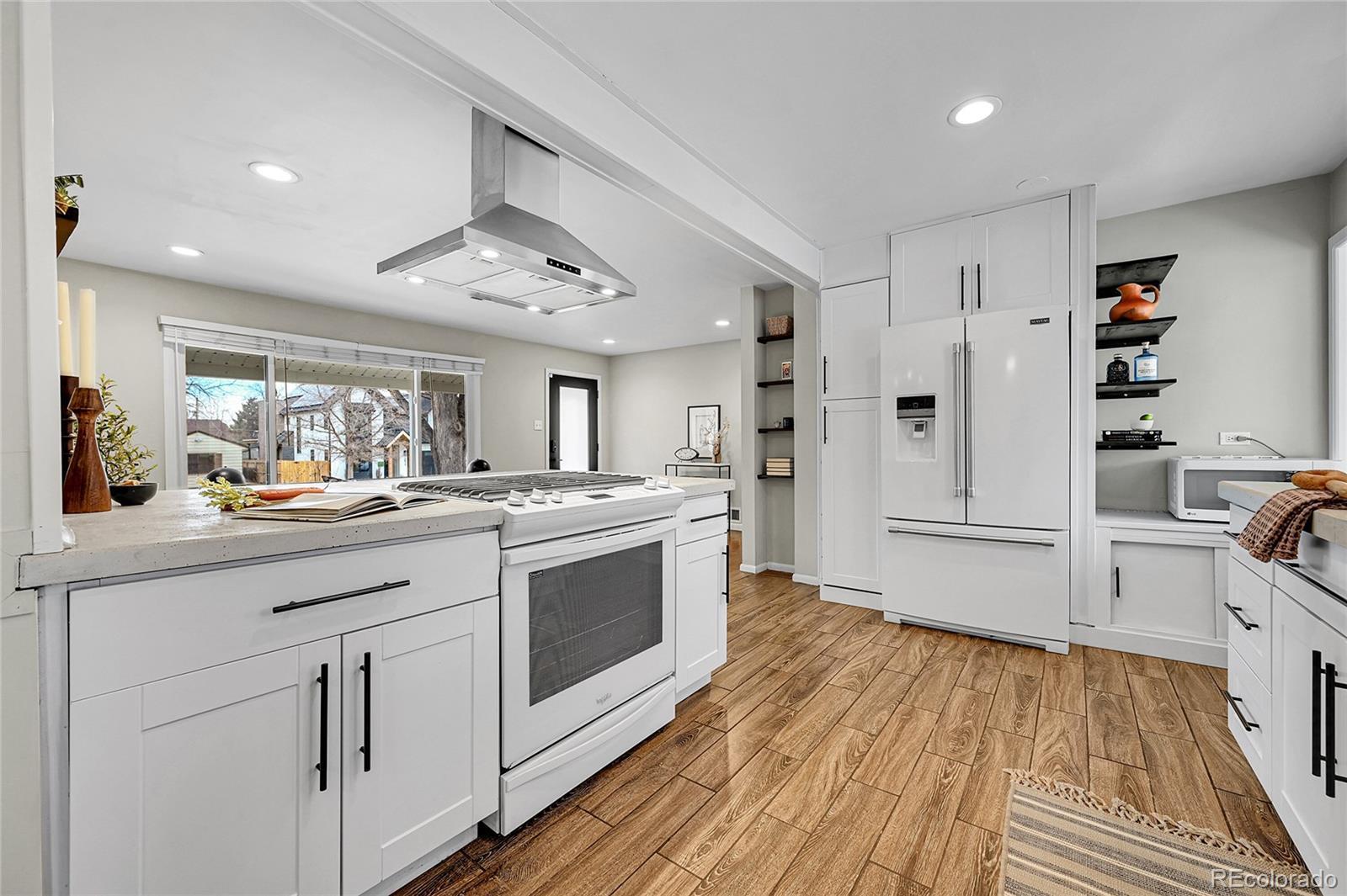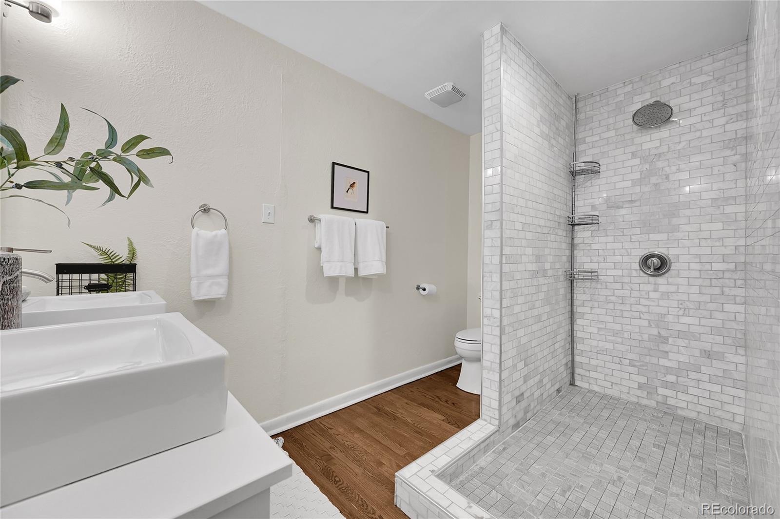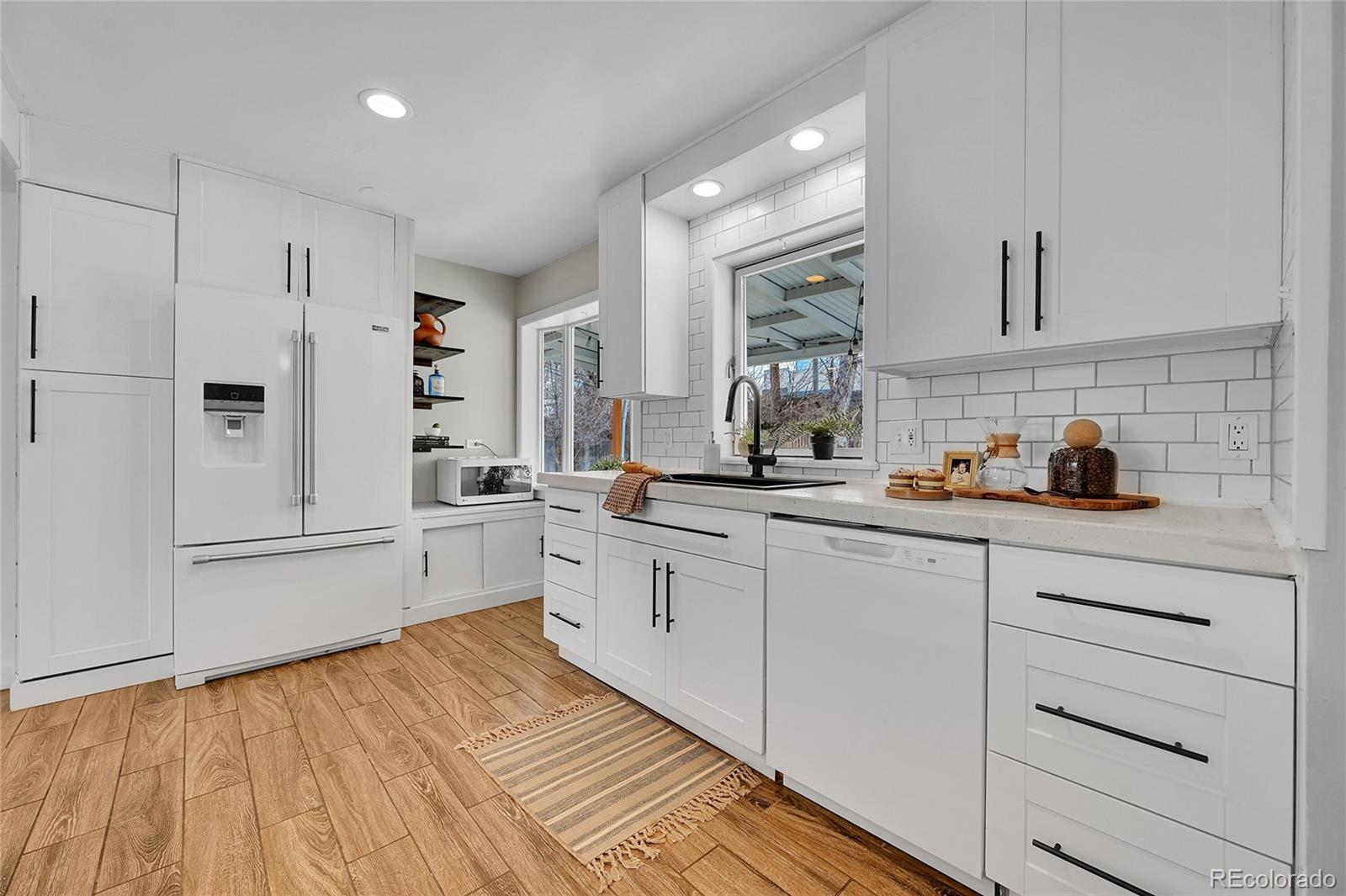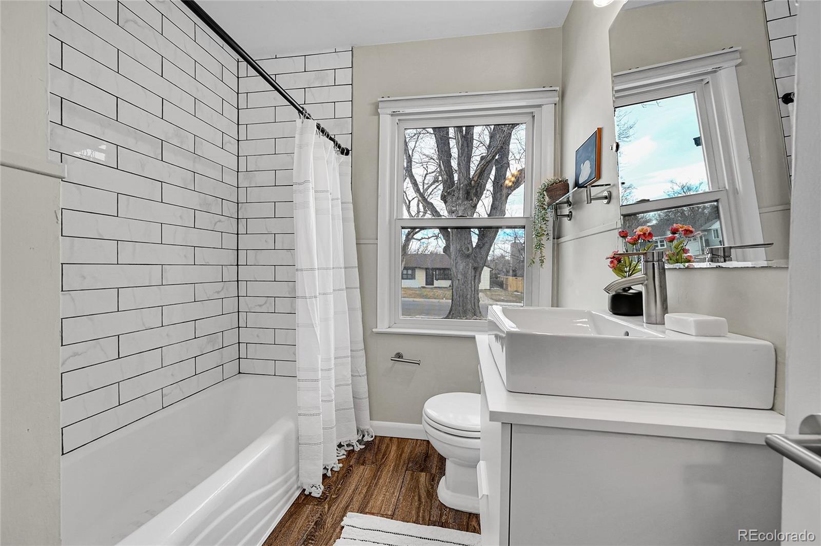 Welcome to this beautifully updated 2-bedroom, 2-bath home nestled in one of Denver’s most desirable neighborhoods. This west-facing property offers wonderful natural light and inviting curb appeal, highlighted by a covered front porch - perfect for enjoying Colorado sunsets. Step inside to a spacious, open living and kitchen area, enhanced by hardwood floors and a layout designed for both everyday living and entertaining. The updated kitchen is a standout, with a striking focal-point range hood, clean white appliances, and a thoughtfully arranged layout that’s as functional as it is stylish. The primary bedroom is a true retreat, featuring two closets with built-ins and a private ensuite bathroom complete with a large walk-in shower and double vanity. The second bedroom is highly versatile and can easily serve as a bedroom, office, workout room, or a combination of all three, making it ideal for modern living. Major updates include a newer roof (2021), central A/C with a new unit installed in 2021, and Andersen windows throughout. Additional highlights include a 1-car attached garage, a separate laundry room, and a large backyard ideal for entertaining, relaxing, or enjoying the outdoors. Surrounded by well-maintained homes in a highly sought-after location, this property offers the perfect blend of comfort, style, and Denver character.