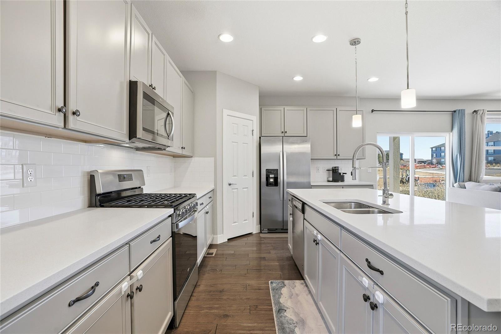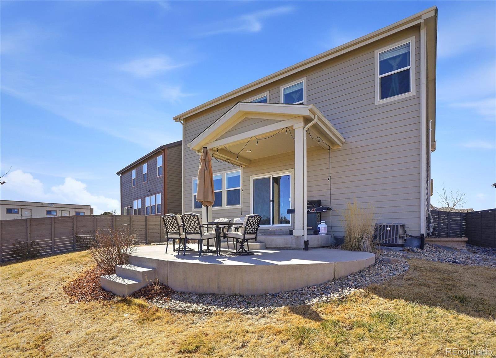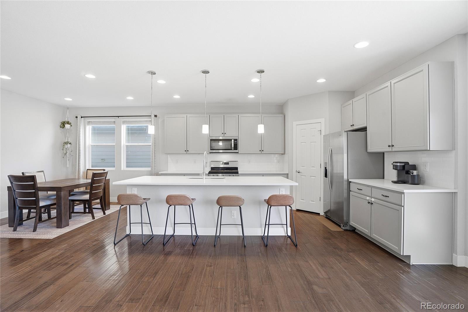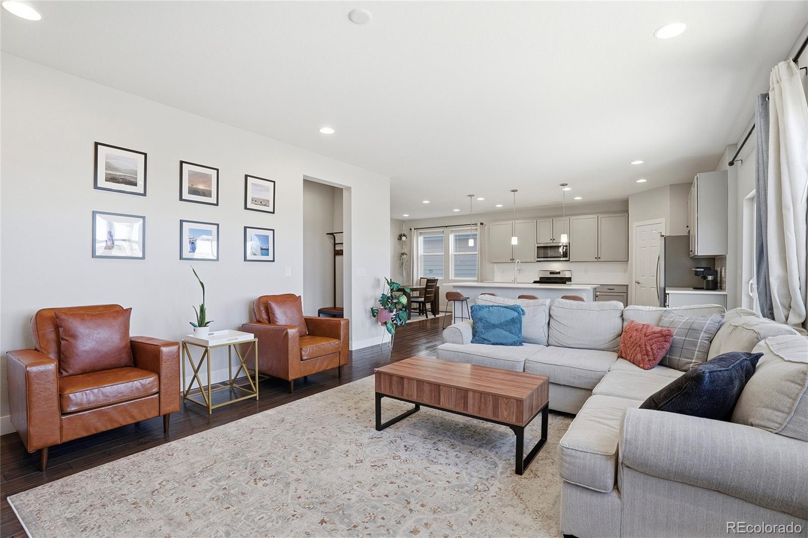 Welcome to this beautifully maintained home in the sought-after Avion at Denver Connection neighborhood of Green Valley Ranch. Thoughtfully designed with an open and functional layout, the main level welcomes you with a bright entry that flows into the spacious kitchen, dining, and living areas. Large windows fill the home with natural light, creating an inviting atmosphere. Step outside to the backyard where a covered patio provides the perfect place to relax. One of the standout features of this property is its location backing to open space that is currently being transformed into a new Denver park. Planned at approximately nine acres, the park will include a playground, athletic fields, basketball court, walking paths, picnic areas, and native landscaping that offers preserved views and an incredible outdoor amenity just steps from your backyard. Upstairs, you’ll find four generously sized bedrooms and two full bathrooms, including a spacious primary suite with a 5-piece bathroom. The home has been significantly enhanced by the current owners with thoughtful upgrades, including a professionally finished basement adding an additional bedroom, bathroom, and living space—ideal for guests or extended living. Each morning you’ll love the mountain views as you head downstairs to start your day. Additional improvements include a new roof in 2025, whole house fan, EV charger, Ecobee smart thermostat with multi-room sensors, radon mitigation system, custom blinds, and an upgraded garage door. Perfectly positioned between Downtown Denver and Denver International Airport, this home also enjoys close proximity to the growing Flyway development, which features Costco, new shops and restaurants. Residents of Avion enjoy access to the neighborhood “Hub,” offering a community pool, dog park, and gathering spaces. This is a rare opportunity to own a move-in-ready home in one of Denver’s fastest-growing communities with a brand-new park right in your backyard.