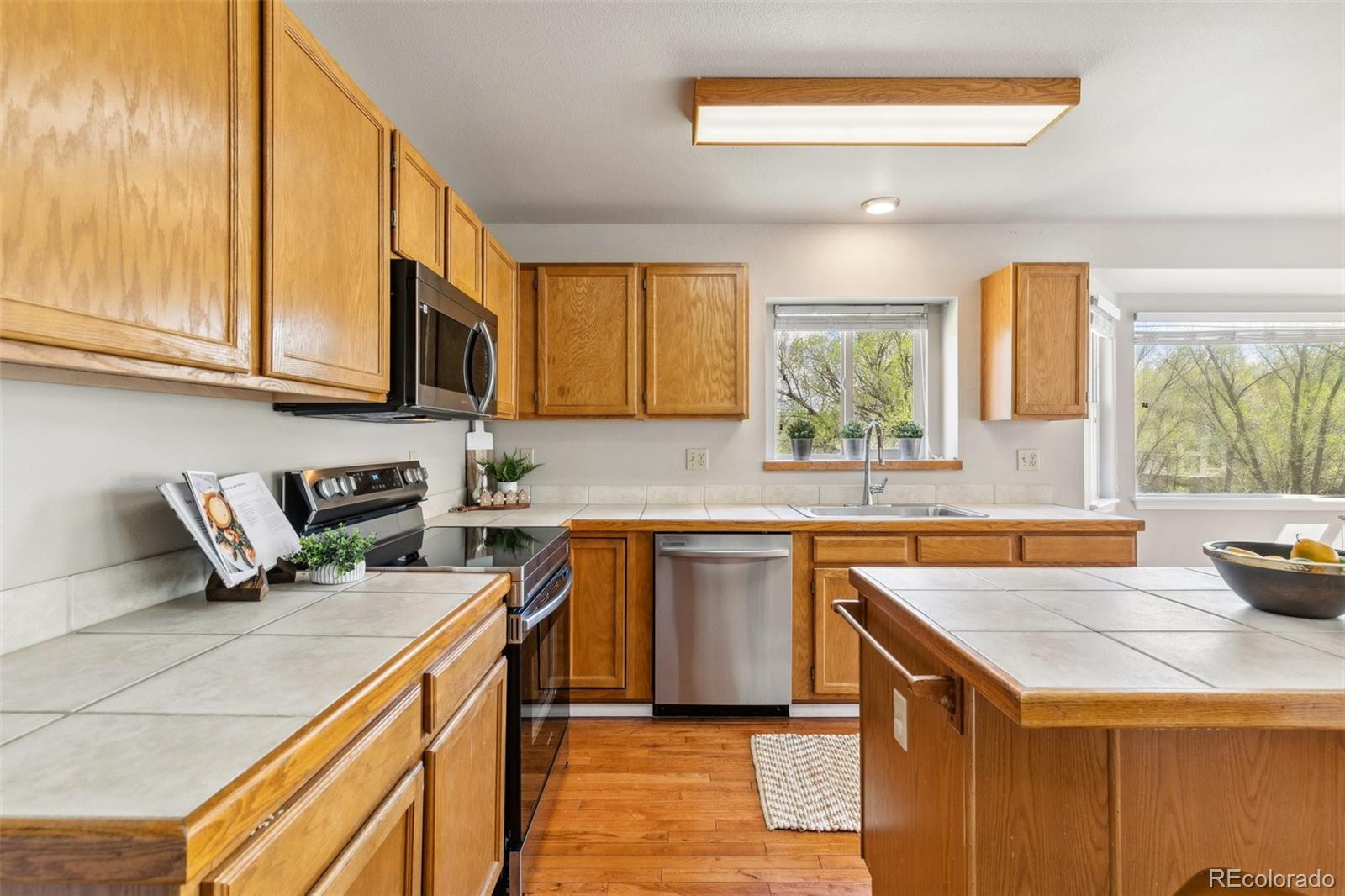 Exterior improvements recently completed. Fantastic D20 location in a culdesac on a large lot backing to open space! This wonderful home features ample living space with new carpet and paint on the main and upper levels, as well as new flooring in the bathrooms. The spacious kitchen is light and bright with new appliances, breakfast bar island, pantry, and lots of cupboard space. The great room features a gas fireplace and walks out to the deck with views of trees and creek area behind. Primary bedroom on the upper level has space for a sitting area and attaches to a large ensuite 5-pc bathroom with soaking tub, separate shower, double vanity, and walk-in closet. Three additional bedrooms and a full bath on the upper level. The finished basement space has a large additional living space with wet bar/kitchenette, a bedroom and full bathroom, and a non-conforming bedroom or flex space, as well as a workshop area in the unfinished space. An oversized 2 car garage rounds out this great property. This desirable location is within walking distance of Woodstone Park as well as walking trails, and has quick access to I25. Homes in the desirable Woodstone neighborhood don't come up often, so don't miss it!
