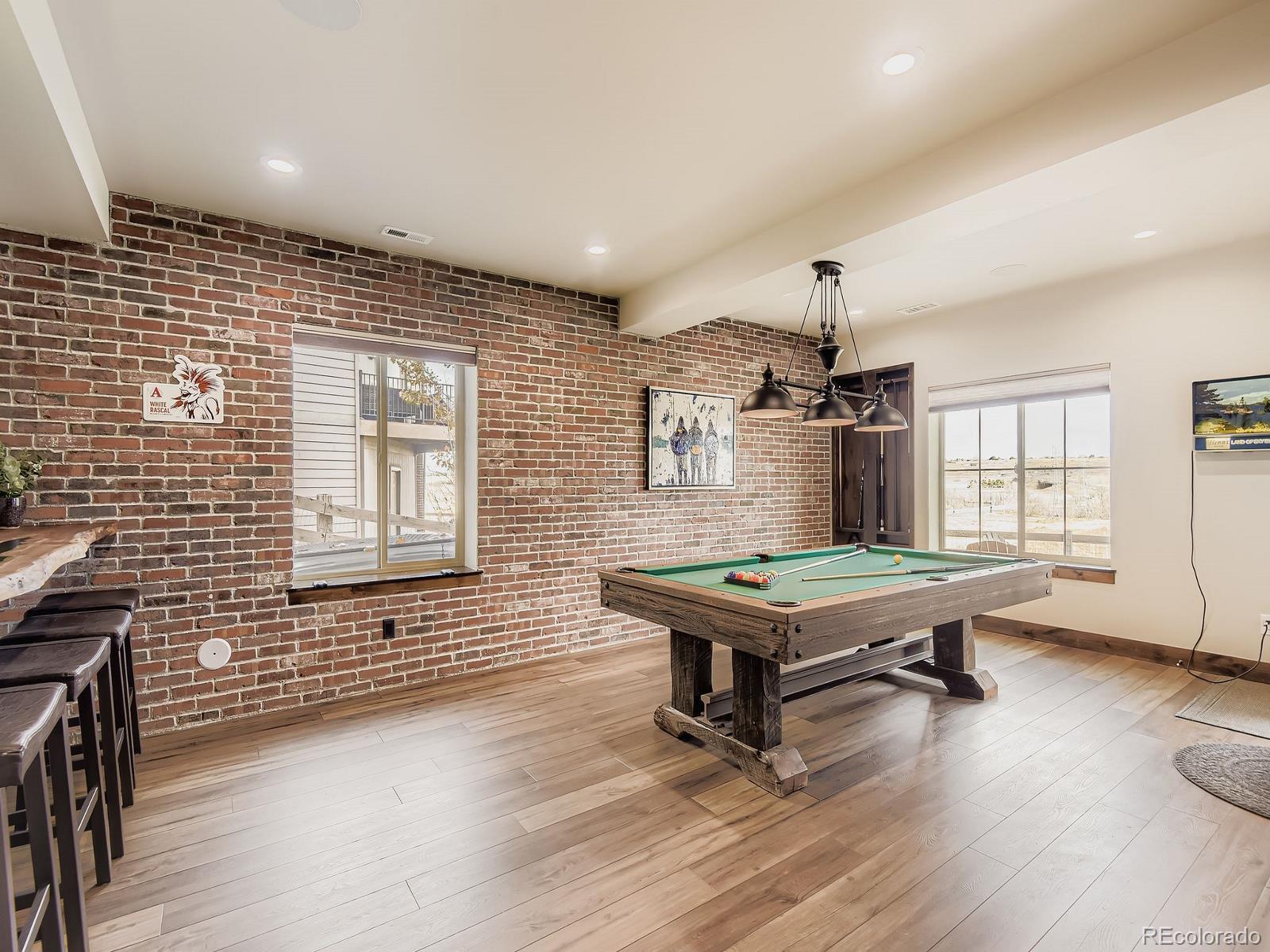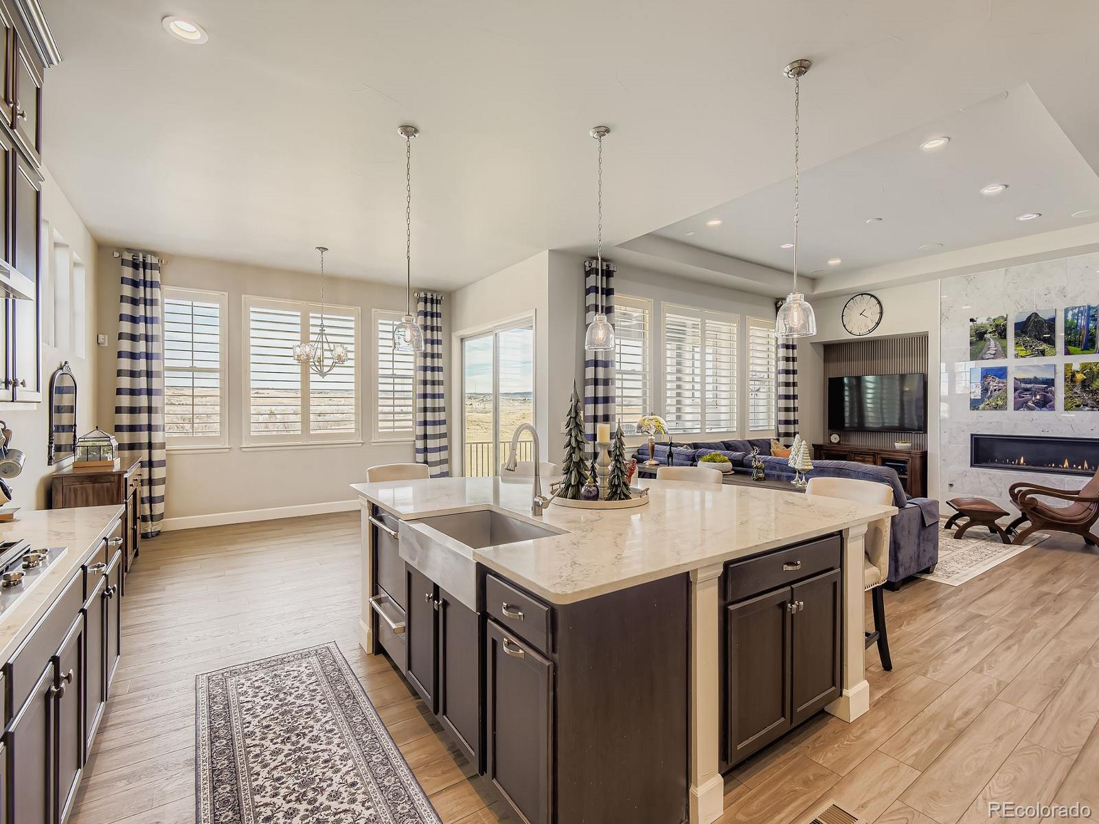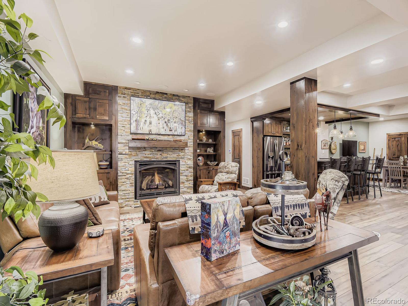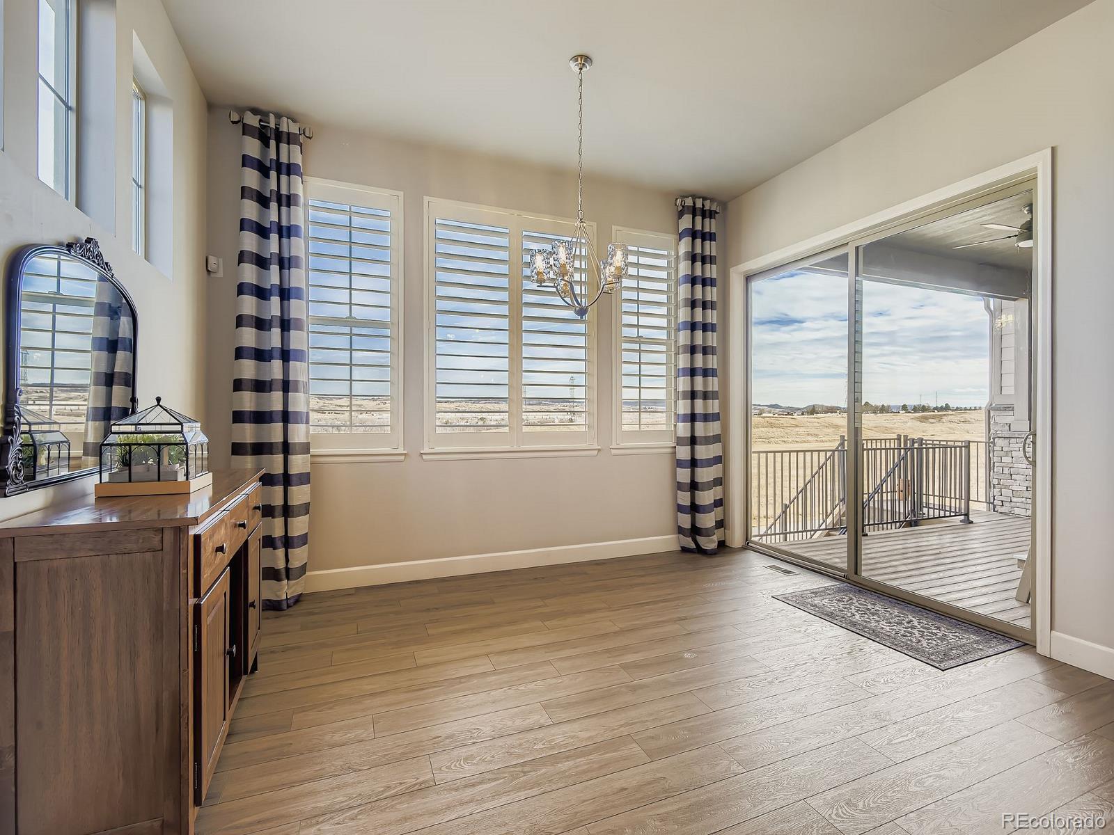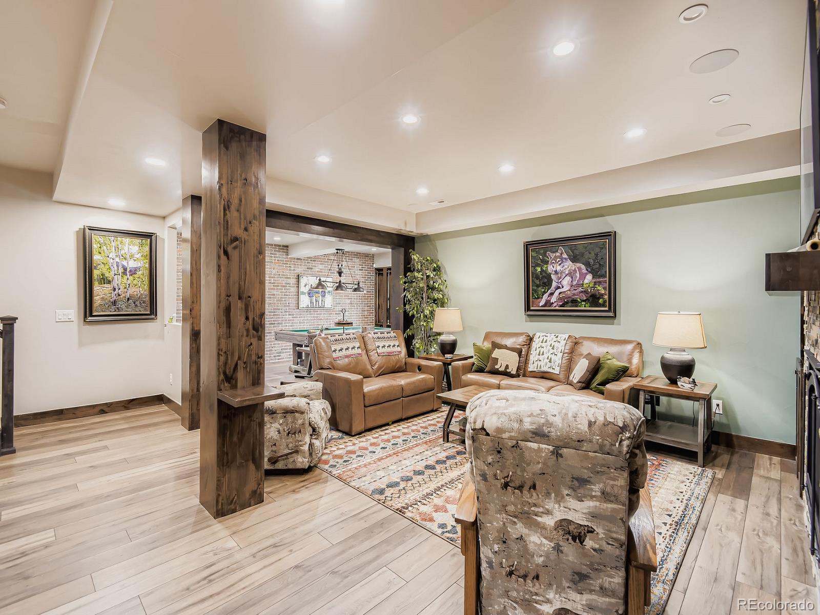 Stunning 6346 SF (5665 SF finished) walk-out ranch in Sterling Ranch that backs to open space. Main level includes new Shaw LVP flooring (installed 11/18/25), plantation shutters throughout, 10' ceilings, office with double doors, dining room, kitchen w/ gas range, massive island w/sink, quartz countertops, large eating area, walk-in pantry, butler pantry joins dining room to kitchen, living room w/ gas fireplace & surround sound, laundry room w/ sink & cabinets, primary bedroom w/ 5-piece en-suite bath, two additional bedrooms w/en-suite baths, mud room w/ 2 closets, 1/2 bath. Expansive views from the main level covered composite deck w/ gas tap & stairs to backyard. Wait until you see the jaw-dropping custom-finished basement constructed by Elkstone Basements in 2021, with a cost well over $250,000. Highlights include a Control 4 sound system that controls music in 5 separate rooms. Pool room w/ a live-edge seating area & brick accent wall. Cozy family room w/gas log fireplace & built-in shelving. Full service bar w/custom cabinets, fridge, sink, wine cooler, dishwasher, granite countertops & seats 6 people. Smaller sitting area & storage closet adjacent to bar. Exercise room w/rubber flooring, glass doors & mirrors. Gorgeous full bathroom in the hallway. Spacious office for 2 w/built-in desks, electric fireplace & walk-in storage closet that could easily convert to a 5th conforming bedroom. Second primary bedroom w/5-piece en-suite bath w/ steam shower and large walk-in closet. Look for the SECRET DOOR that leads to a huge storage/utility/music room. Also note additional storage room accessible via the exercise room. Basement walks out to an extended stamped cement patio, professionally landscaped back yard w/ turf, storage shed & gate access to walking path/open space. Oversized 3-car garage has 11'6" ceilings. Amenities include pools, parks, trails, clubhouse, pickle ball, brew pub, coffee shop, dentist, UC Health primary/urgent care, food trucks, concerts.
