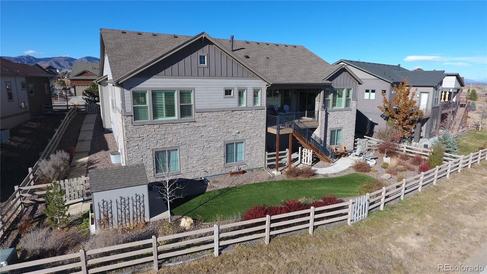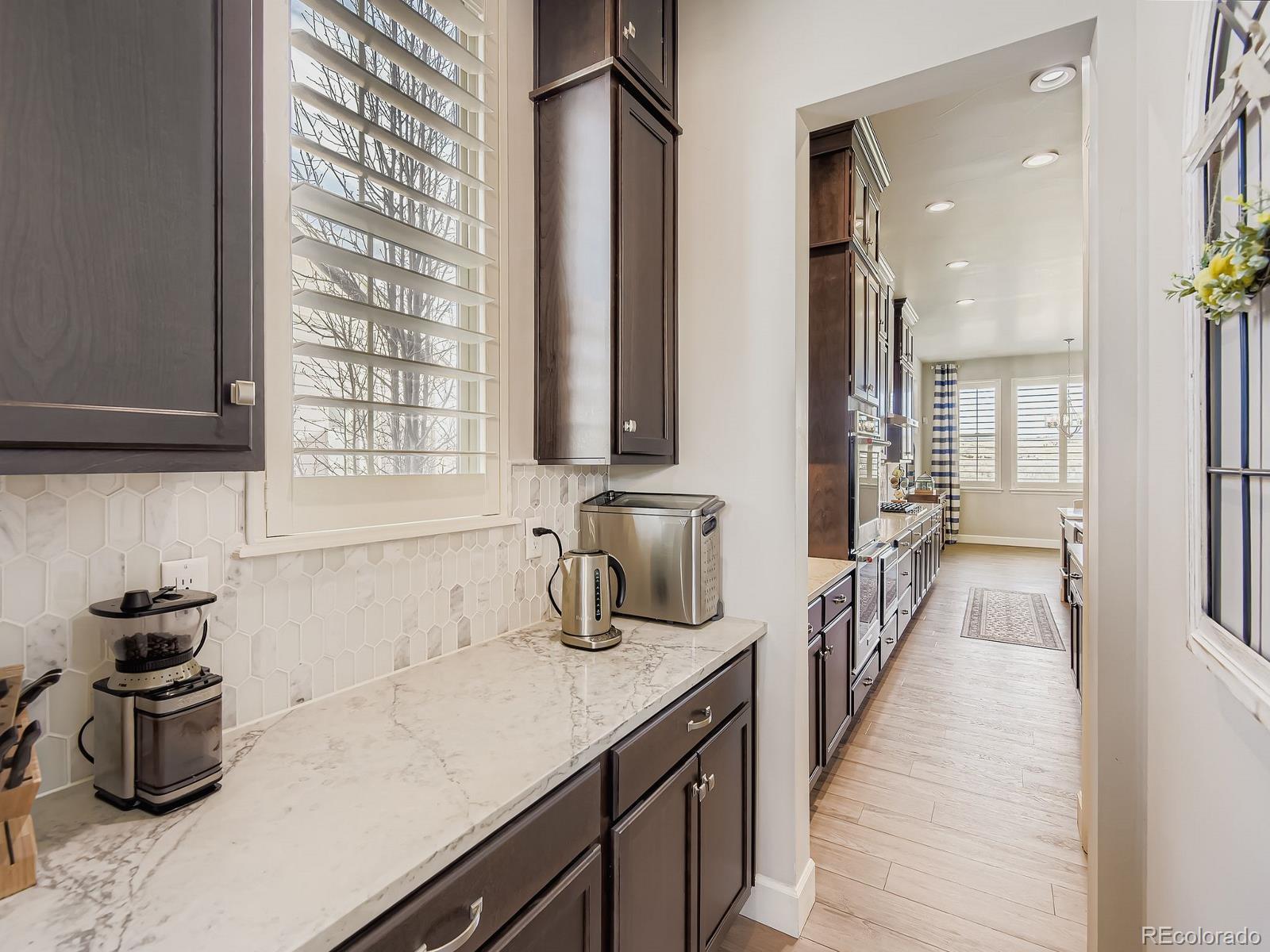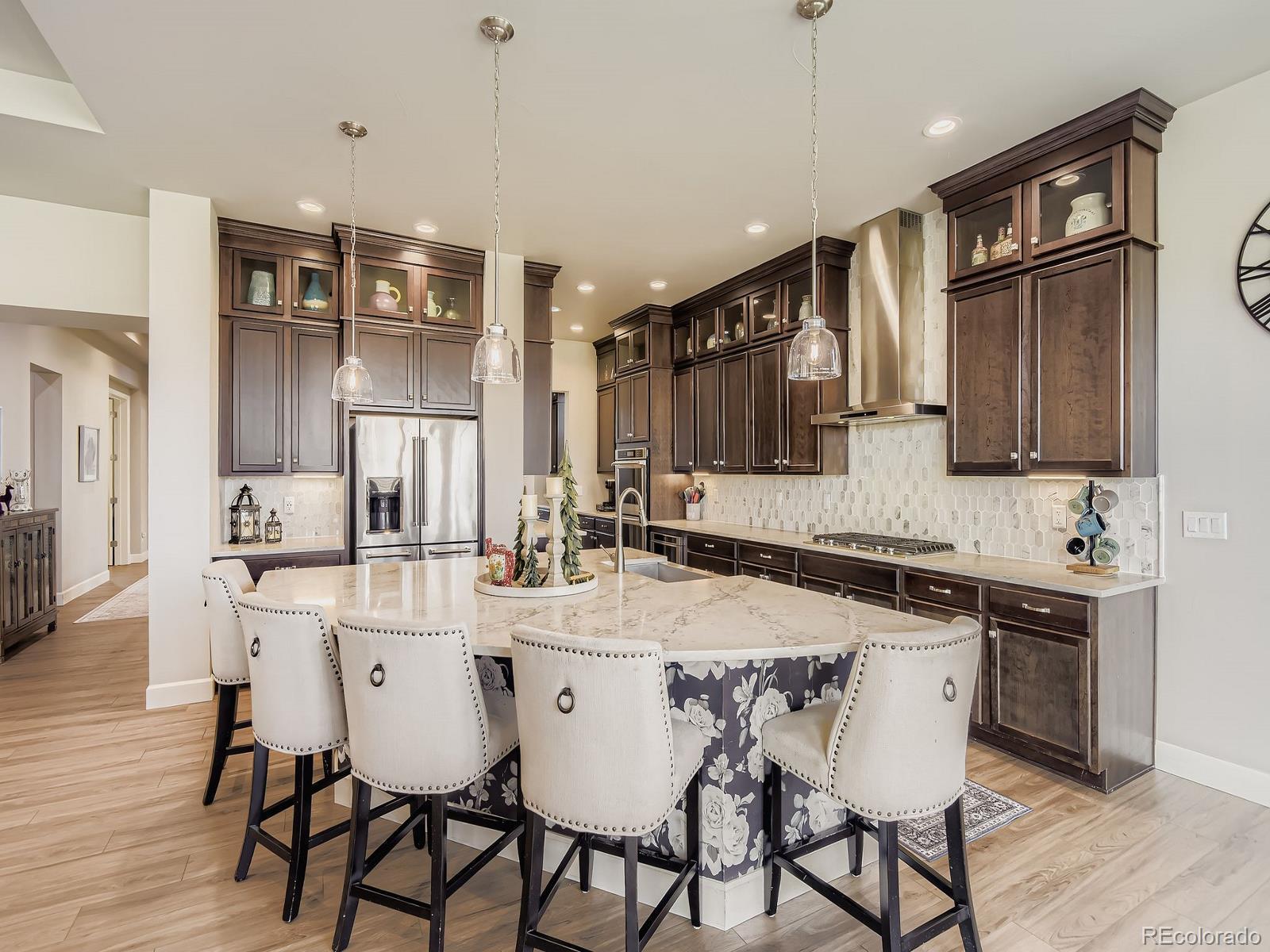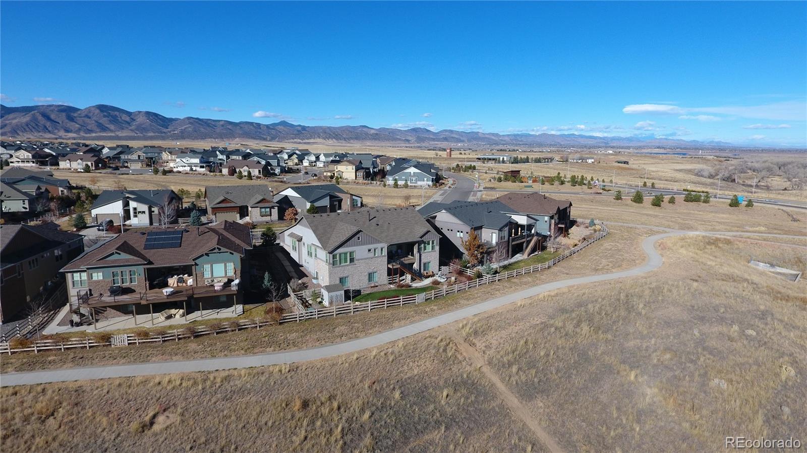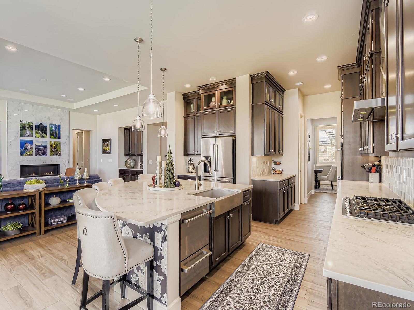 Stunning 6346 SF (5665 SF finished) walk-out ranch in Sterling Ranch that backs to open space. Main level includes new Shaw LVP flooring (installed 11/18/25), plantation shutters throughout, 10' ceilings, office with double doors, dining room, kitchen w/ gas range, massive island w/sink, quartz countertops, large eating area, walk-in pantry, butler pantry joins dining room to kitchen, living room w/ gas fireplace & surround sound, laundry room w/ sink & cabinets, primary bedroom w/ 5-piece en-suite bath, two additional bedrooms w/en-suite baths, mud room w/ 2 closets, 1/2 bath. Expansive views from the main level covered composite deck w/ gas tap & stairs to backyard. Wait until you see the jaw-dropping custom-finished basement constructed by Elkstone Basements in 2021, with a cost well over $250,000. Highlights include a Control 4 sound system that controls music in 5 separate rooms. Pool room w/ a live-edge seating area & brick accent wall. Cozy family room w/gas log fireplace & built-in shelving. Full service bar w/custom cabinets, fridge, sink, wine cooler, dishwasher, granite countertops & seats 6 people. Smaller sitting area & storage closet adjacent to bar. Exercise room w/rubber flooring, glass doors & mirrors. Gorgeous full bathroom in the hallway. Spacious office for 2 w/built-in desks, electric fireplace & walk-in storage closet that could easily convert to a 5th conforming bedroom. Second primary bedroom w/5-piece en-suite bath w/ steam shower and large walk-in closet. Look for the SECRET DOOR that leads to a huge storage/utility/music room. Also note additional storage room accessible via the exercise room. Basement walks out to an extended stamped cement patio, professionally landscaped back yard w/ turf, storage shed & gate access to walking path/open space. Oversized 3-car garage has 11'6" ceilings. Amenities include pools, parks, trails, clubhouse, pickle ball, brew pub, coffee shop, dentist, UC Health primary/urgent care, food trucks, concerts.