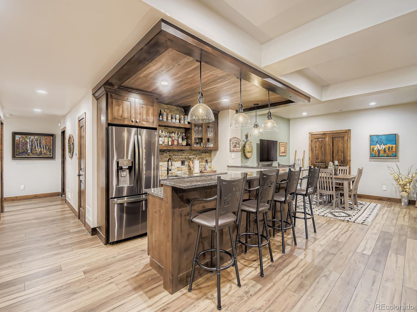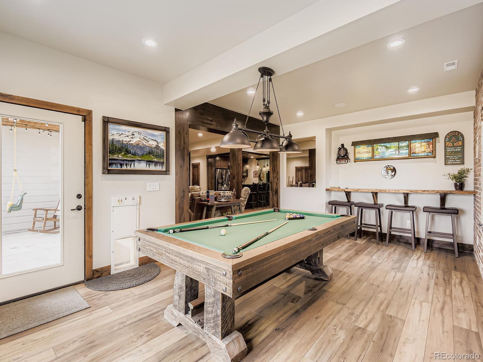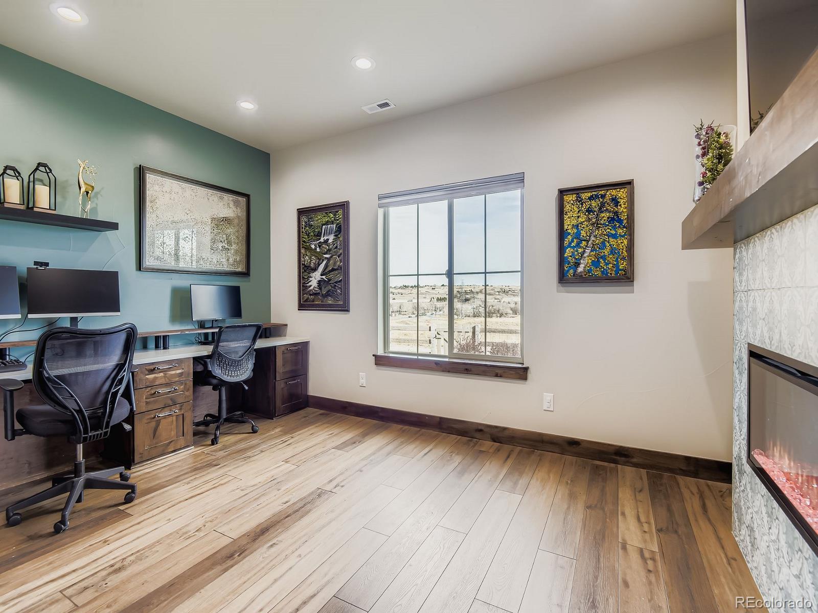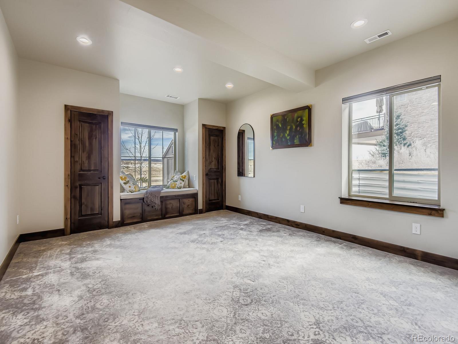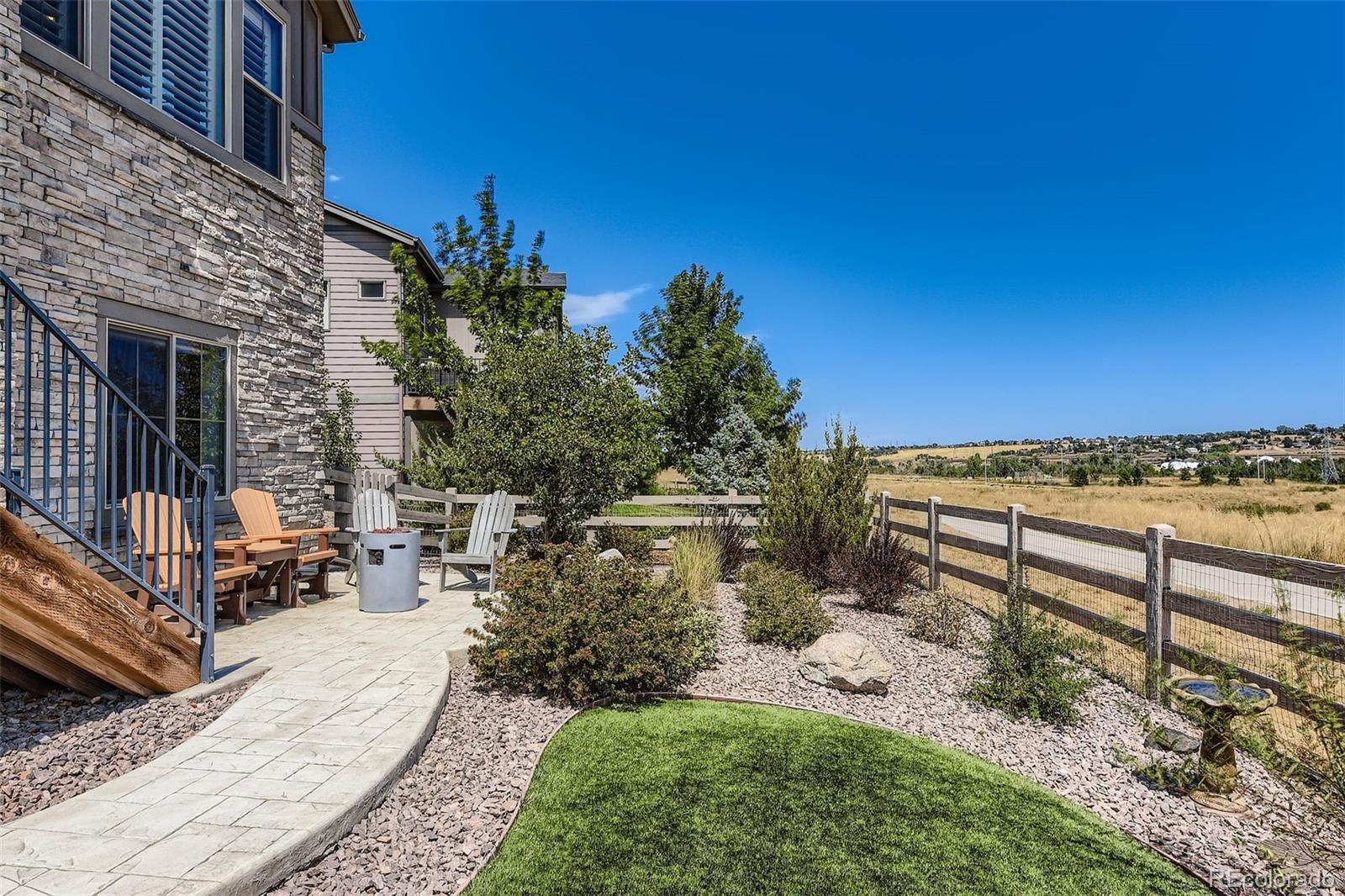 Stunning 6346 SF (5665 SF finished) walk-out ranch in Sterling Ranch that backs to open space. Main level includes new Shaw LVP flooring (installed 11/18/25), plantation shutters throughout, 10' ceilings, office with double doors, dining room, kitchen w/ gas range, massive island w/sink, quartz countertops, large eating area, walk-in pantry, butler pantry joins dining room to kitchen, living room w/ gas fireplace & surround sound, laundry room w/ sink & cabinets, primary bedroom w/ 5-piece en-suite bath, two additional bedrooms w/en-suite baths, mud room w/ 2 closets, 1/2 bath. Expansive views from the main level covered composite deck w/ gas tap & stairs to backyard. Wait until you see the jaw-dropping custom-finished basement constructed by Elkstone Basements in 2021, with a cost well over $250,000. Highlights include a Control 4 sound system that controls music in 5 separate rooms. Pool room w/ a live-edge seating area & brick accent wall. Cozy family room w/gas log fireplace & built-in shelving. Full service bar w/custom cabinets, fridge, sink, wine cooler, dishwasher, granite countertops & seats 6 people. Smaller sitting area & storage closet adjacent to bar. Exercise room w/rubber flooring, glass doors & mirrors. Gorgeous full bathroom in the hallway. Spacious office for 2 w/built-in desks, electric fireplace & walk-in storage closet that could easily convert to a 5th conforming bedroom. Second primary bedroom w/5-piece en-suite bath w/ steam shower and large walk-in closet. Look for the SECRET DOOR that leads to a huge storage/utility/music room. Also note additional storage room accessible via the exercise room. Basement walks out to an extended stamped cement patio, professionally landscaped back yard w/ turf, storage shed & gate access to walking path/open space. Oversized 3-car garage has 11'6" ceilings. Amenities include pools, parks, trails, clubhouse, pickle ball, brew pub, coffee shop, dentist, UC Health primary/urgent care, food trucks, concerts.