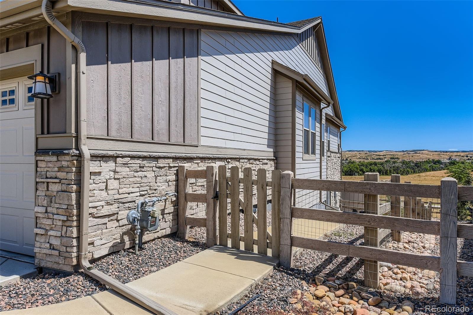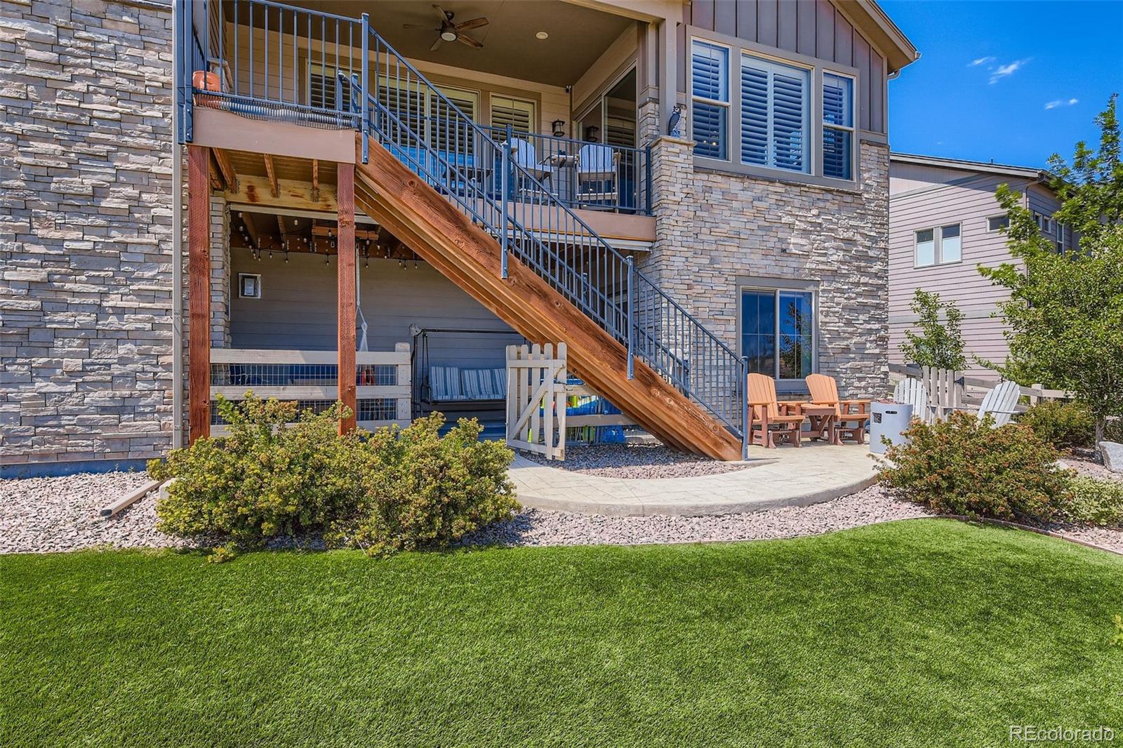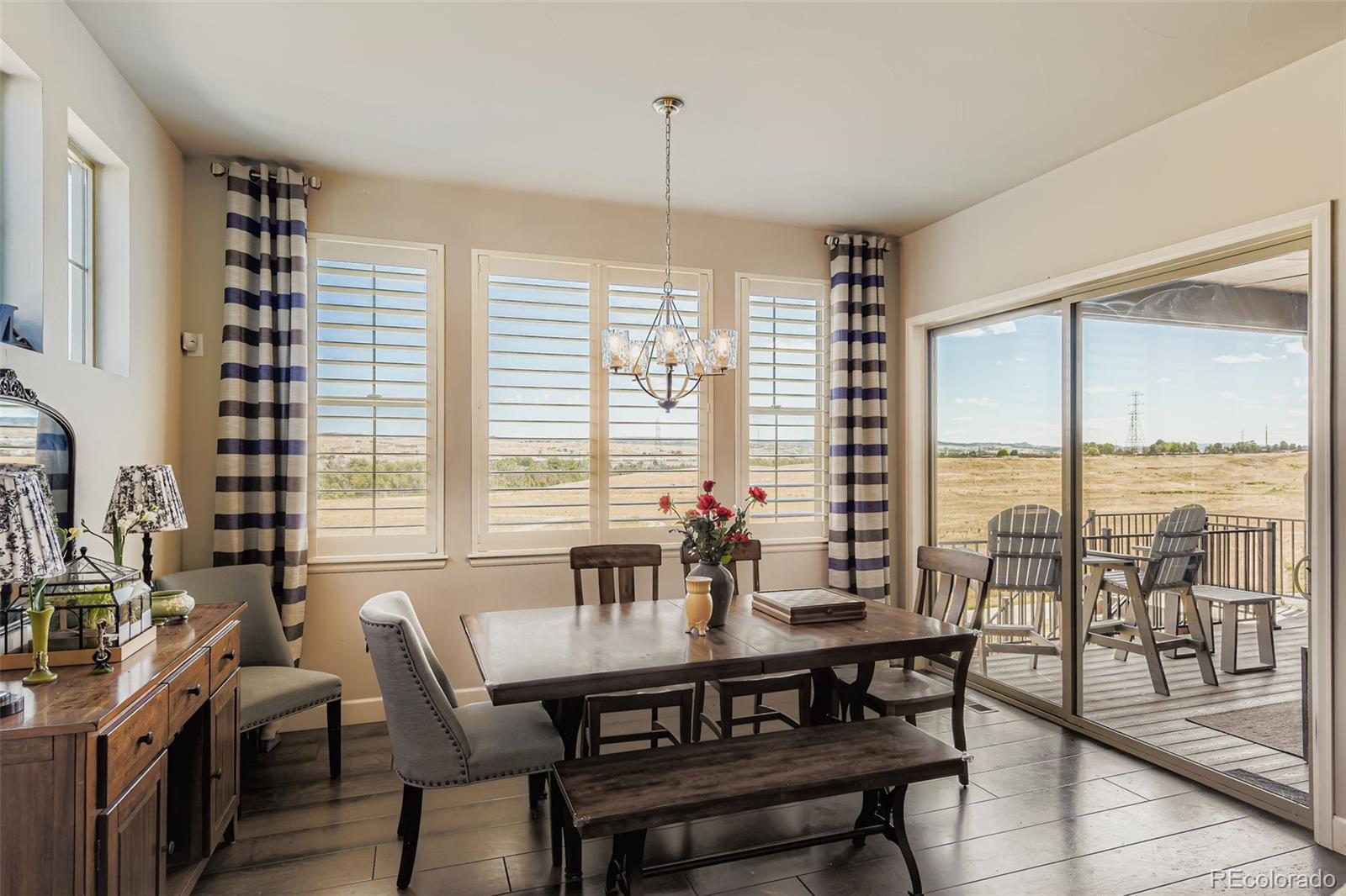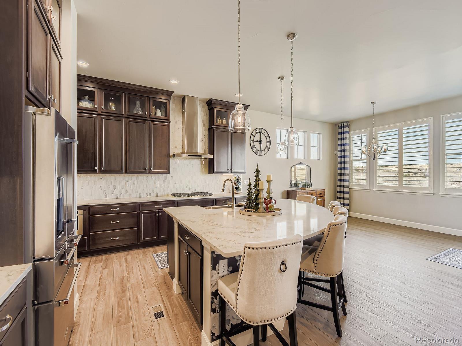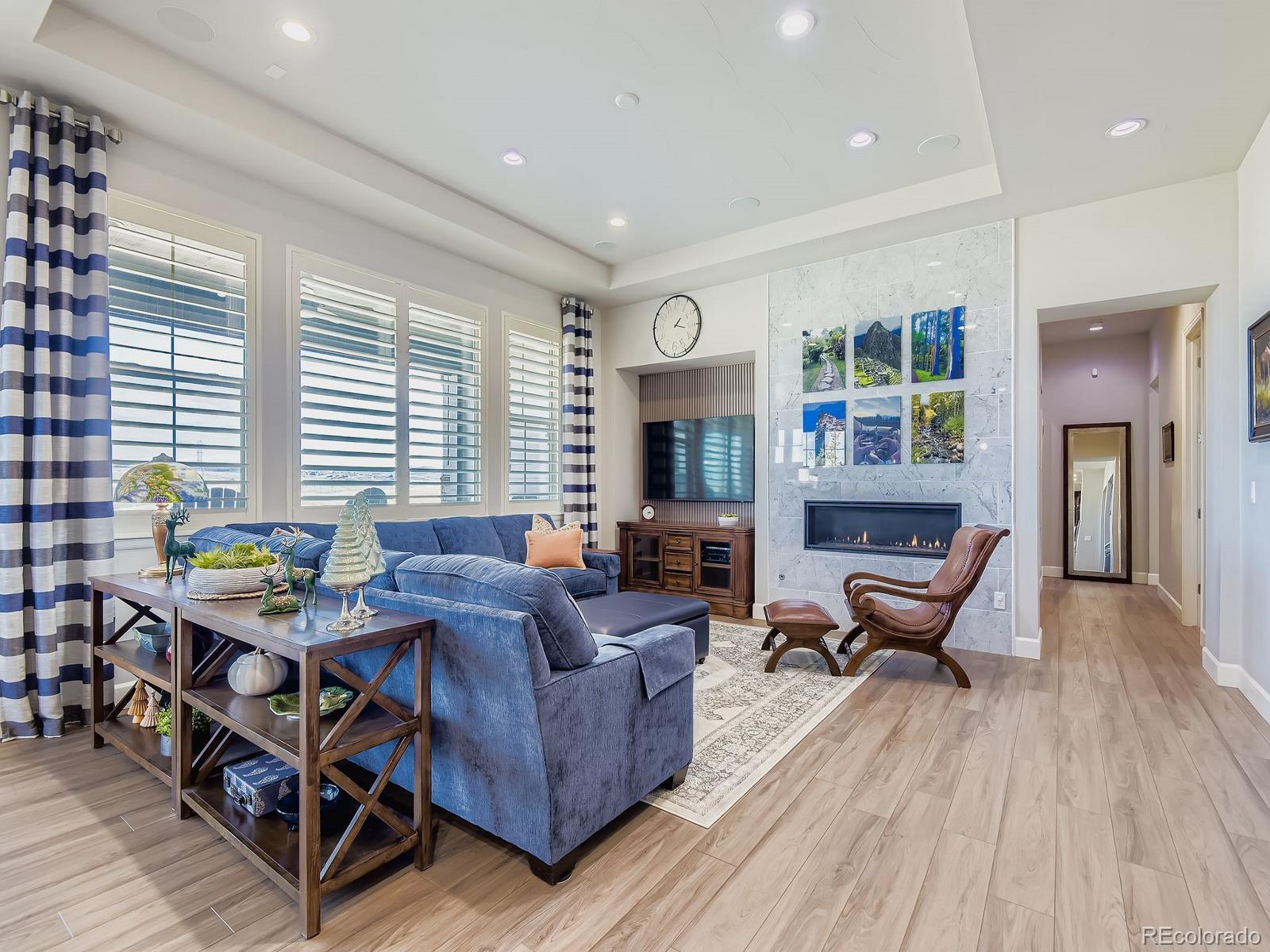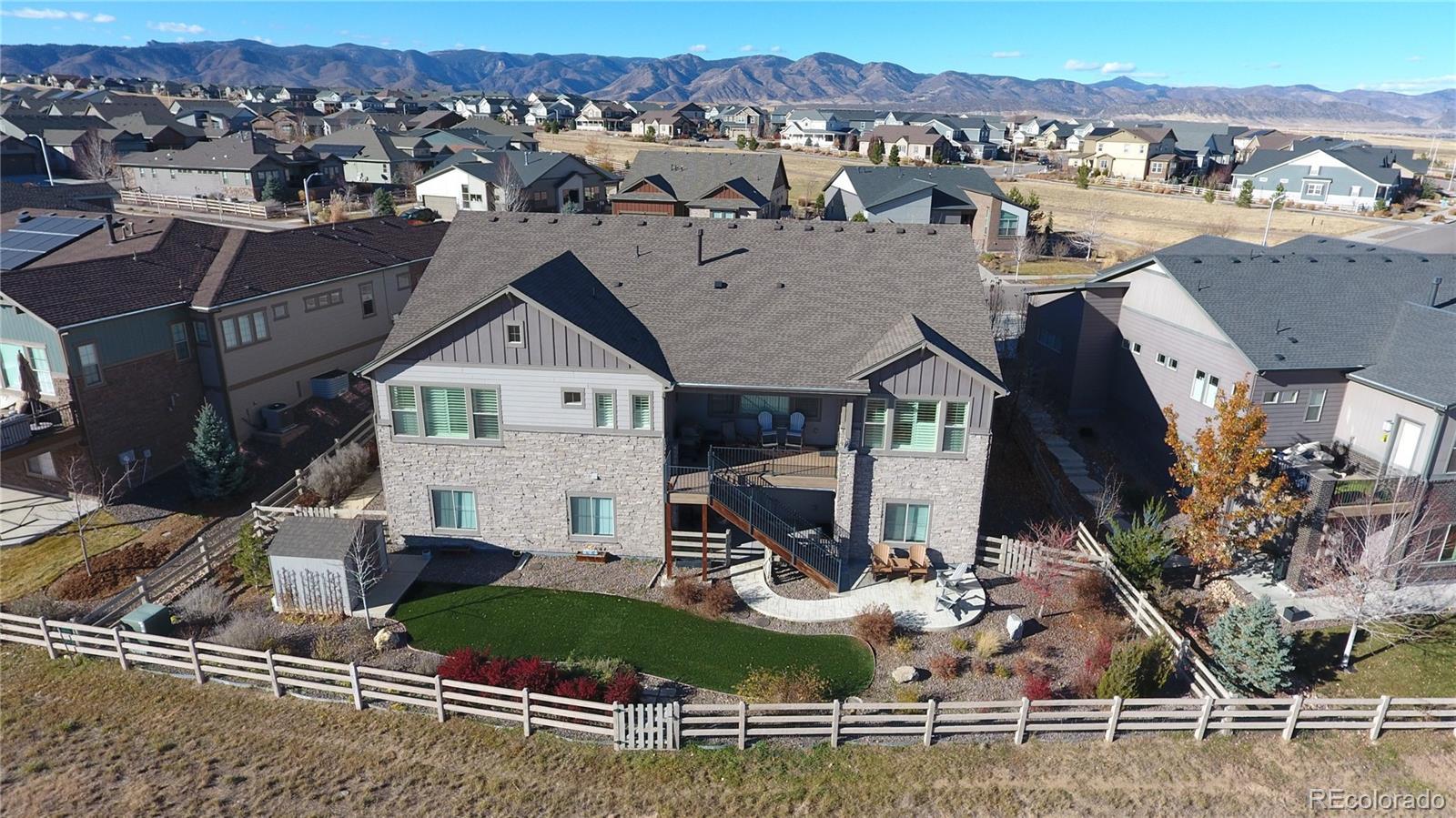 Stunning 6346 SF (5665 SF finished) walk-out ranch in Sterling Ranch that backs to open space. Main level includes new Shaw LVP flooring (installed 11/18/25), plantation shutters throughout, 10' ceilings, office with double doors, dining room, kitchen w/ gas range, massive island w/sink, quartz countertops, large eating area, walk-in pantry, butler pantry joins dining room to kitchen, living room w/ gas fireplace & surround sound, laundry room w/ sink & cabinets, primary bedroom w/ 5-piece en-suite bath, two additional bedrooms w/en-suite baths, mud room w/ 2 closets, 1/2 bath. Expansive views from the main level covered composite deck w/ gas tap & stairs to backyard. Wait until you see the jaw-dropping custom-finished basement constructed by Elkstone Basements in 2021, with a cost well over $250,000. Highlights include a Control 4 sound system that controls music in 5 separate rooms. Pool room w/ a live-edge seating area & brick accent wall. Cozy family room w/gas log fireplace & built-in shelving. Full service bar w/custom cabinets, fridge, sink, wine cooler, dishwasher, granite countertops & seats 6 people. Smaller sitting area & storage closet adjacent to bar. Exercise room w/rubber flooring, glass doors & mirrors. Gorgeous full bathroom in the hallway. Spacious office for 2 w/built-in desks, electric fireplace & walk-in storage closet that could easily convert to a 5th conforming bedroom. Second primary bedroom w/5-piece en-suite bath w/ steam shower and large walk-in closet. Look for the SECRET DOOR that leads to a huge storage/utility/music room. Also note additional storage room accessible via the exercise room. Basement walks out to an extended stamped cement patio, professionally landscaped back yard w/ turf, storage shed & gate access to walking path/open space. Oversized 3-car garage has 11'6" ceilings. Amenities include pools, parks, trails, clubhouse, pickle ball, brew pub, coffee shop, dentist, UC Health primary/urgent care, food trucks, concerts.