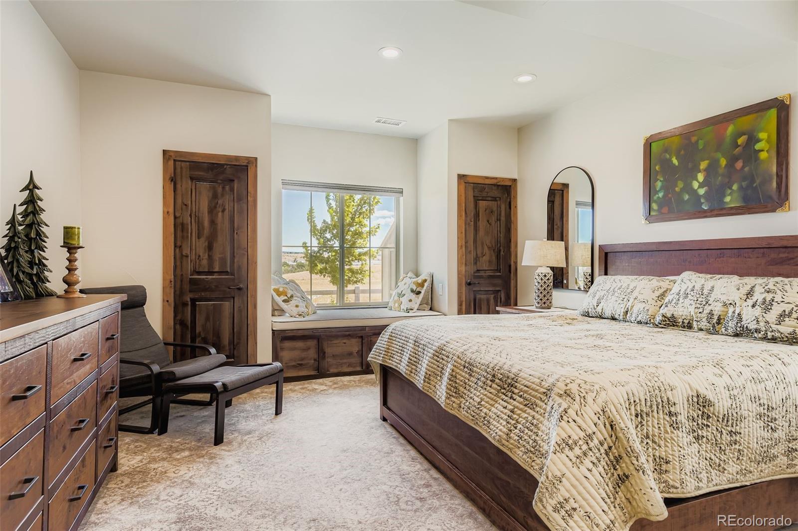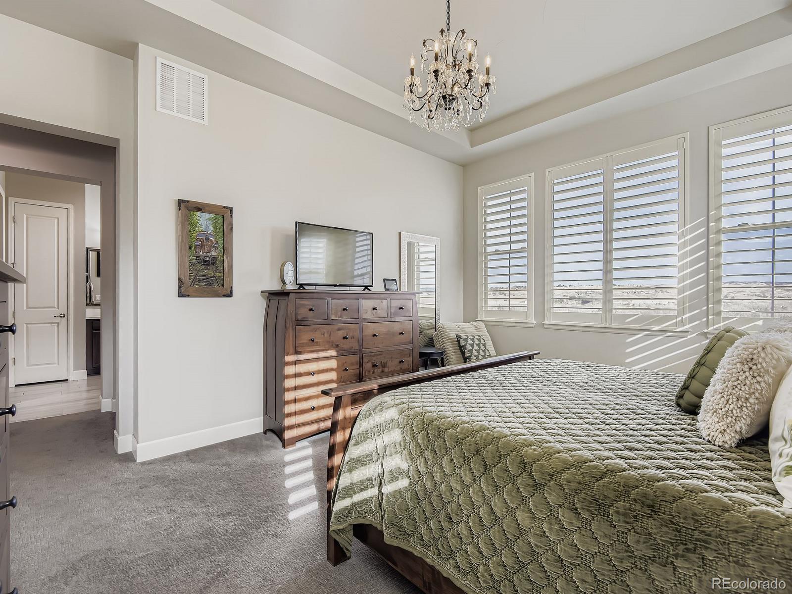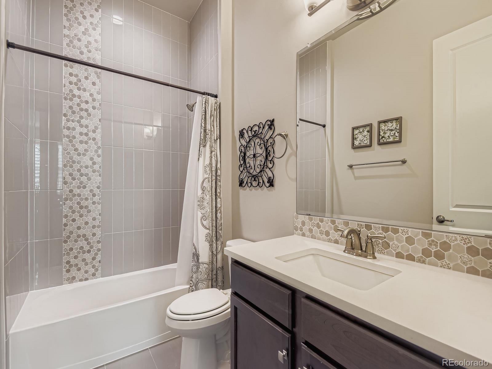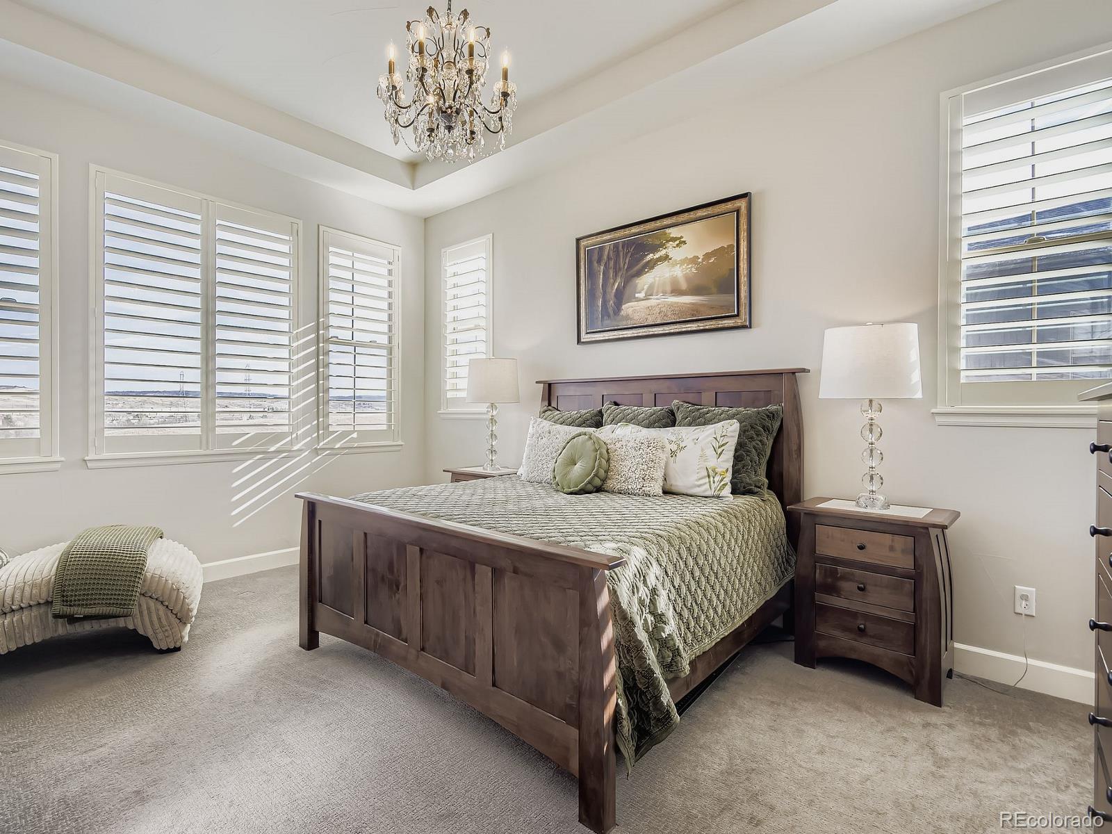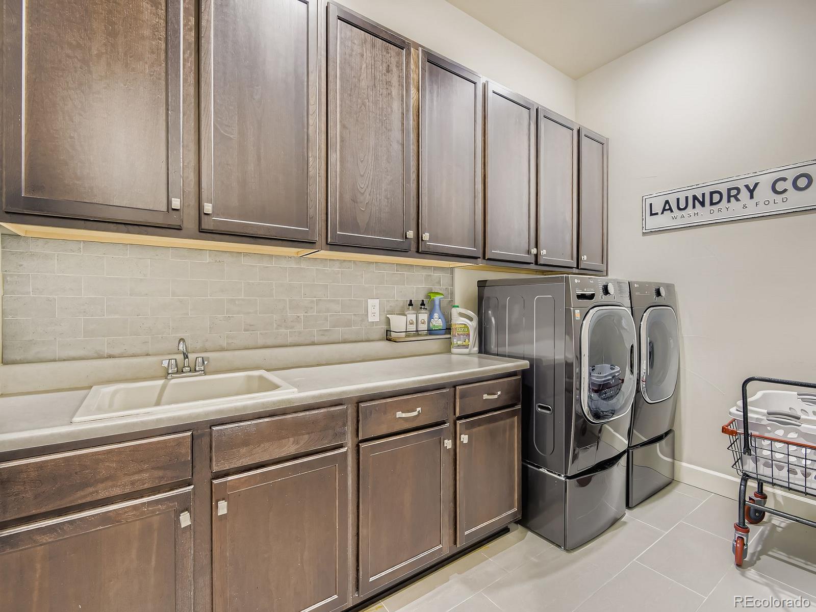 Stunning 6346 SF (5665 SF finished) walk-out ranch in Sterling Ranch that backs to open space. Main level includes new Shaw LVP flooring (installed 11/18/25), plantation shutters throughout, 10' ceilings, office with double doors, dining room, kitchen w/ gas range, massive island w/sink, quartz countertops, large eating area, walk-in pantry, butler pantry joins dining room to kitchen, living room w/ gas fireplace & surround sound, laundry room w/ sink & cabinets, primary bedroom w/ 5-piece en-suite bath, two additional bedrooms w/en-suite baths, mud room w/ 2 closets, 1/2 bath. Expansive views from the main level covered composite deck w/ gas tap & stairs to backyard. Wait until you see the jaw-dropping custom-finished basement constructed by Elkstone Basements in 2021, with a cost well over $250,000. Highlights include a Control 4 sound system that controls music in 5 separate rooms. Pool room w/ a live-edge seating area & brick accent wall. Cozy family room w/gas log fireplace & built-in shelving. Full service bar w/custom cabinets, fridge, sink, wine cooler, dishwasher, granite countertops & seats 6 people. Smaller sitting area & storage closet adjacent to bar. Exercise room w/rubber flooring, glass doors & mirrors. Gorgeous full bathroom in the hallway. Spacious office for 2 w/built-in desks, electric fireplace & walk-in storage closet that could easily convert to a 5th conforming bedroom. Second primary bedroom w/5-piece en-suite bath w/ steam shower and large walk-in closet. Look for the SECRET DOOR that leads to a huge storage/utility/music room. Also note additional storage room accessible via the exercise room. Basement walks out to an extended stamped cement patio, professionally landscaped back yard w/ turf, storage shed & gate access to walking path/open space. Oversized 3-car garage has 11'6" ceilings. Amenities include pools, parks, trails, clubhouse, pickle ball, brew pub, coffee shop, dentist, UC Health primary/urgent care, food trucks, concerts.