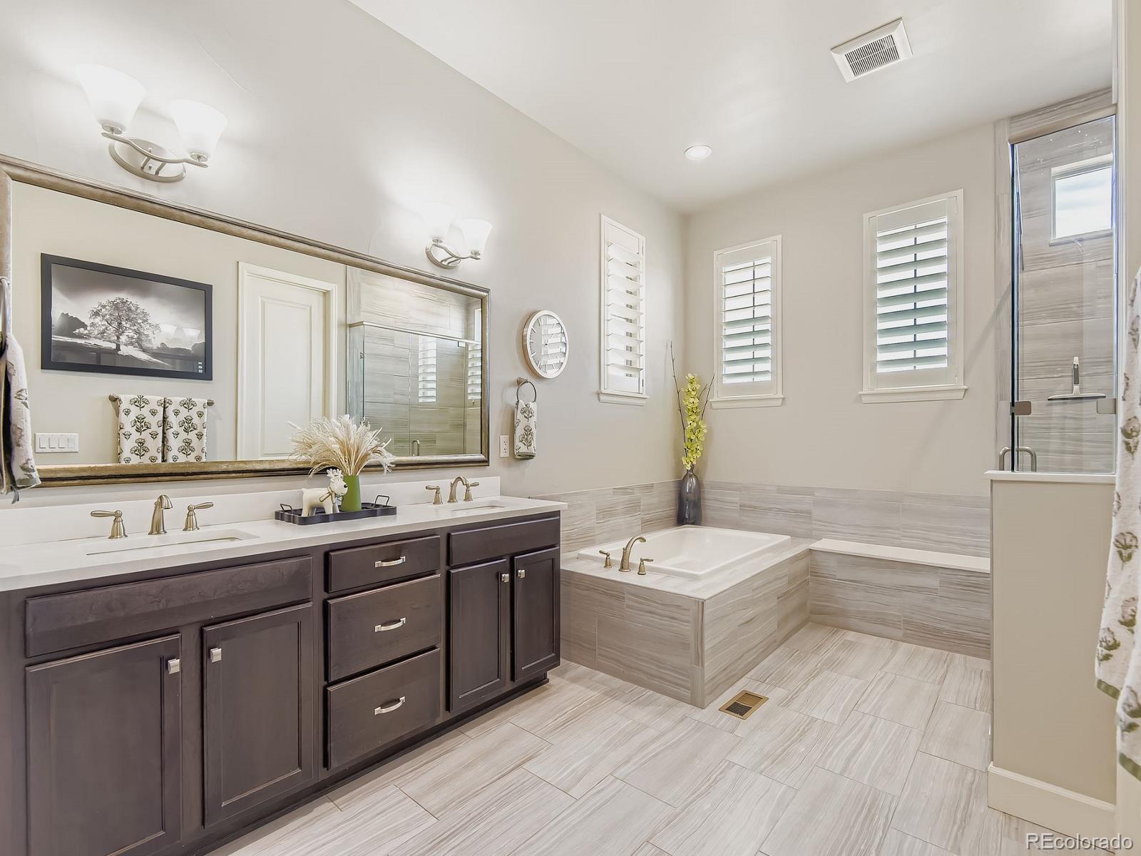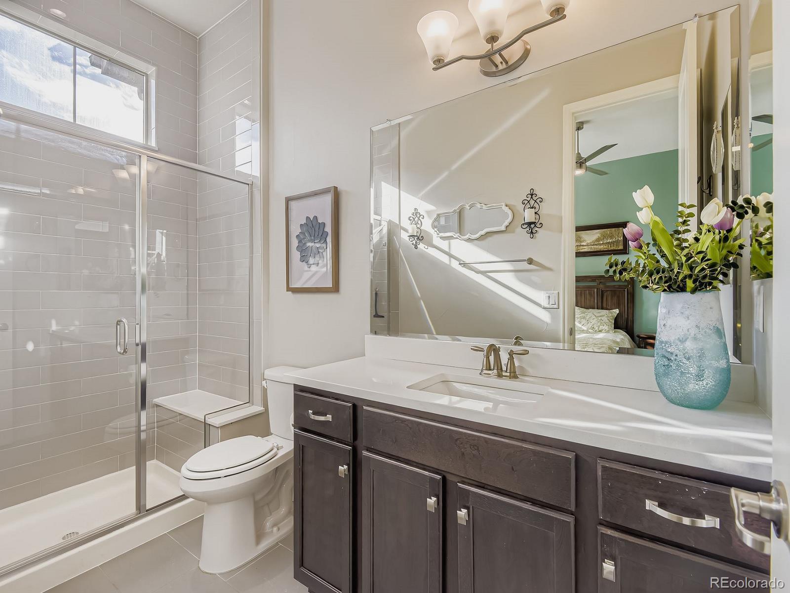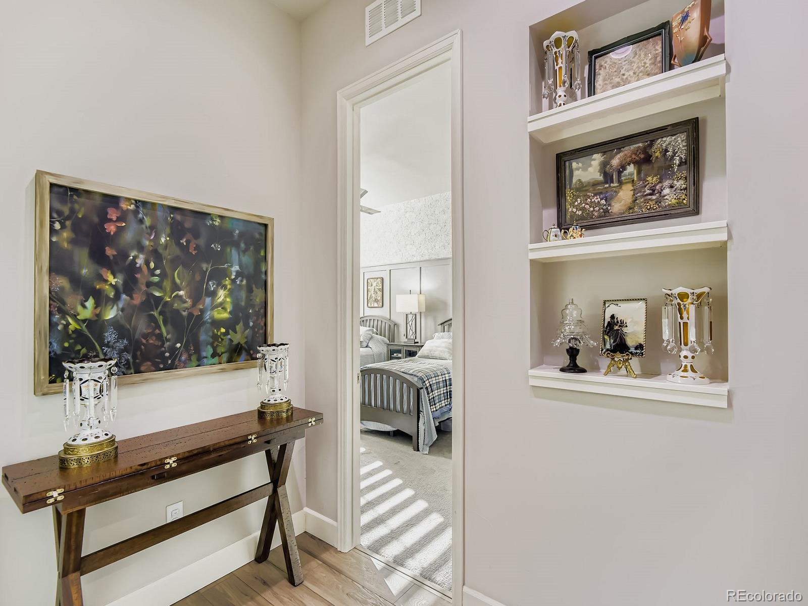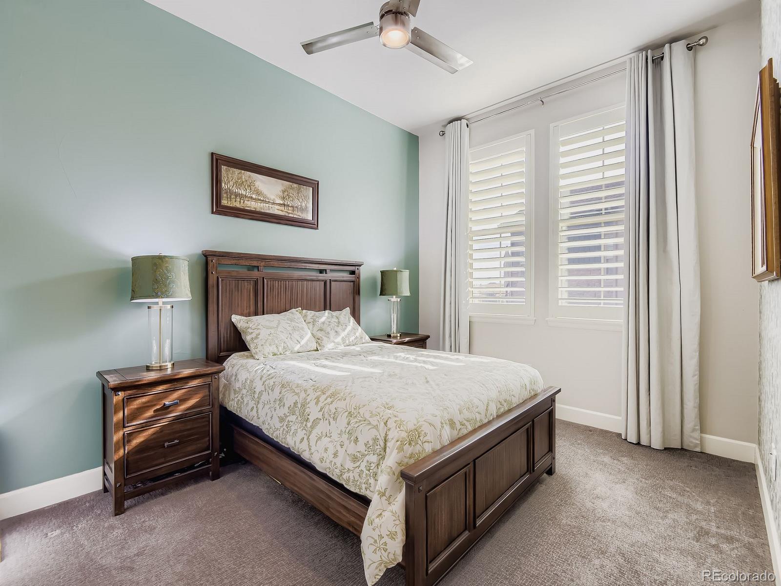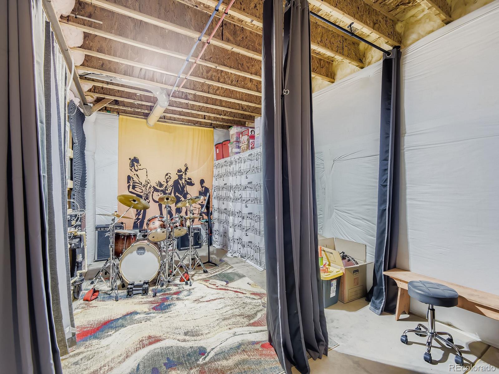 Stunning 6346 SF (5665 SF finished) walk-out ranch in Sterling Ranch that backs to open space. Main level includes new Shaw LVP flooring (installed 11/18/25), plantation shutters throughout, 10' ceilings, office with double doors, dining room, kitchen w/ gas range, massive island w/sink, quartz countertops, large eating area, walk-in pantry, butler pantry joins dining room to kitchen, living room w/ gas fireplace & surround sound, laundry room w/ sink & cabinets, primary bedroom w/ 5-piece en-suite bath, two additional bedrooms w/en-suite baths, mud room w/ 2 closets, 1/2 bath. Expansive views from the main level covered composite deck w/ gas tap & stairs to backyard. Wait until you see the jaw-dropping custom-finished basement constructed by Elkstone Basements in 2021, with a cost well over $250,000. Highlights include a Control 4 sound system that controls music in 5 separate rooms. Pool room w/ a live-edge seating area & brick accent wall. Cozy family room w/gas log fireplace & built-in shelving. Full service bar w/custom cabinets, fridge, sink, wine cooler, dishwasher, granite countertops & seats 6 people. Smaller sitting area & storage closet adjacent to bar. Exercise room w/rubber flooring, glass doors & mirrors. Gorgeous full bathroom in the hallway. Spacious office for 2 w/built-in desks, electric fireplace & walk-in storage closet that could easily convert to a 5th conforming bedroom. Second primary bedroom w/5-piece en-suite bath w/ steam shower and large walk-in closet. Look for the SECRET DOOR that leads to a huge storage/utility/music room. Also note additional storage room accessible via the exercise room. Basement walks out to an extended stamped cement patio, professionally landscaped back yard w/ turf, storage shed & gate access to walking path/open space. Oversized 3-car garage has 11'6" ceilings. Amenities include pools, parks, trails, clubhouse, pickle ball, brew pub, coffee shop, dentist, UC Health primary/urgent care, food trucks, concerts.